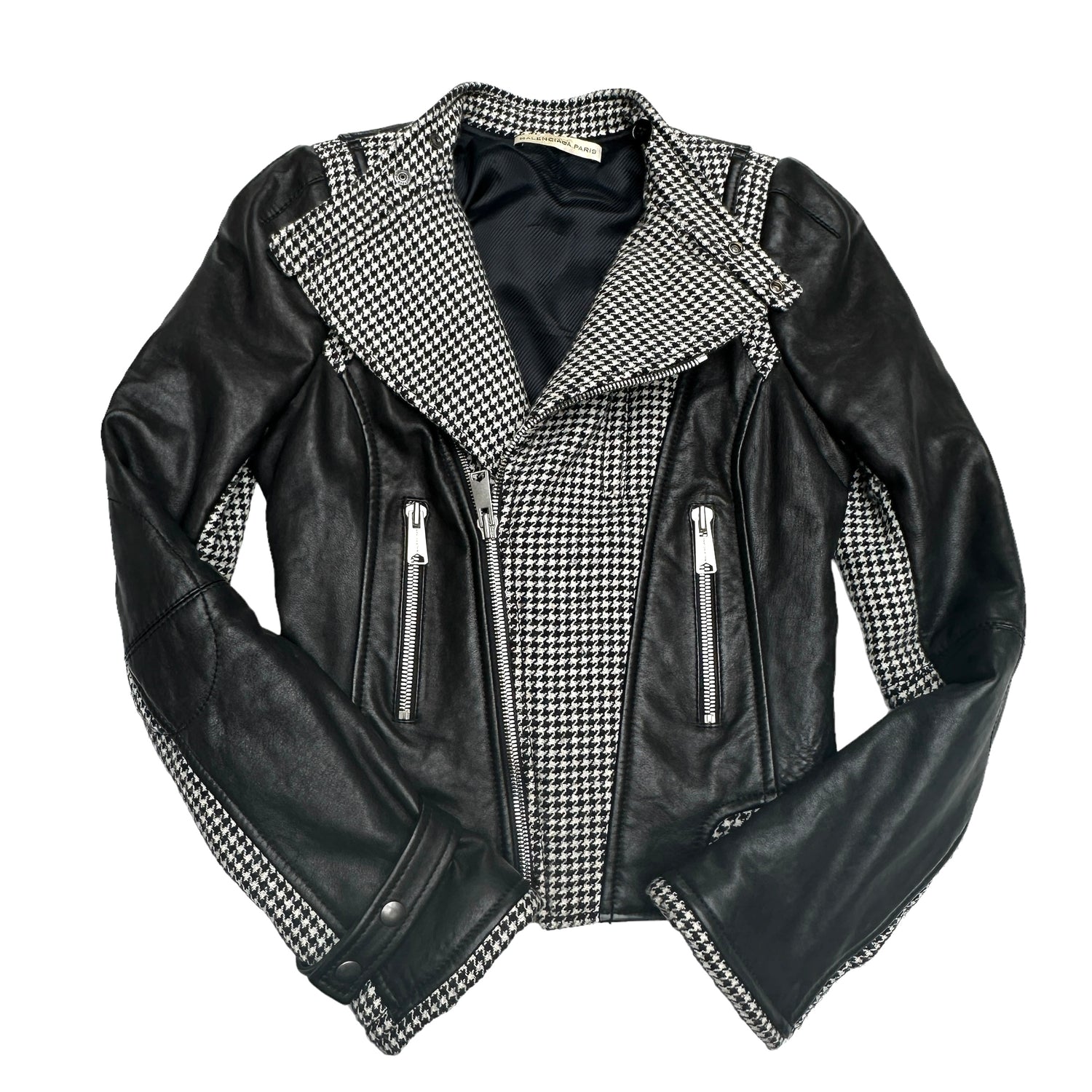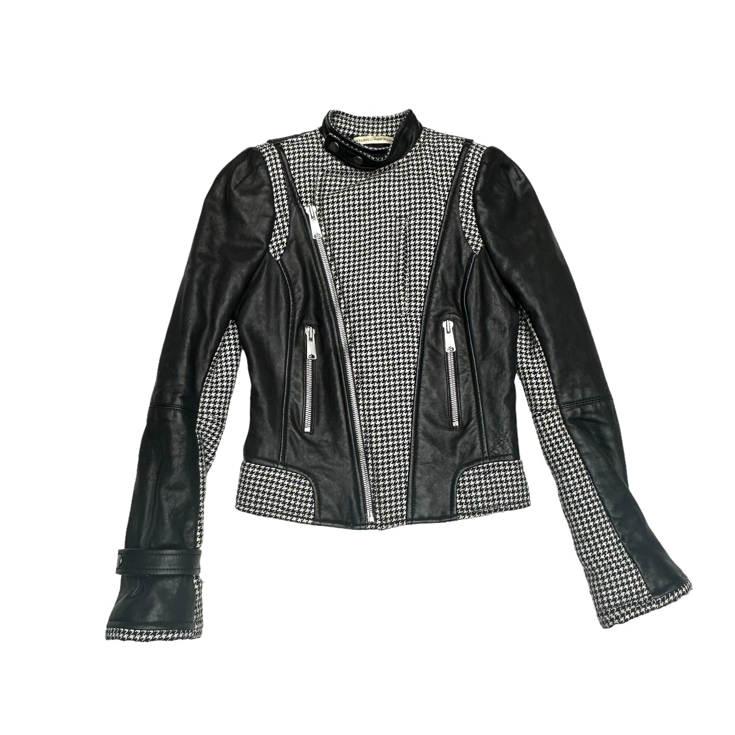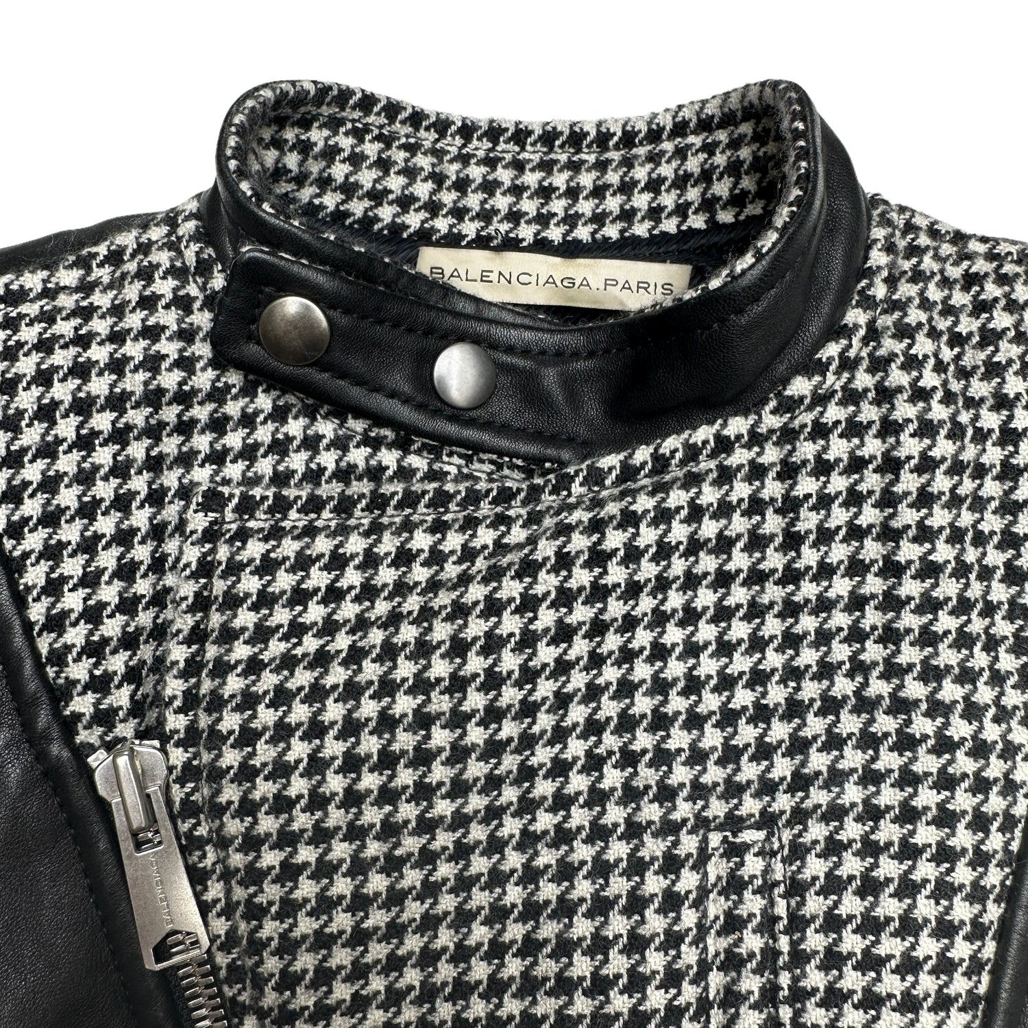 Balenciaga leather jacket with wool checkers fabric. Moto style. Silver-tone hardware. Zipper closure at front. Two zipper pockets. Buttery soft leather. Designer size 38.