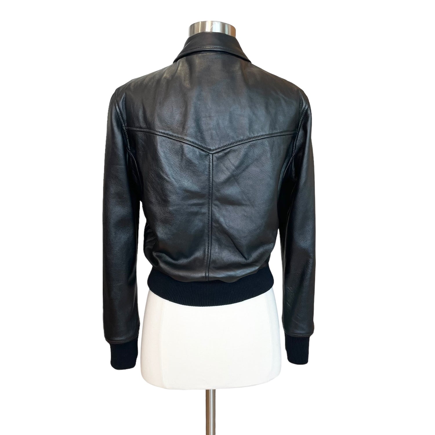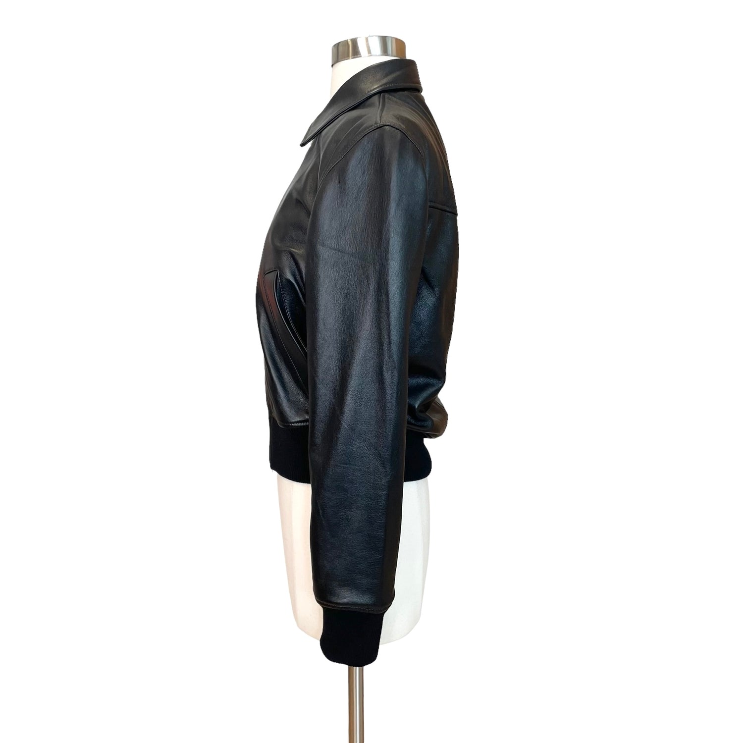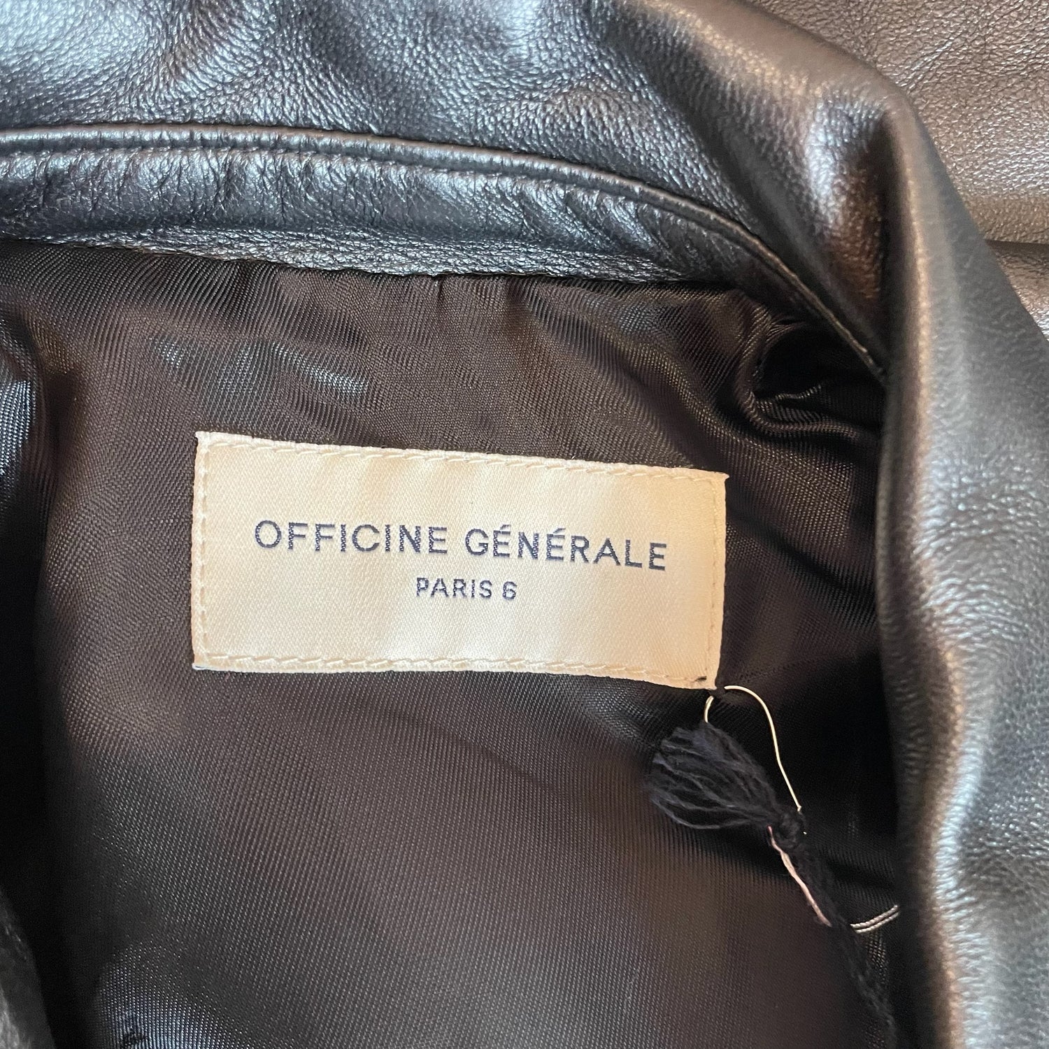 Officine Generale black leather bomber jacket. Pointed collar. Silver-tone zipper closure. Pockets. Lined. Designer size small.