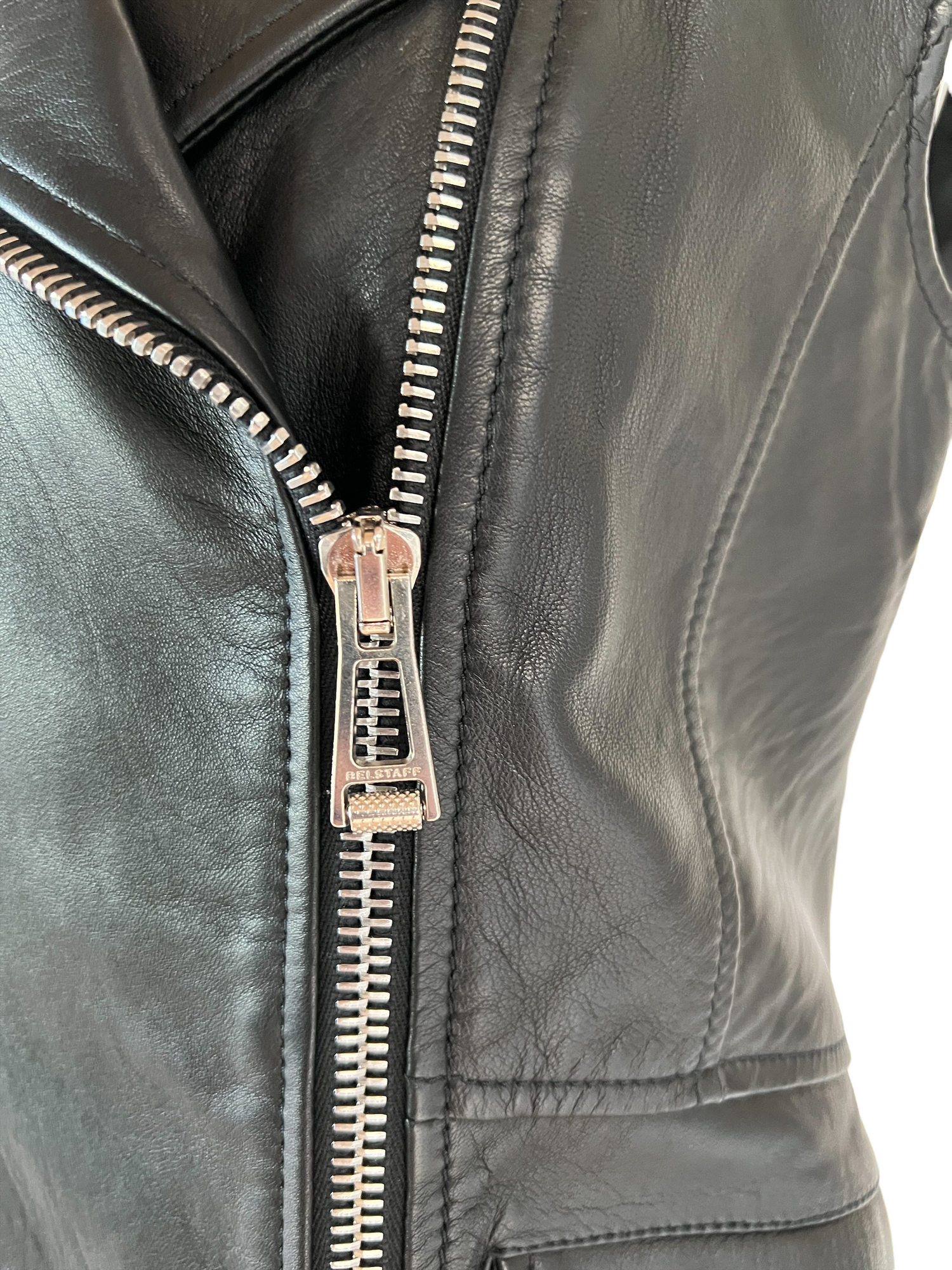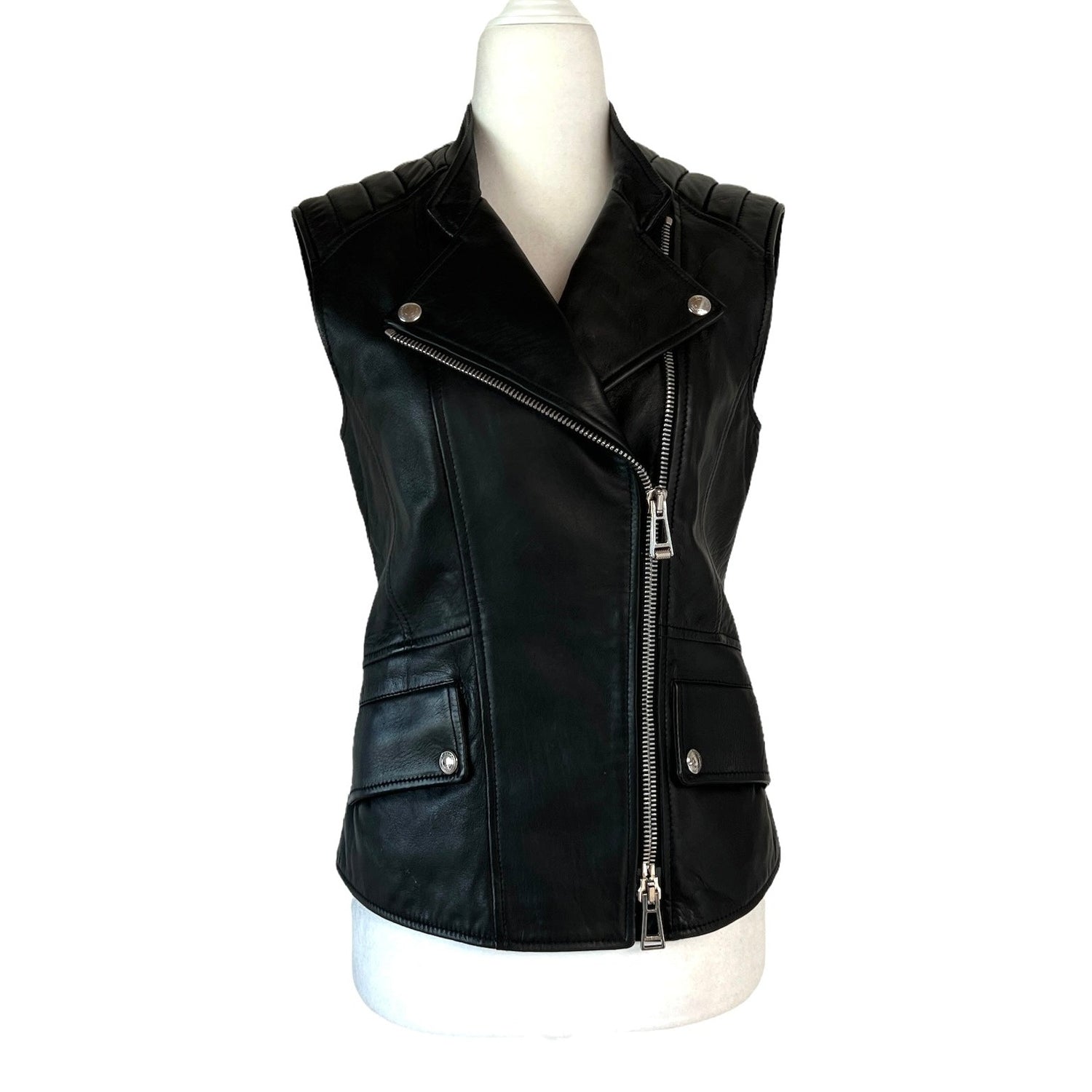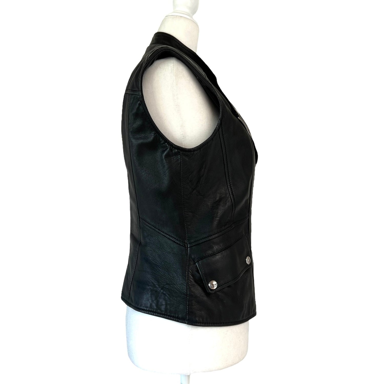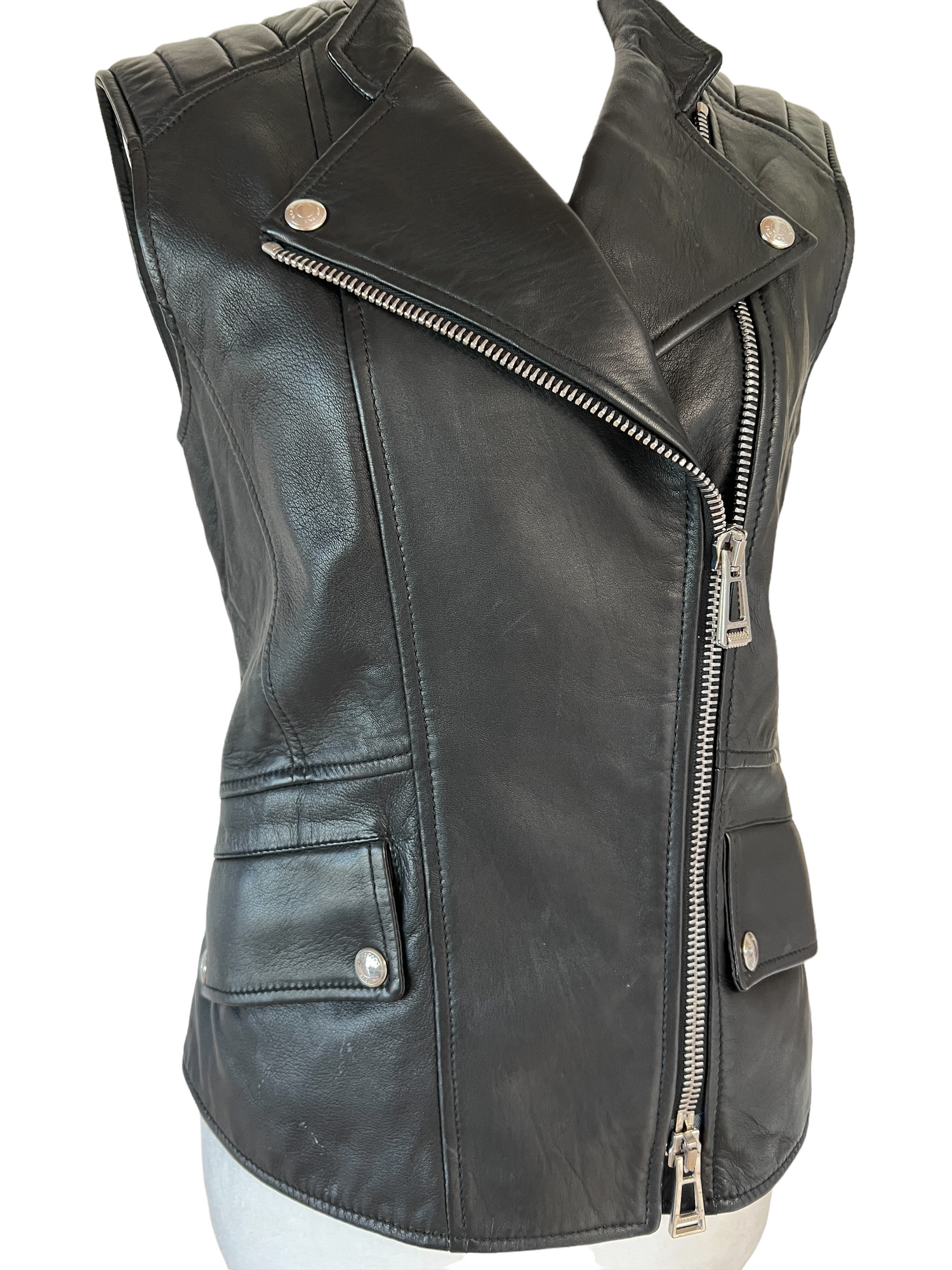 Black leather vest from Belstaff. Zipper closure at front. Two side pockets. Silver-tone hardware. Size 40.