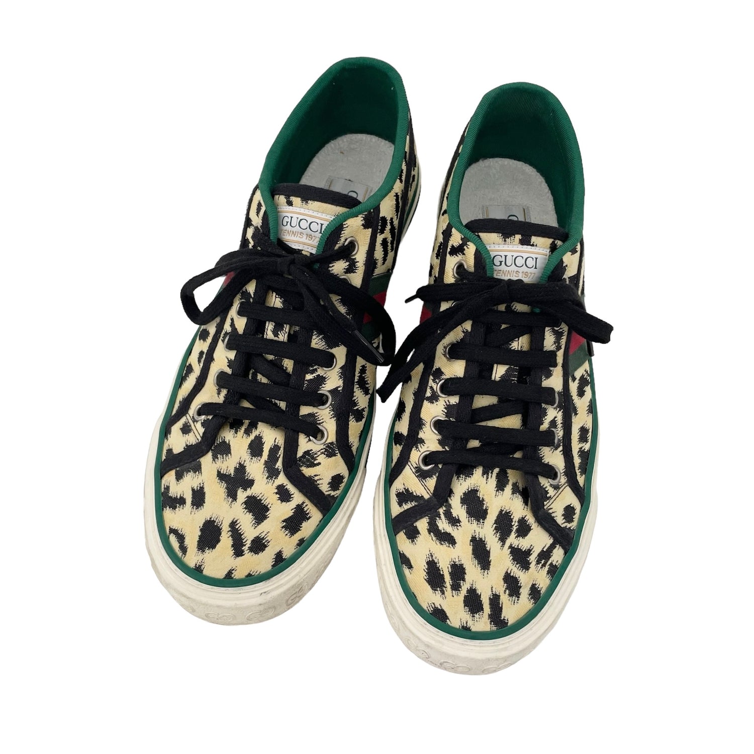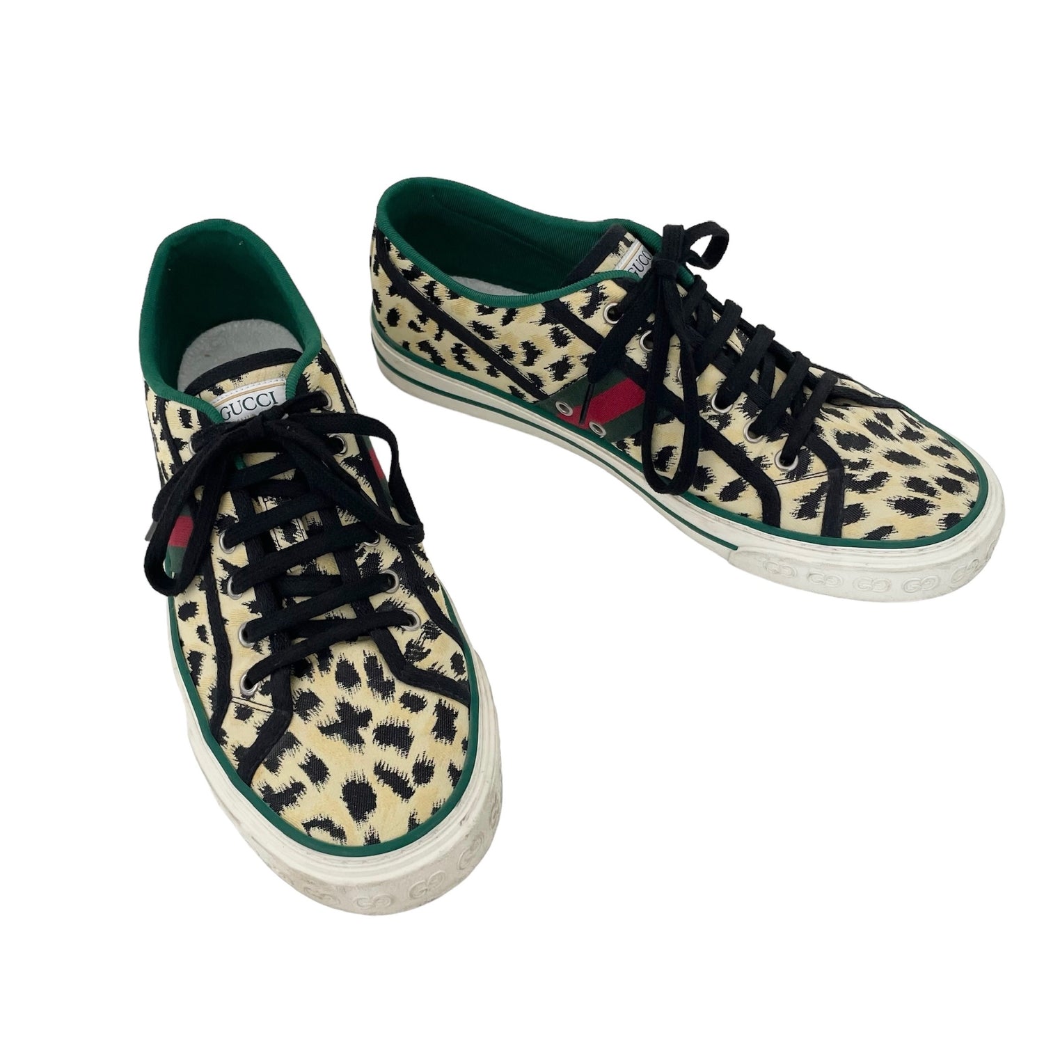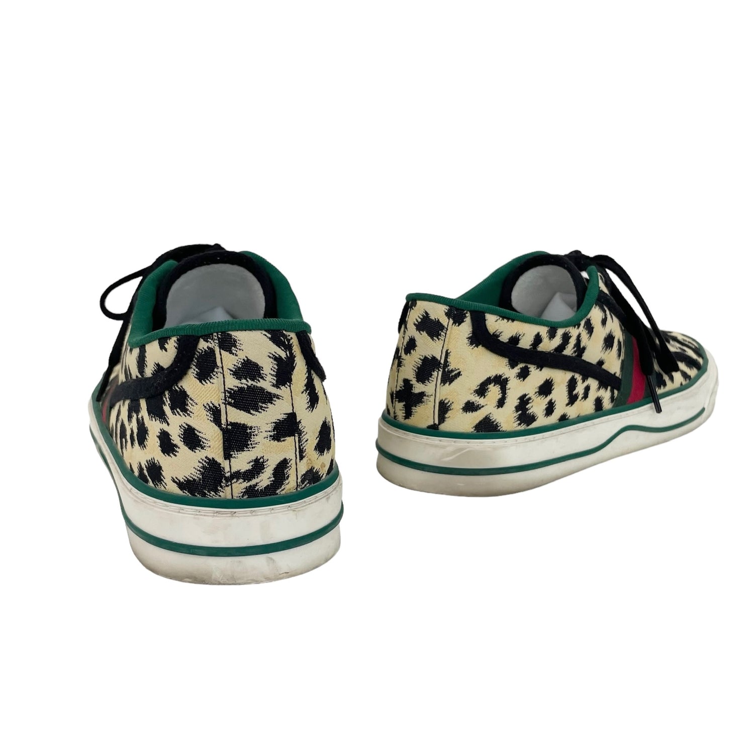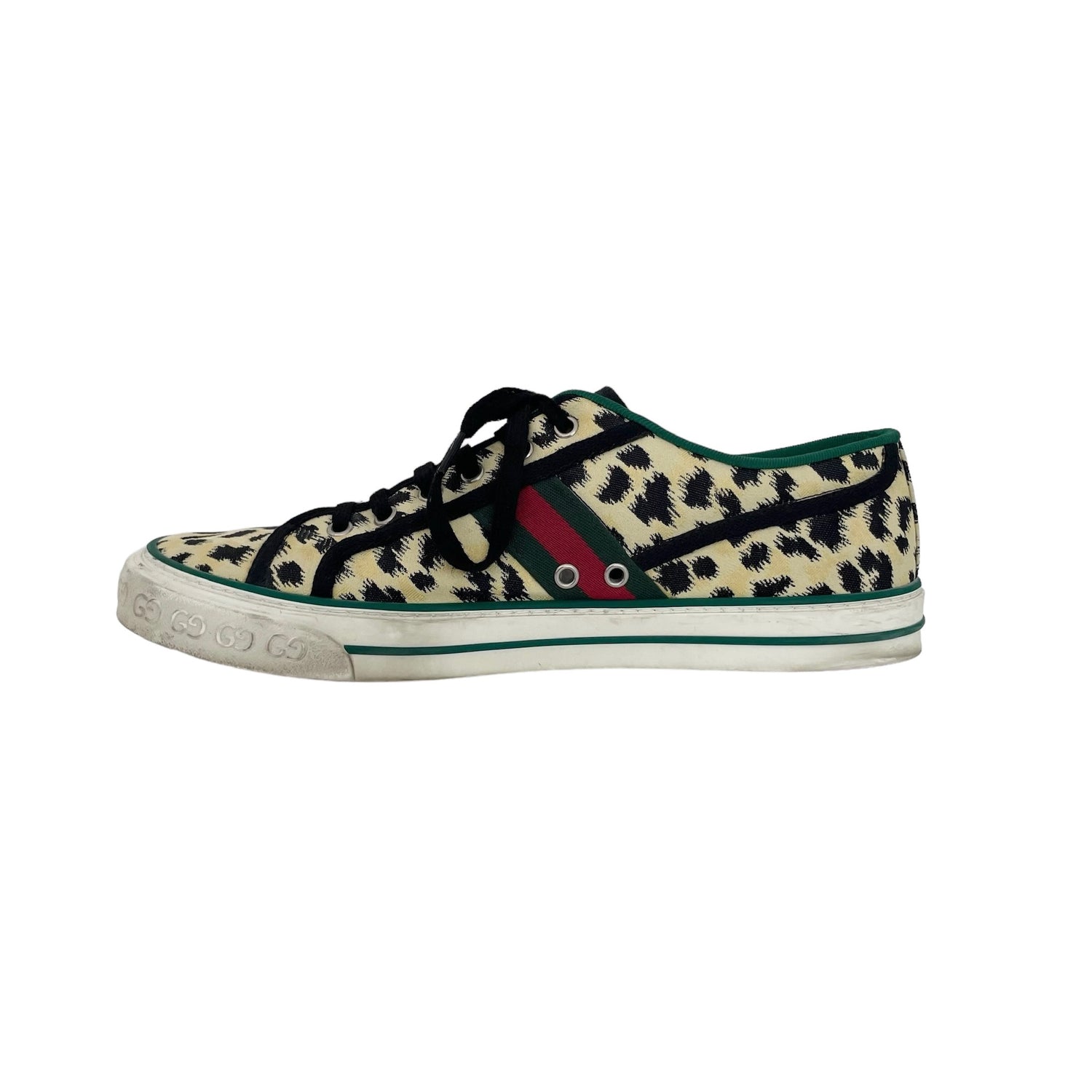 Gucci men's sneakers. Leopard canvas print. Black laces closure. Rubber outer soles. GG logo at toe. Designer size 10 MEN.