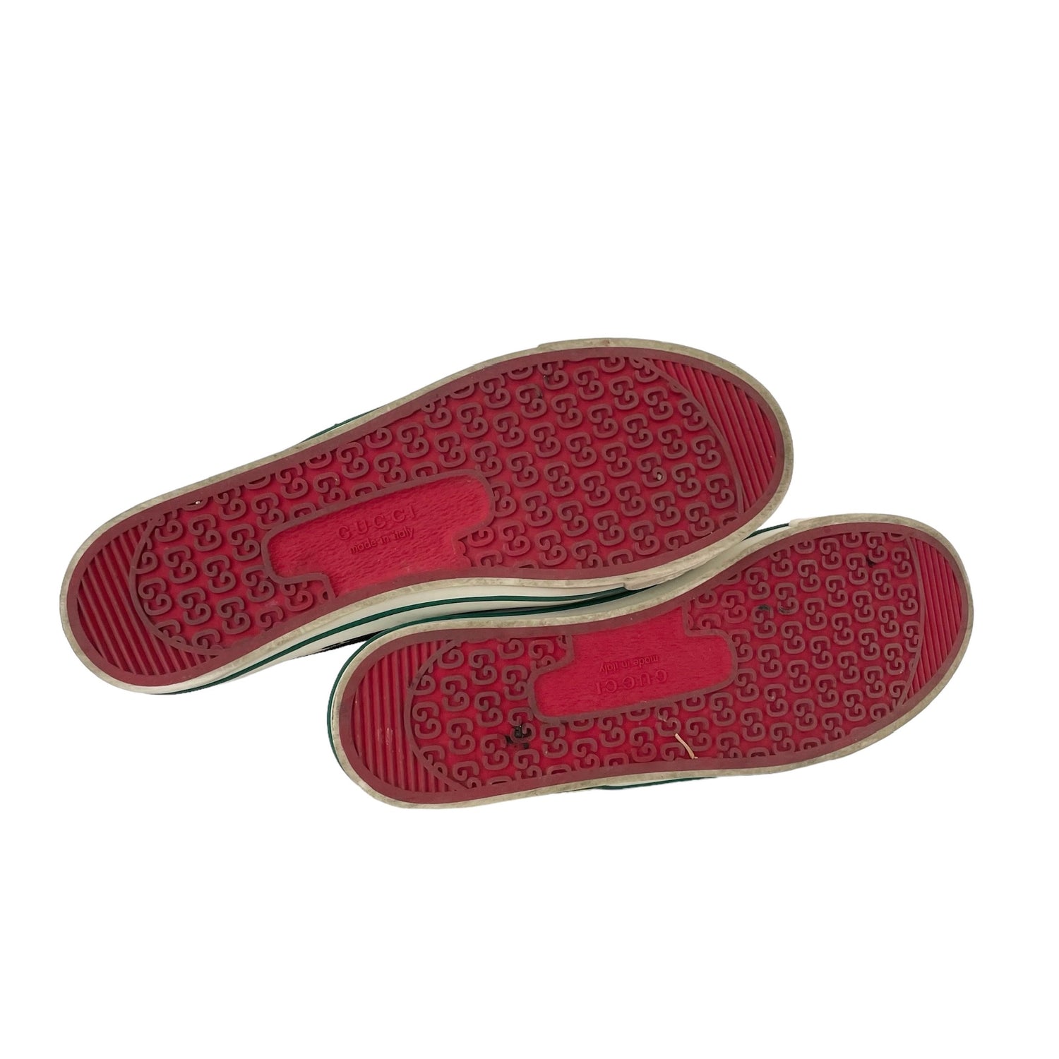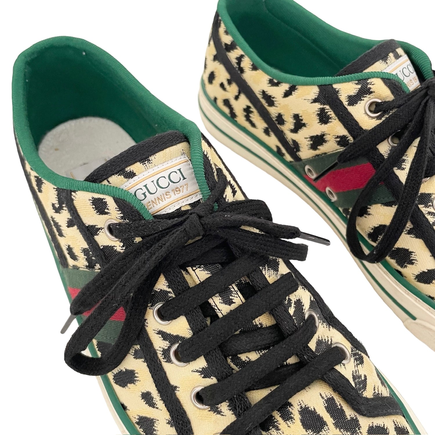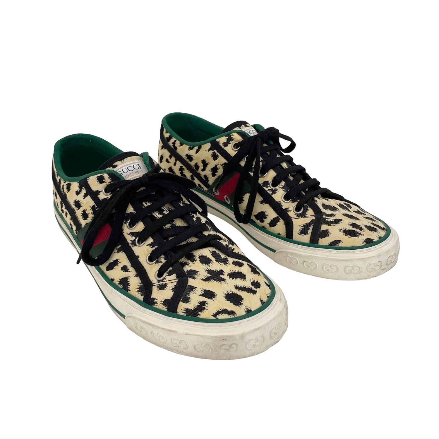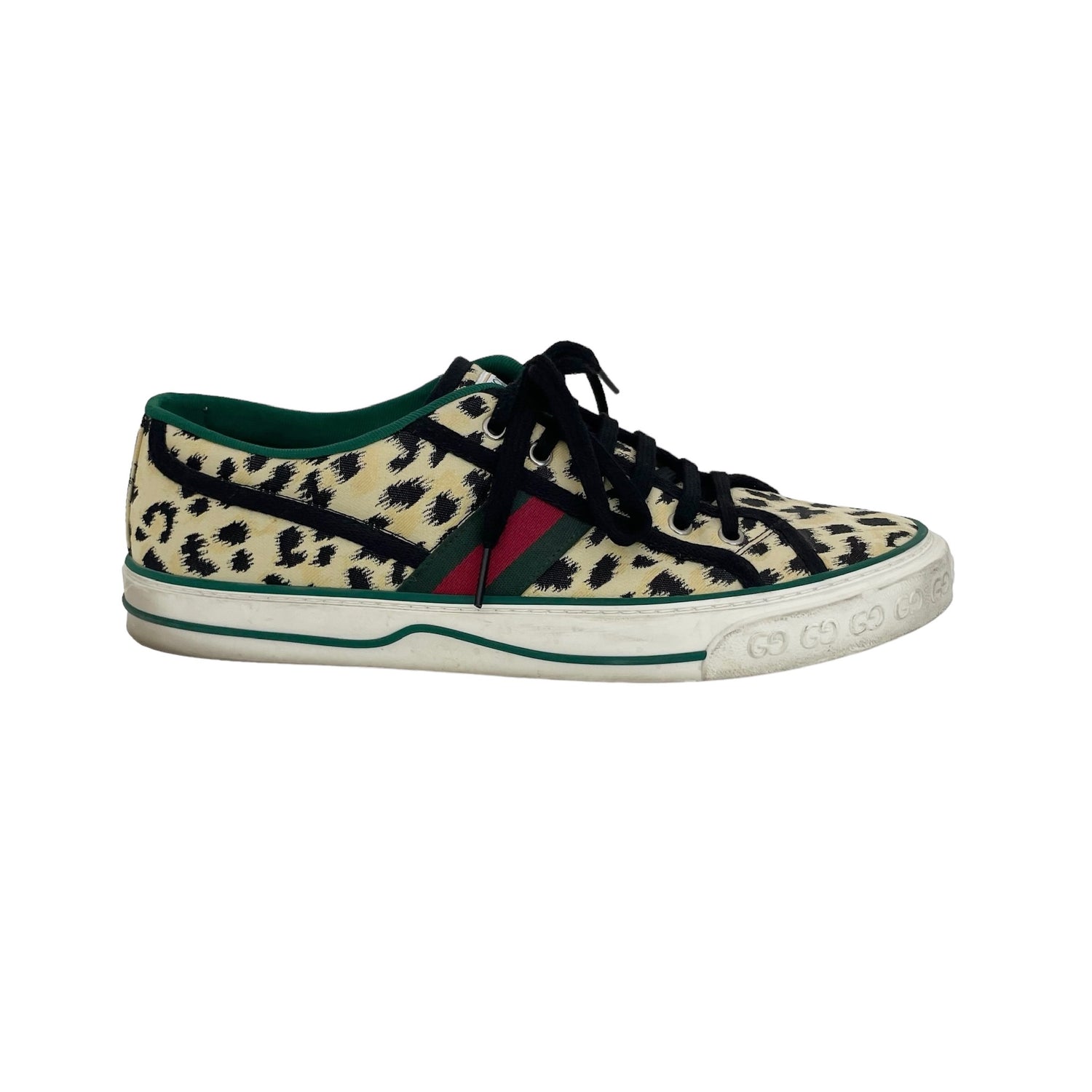 Gucci men's sneakers. Leopard canvas print. Black laces closure. Rubber outer soles. GG logo at toe. Designer size 10 MEN.