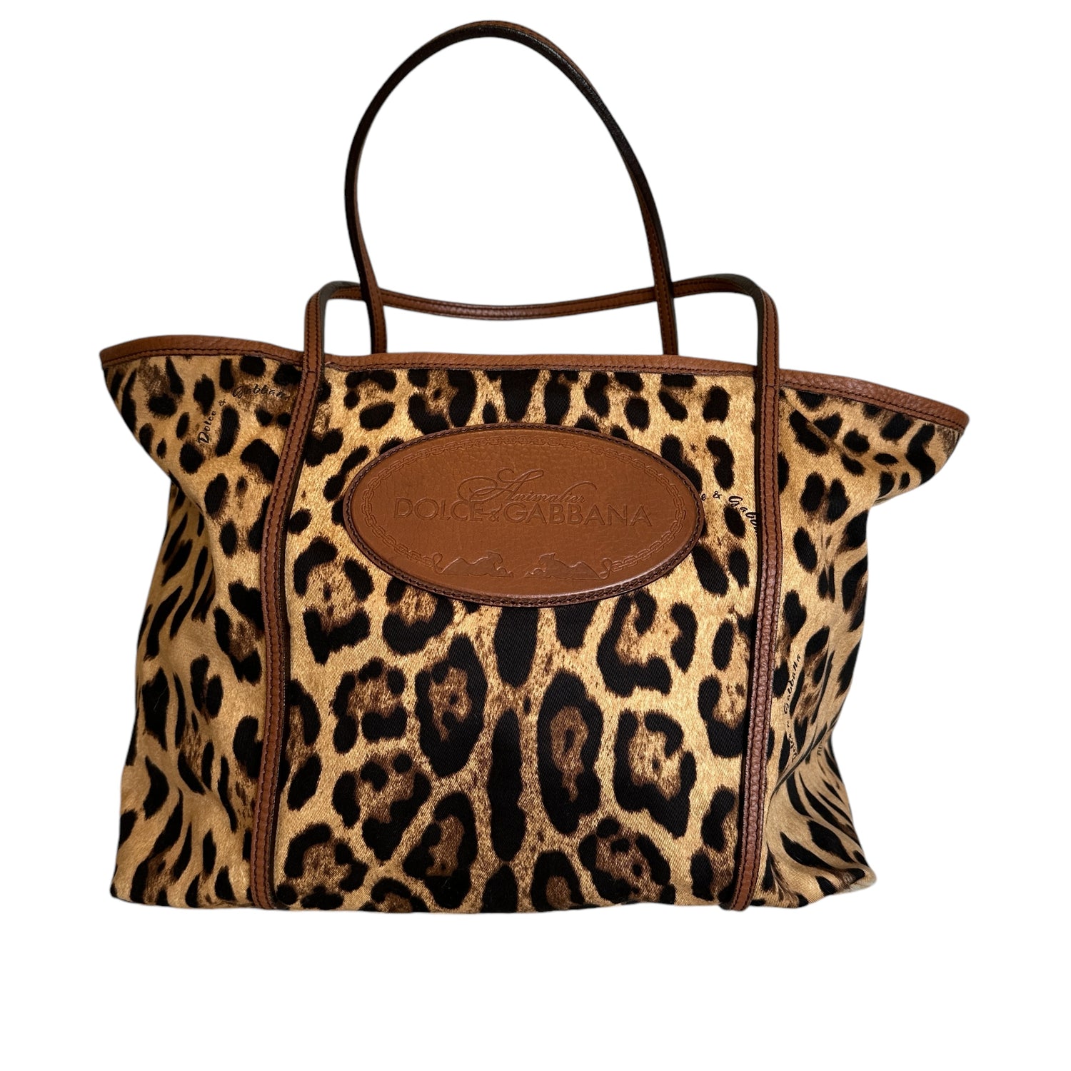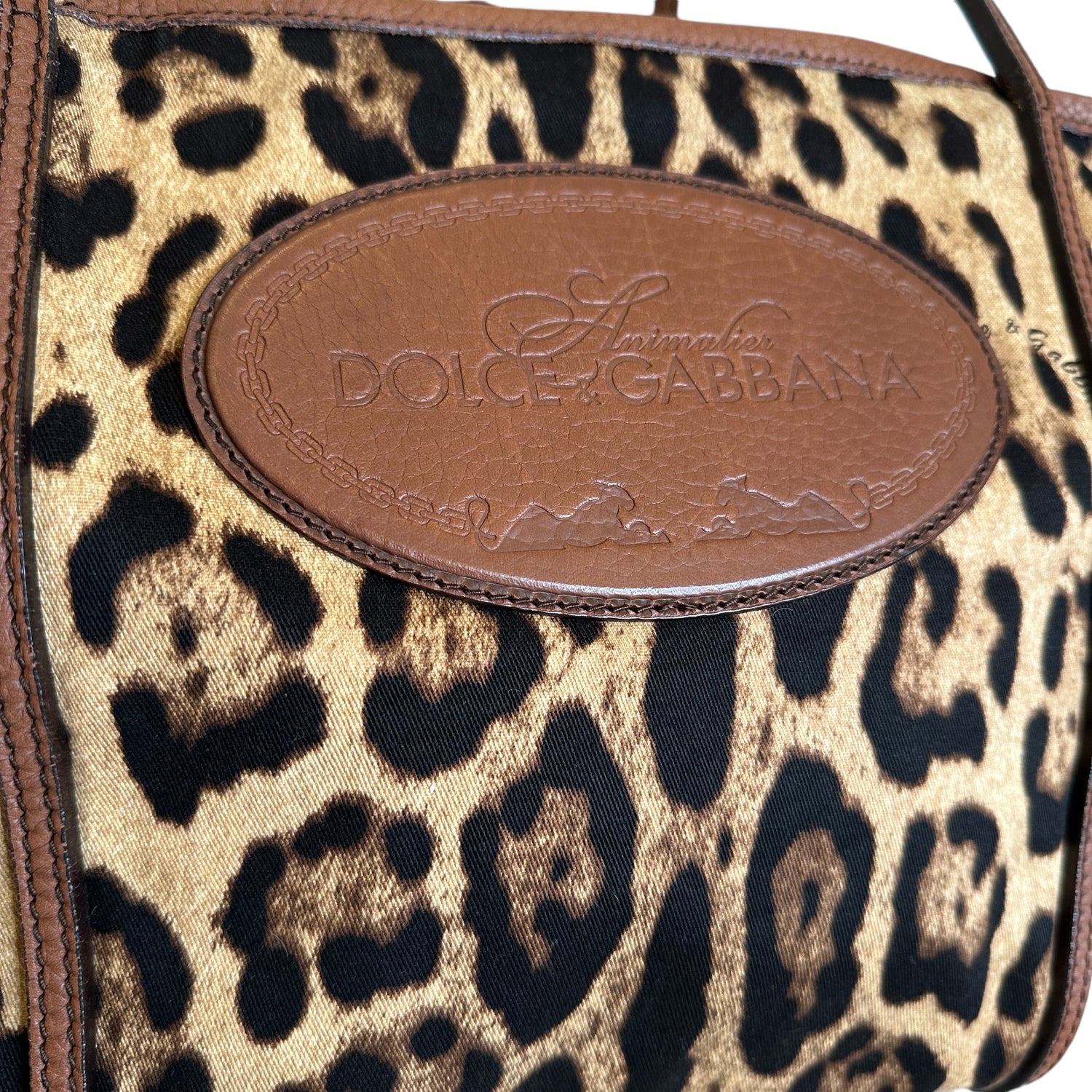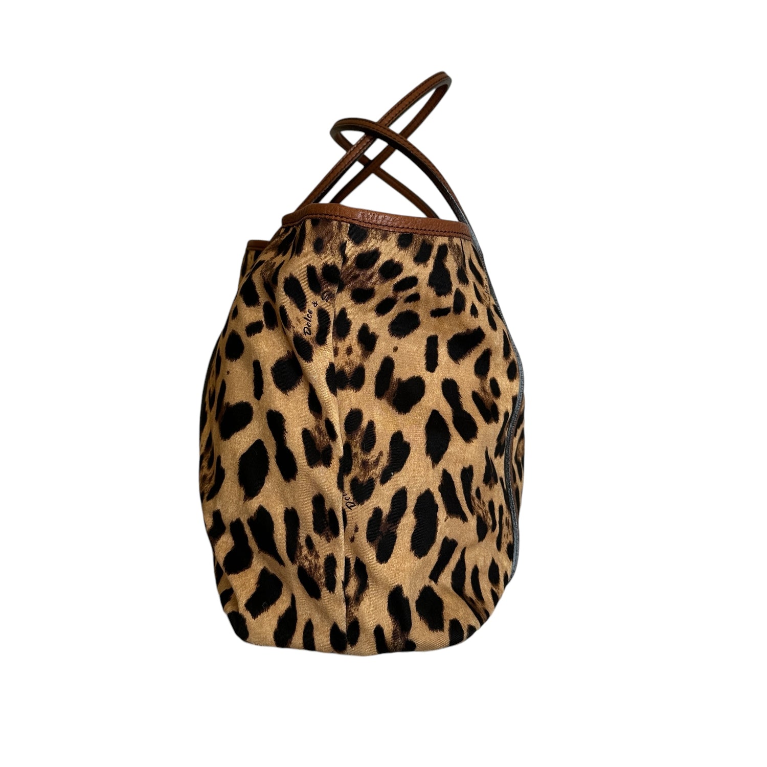 Dolce & Gabbana leopard canvas tote. Cotton canvas with brown leather trims. Logo leather patch at front. Easily foldable and a great bag for travels. One interior pocket.