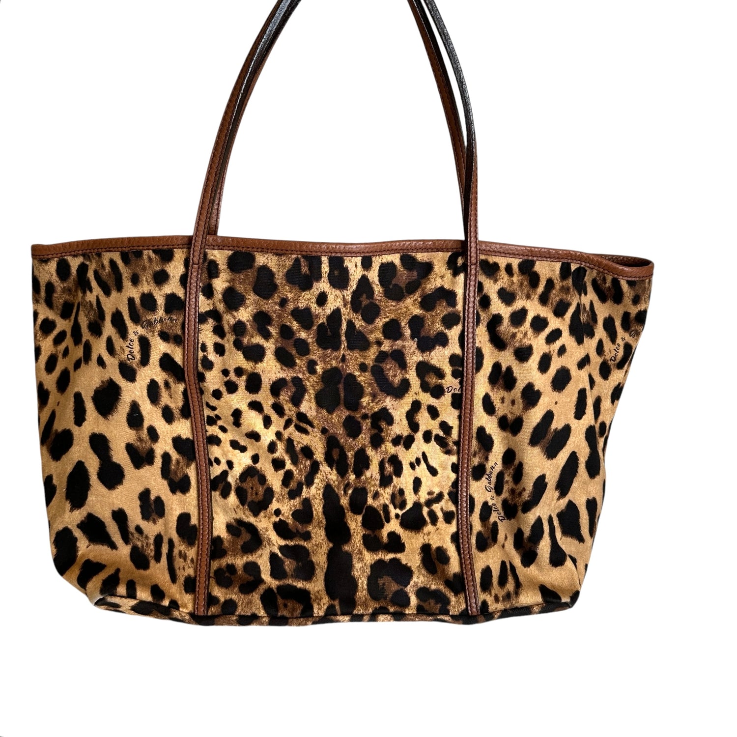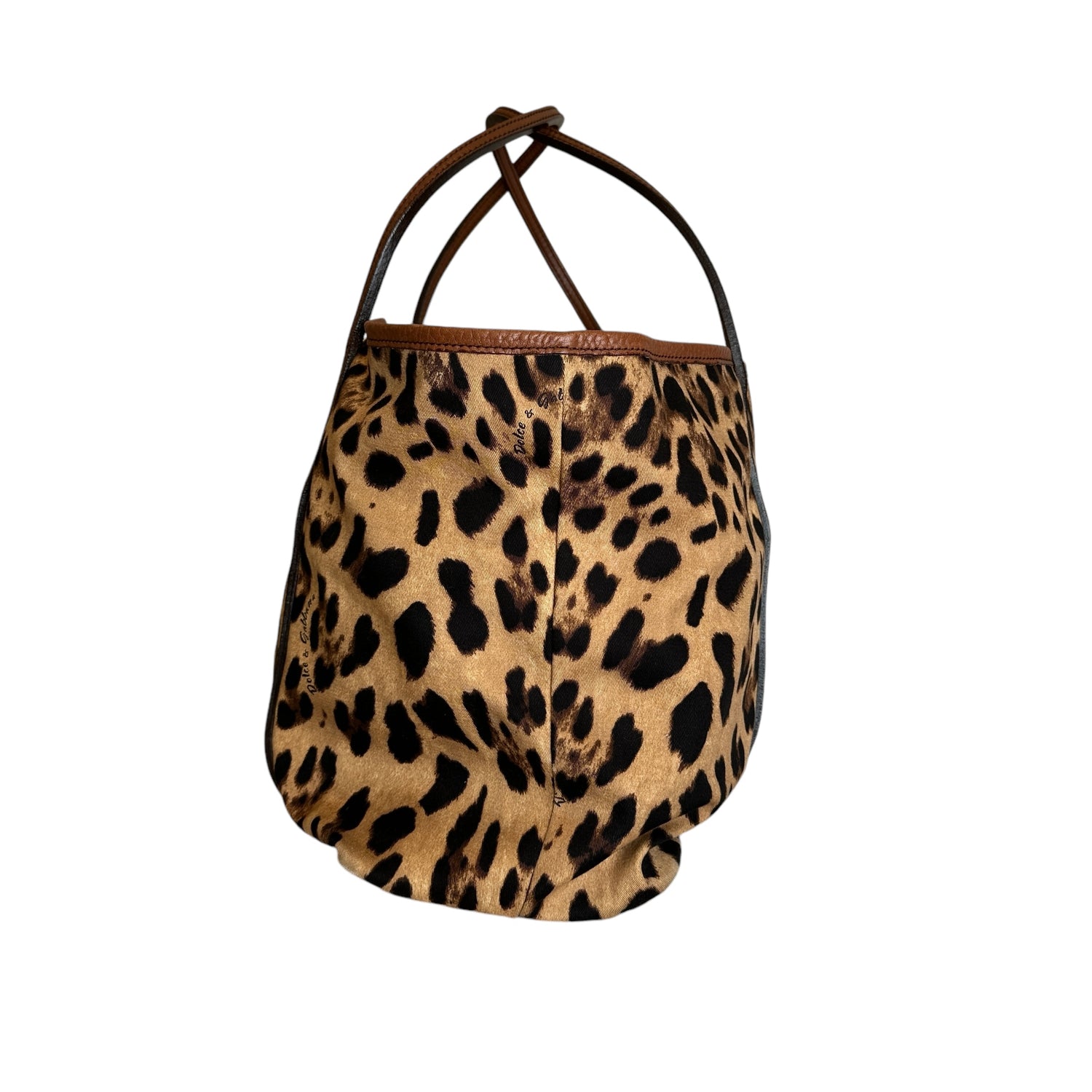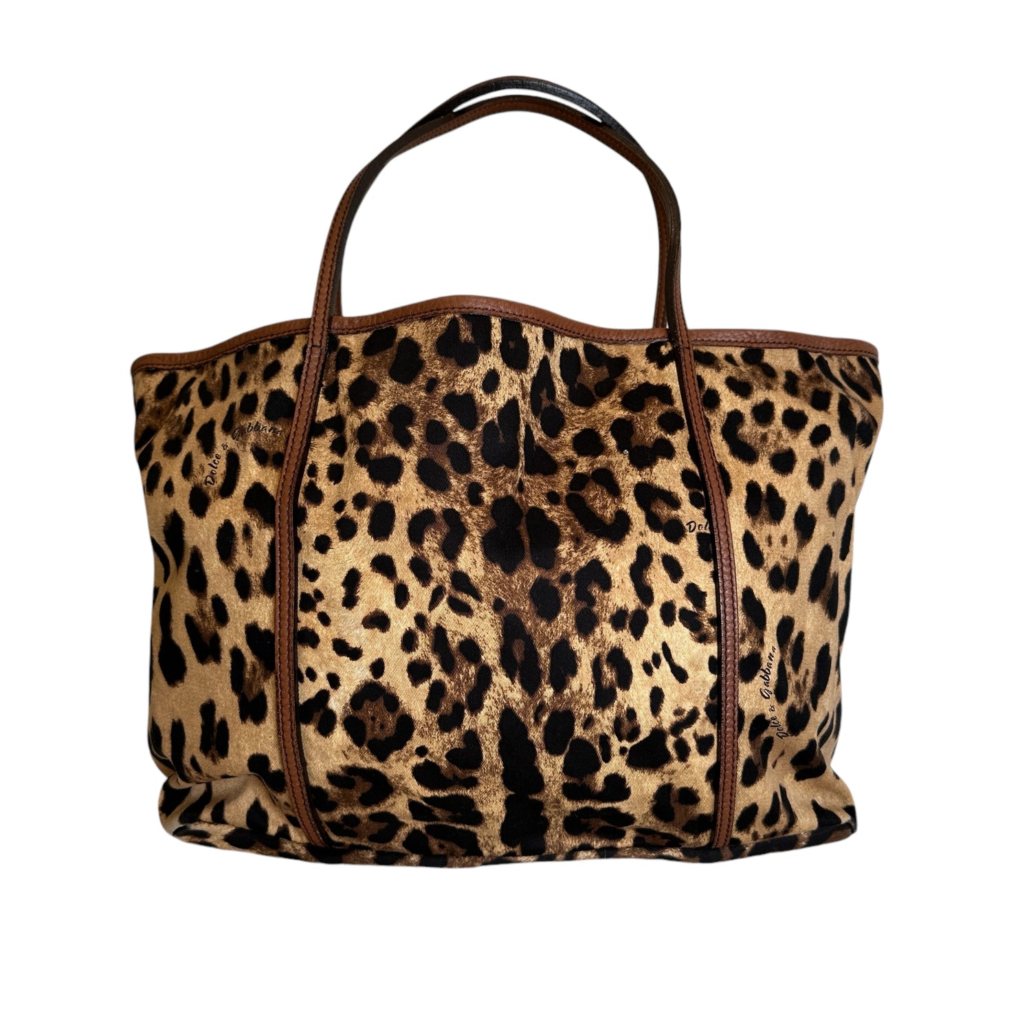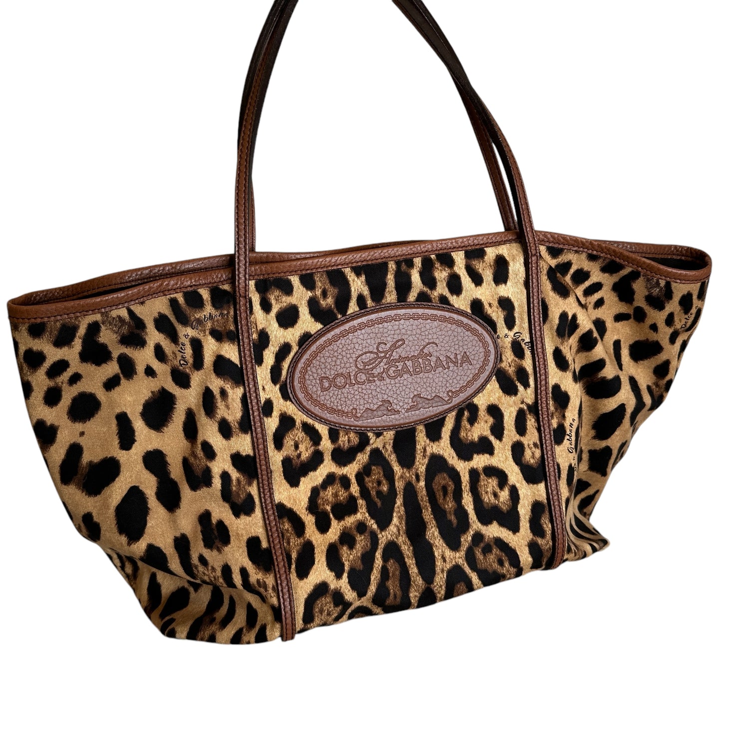 Dolce & Gabbana leopard canvas tote. Cotton canvas with brown leather trims. Logo leather patch at front. Easily foldable and a great bag for travels. One interior pocket.