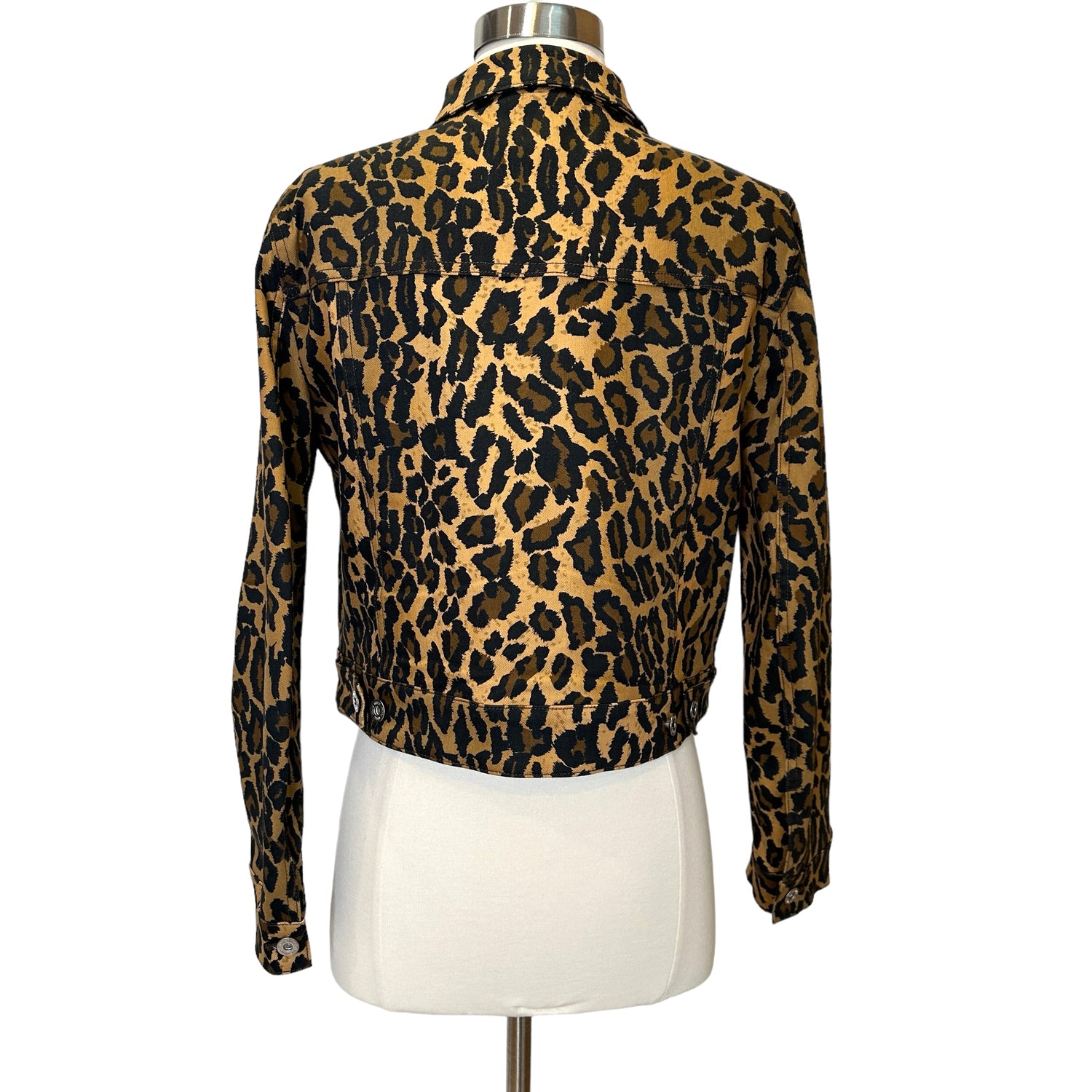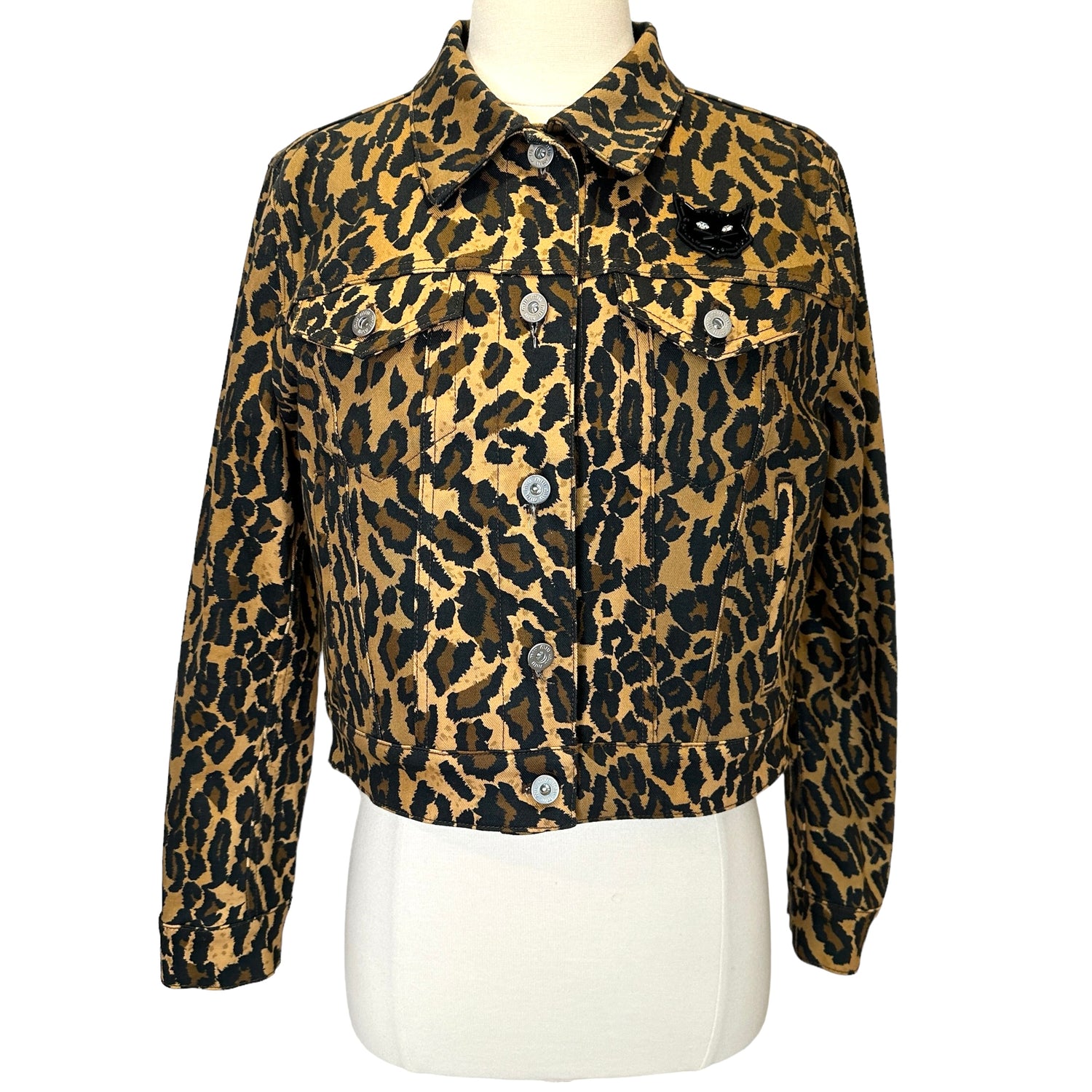 Miu Miu leopard print denim jacket. Brown and black print. Beads and crystals embellishments at pocket in a cat shape. Pointed collar with button closure. Miu Miu logo silver-tone buttons. Designer size 42.