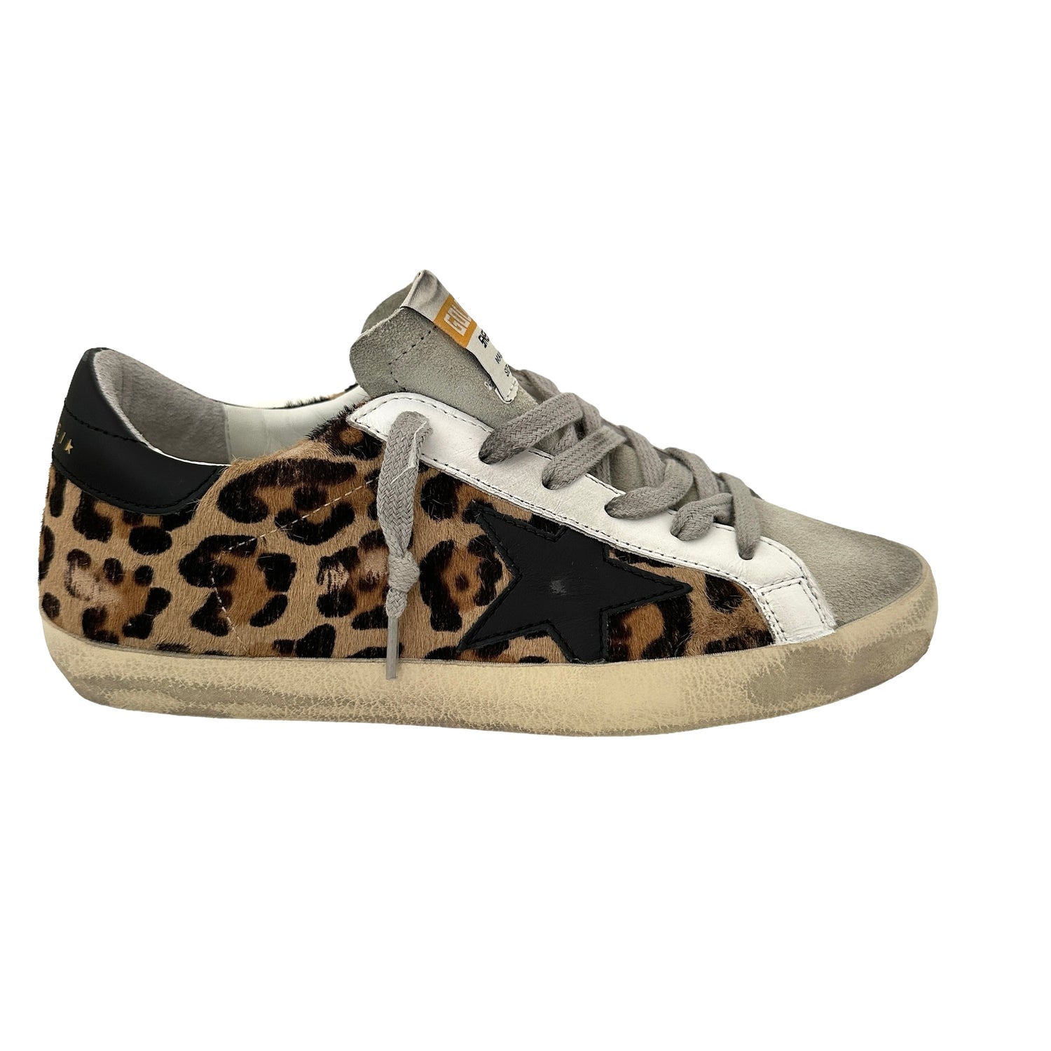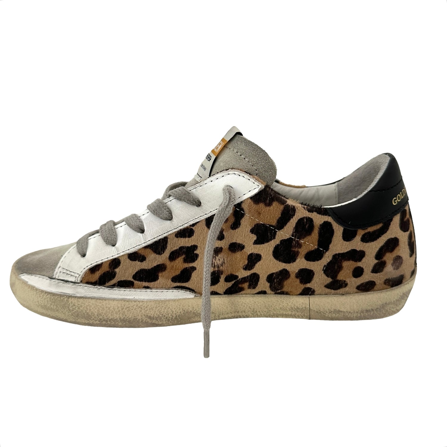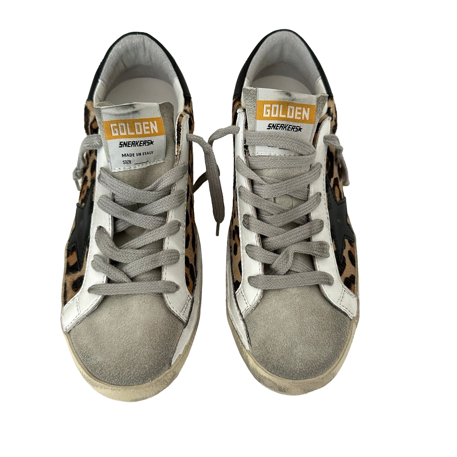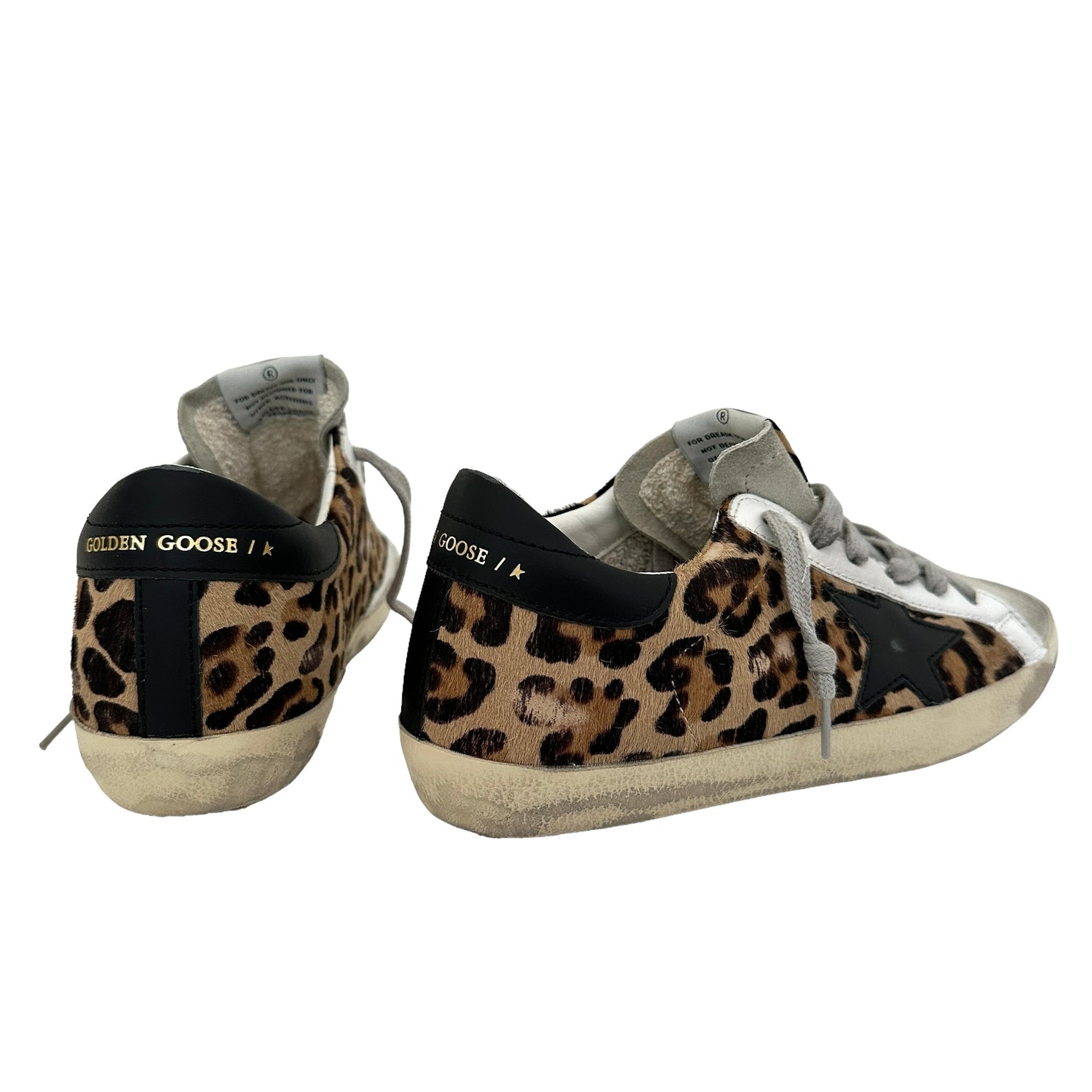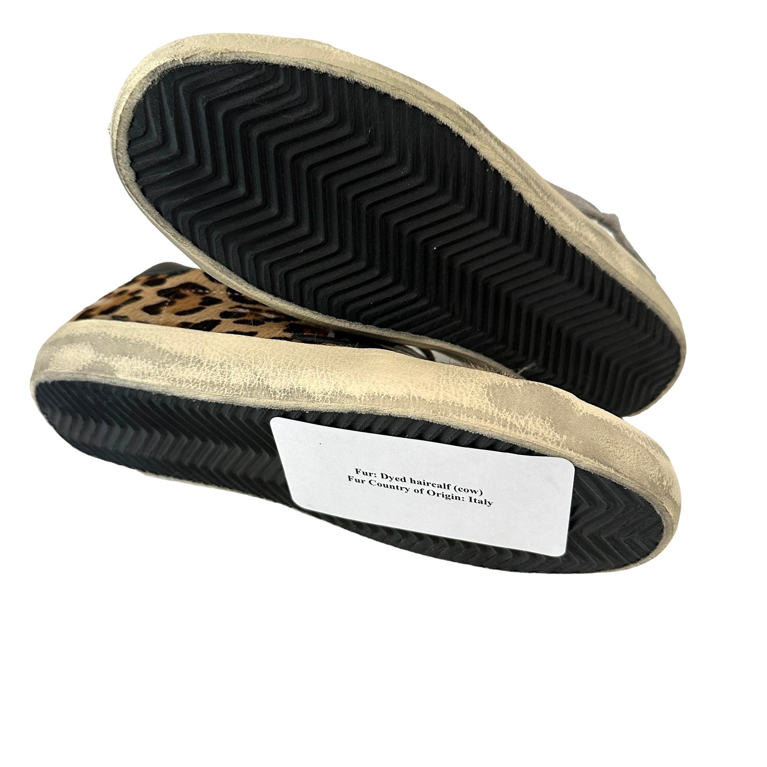 Golden Goose leopard pony hair sneakers. Black and white leather trims. Leather outer soles. Designer size 37.