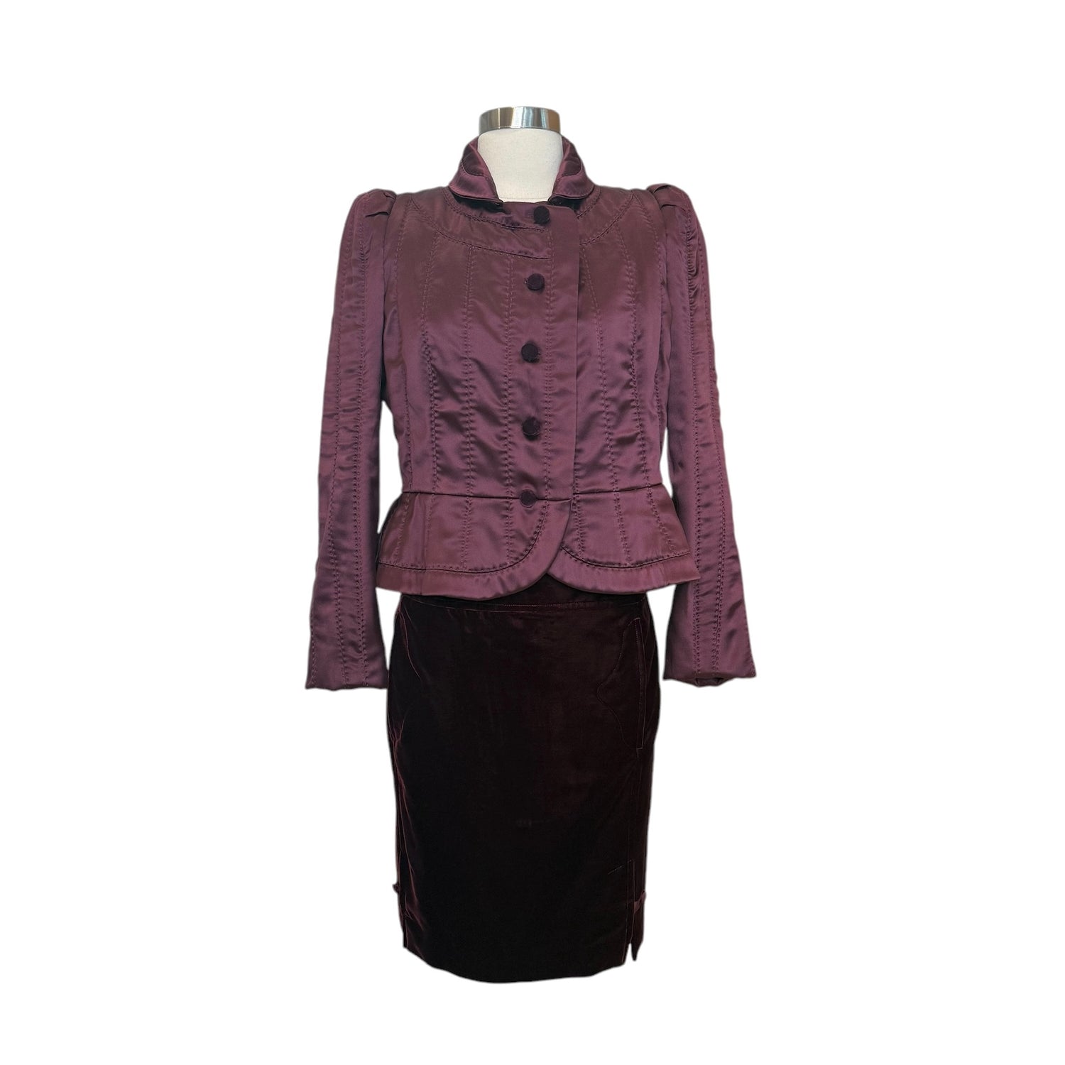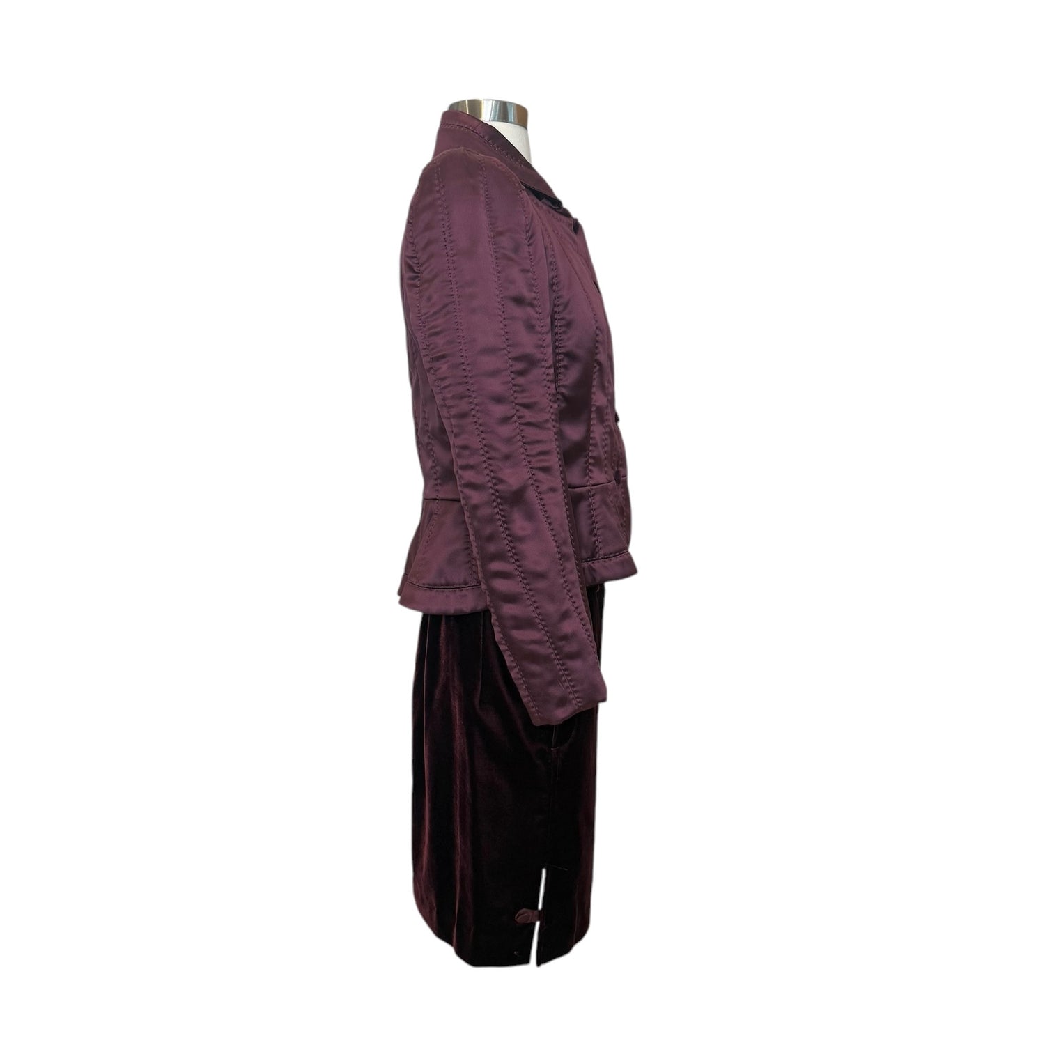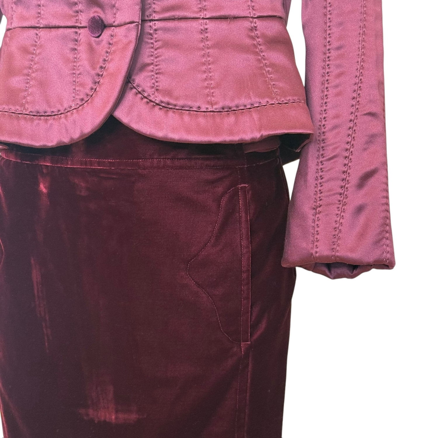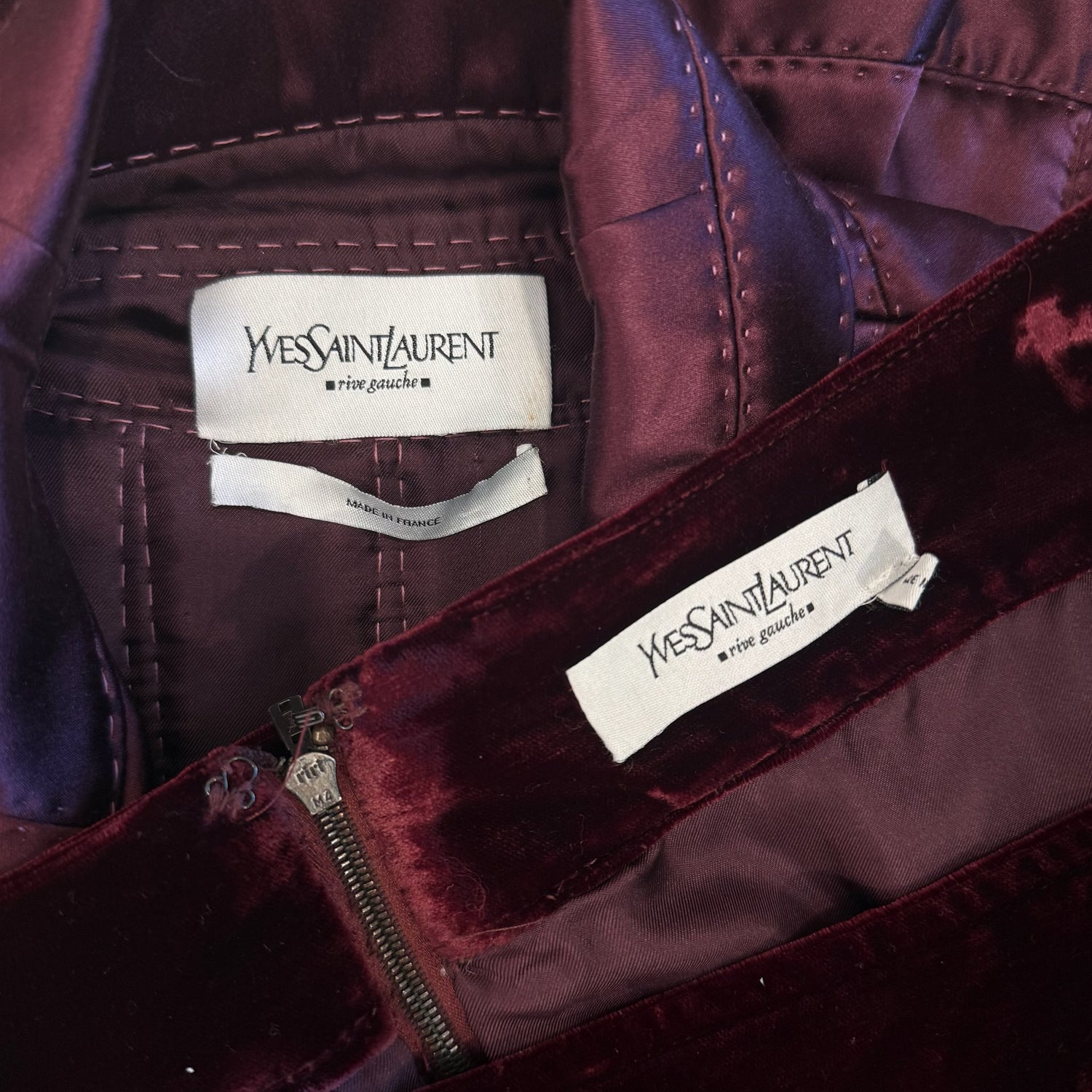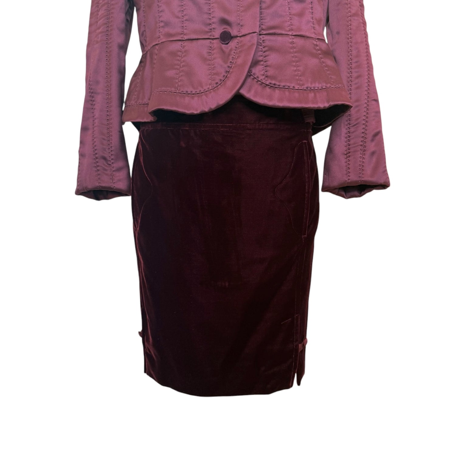 Yves Saint Laurent vintage skirt set. Burgundy silk and velvet. Button closure at jacket. Zipper closure at skirt. Designer size 42 (jacket), 38 (skirt).