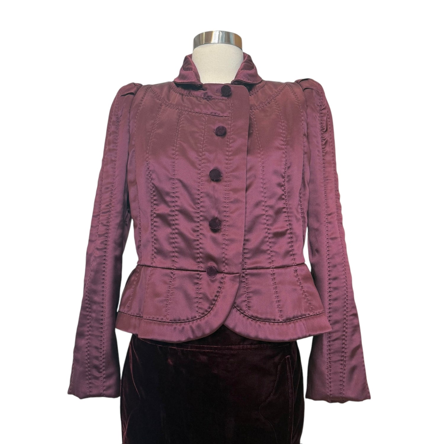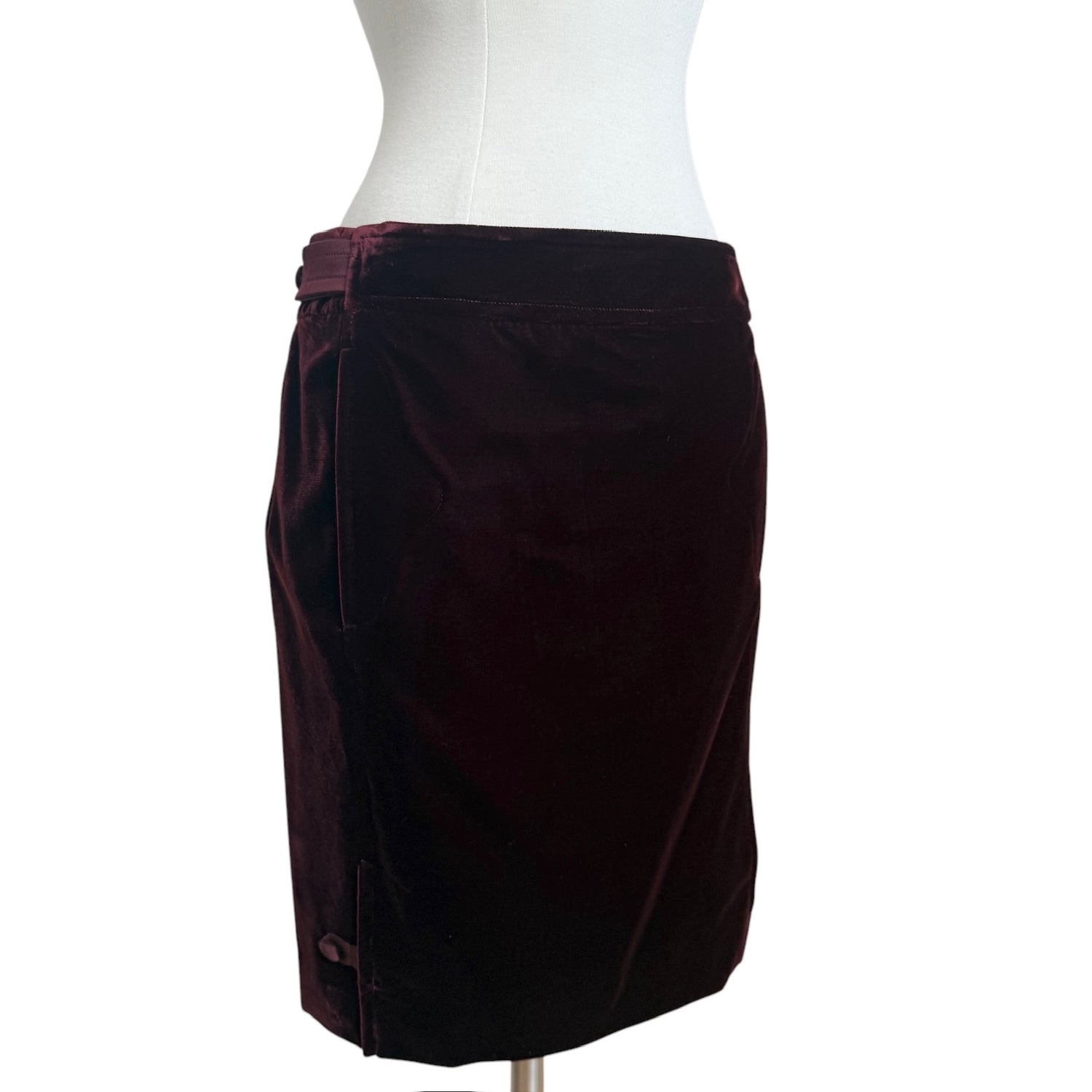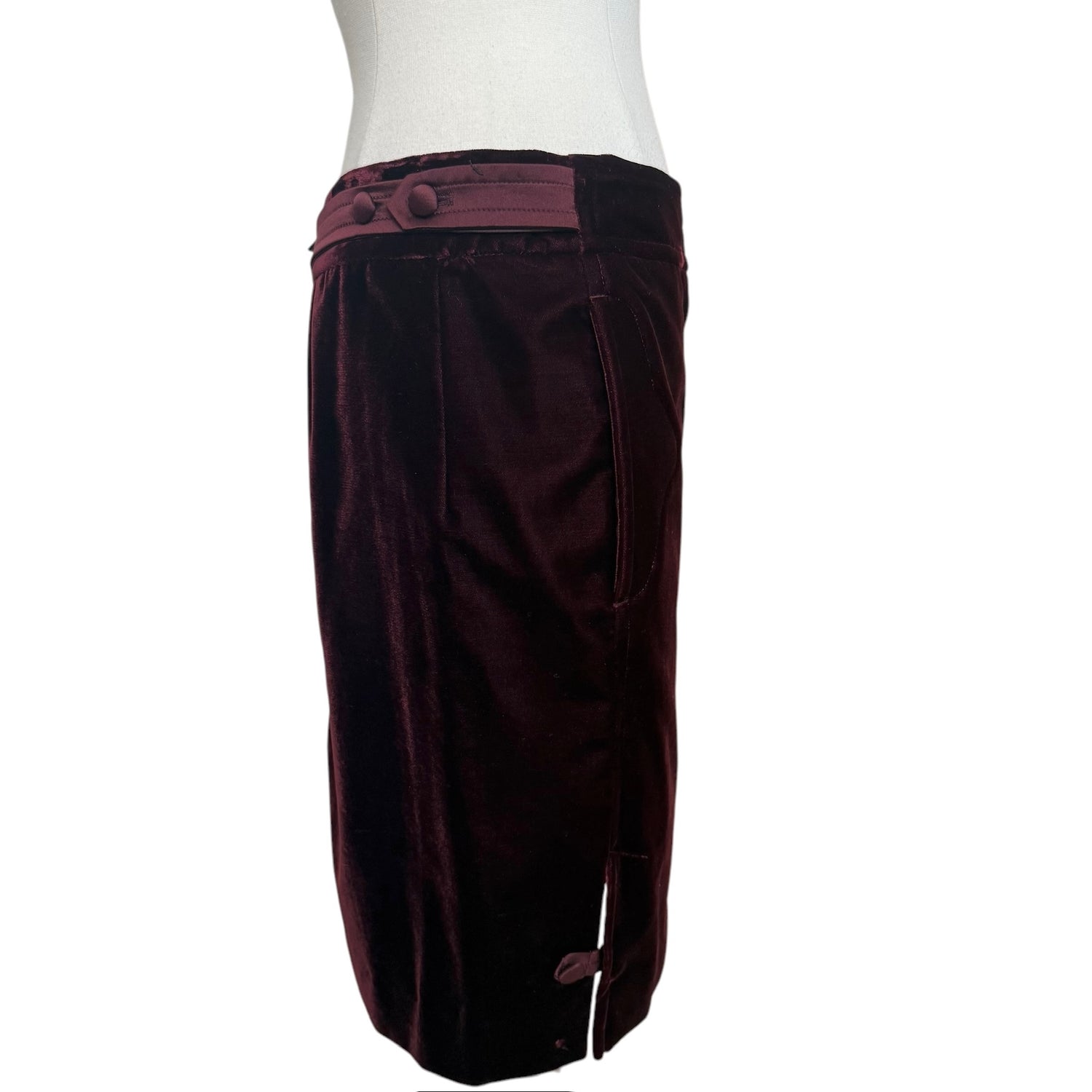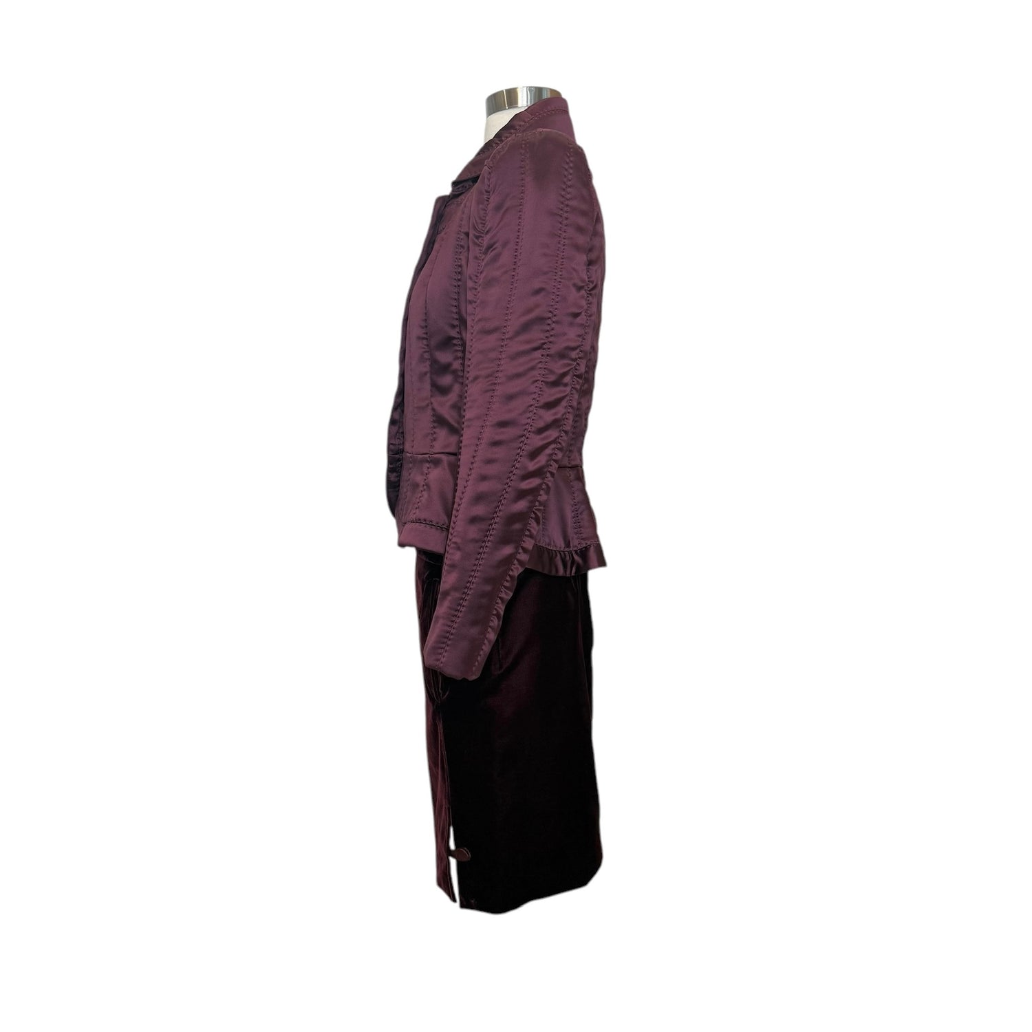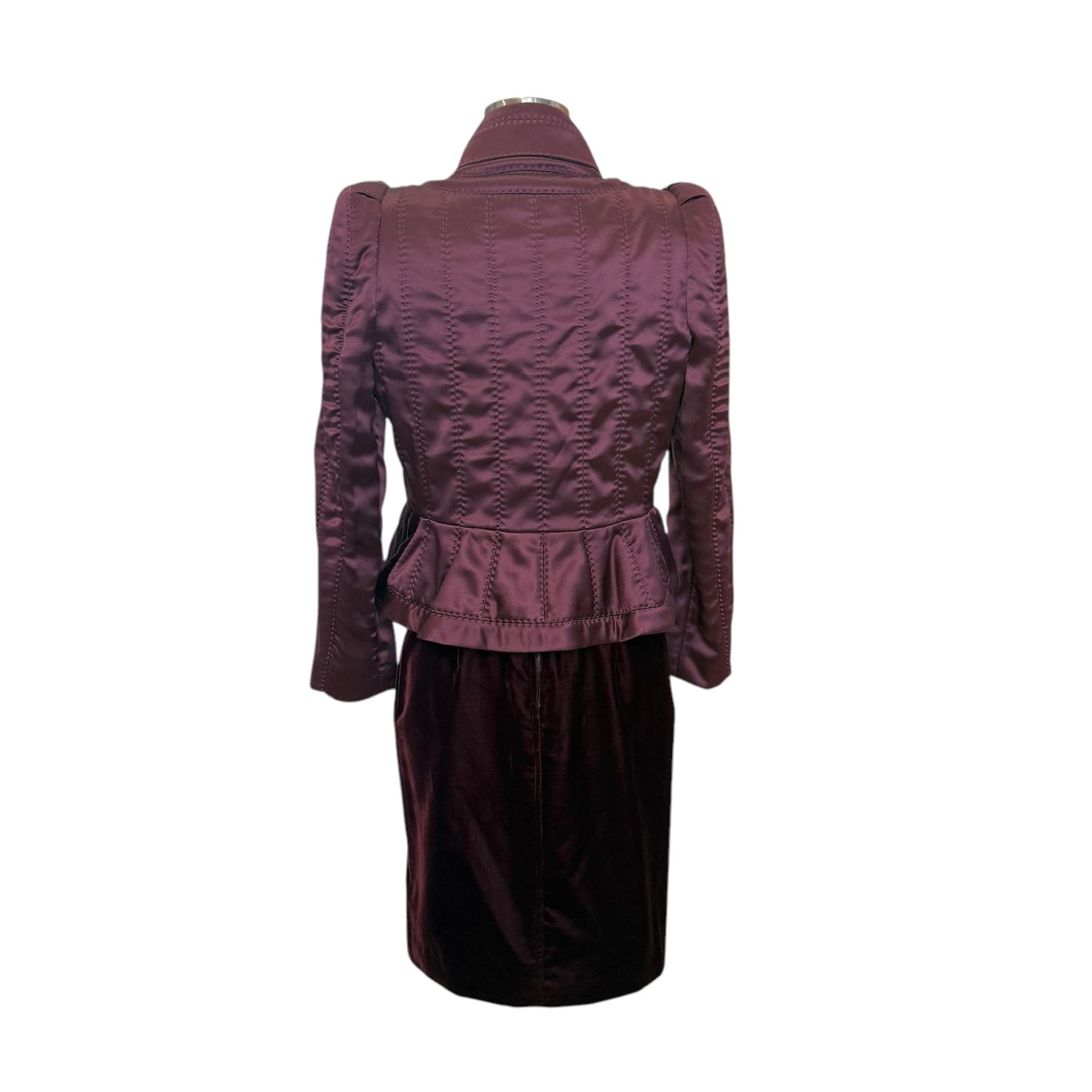 Yves Saint Laurent vintage skirt set. Burgundy silk and velvet. Button closure at jacket. Zipper closure at skirt. Designer size 42 (jacket), 38 (skirt).