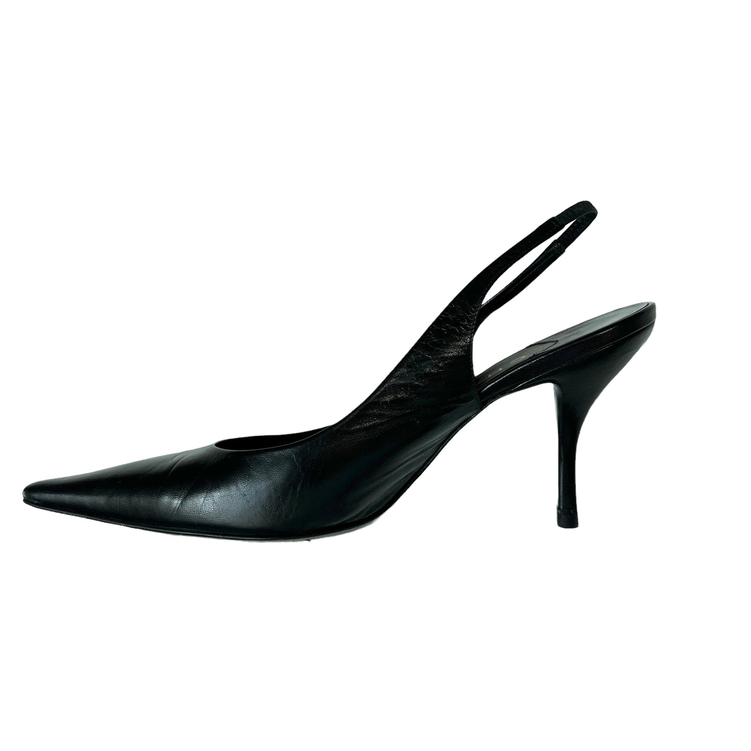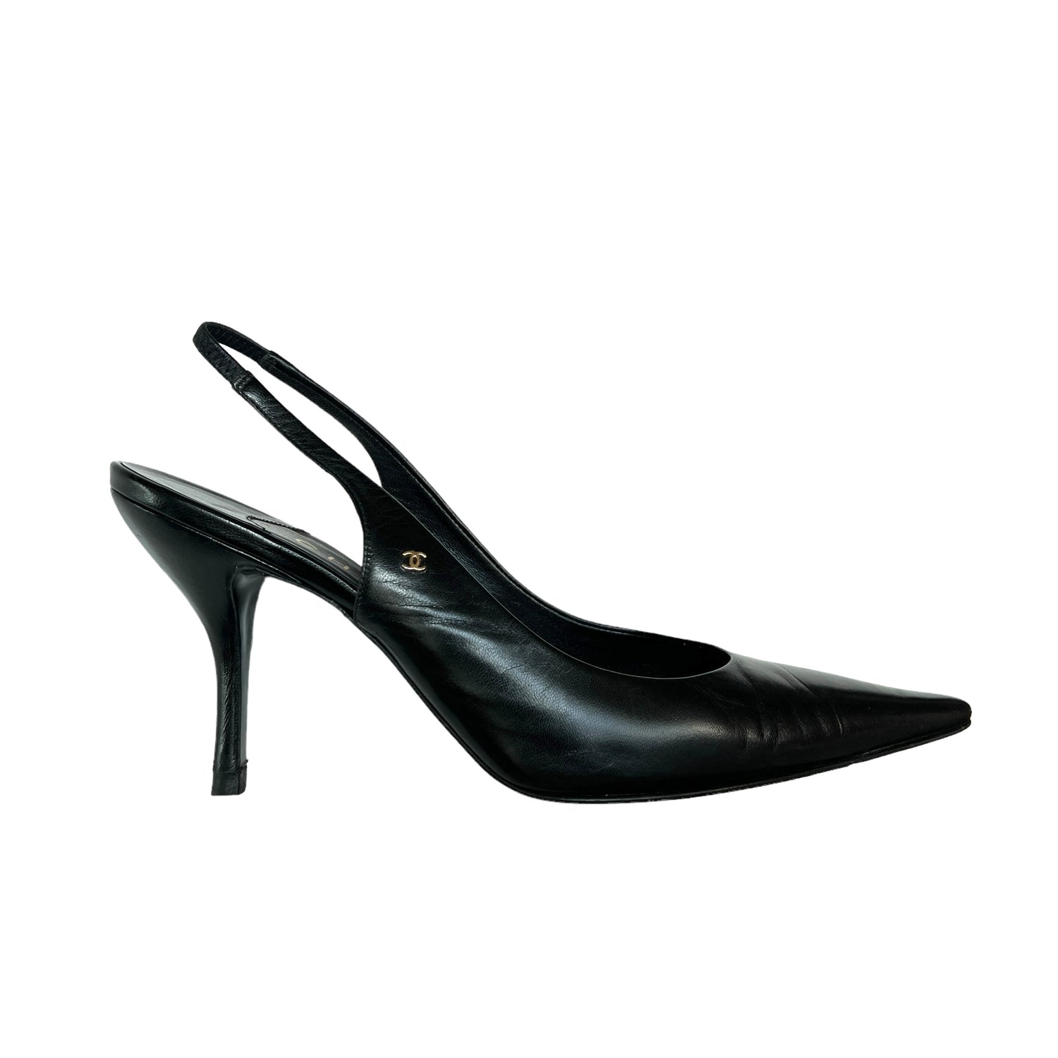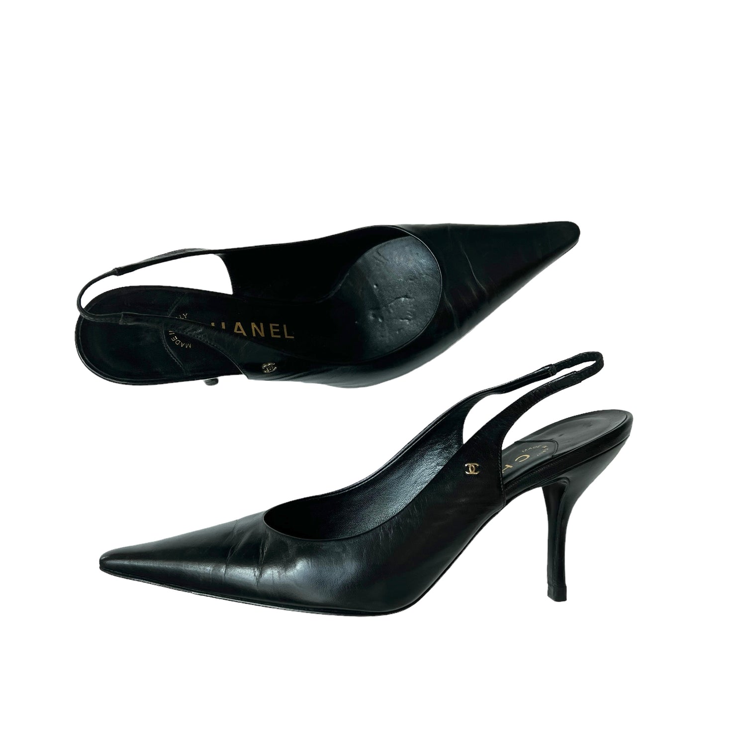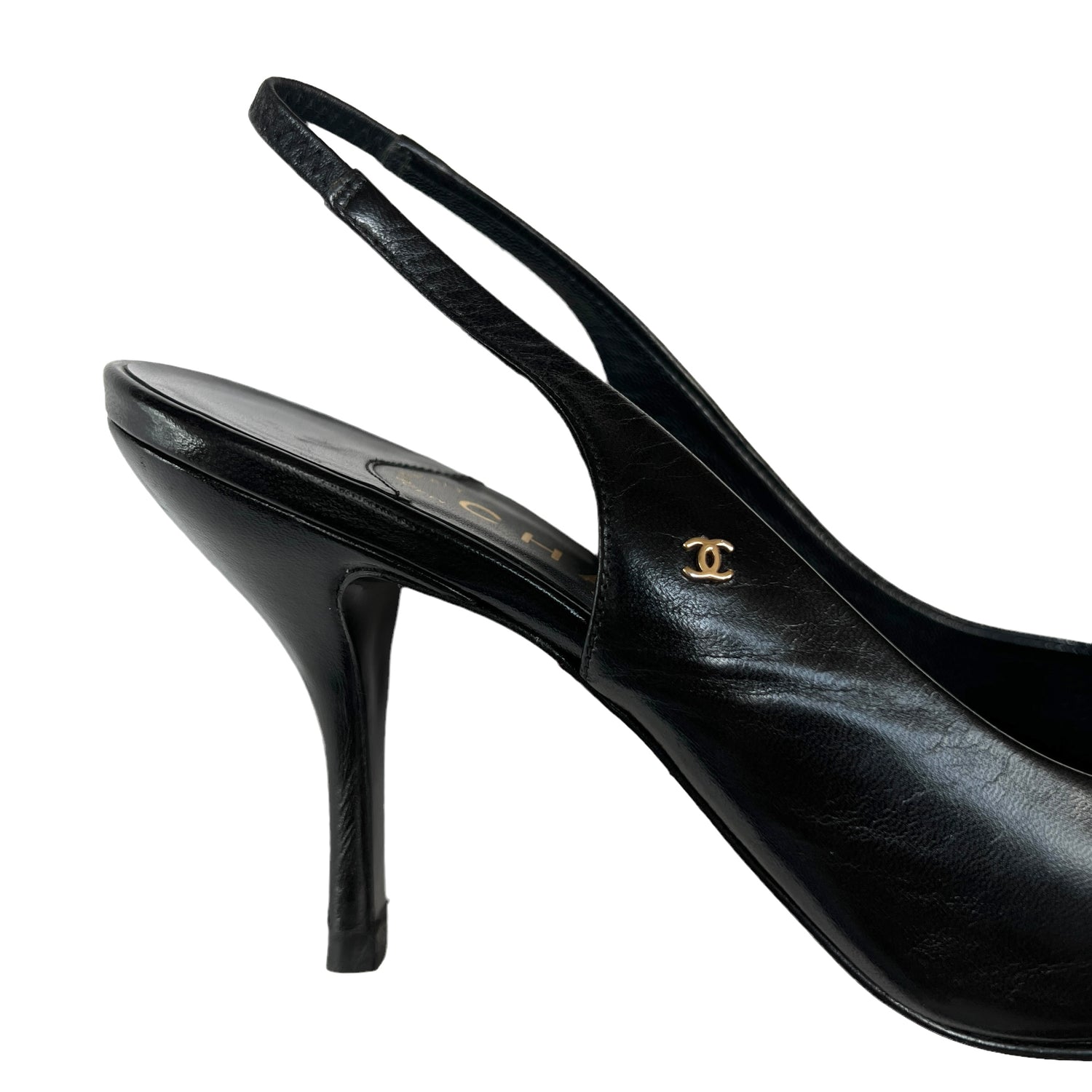 Chanel black leather slingbacks. Interlocking Chanel logo in gold-tone metal. Pointy toes. Designer size 38.