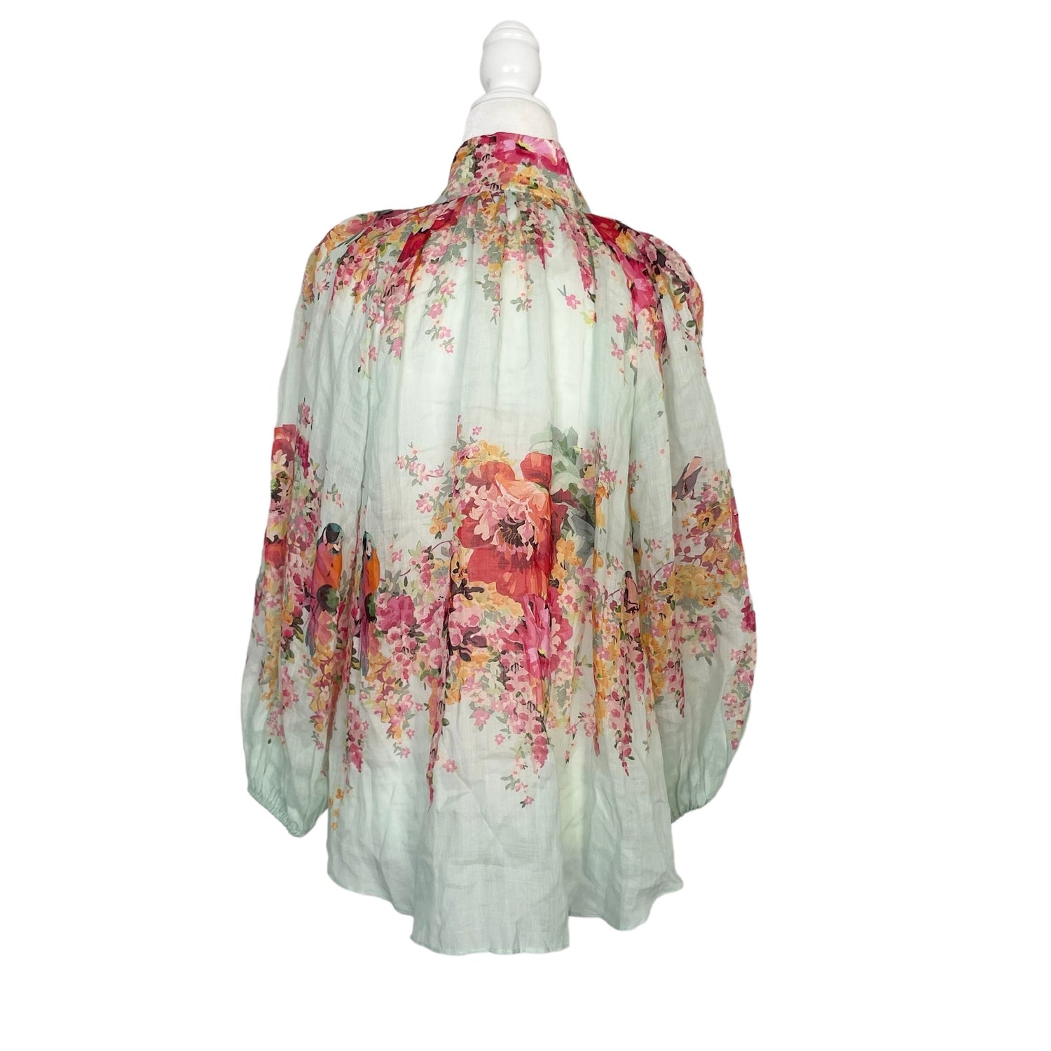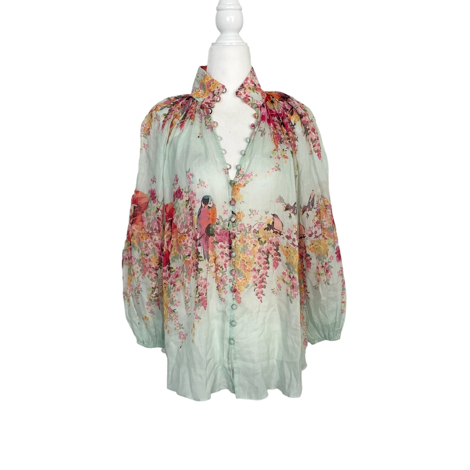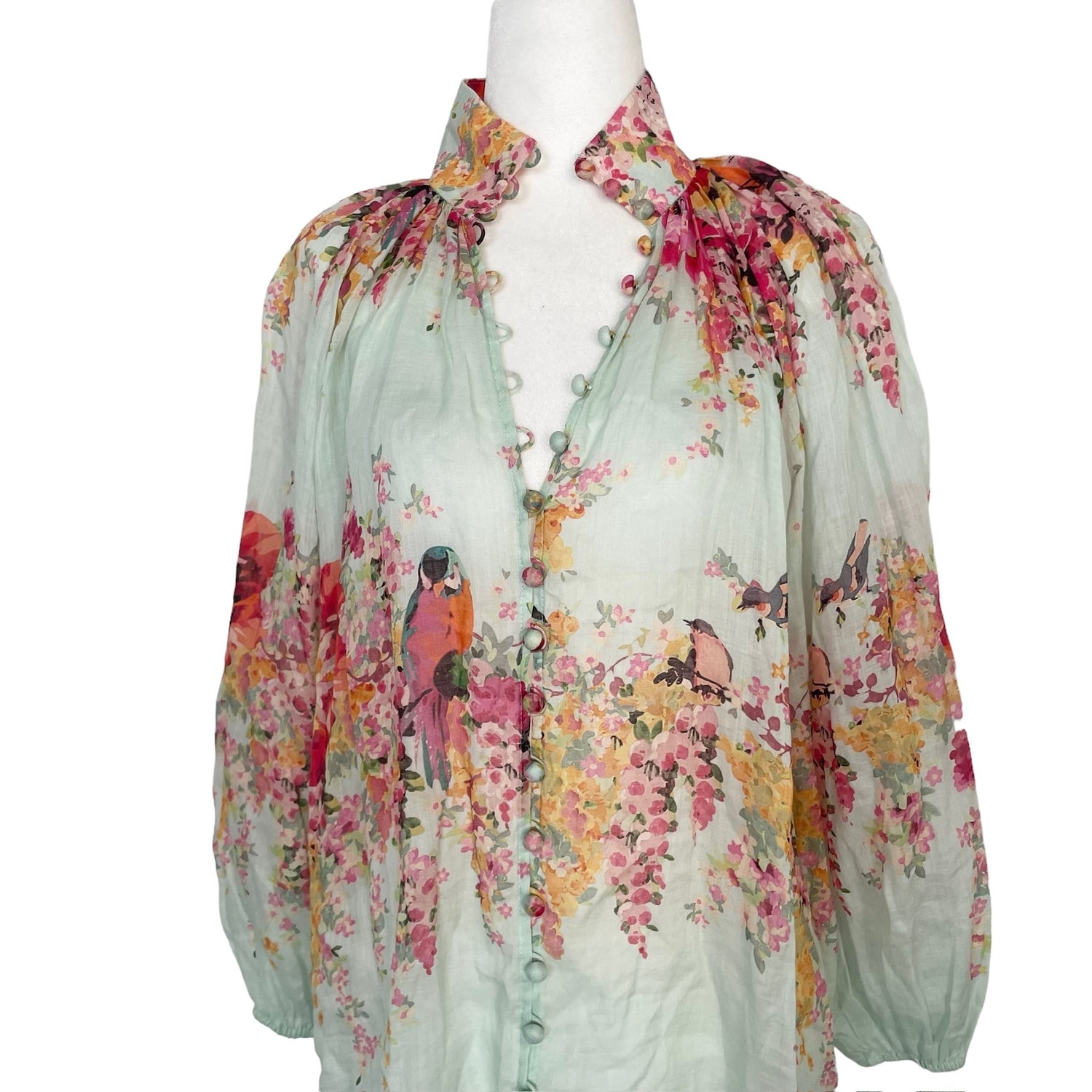 Zimmermann blouse. Beautiful bird and floral print. Mini buttons at front. Whimsical loose and comfortable. Designer size 0.