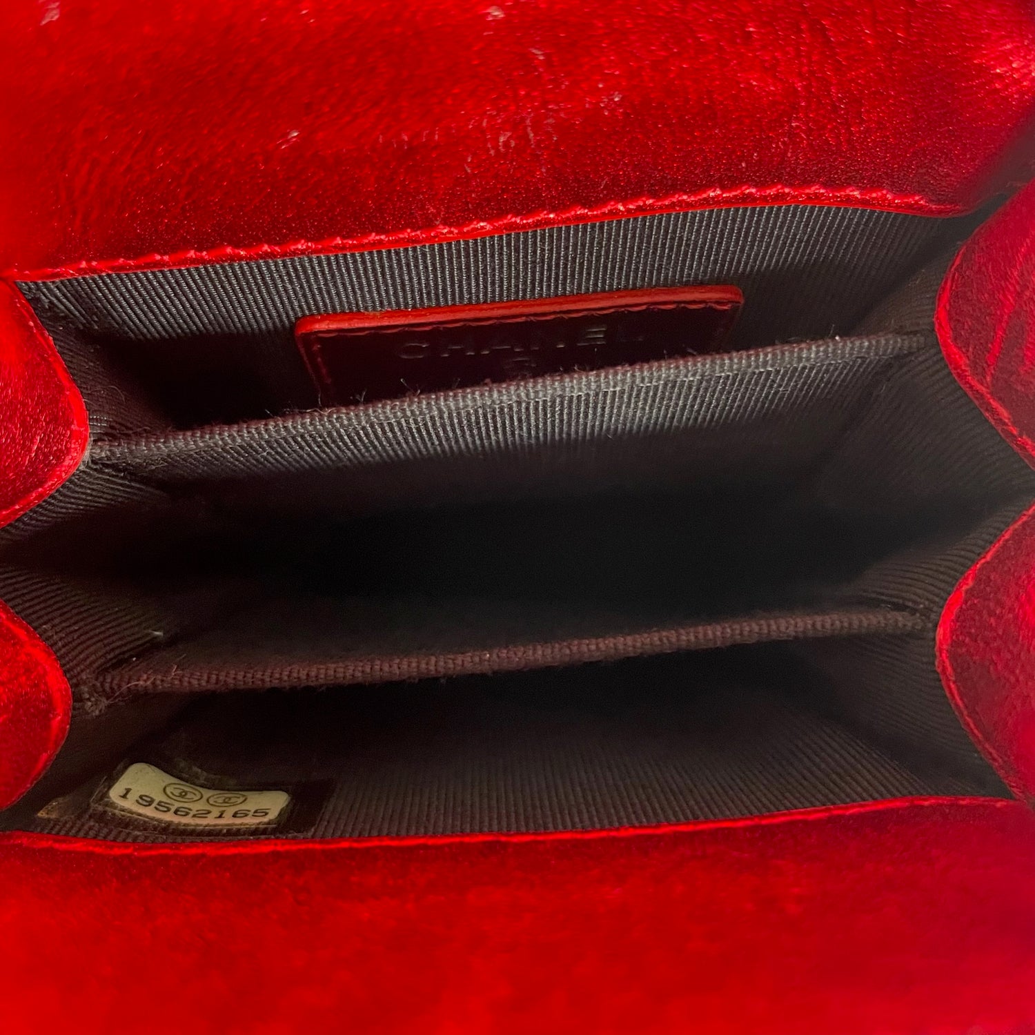 Chanel lipstick red phone holder. Red patent leather. Lambskin leather trims. Double chain. CC logo at front.