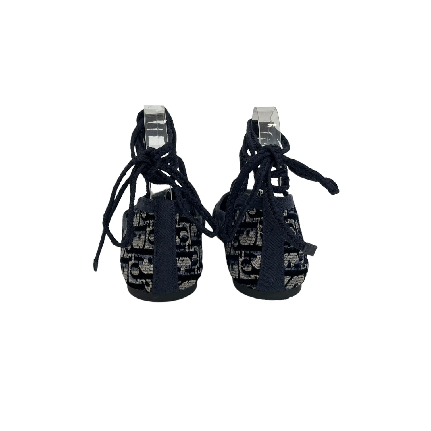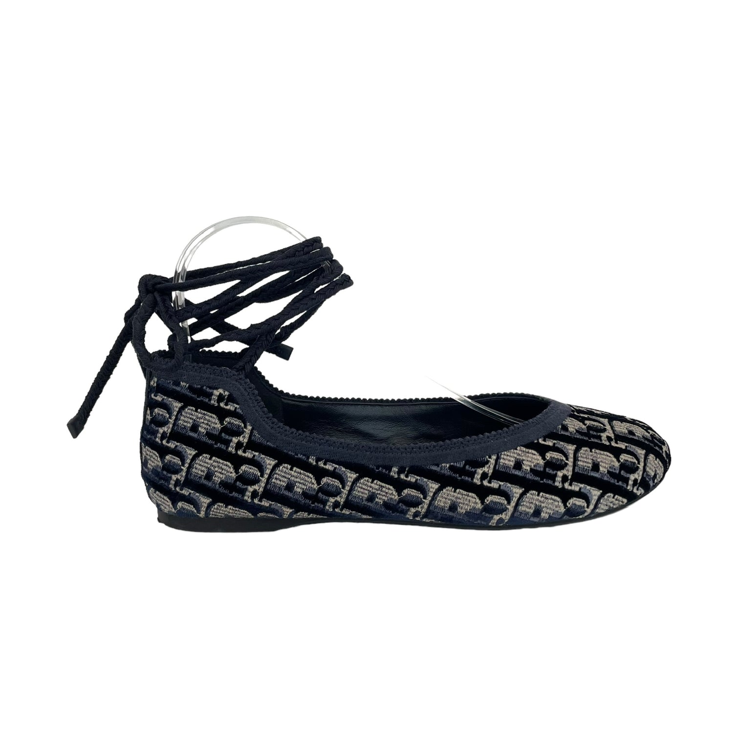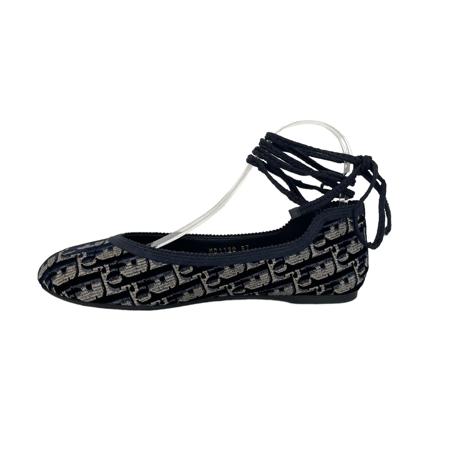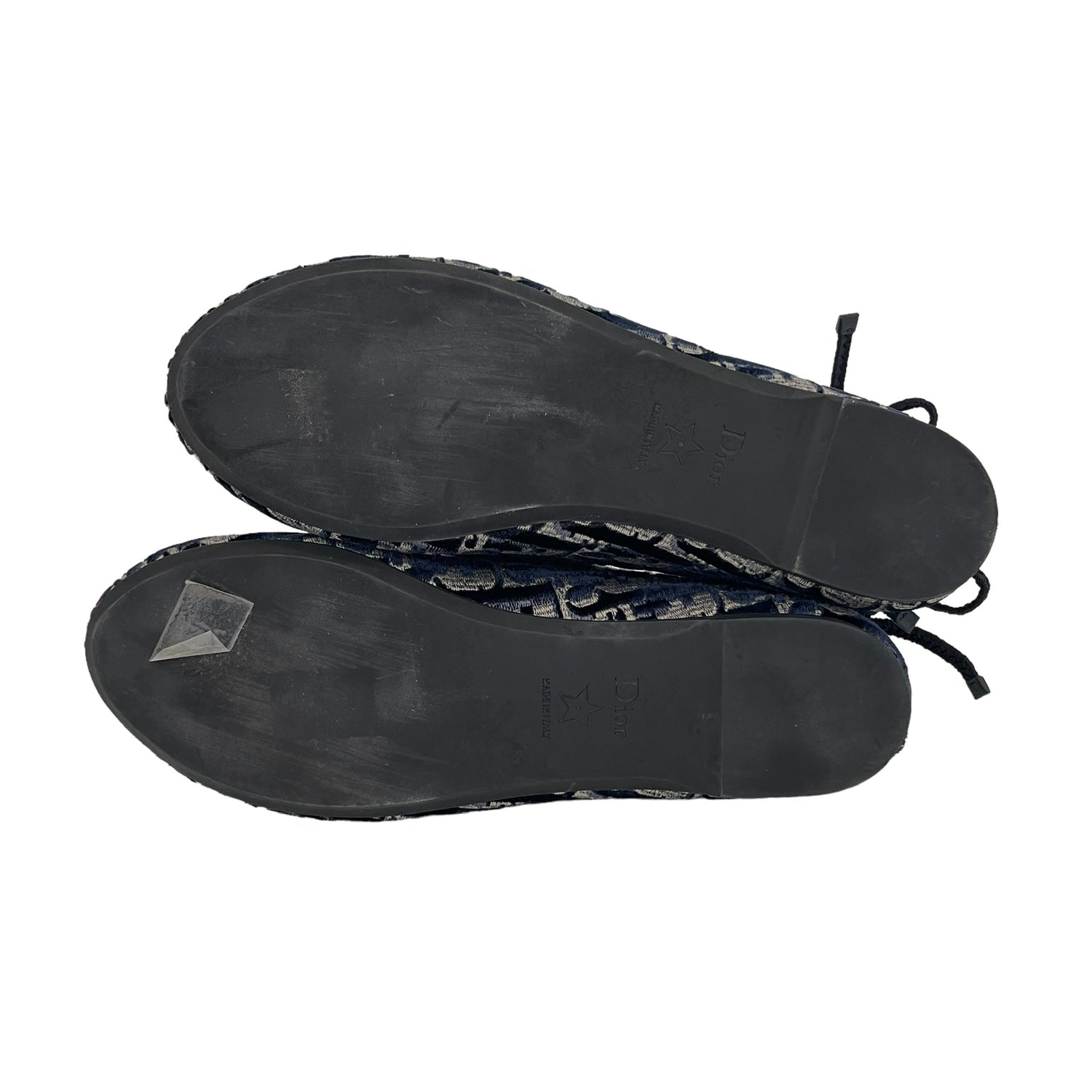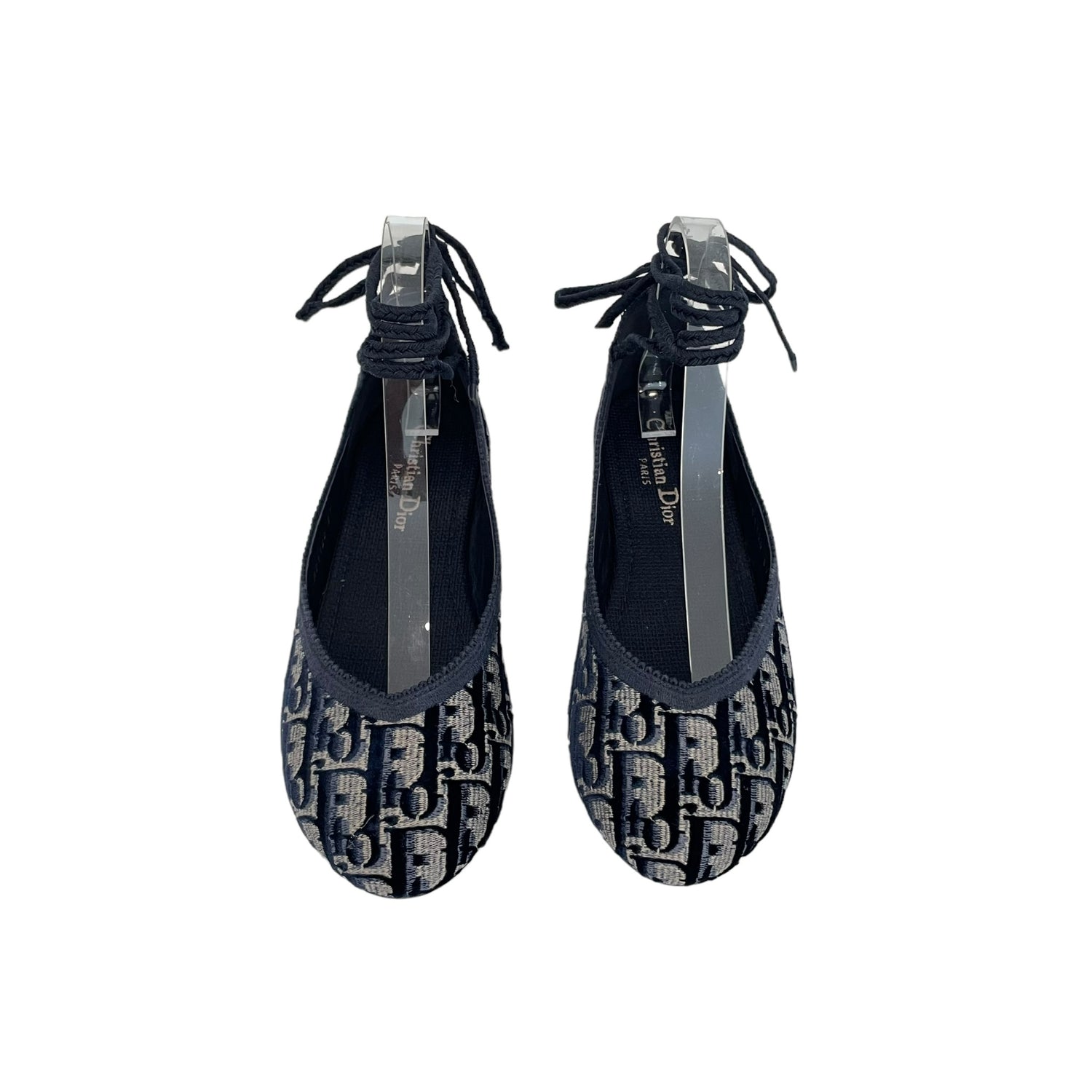 Christian Dior navy ballerina flats. Raised velvet logo throughout. Round toe. Tie at ankle. Designer size 37.