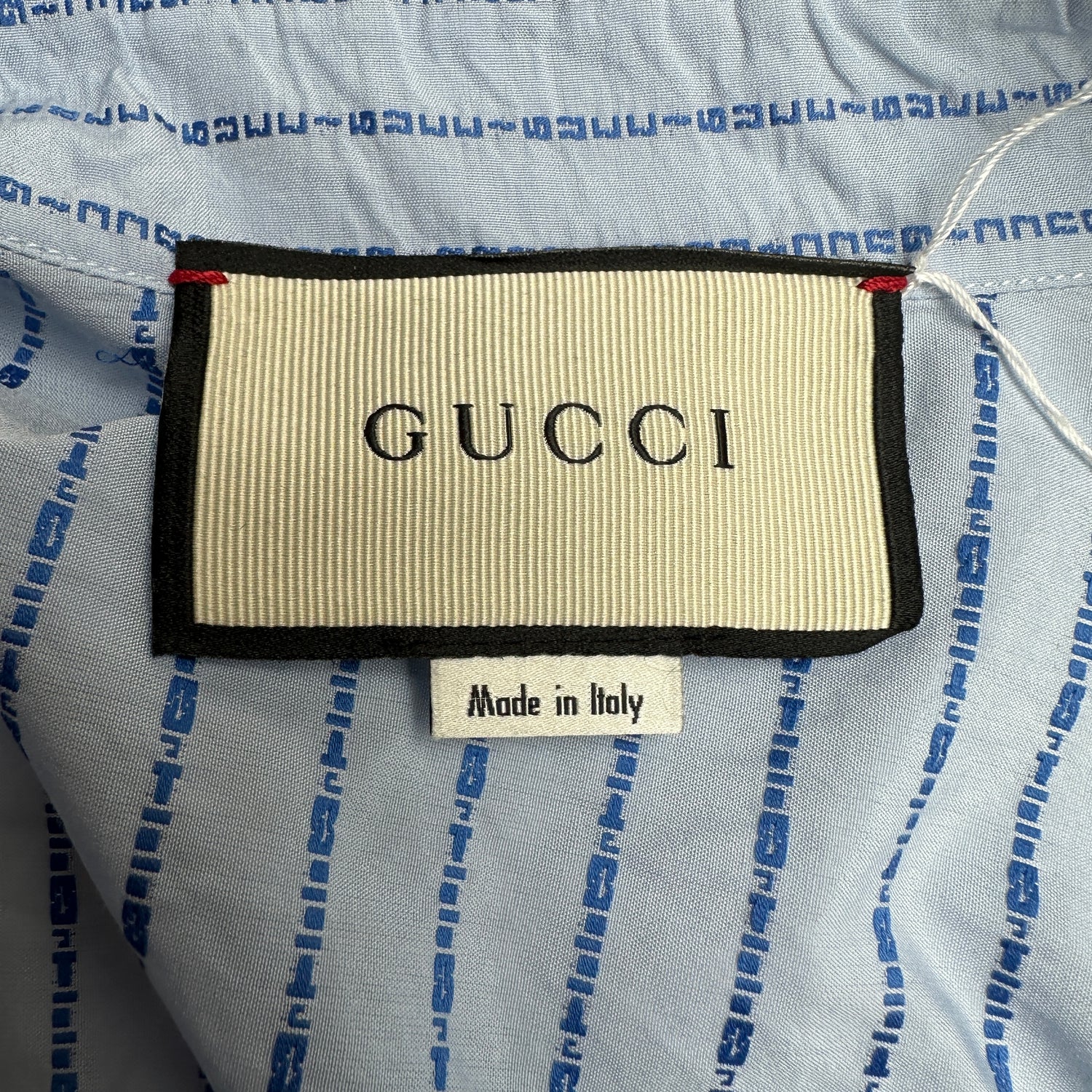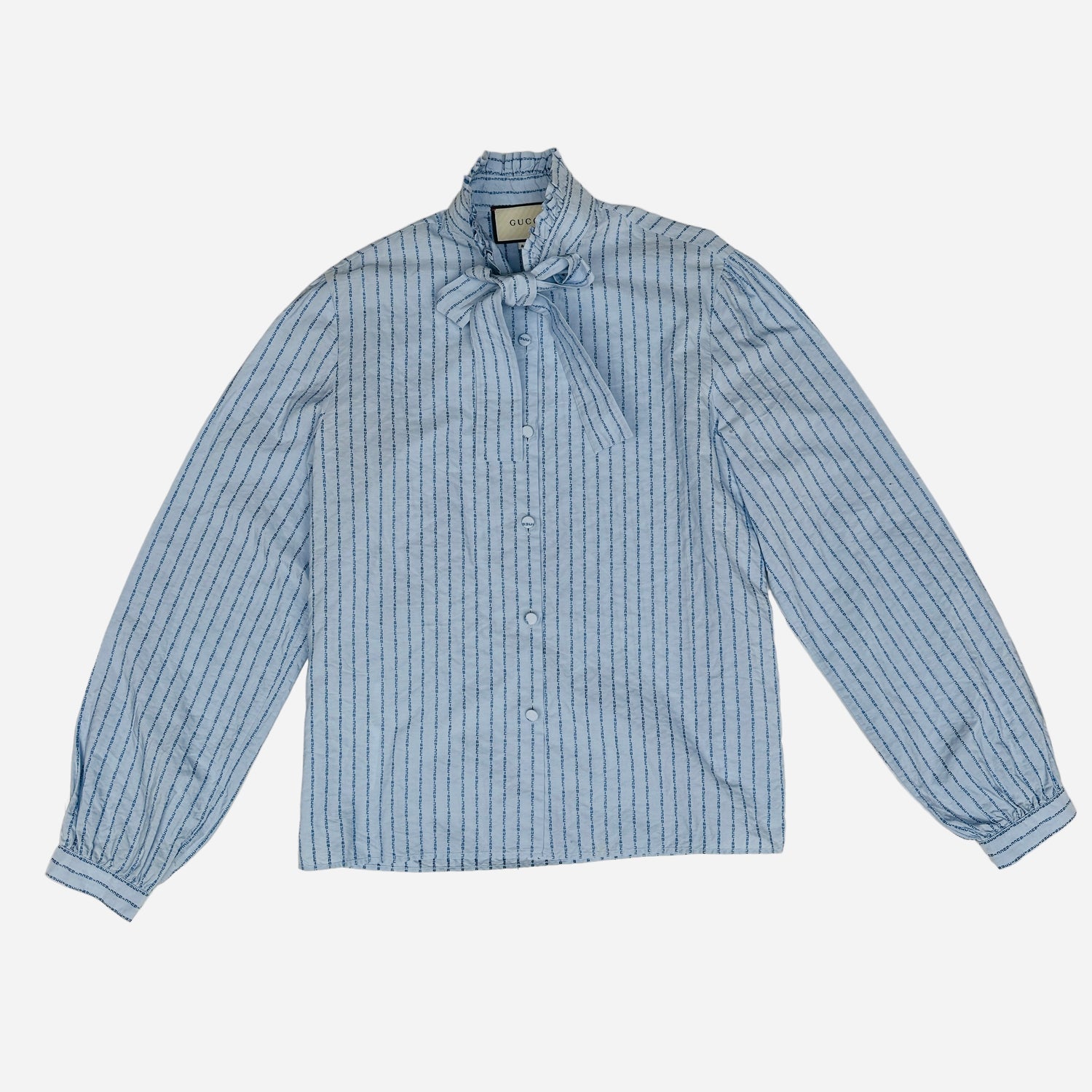 Gucci logo shirt. Blue cotton. Gucci brand pattern throughout. Ruffle neck. Tie at neck can be worn down or as a bow. Button closure at front. Designer size 40.