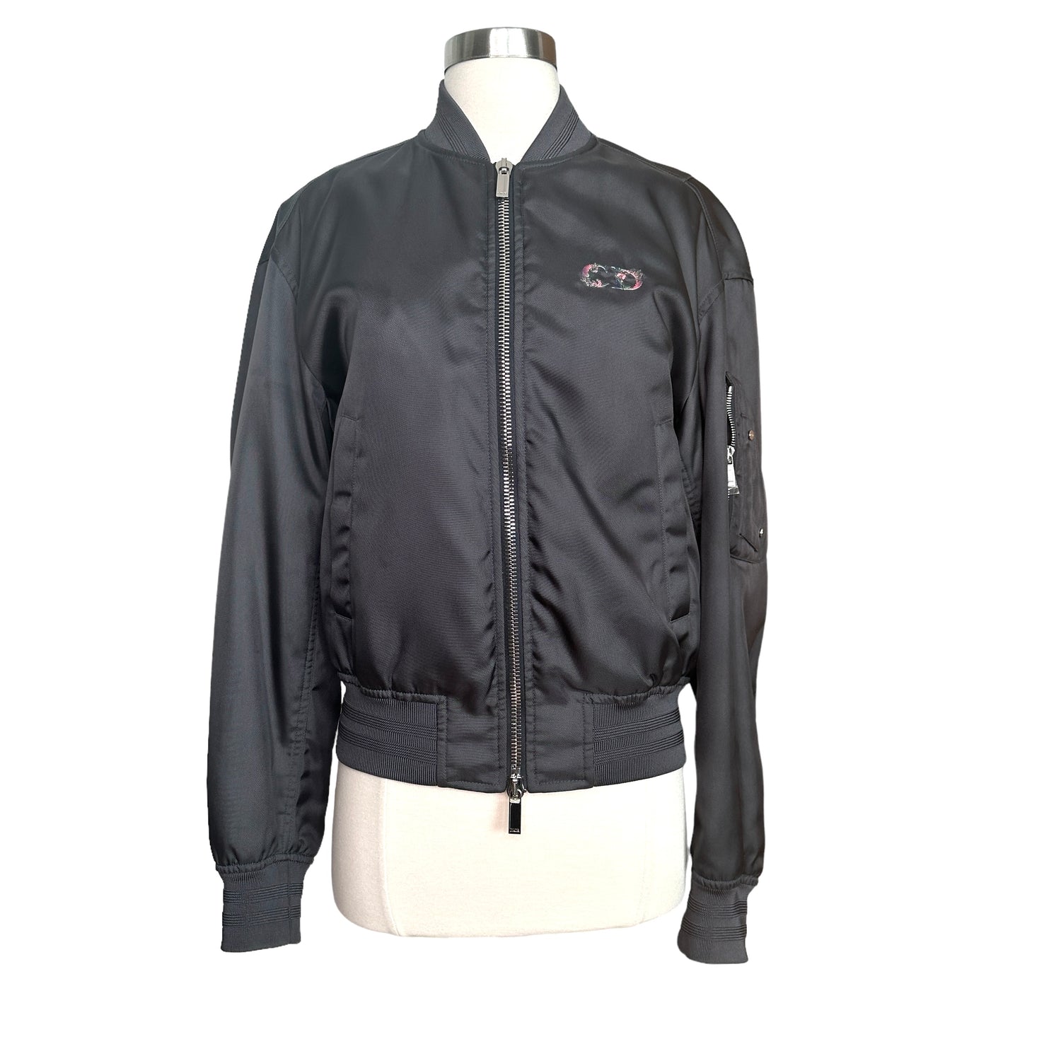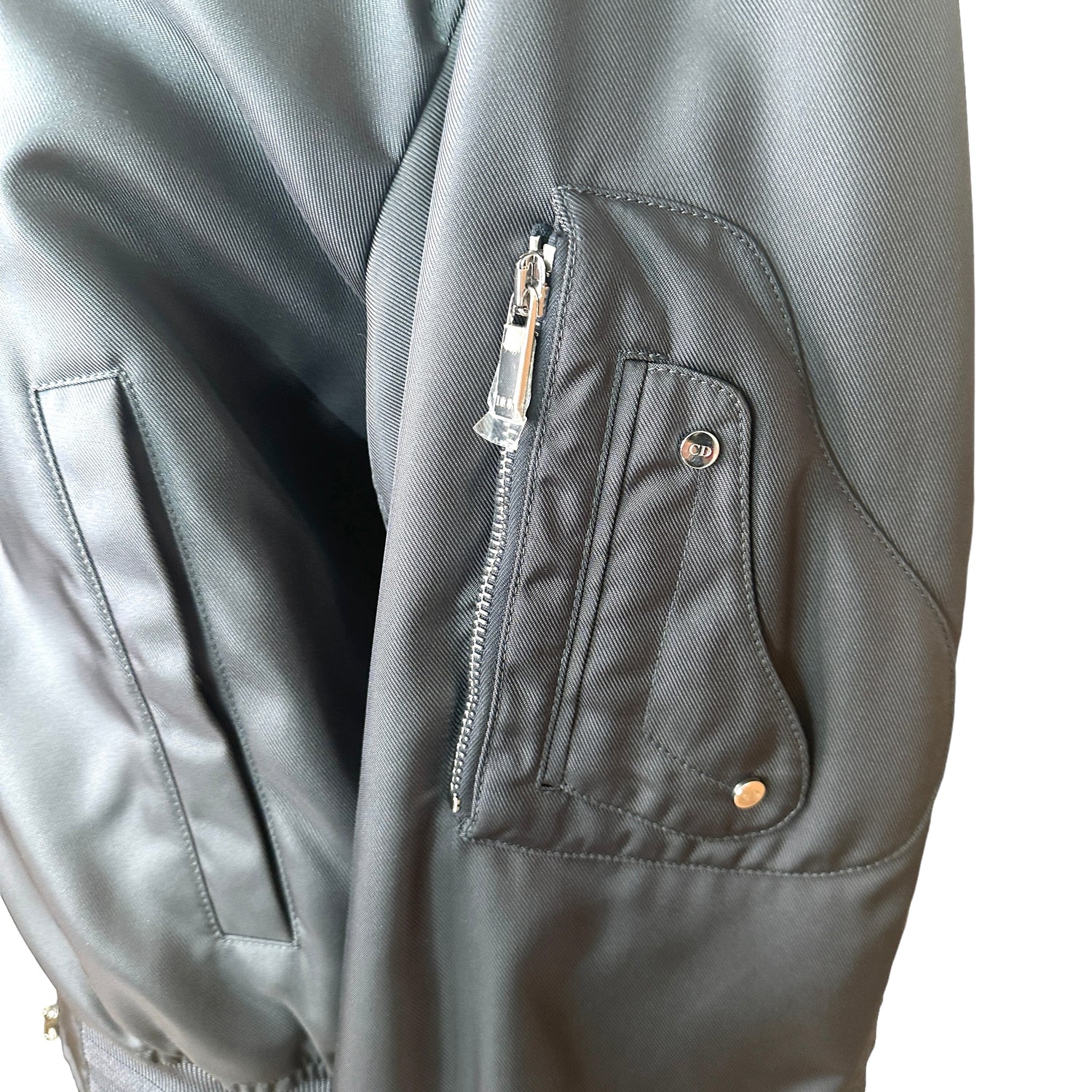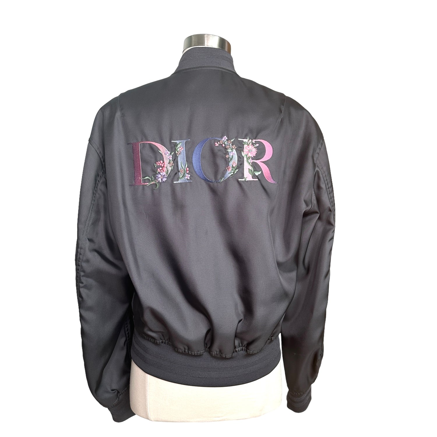 Christian Dior bomber jacket. Grey. Silver-tone hardware. Pockets. Saddle pocket at sleeve. Floral CD logo at front. Dior floral logo at back. Designer size 44 men.