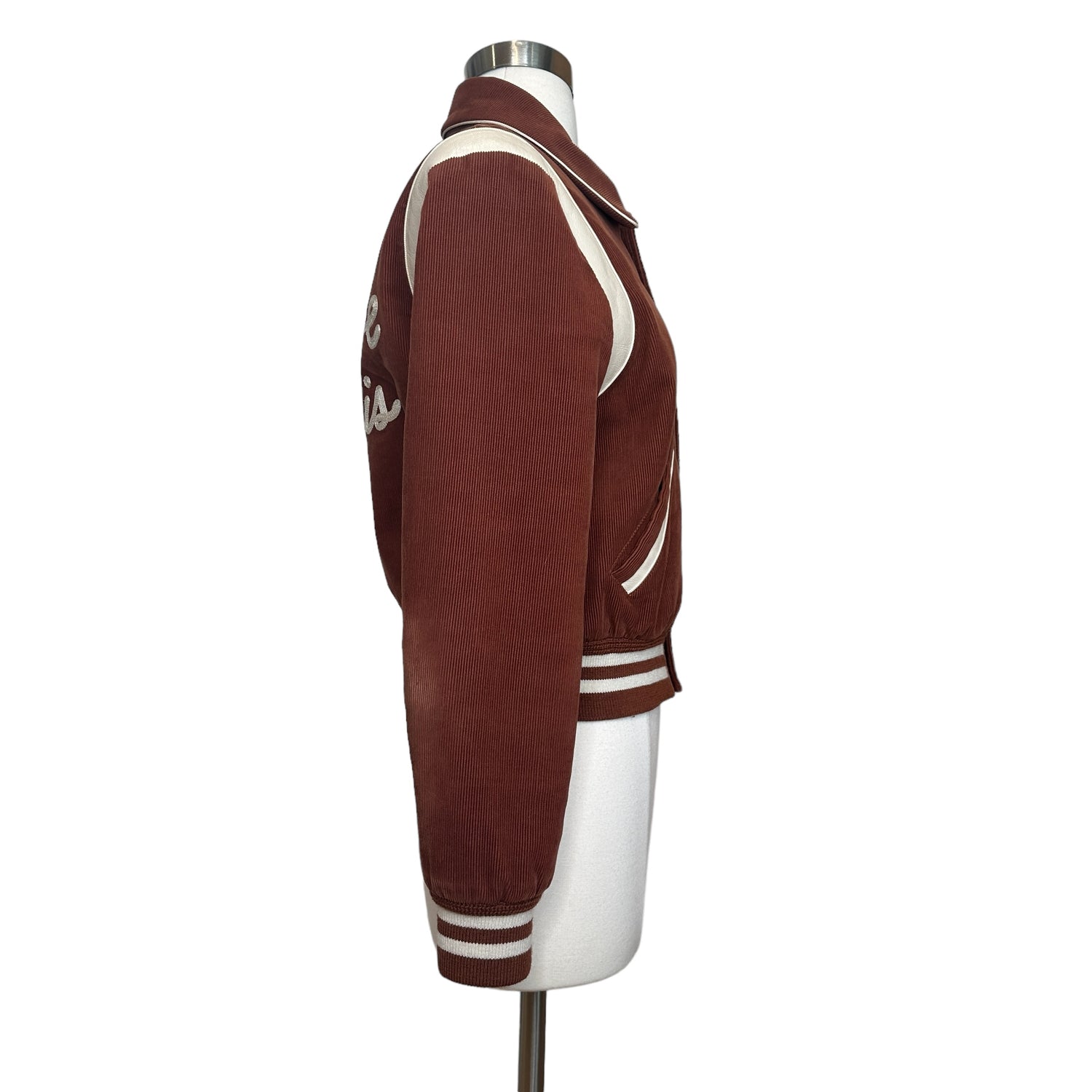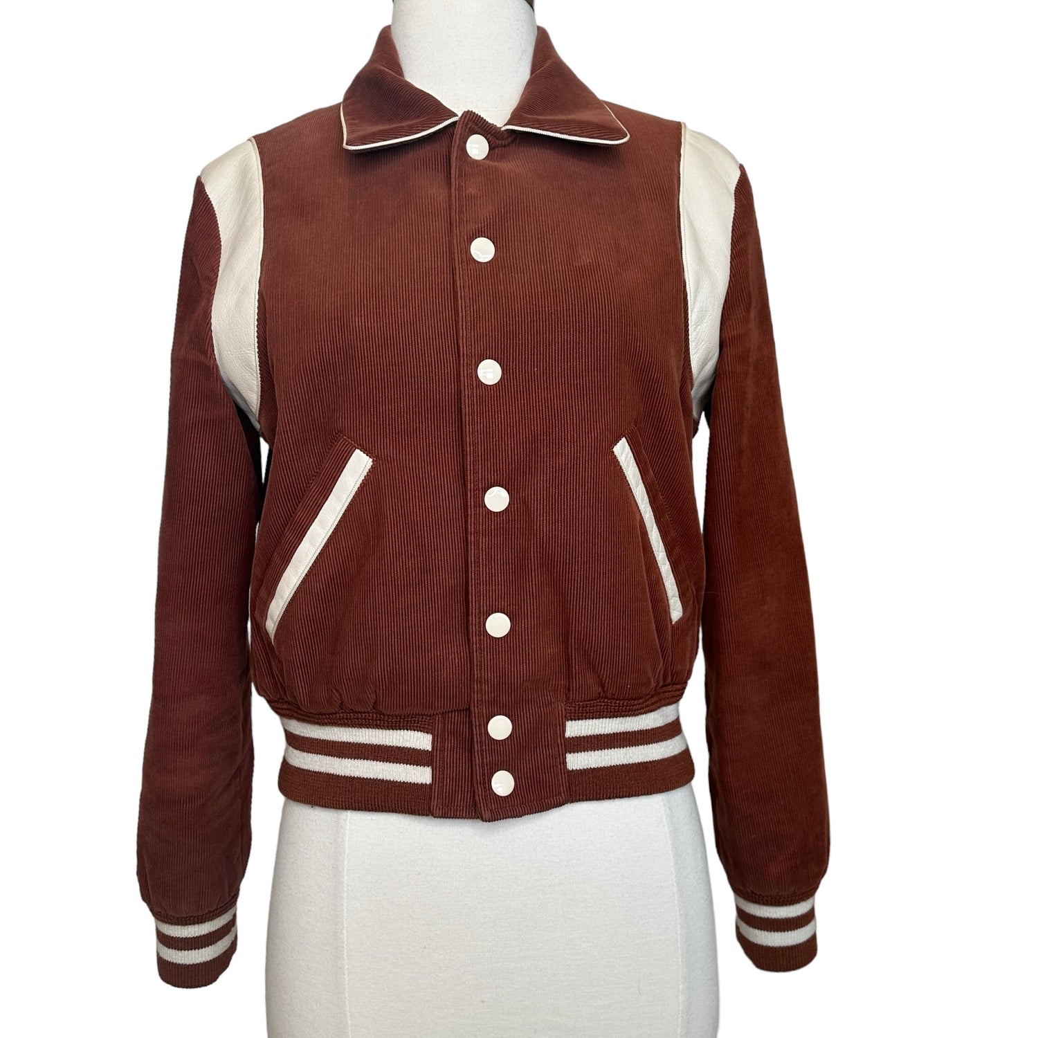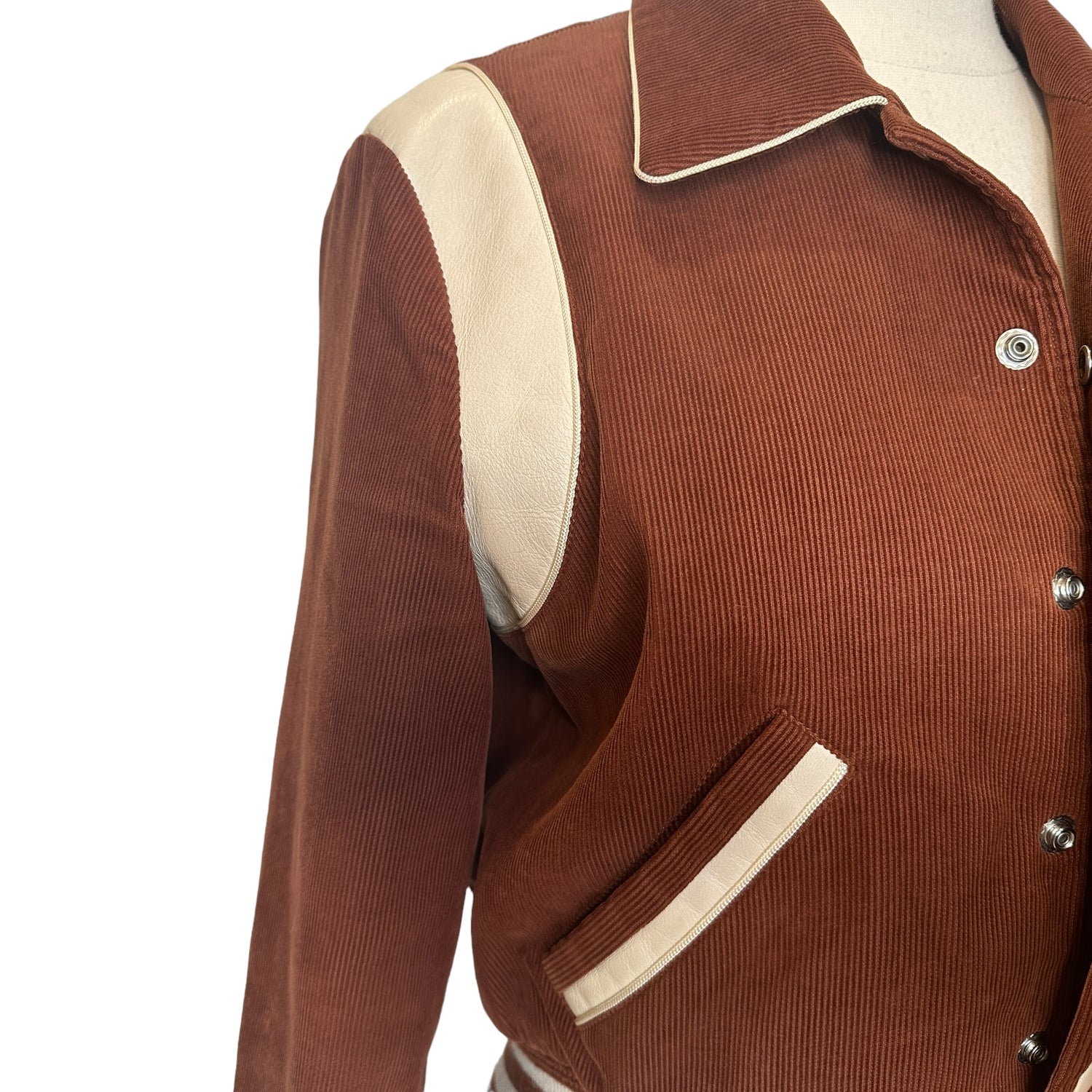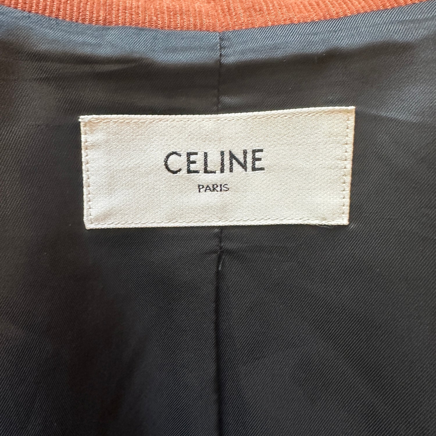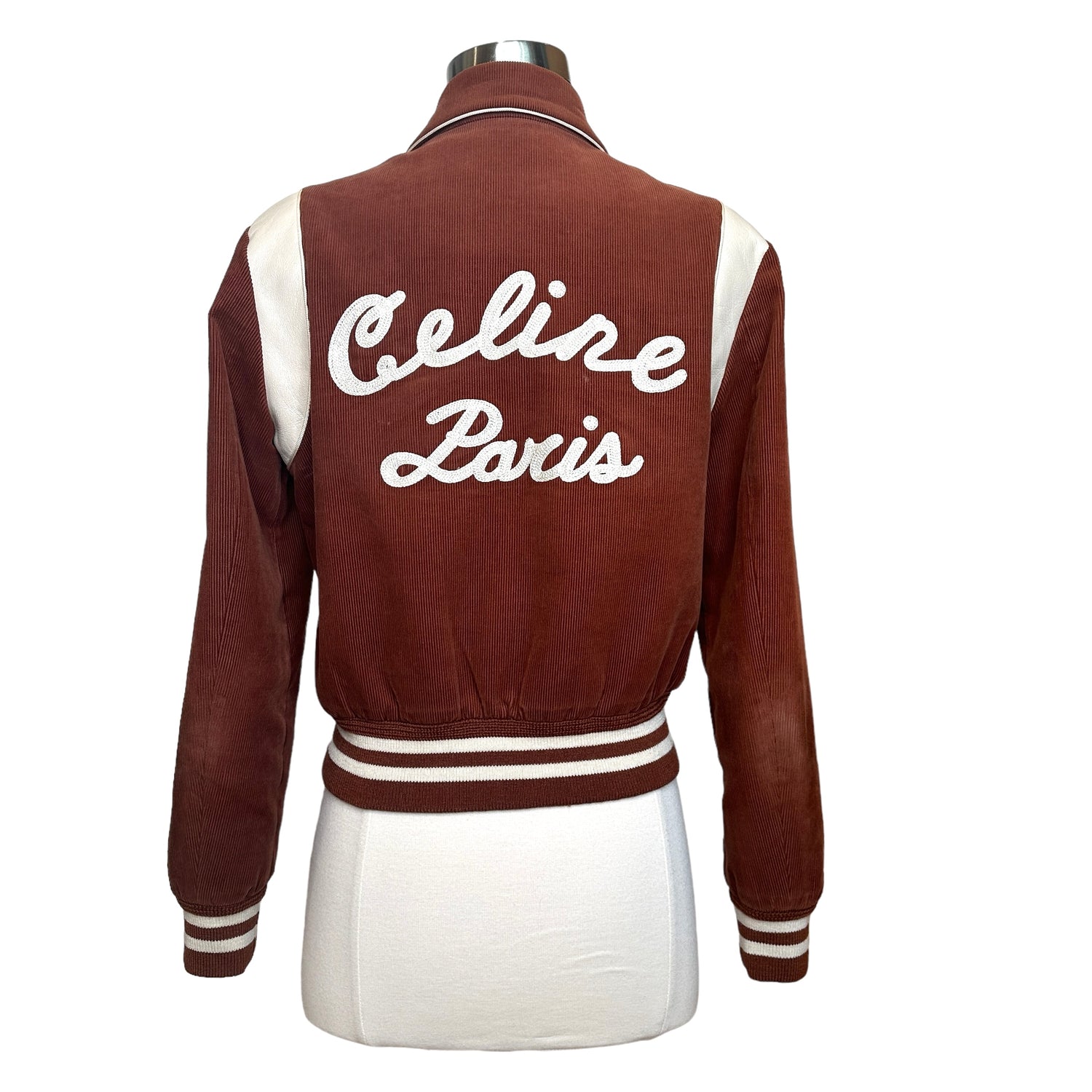 Celine camel corduroy bomber jacket. Embroidered logo at back. Slit pockets. Button closure at front. Cream leather trims at shoulders and pockets. Designer size 36.