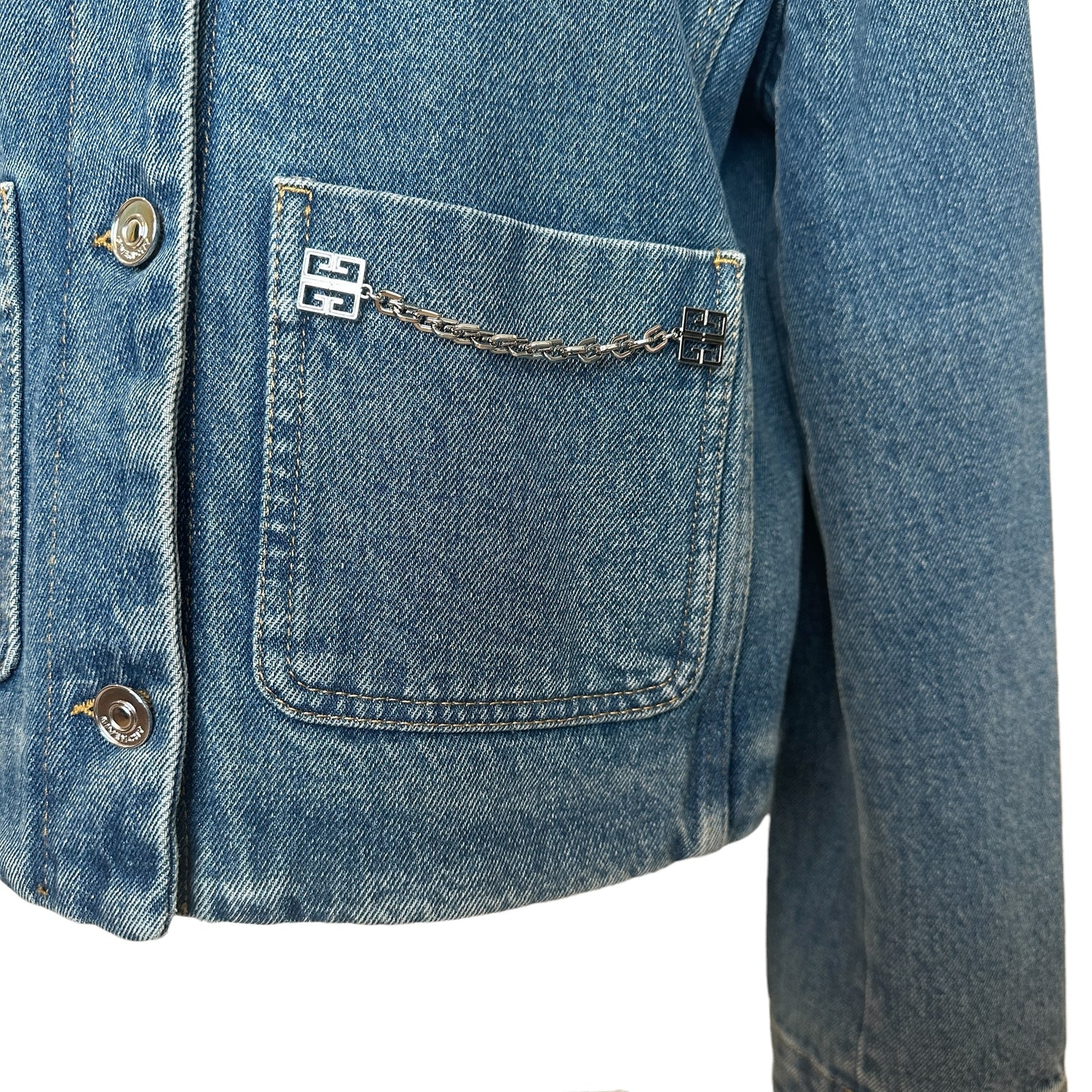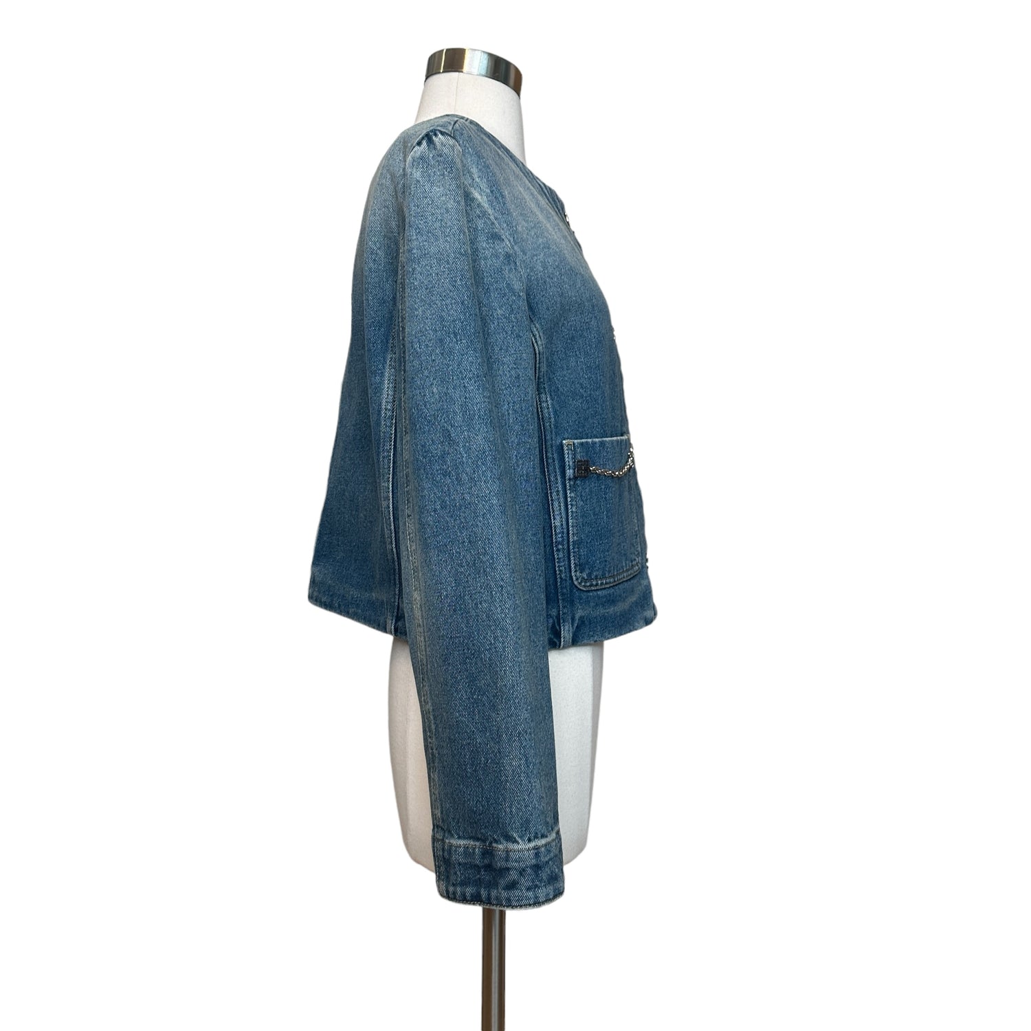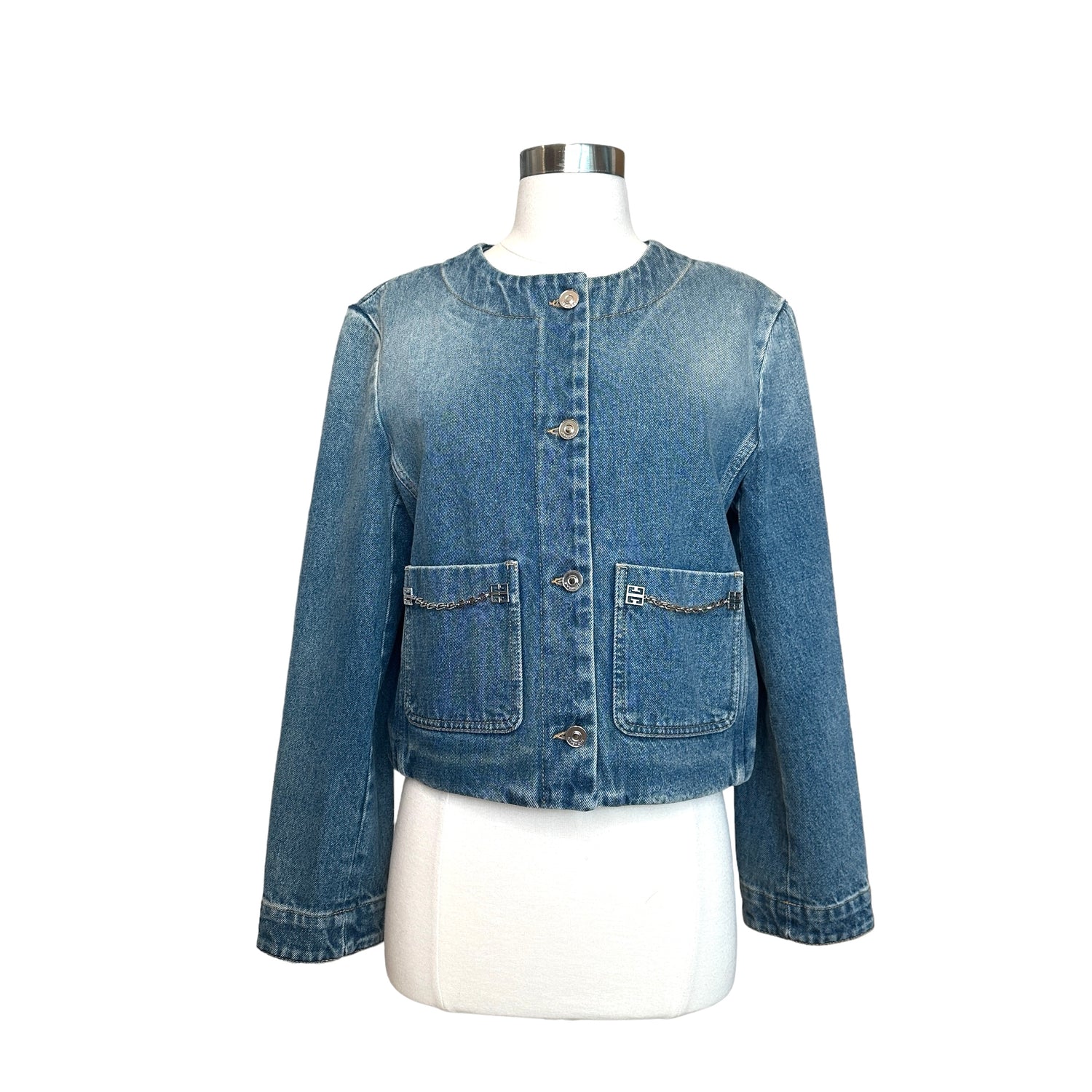 Givenchy denim jacket. Current and new with tags. Silver-tone hardware and logos at pockets. Patch pockets. Collarless. Logo silver button closure at front. Designer size small.