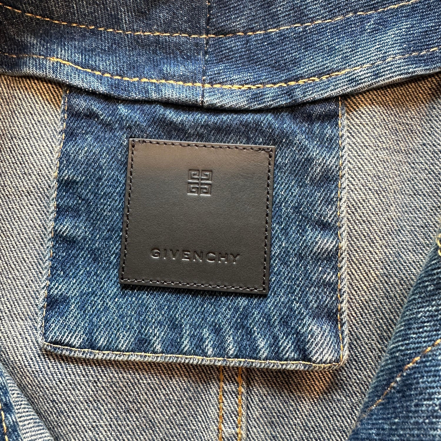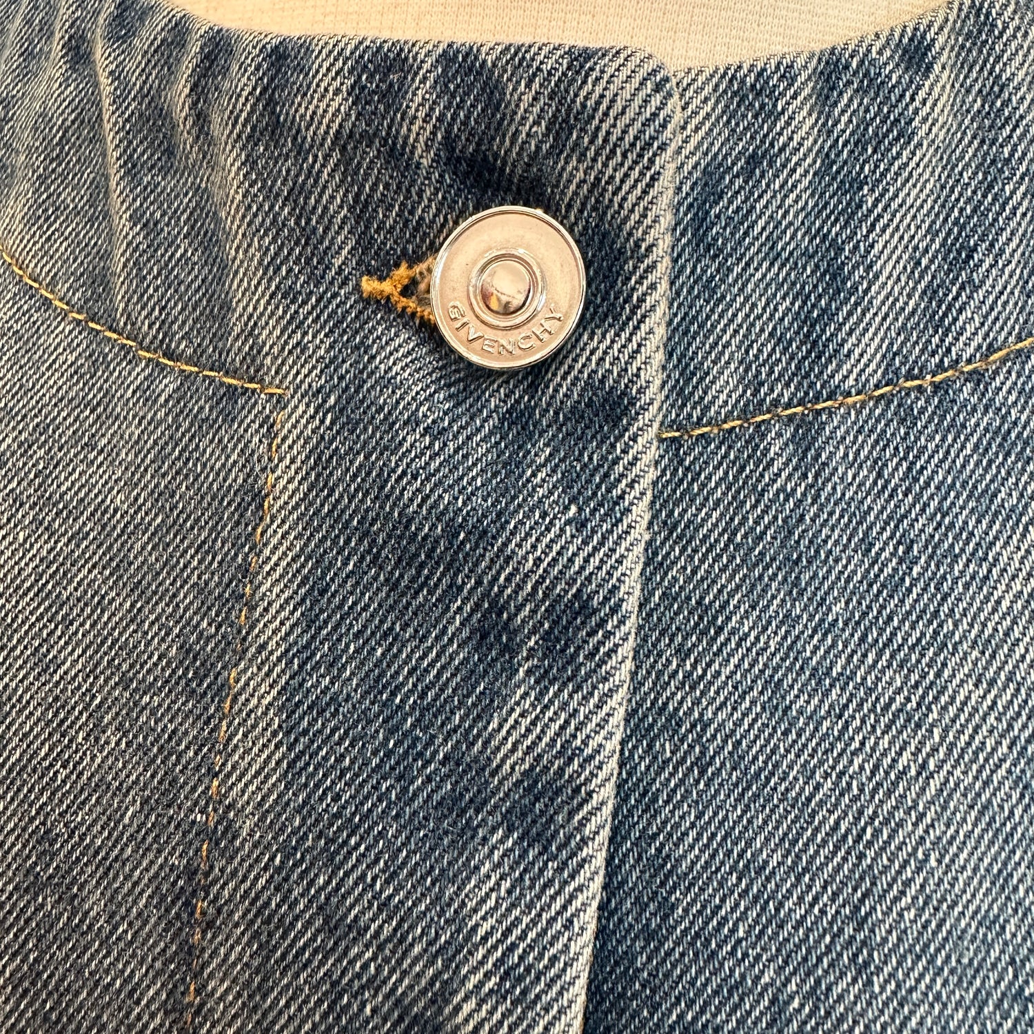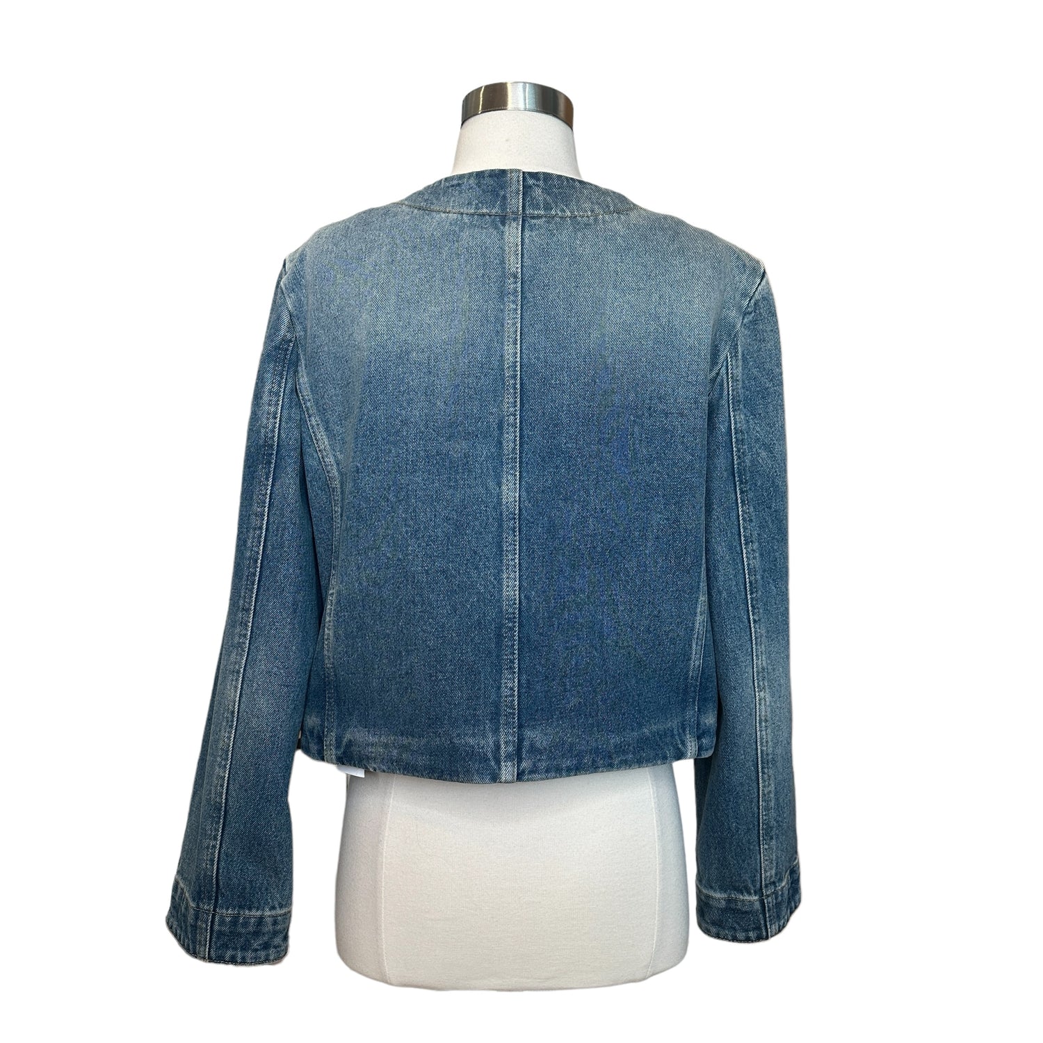 Givenchy denim jacket. Current and new with tags. Silver-tone hardware and logos at pockets. Patch pockets. Collarless. Logo silver button closure at front. Designer size small.