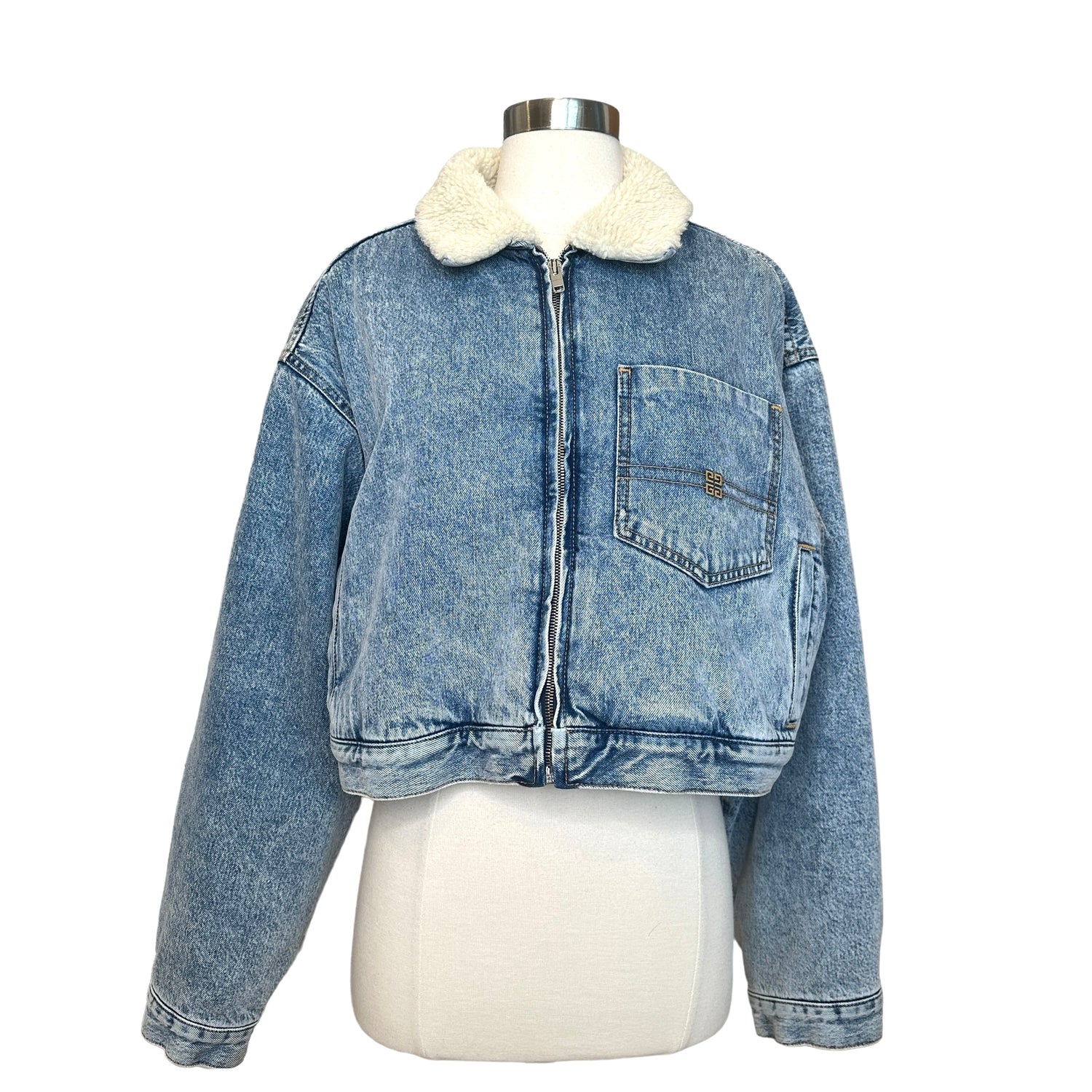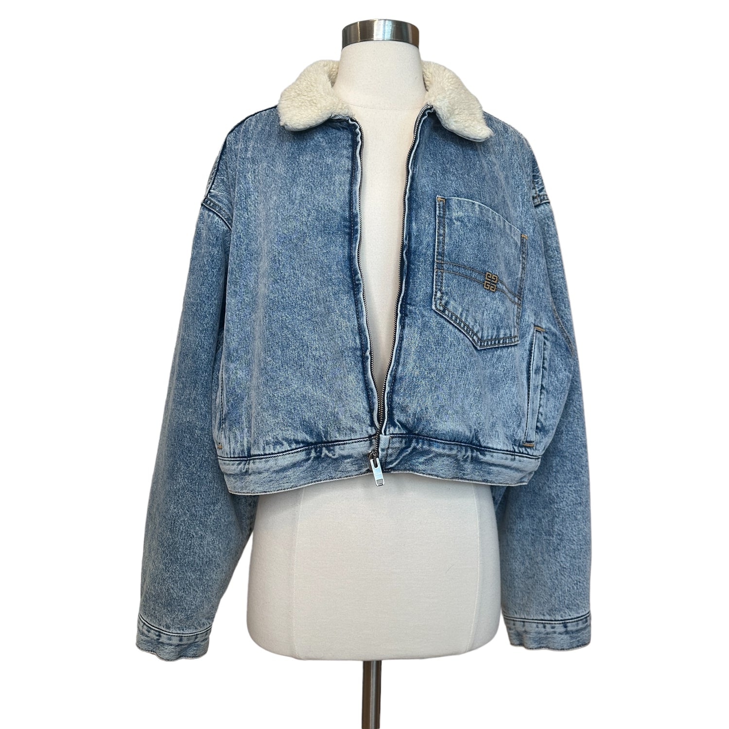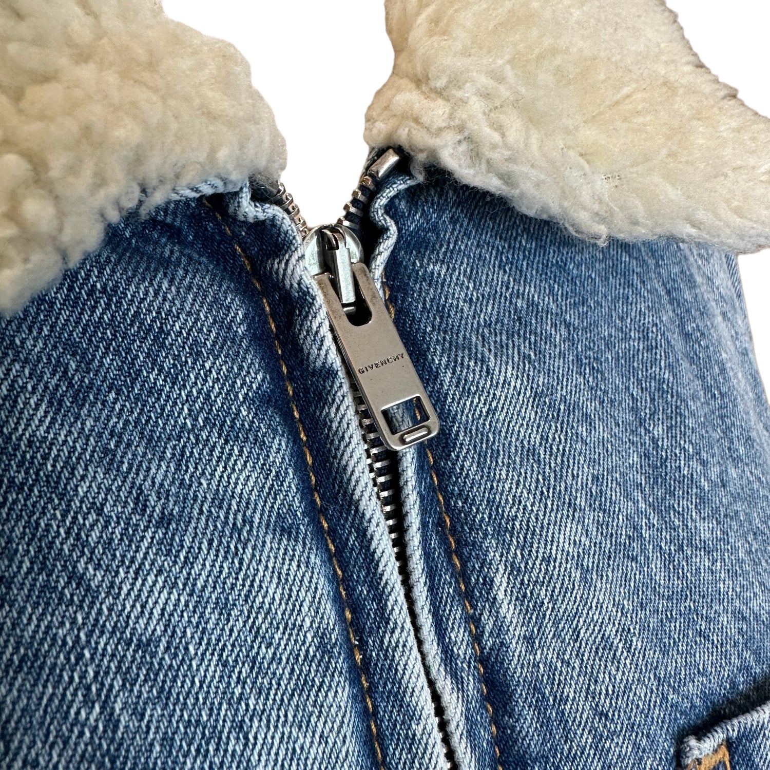 Givenchy oversized cropped denim jacket. Current and new with tags. Shearling lined. Pointed collar. Silver-tone zipper closure at front. Slit pockets and one large logo patch pocket at front. Adjustable at size for more of a poofy look. Designer size medium.