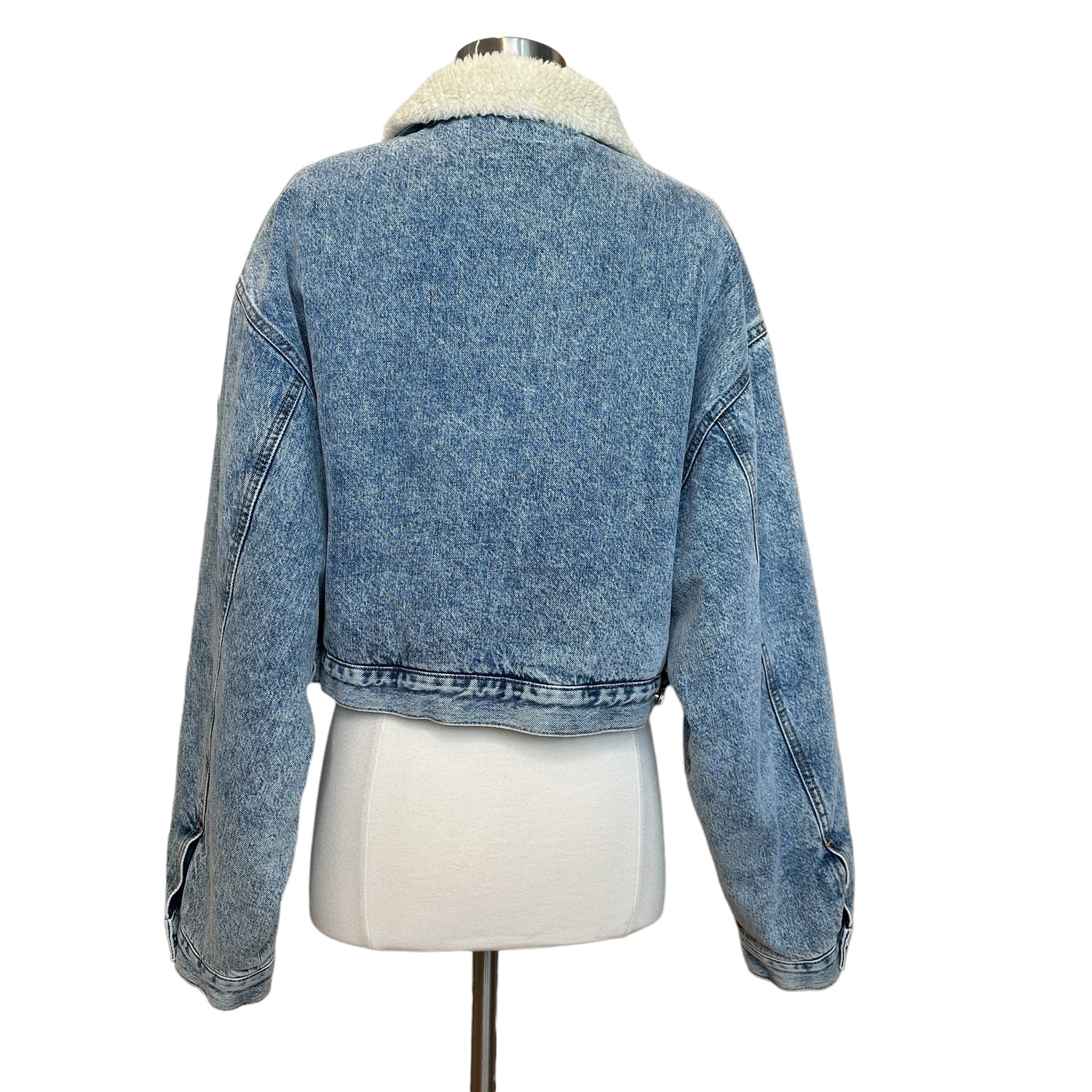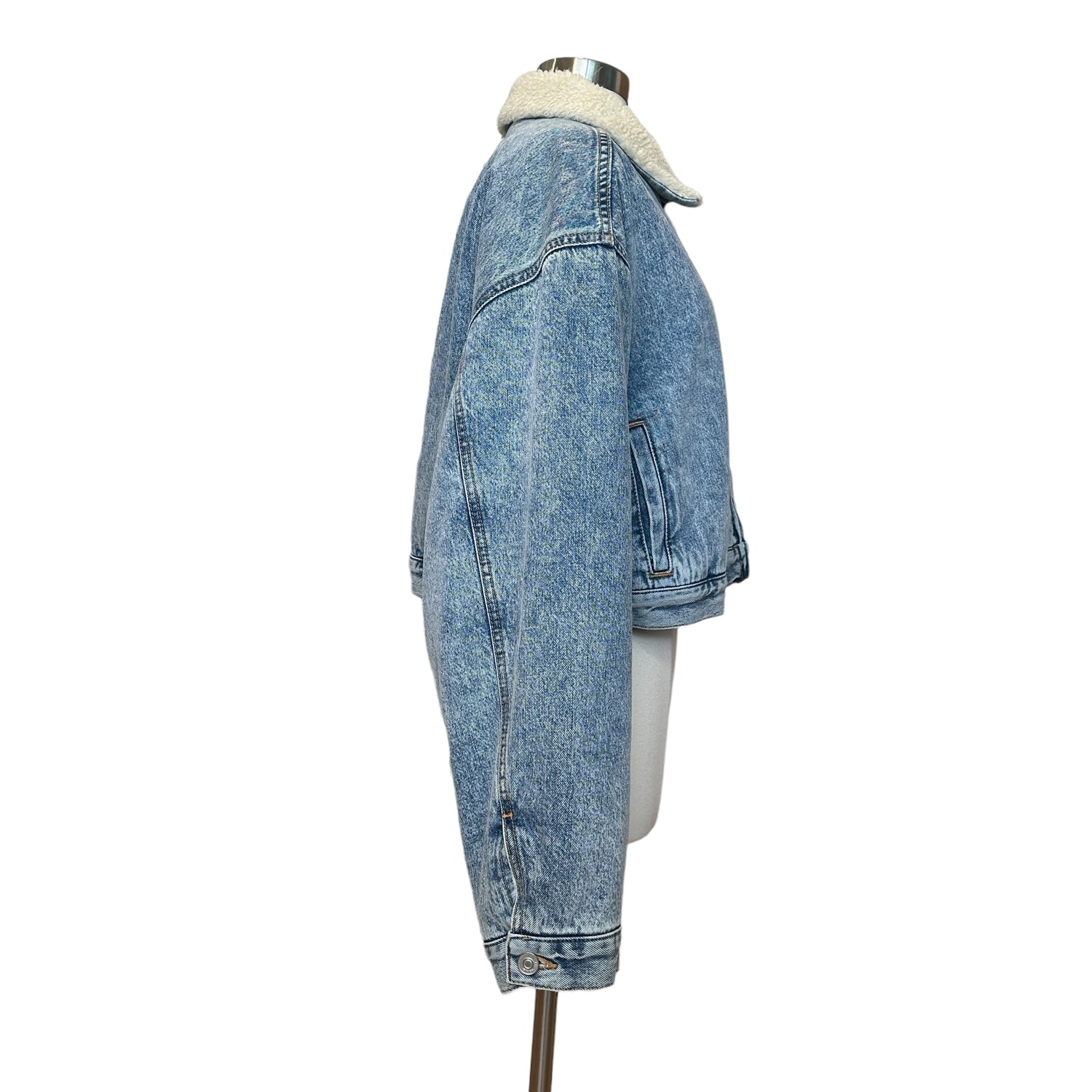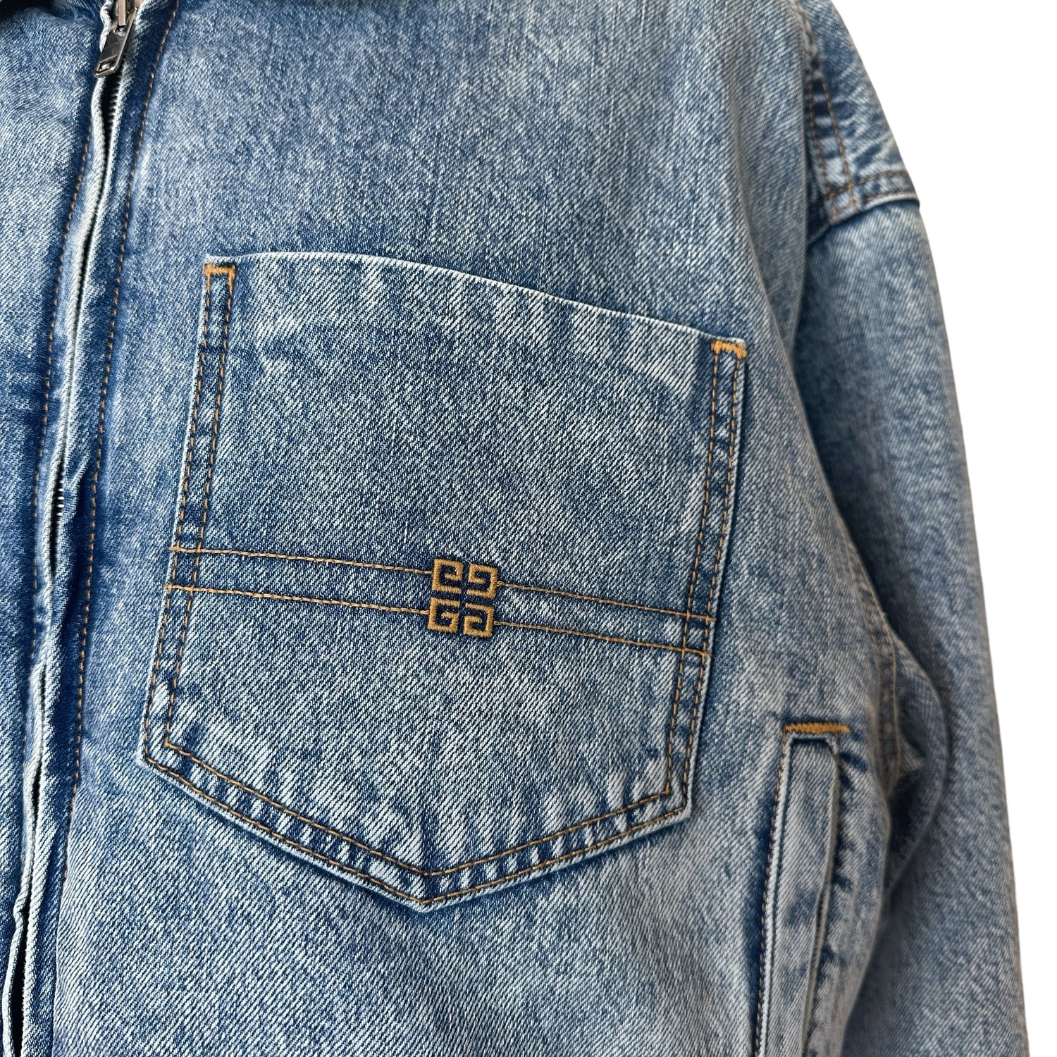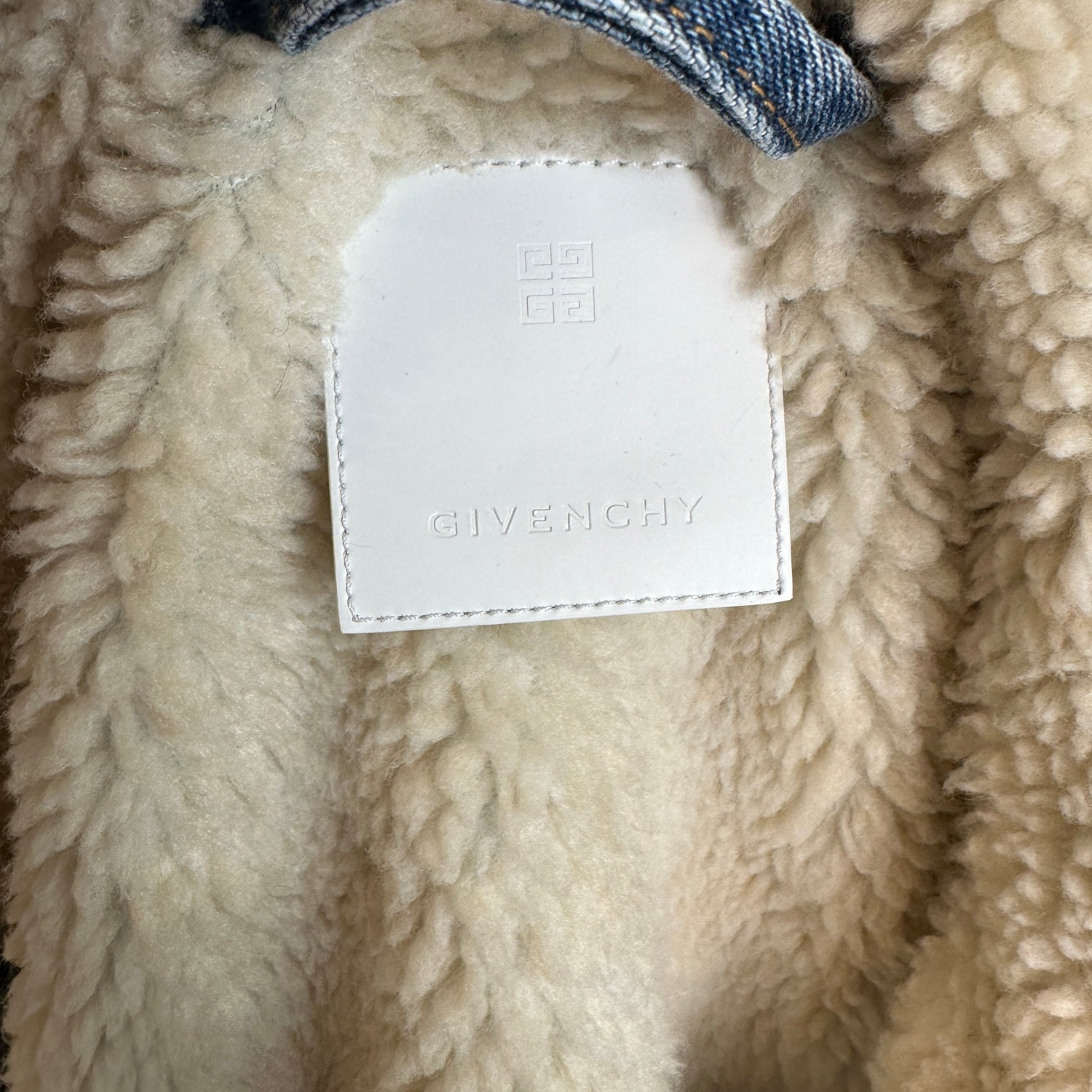 Givenchy oversized cropped denim jacket. Current and new with tags. Shearling lined. Pointed collar. Silver-tone zipper closure at front. Slit pockets and one large logo patch pocket at front. Adjustable at size for more of a poofy look. Designer size medium.