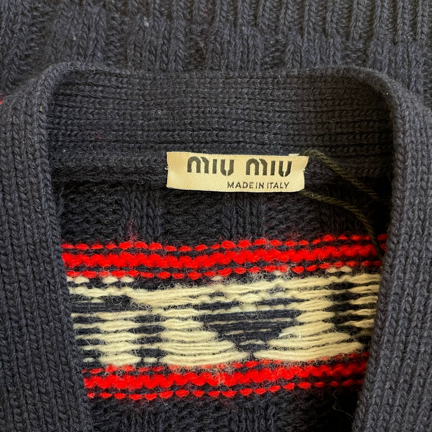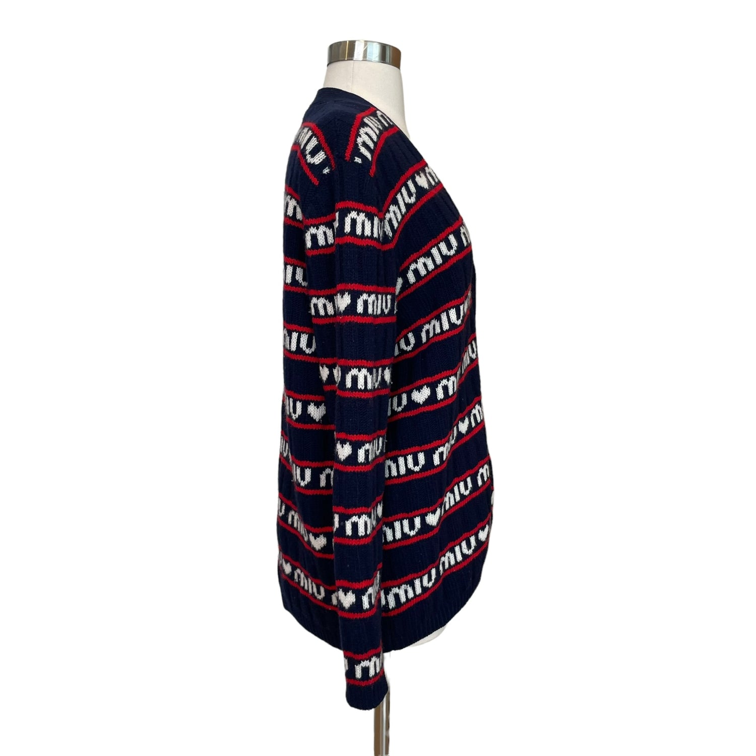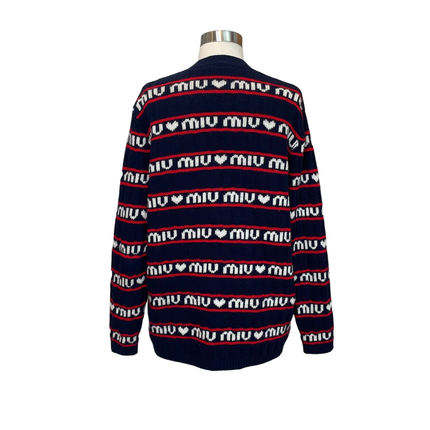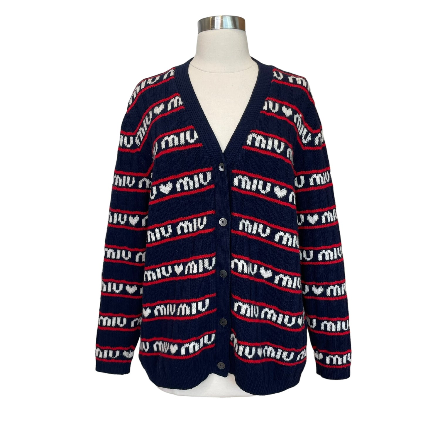 Miu Miu logo & hearts cardigan. Navy, red and white. Buttons at front. Designer size 38.