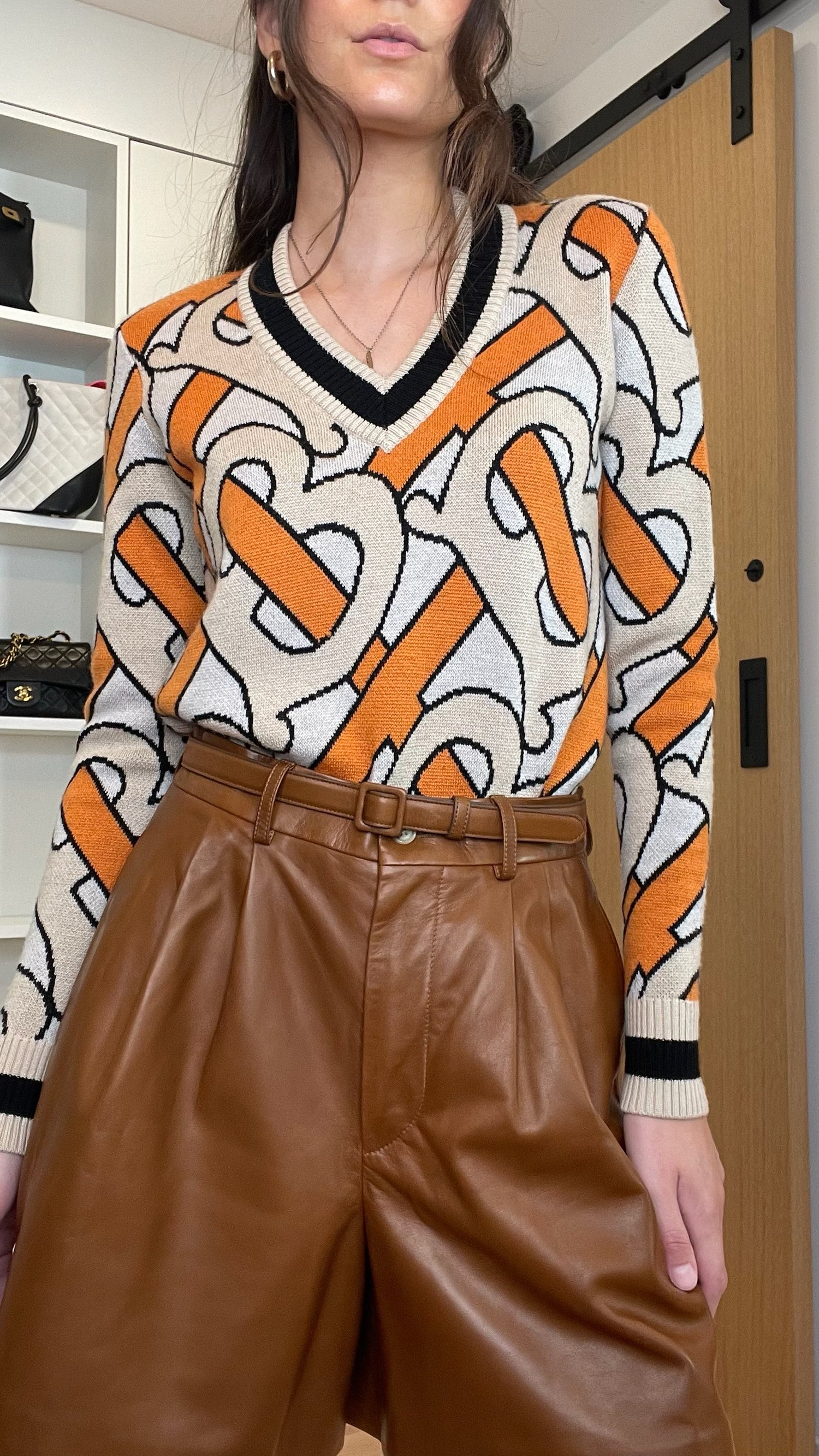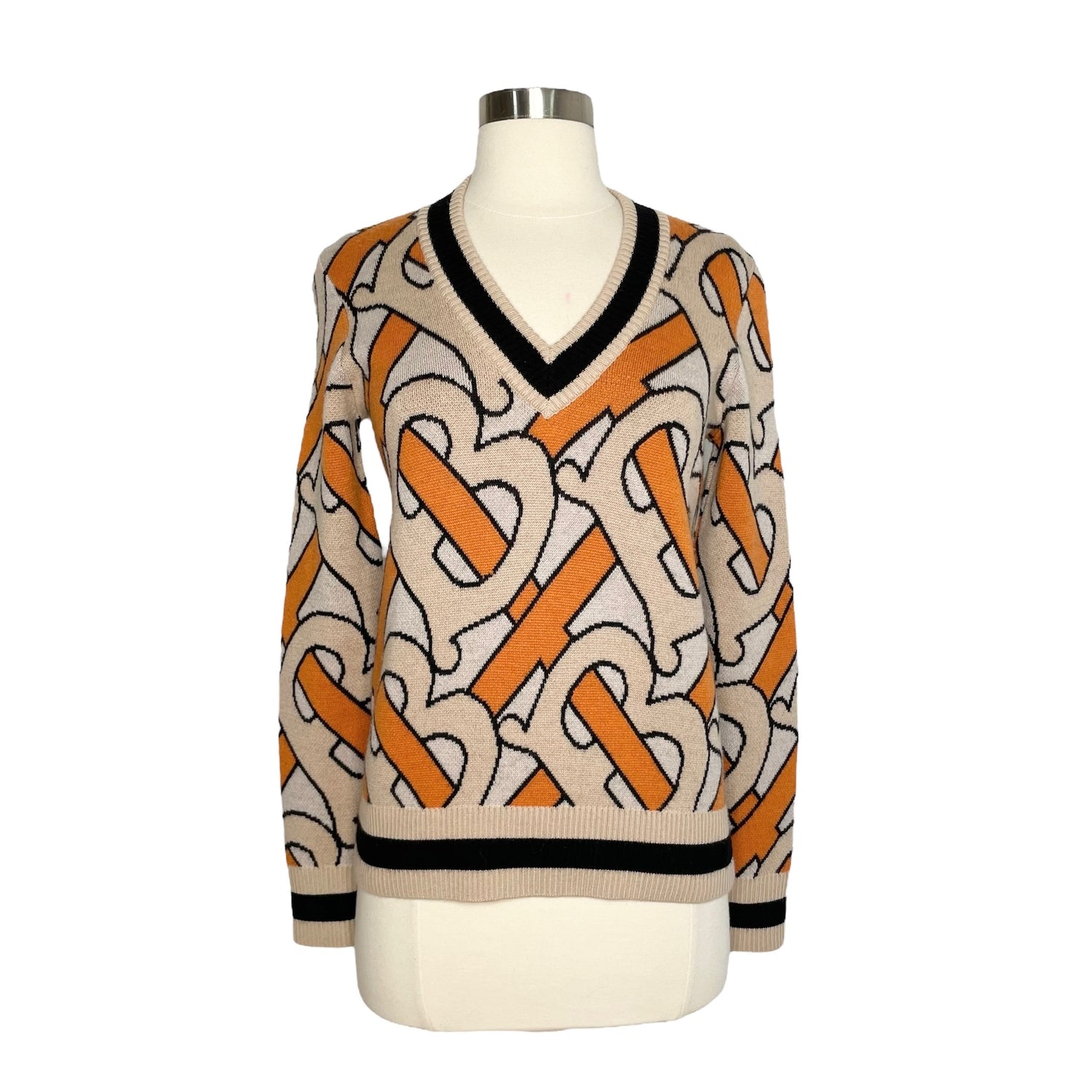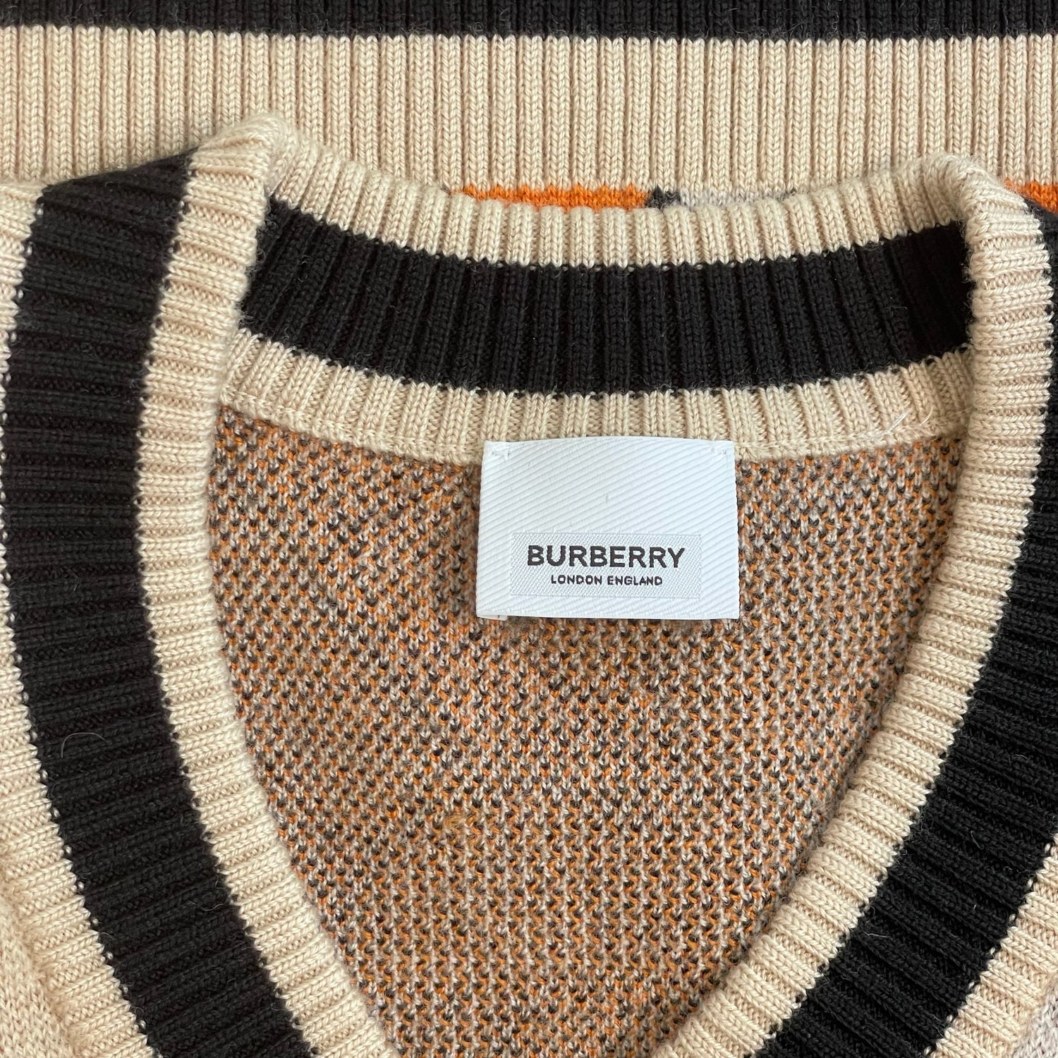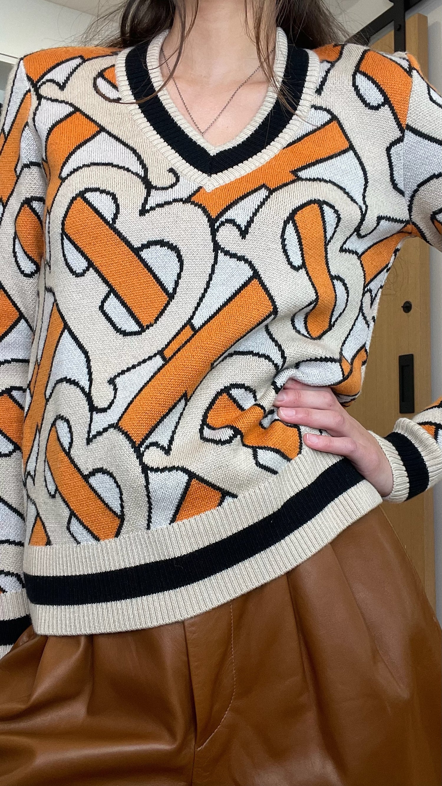 Burberry logo sweater. V-neck. Black, beige and orange knits.