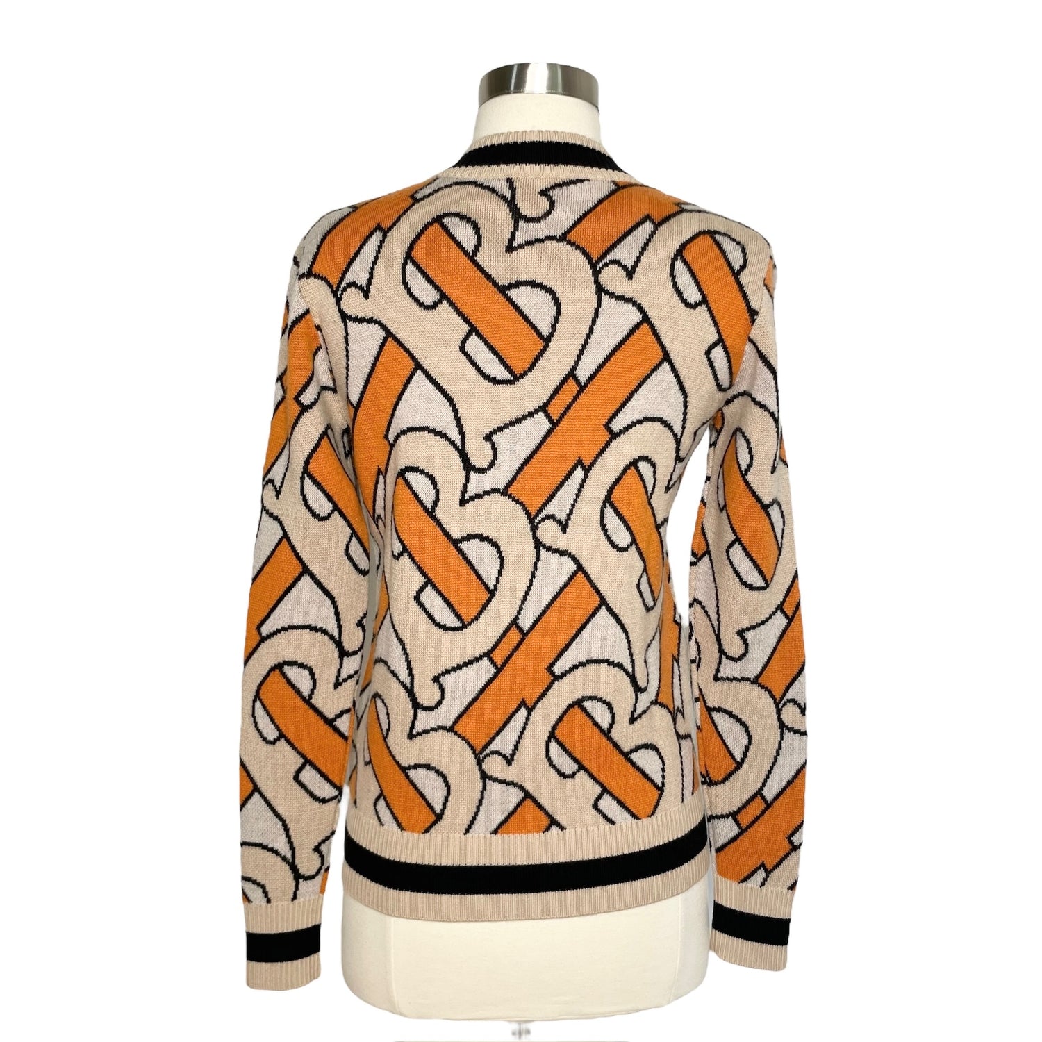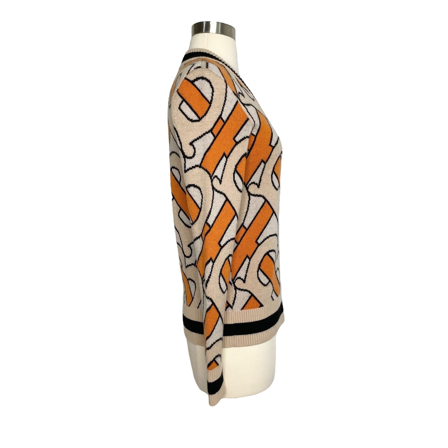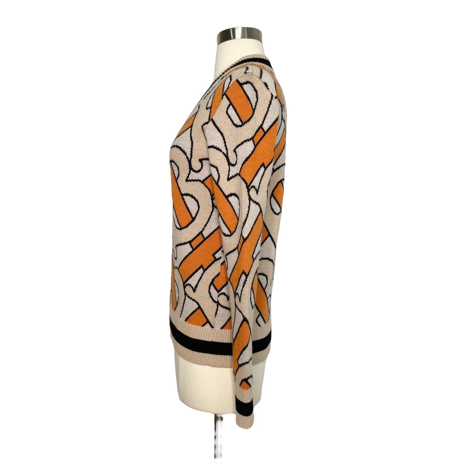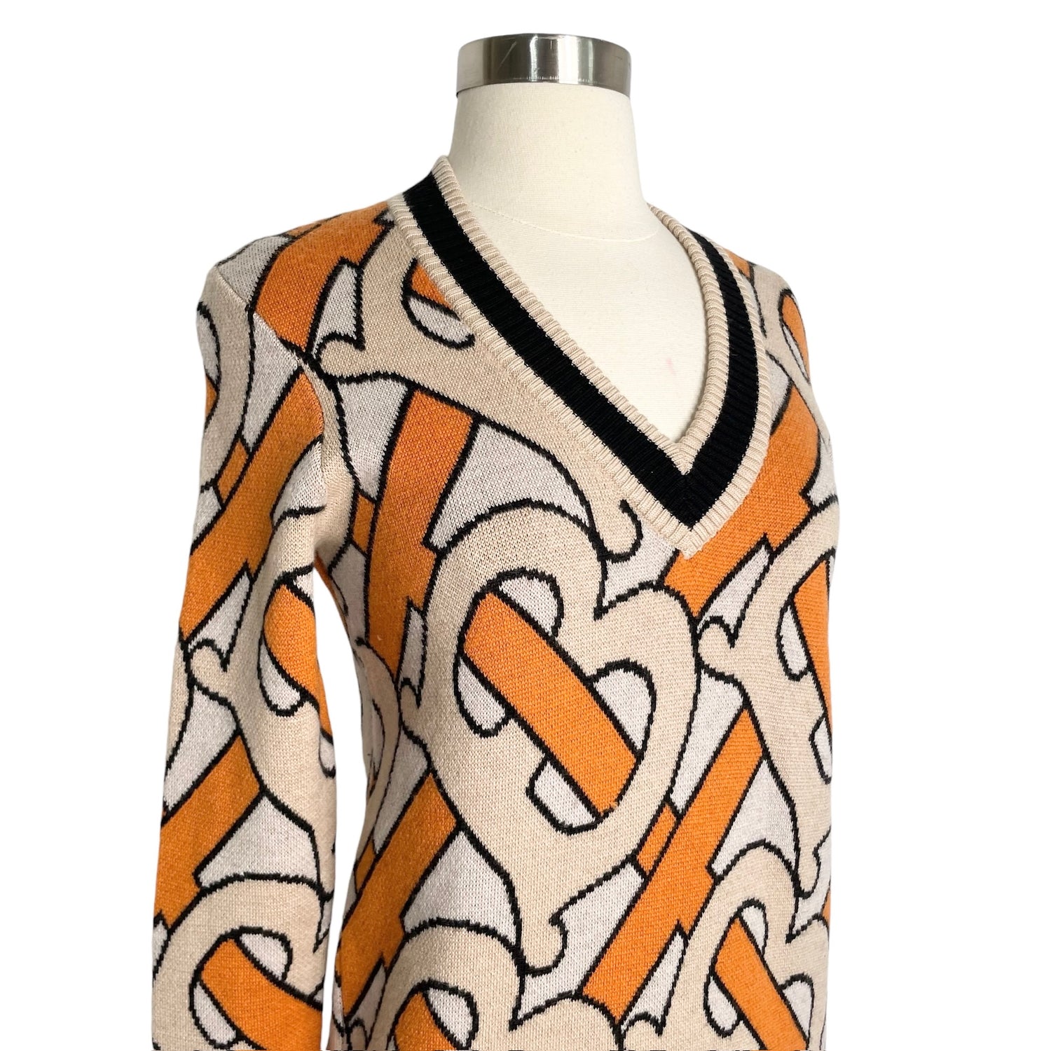Burberry logo sweater. V-neck. Black, beige and orange knits.
