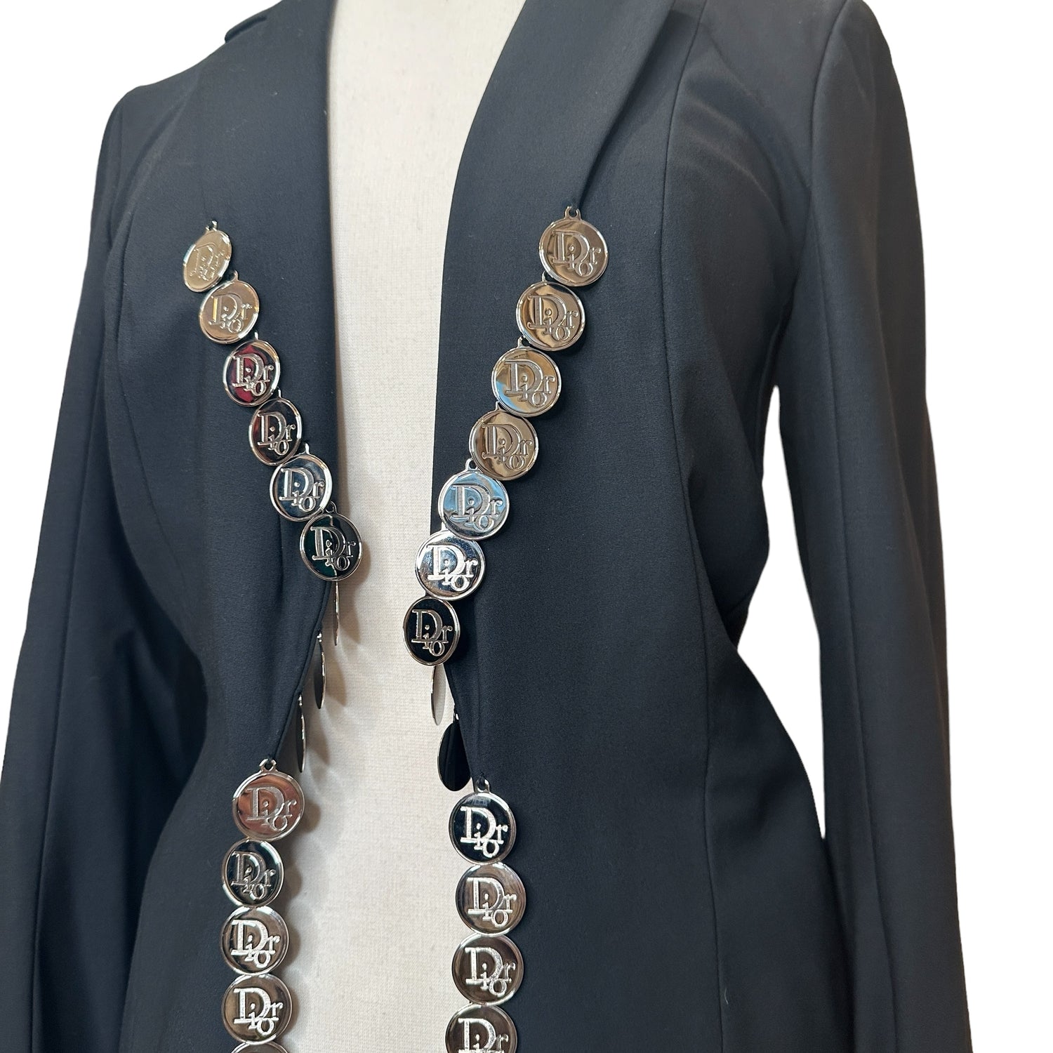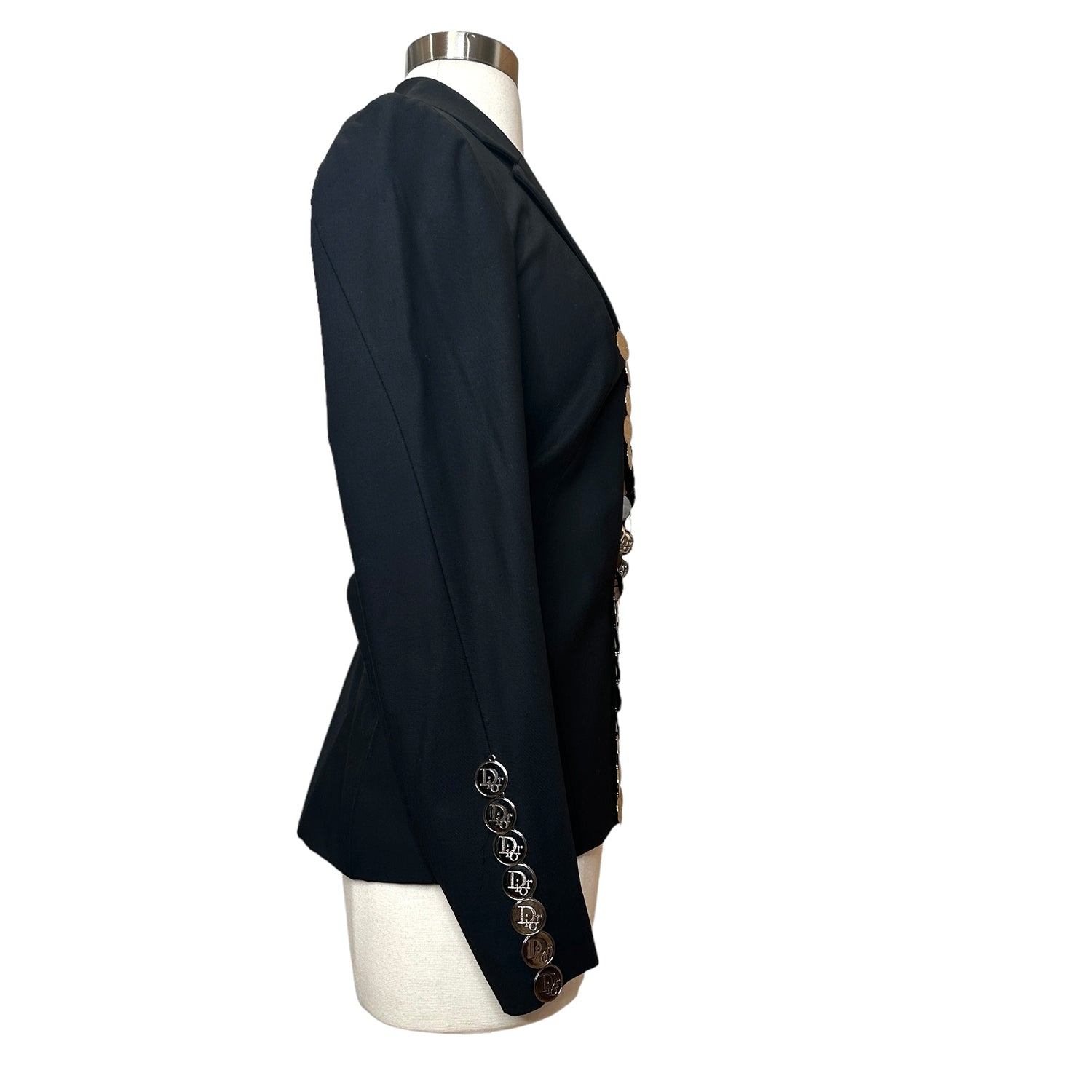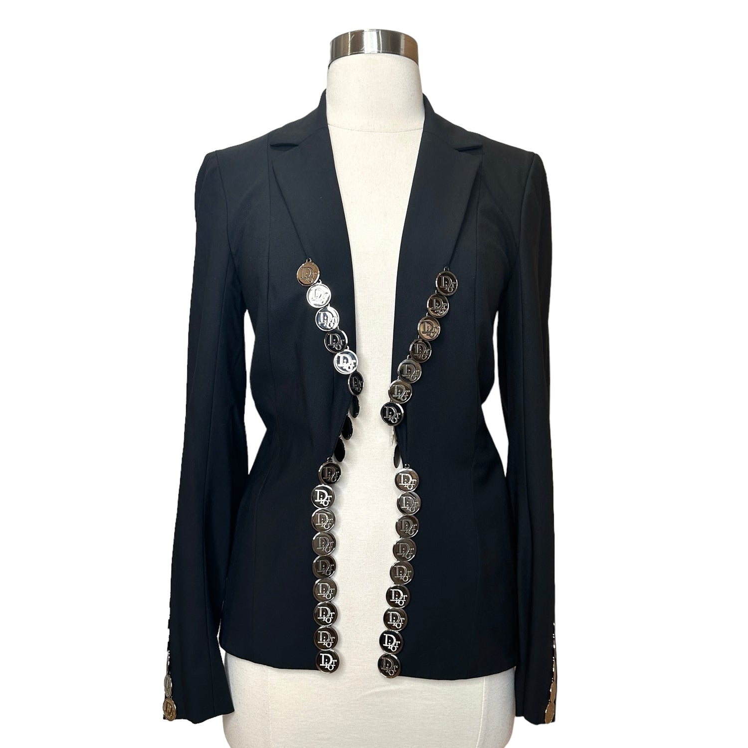 Christian Dior black blazer with Dior logo silver-tone medallions. Open front. Designer size 36.