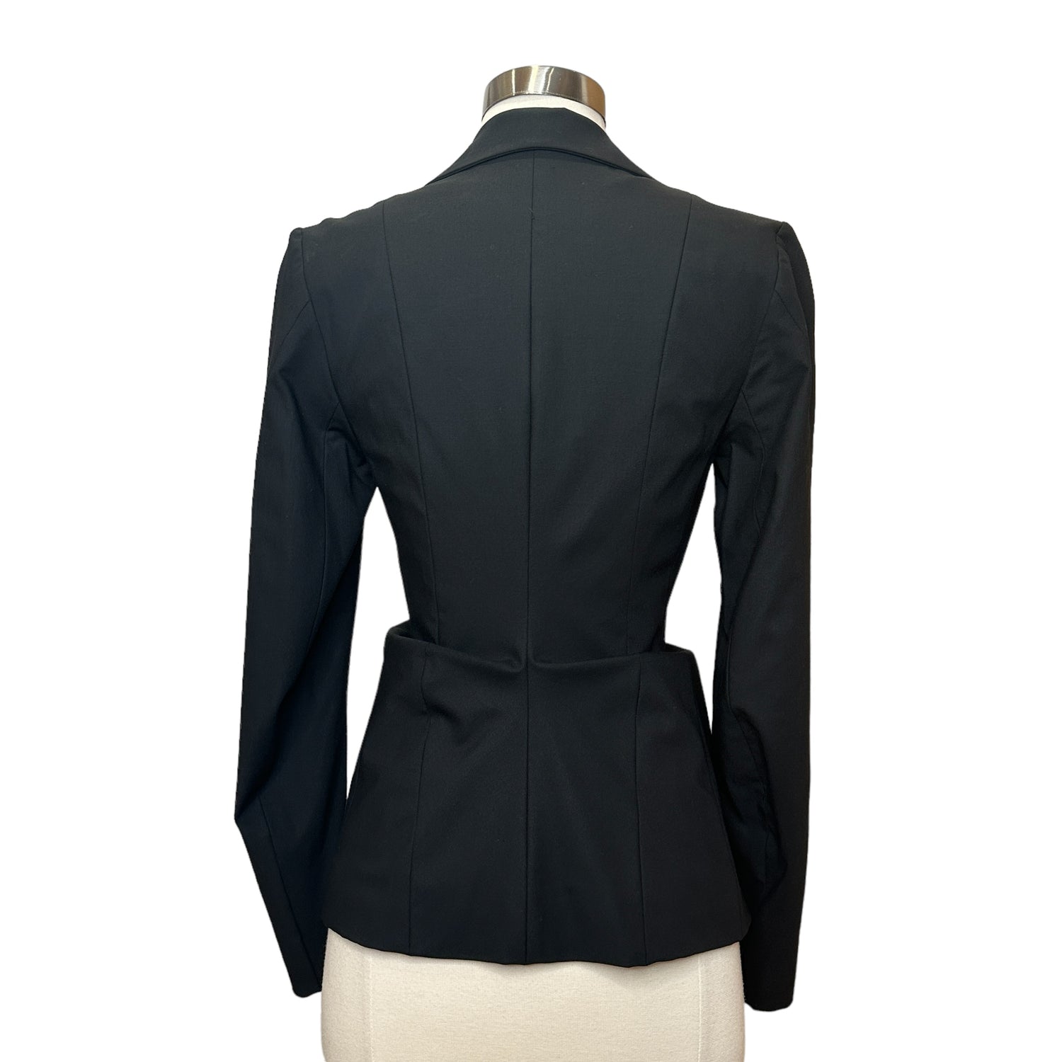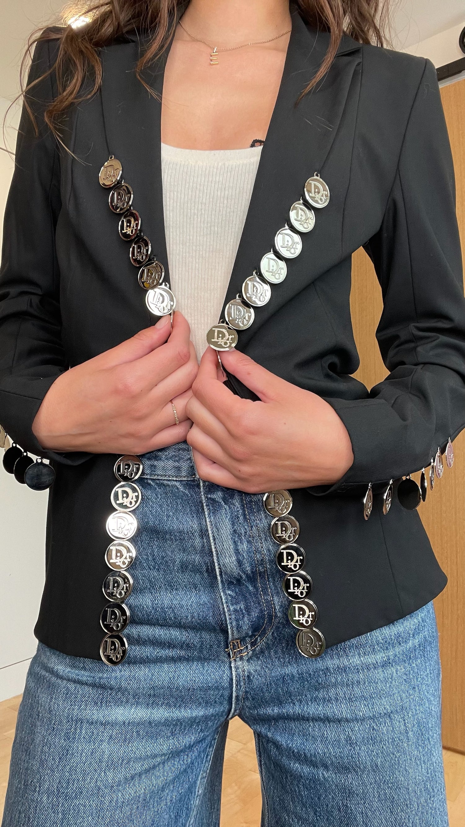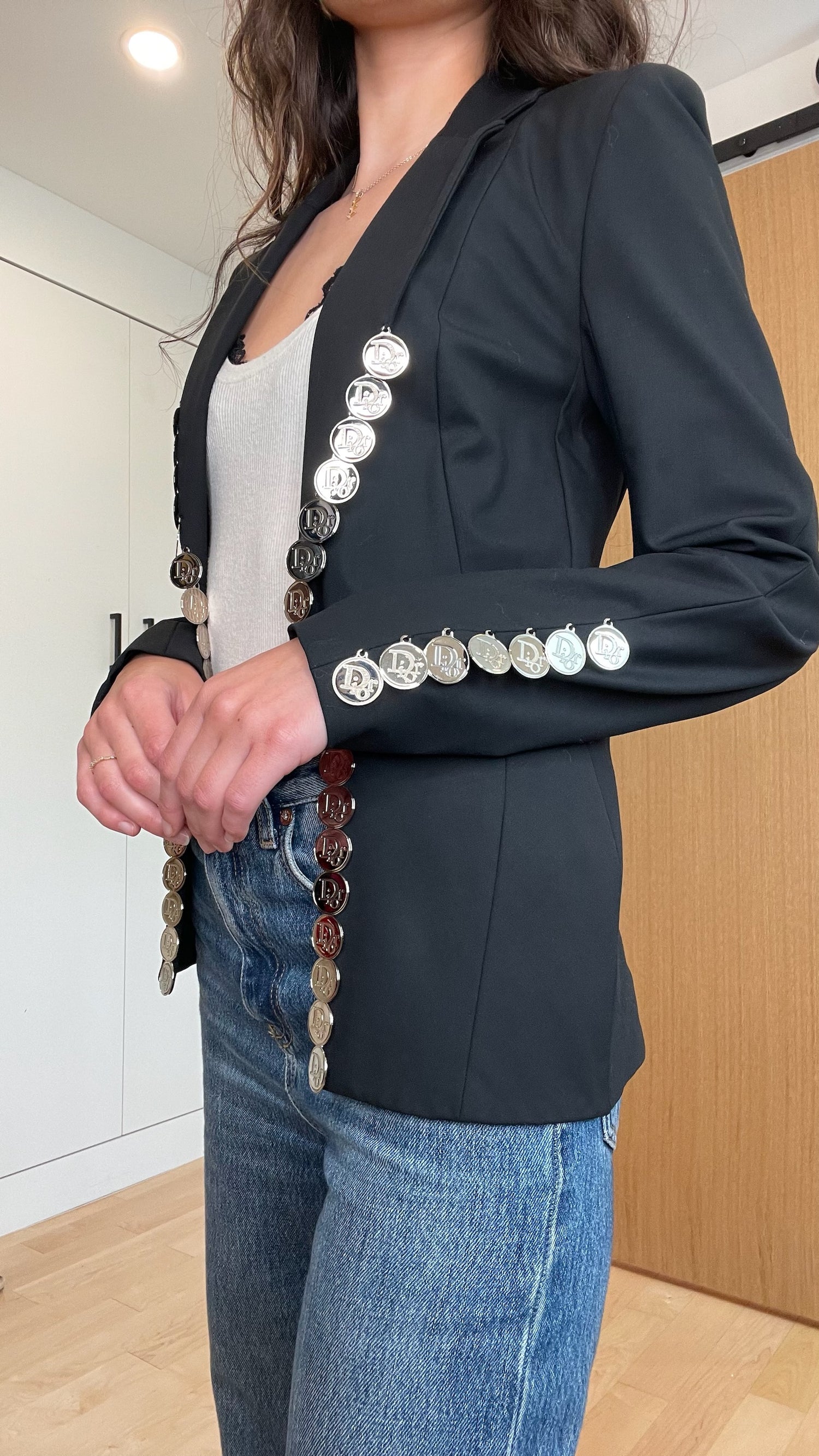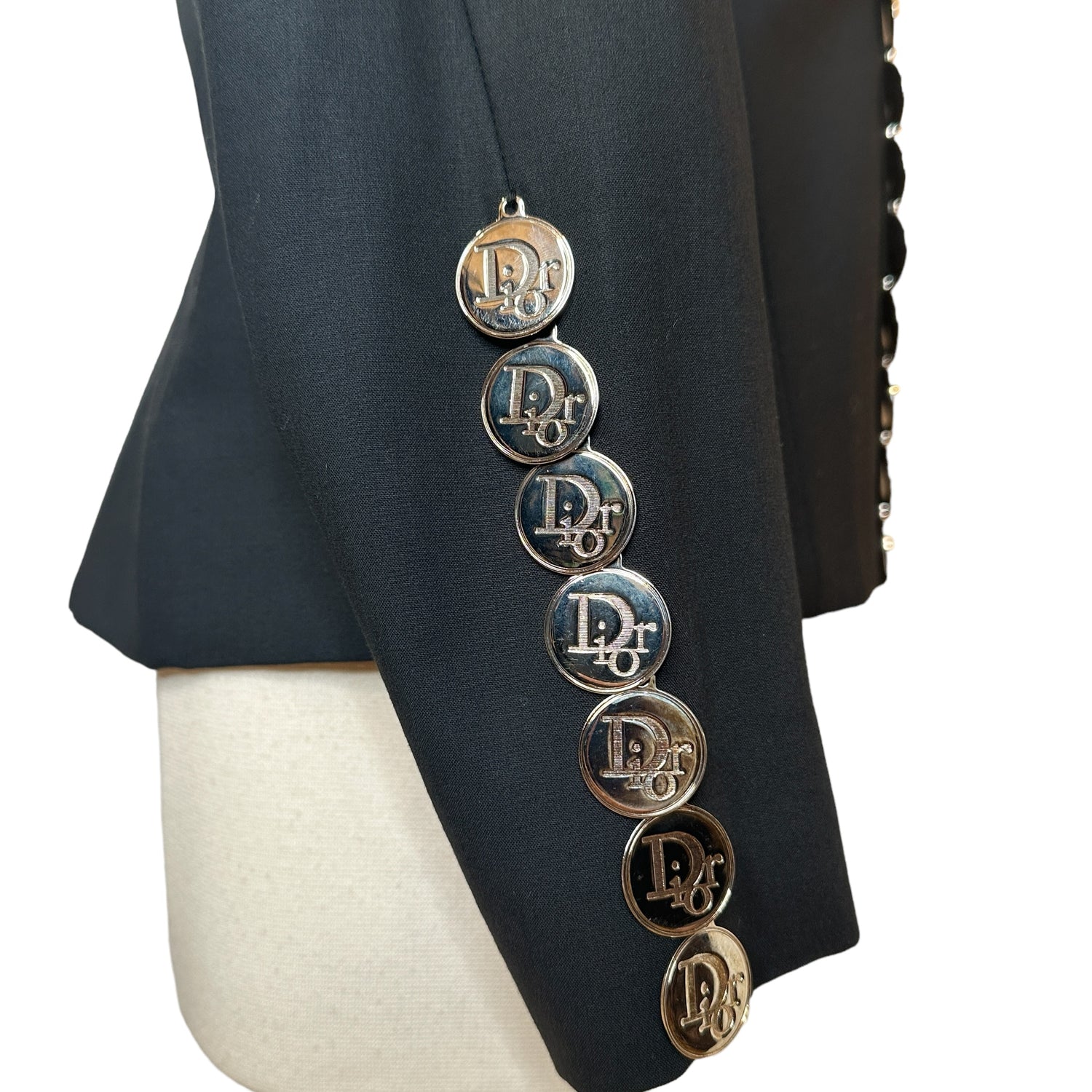 Christian Dior black blazer with Dior logo silver-tone medallions. Open front. Designer size 36.