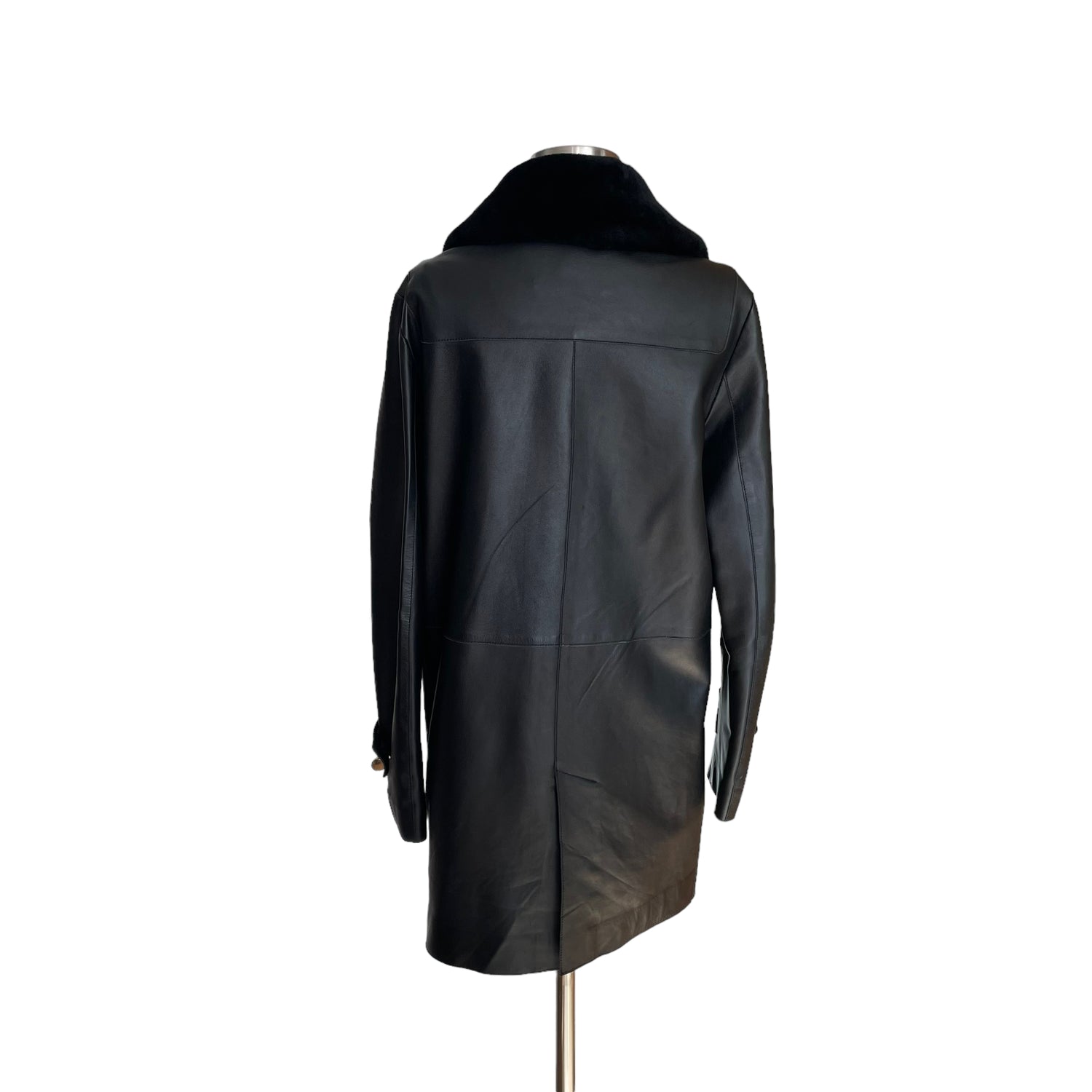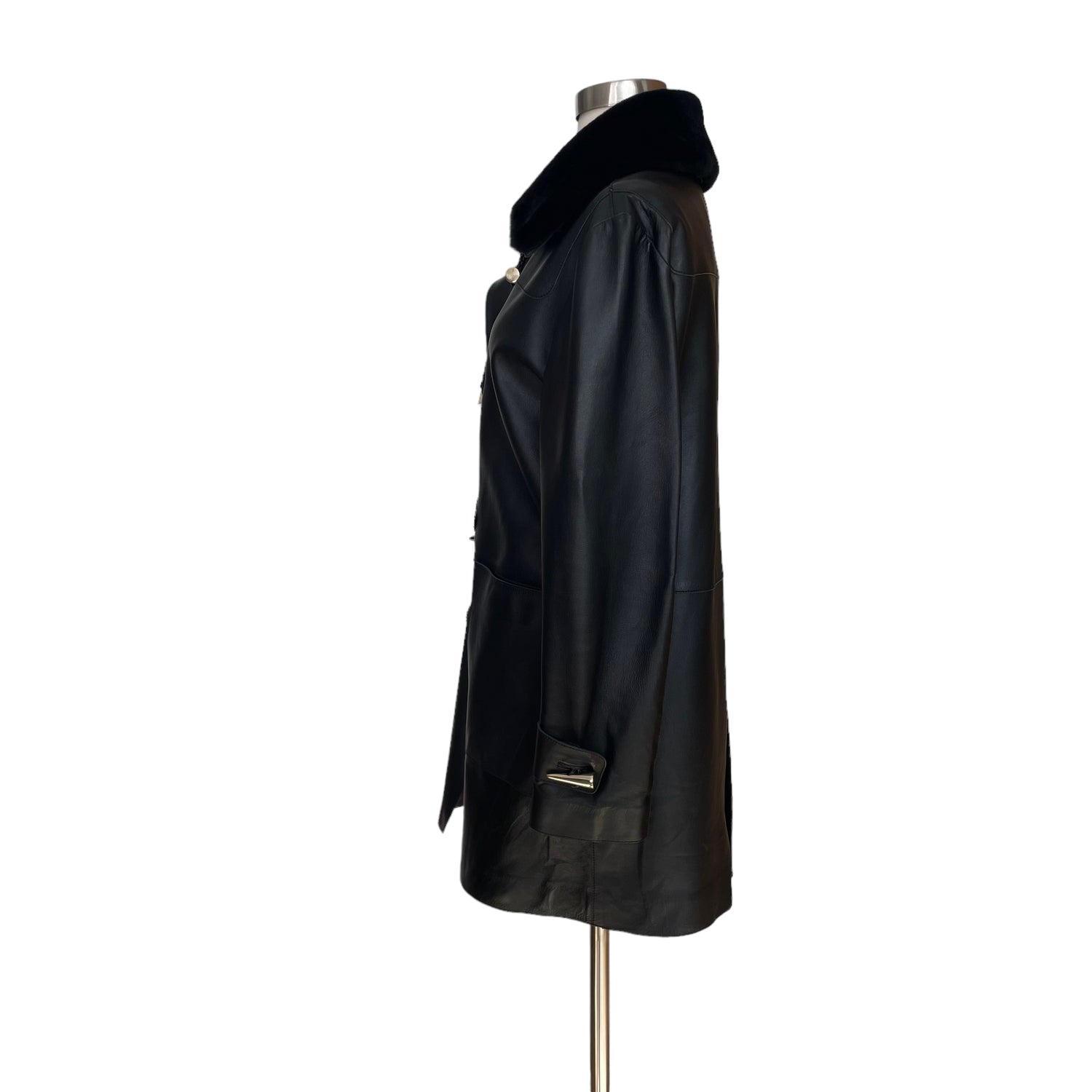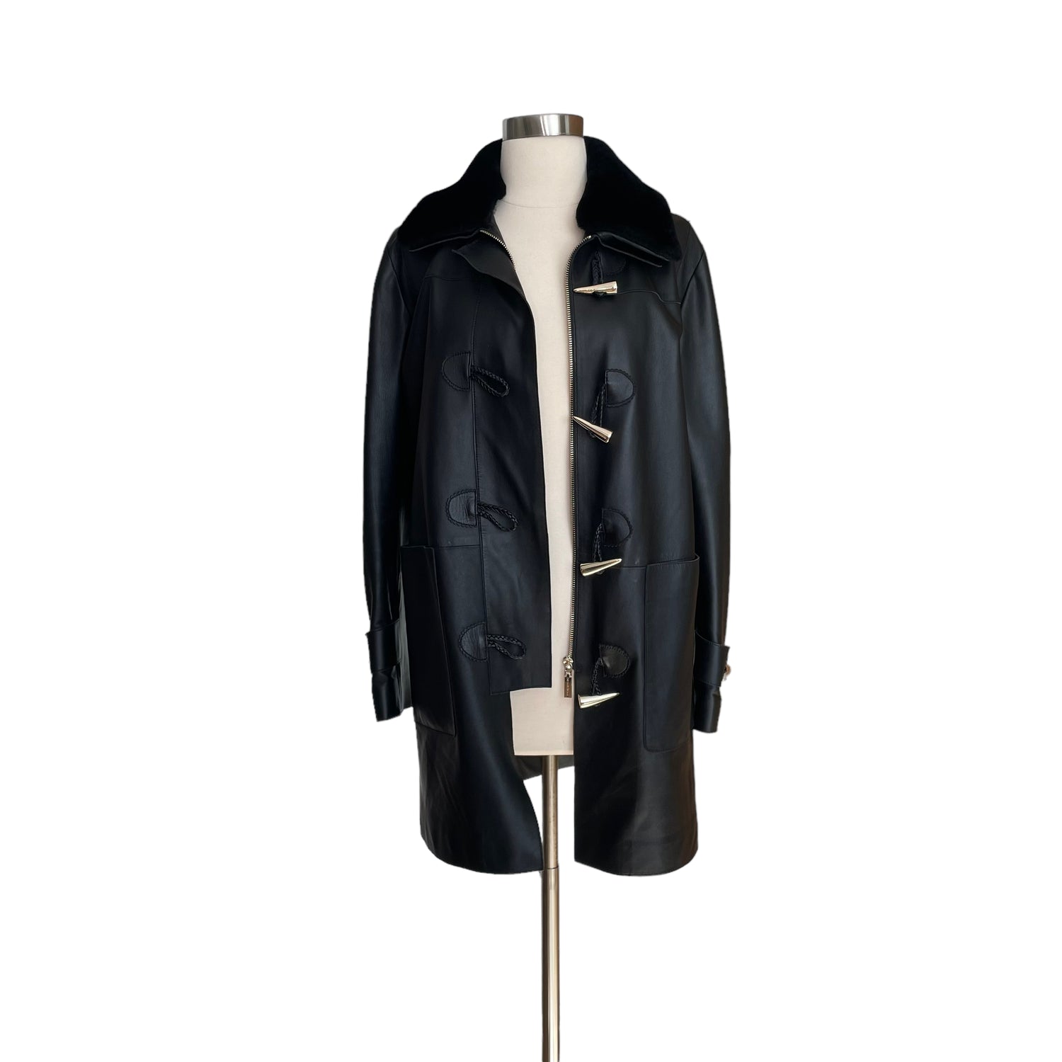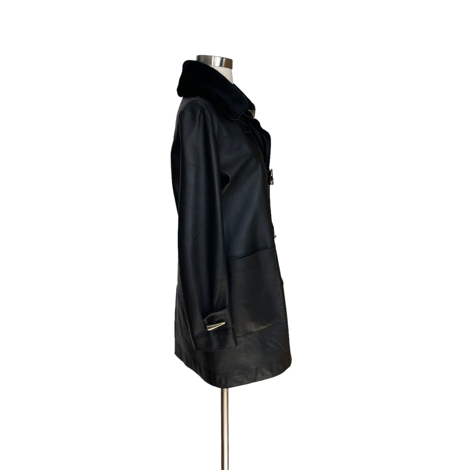 Uterque leather coat with black fur collar. Concealed zipper with large silver hook closures at front. Big slit pockets at side. Flap and hook cuff on both sleeves. Designer size S.