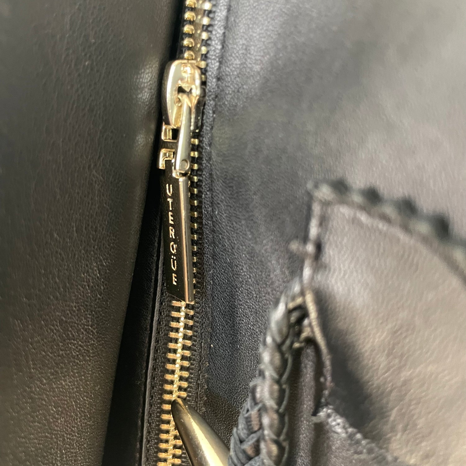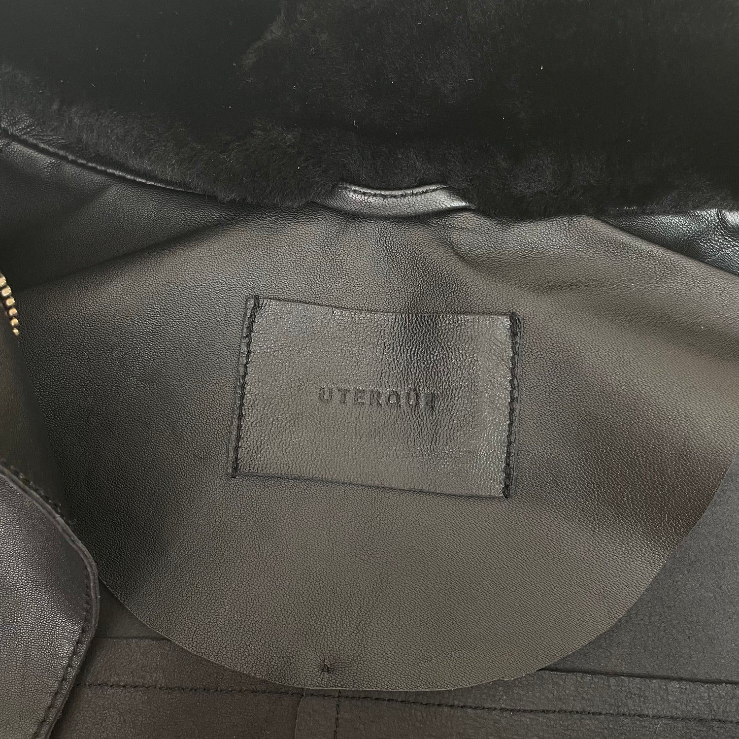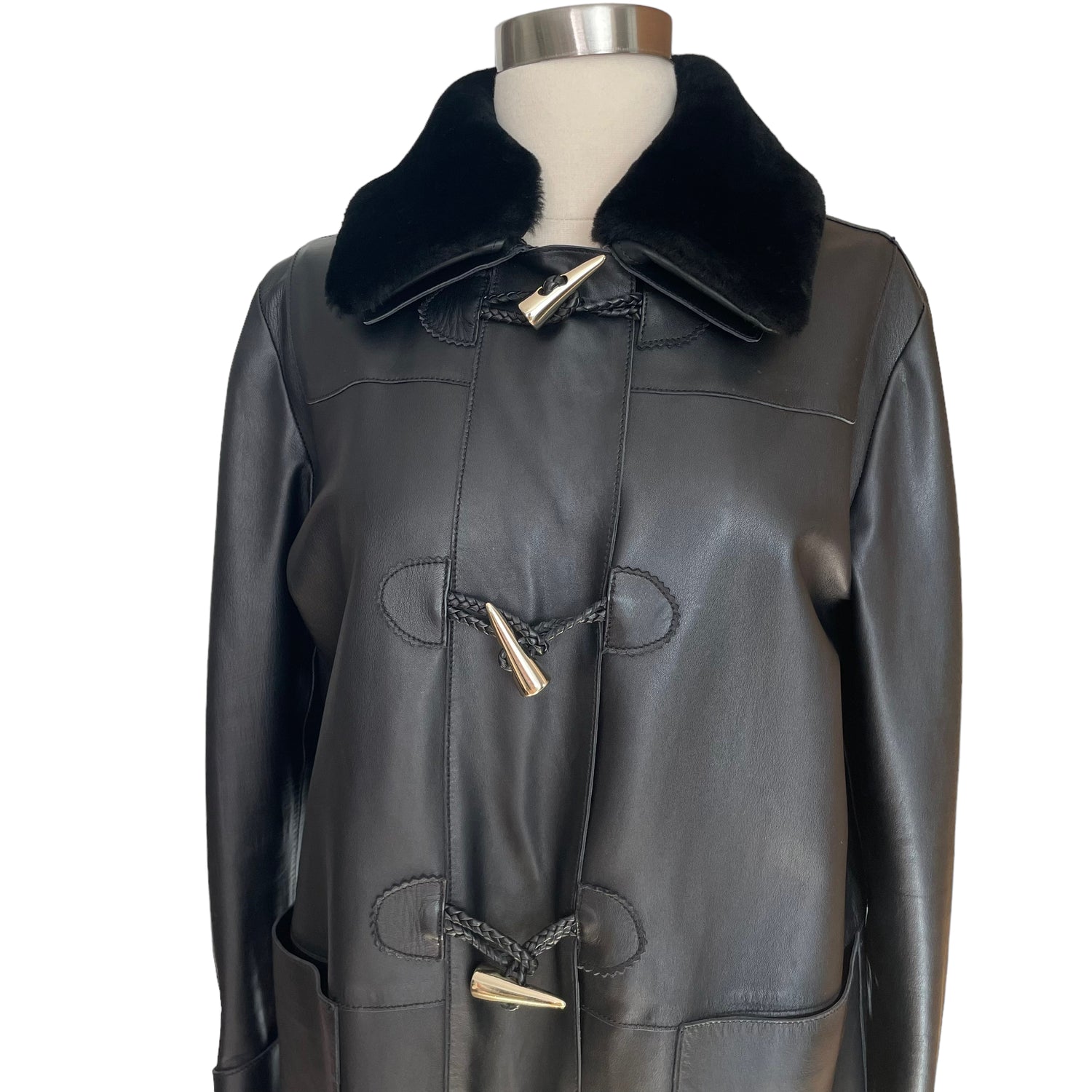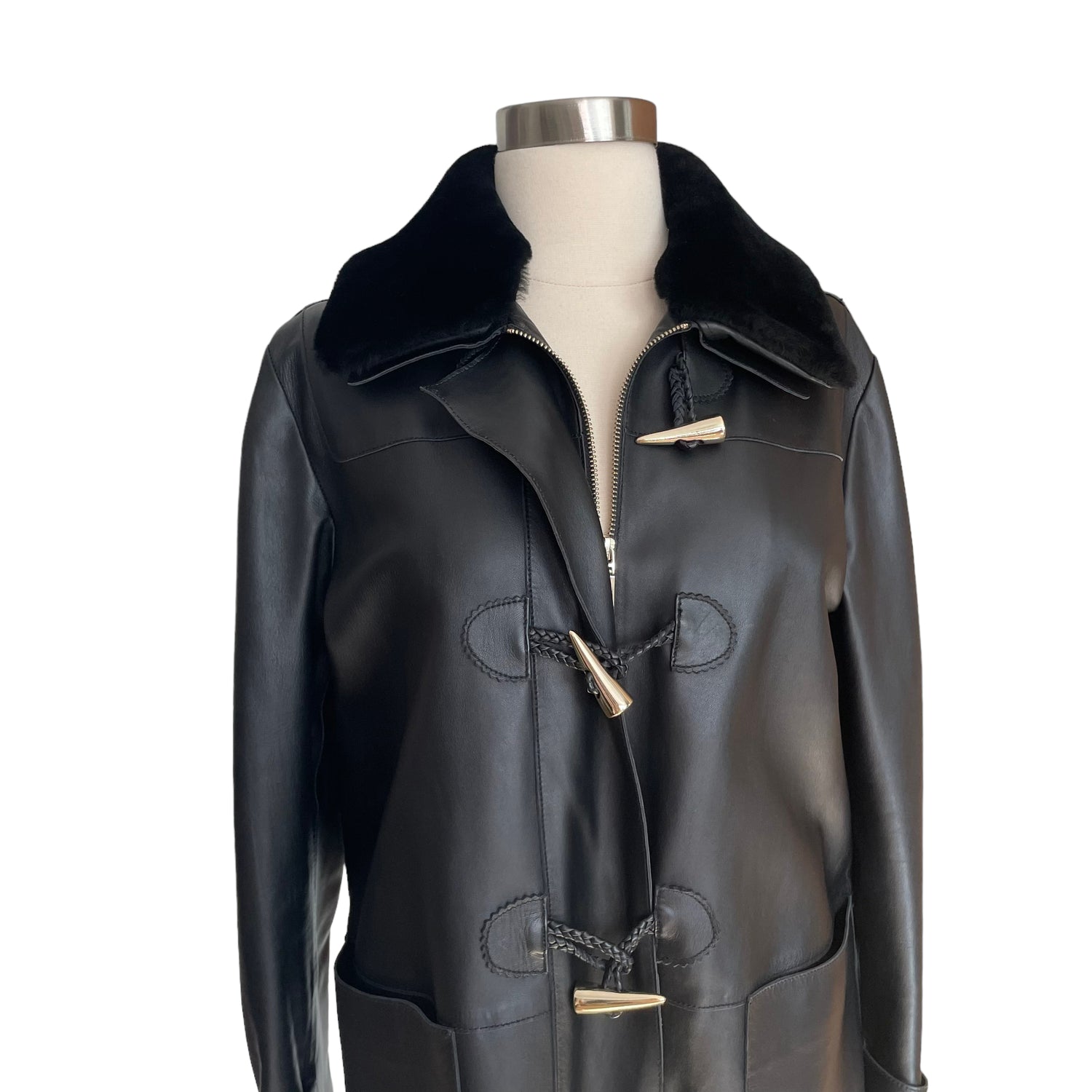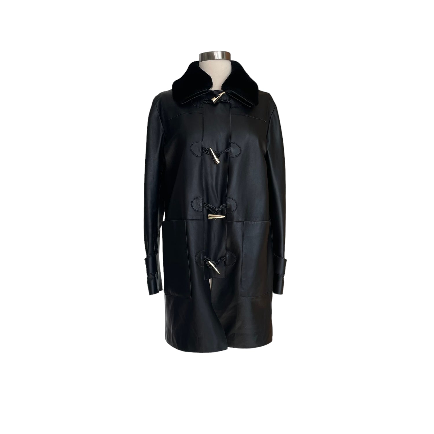 Uterque leather coat with black fur collar. Concealed zipper with large silver hook closures at front. Big slit pockets at side. Flap and hook cuff on both sleeves. Designer size S.