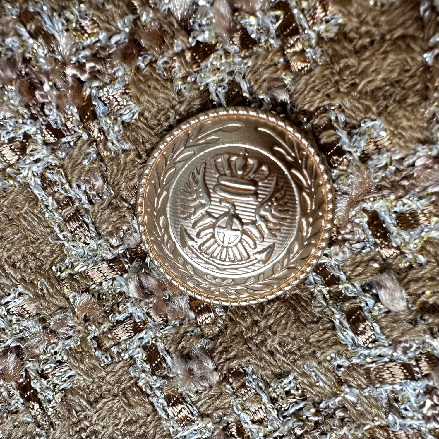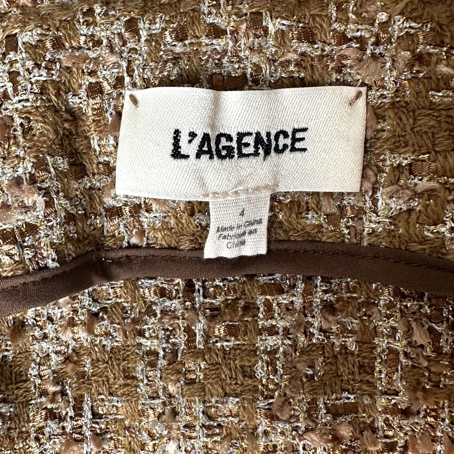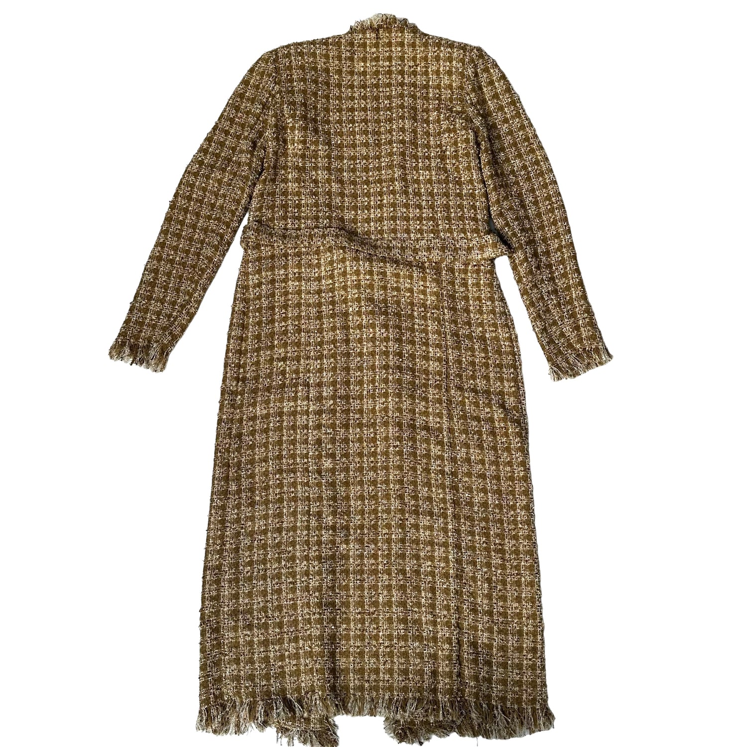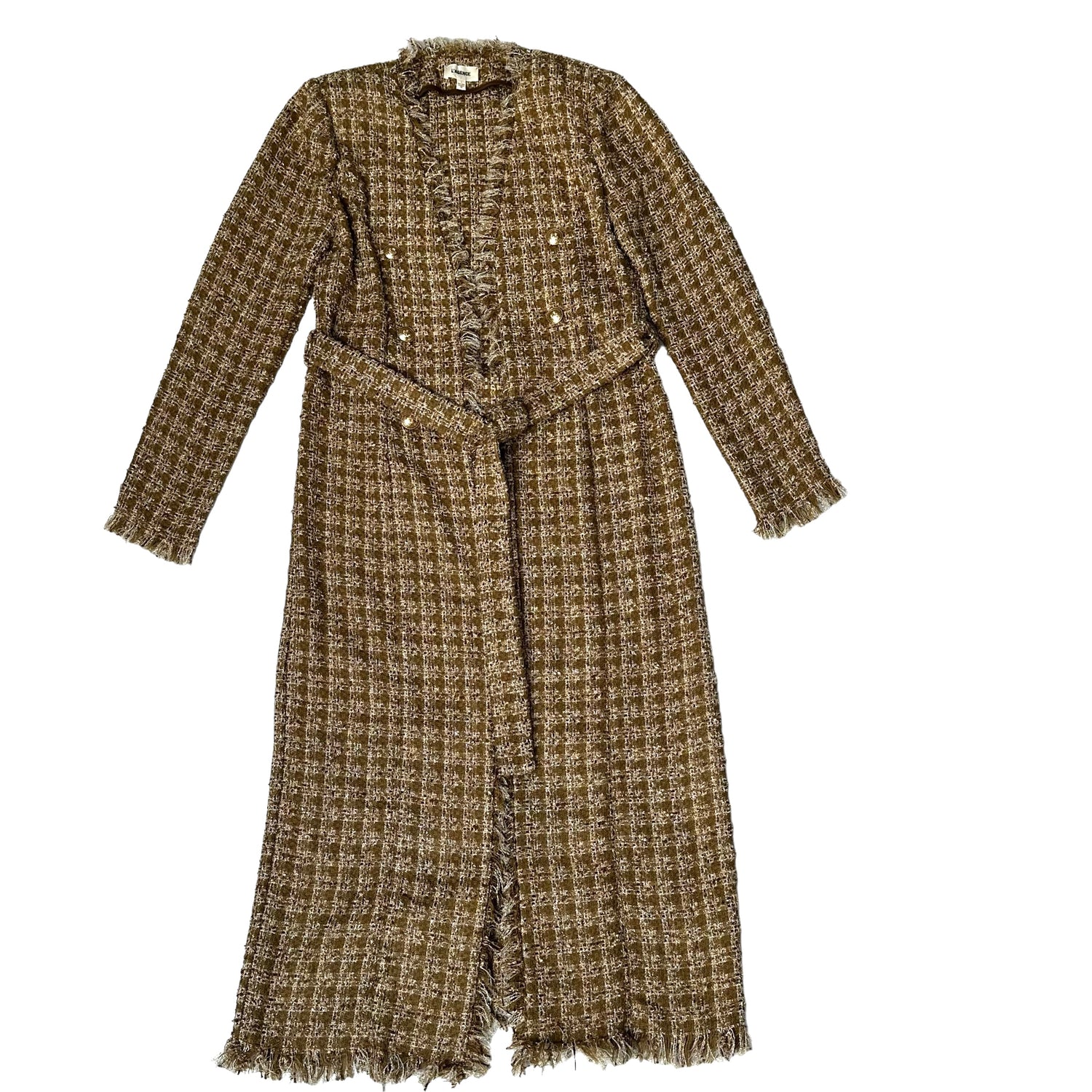 L'agence gold tweed coat. Long lightweight coat. Round neck. Removable belt. Raw fringe trims. Gold-tone buttons. So chic and stylish in beautiful ocre, gold and metallic fabric. Designer size 4.