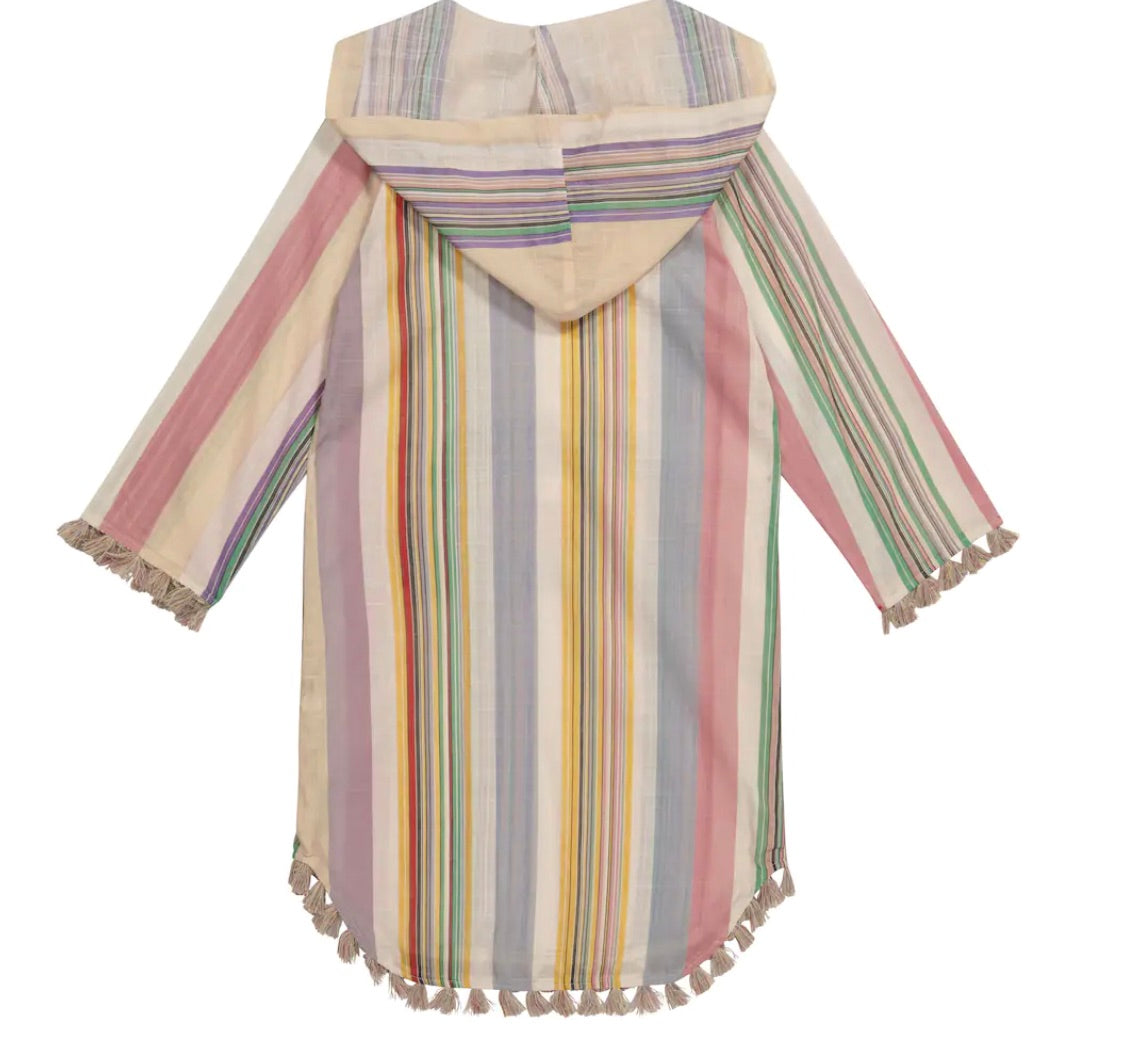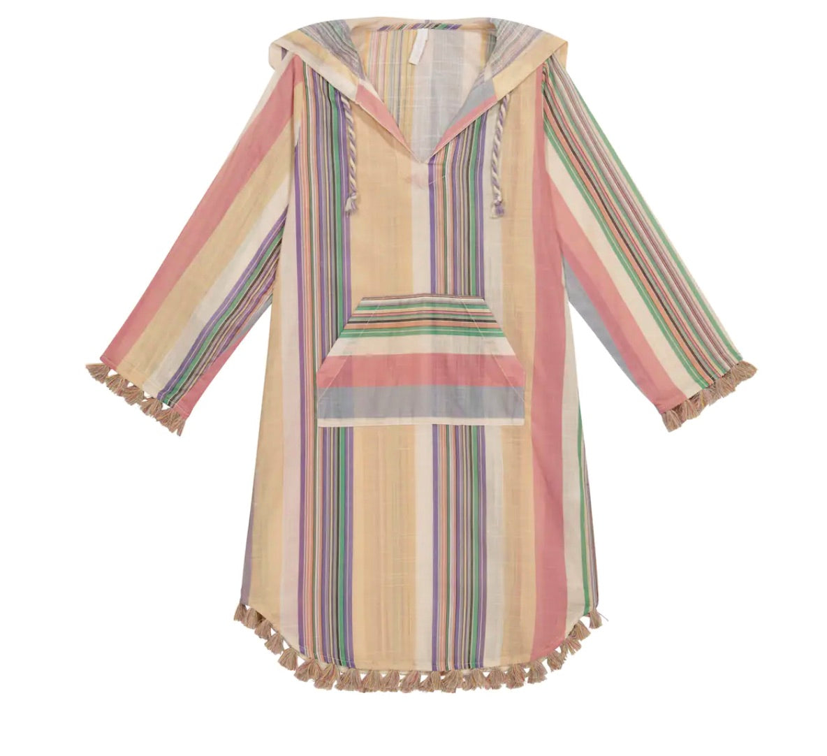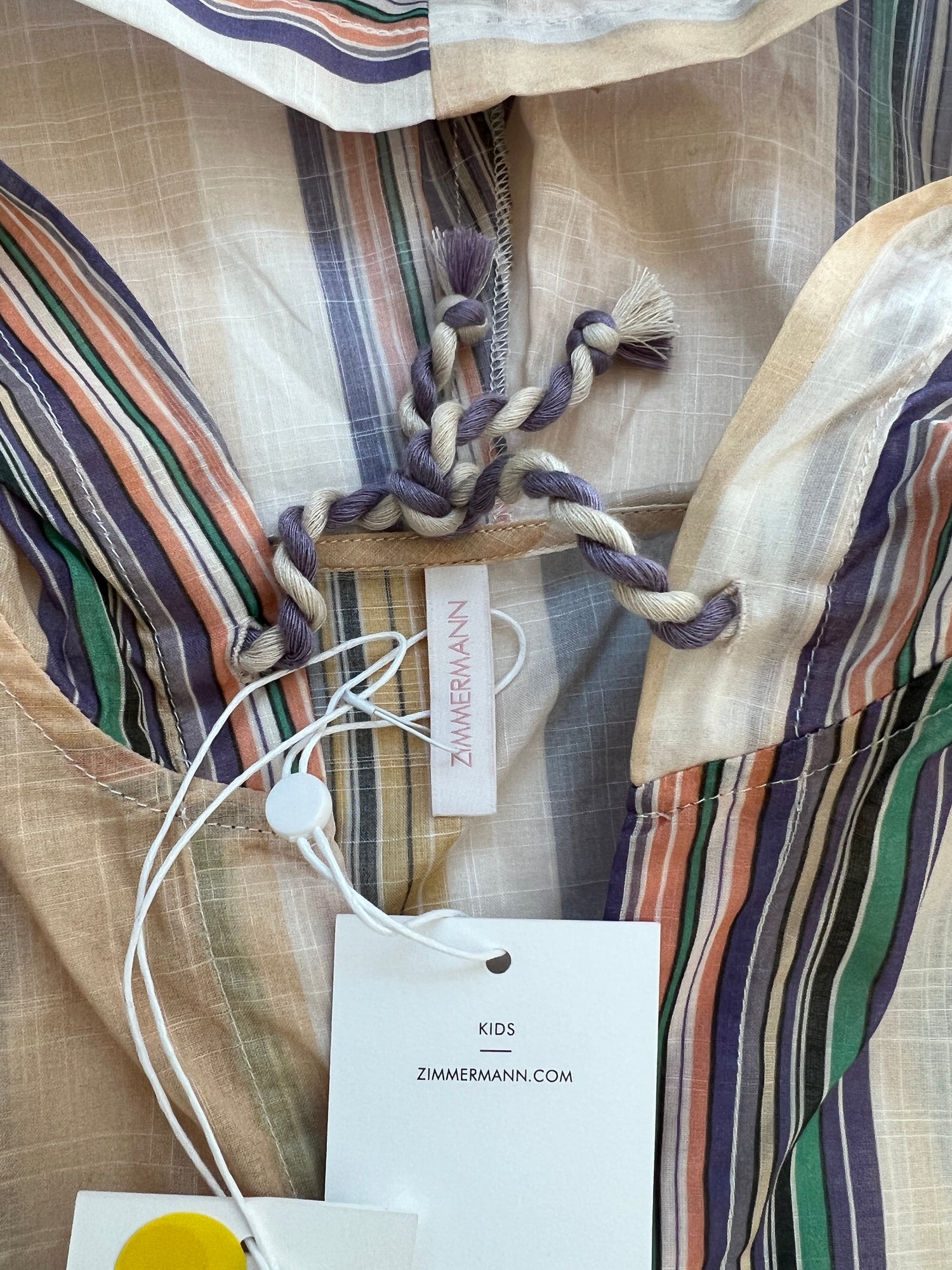Zimmermann cotton poncho for kids. Lightweight. Drawstrings at neck. Hoodie. Pom Pom details at wrists and bottom. One front pocket.