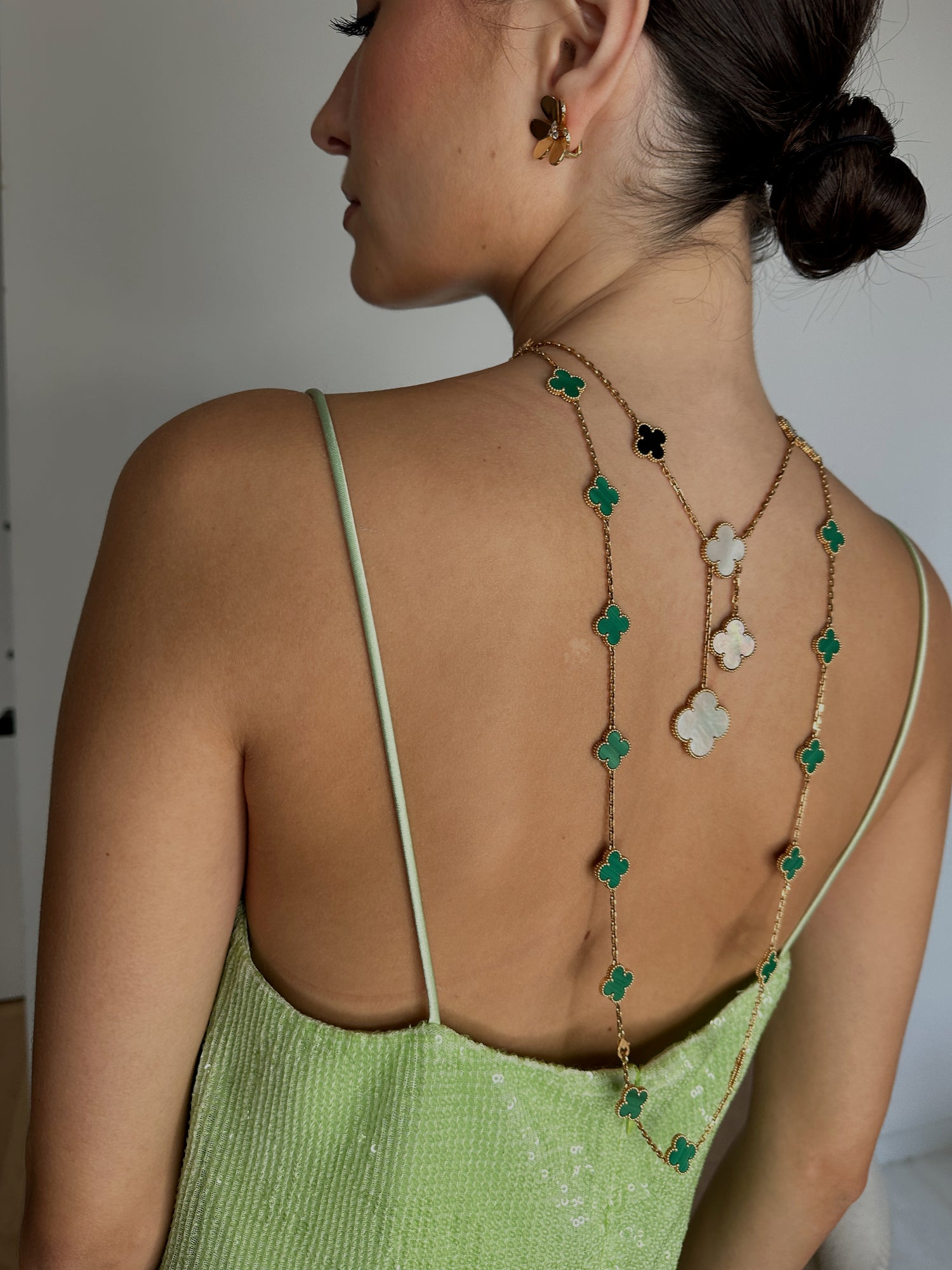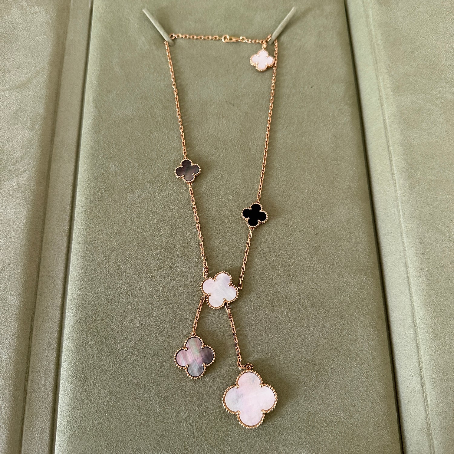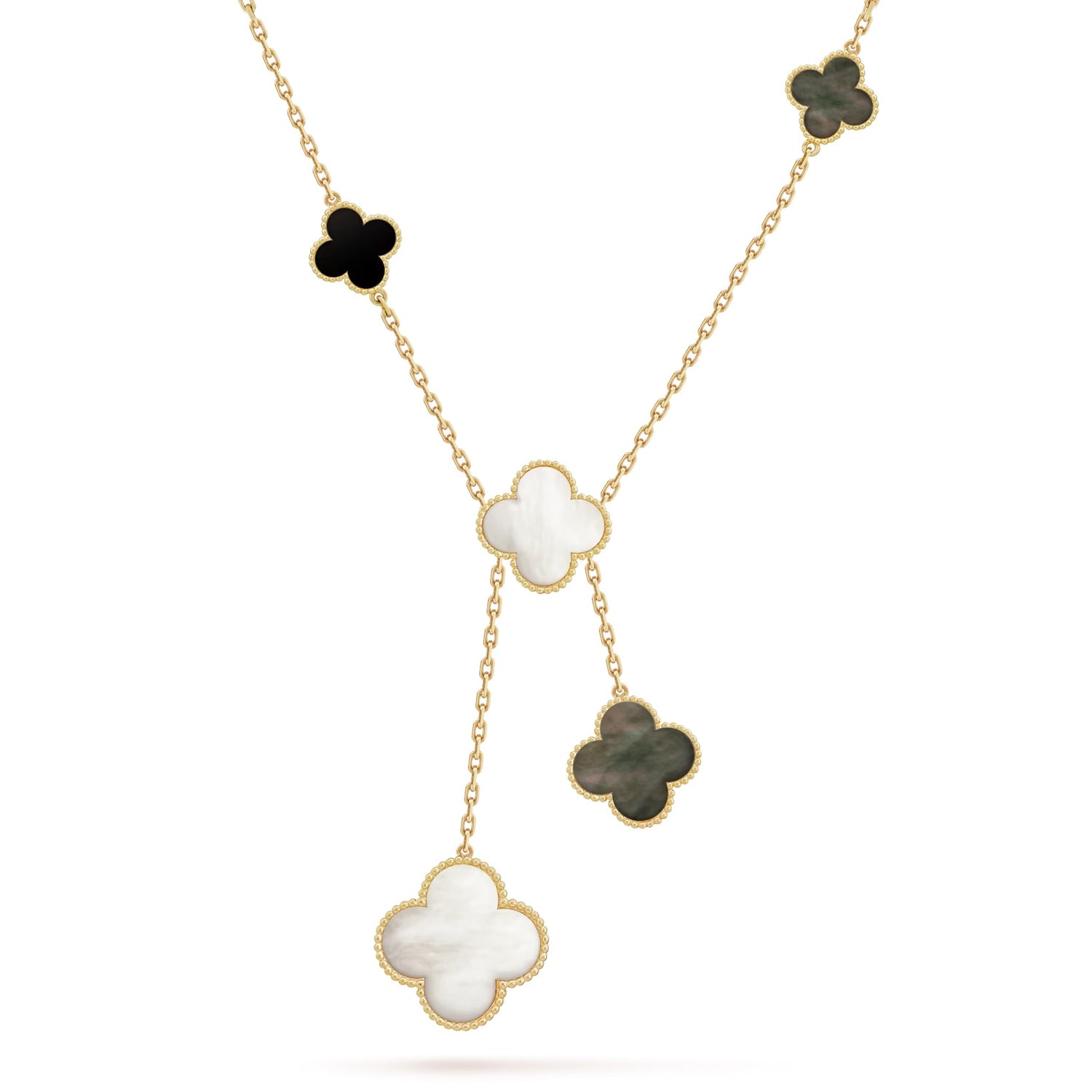 Van Cleef & Arpels Magic Alhambra necklace with 6 motifs in 18K yellow gold. White and gray mother-of-pearl and onyx. Mother-of-pearl: 5 stones. Onyx: 1 stone. Hallmark clasp, small model in 18K yellow gold. Chain length: 16.54 inches.