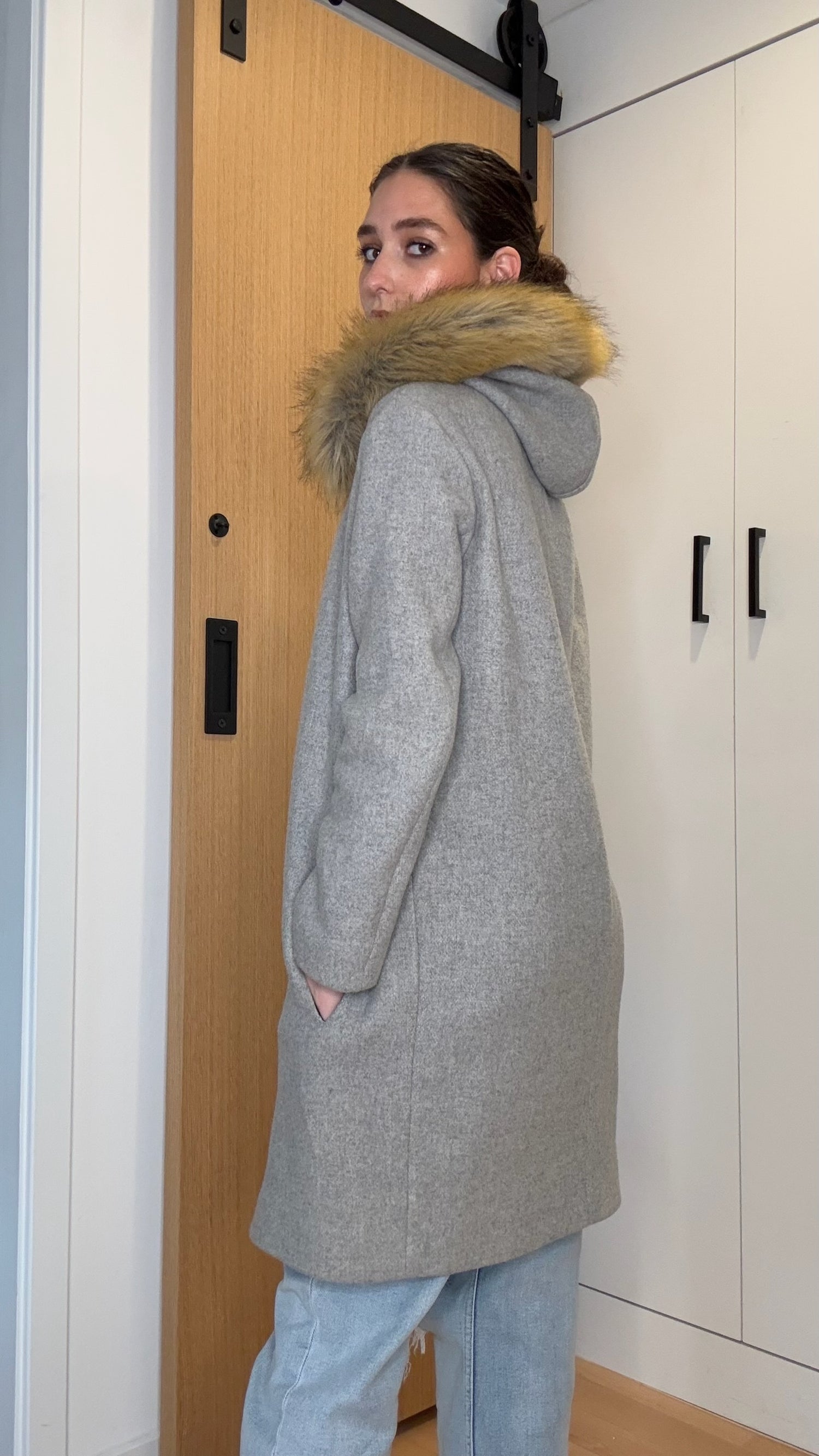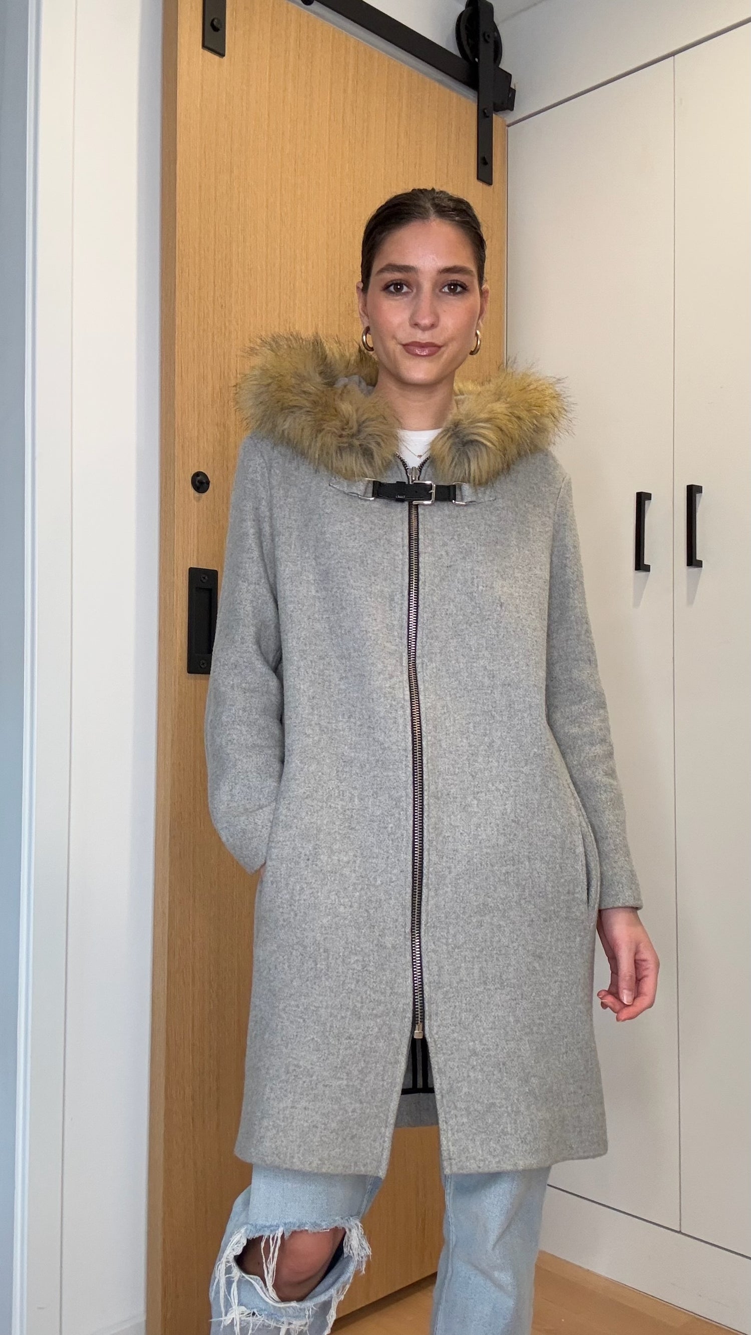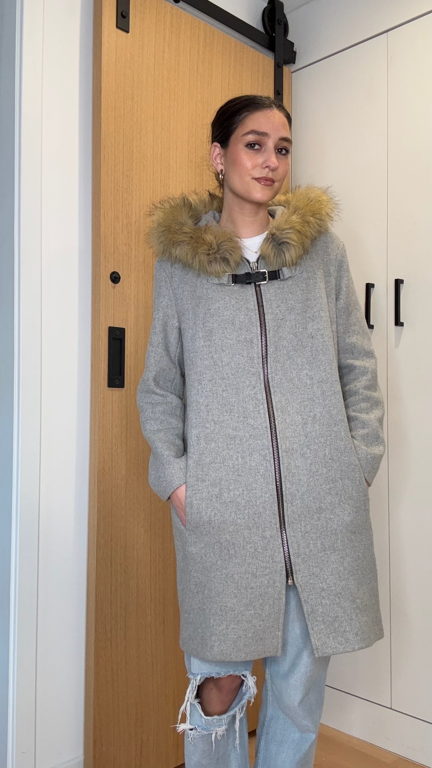 Maje grey coat with faux-fur trim at hood. Zipper closure at front. Pockets. Designer size 36.