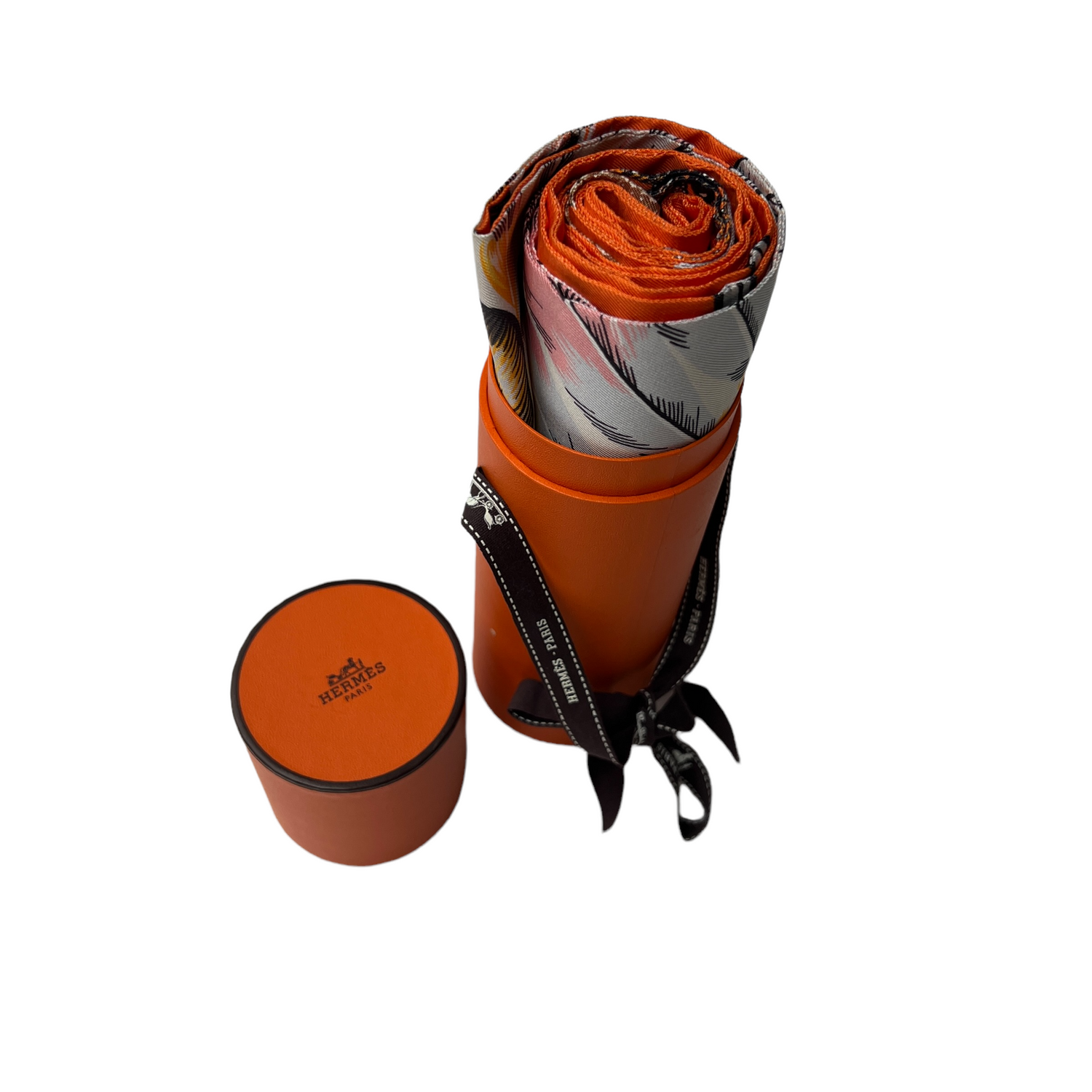 This Hermes scarf can be worn in a multitude of ways. The print features feathers in orange, black and pink colors.