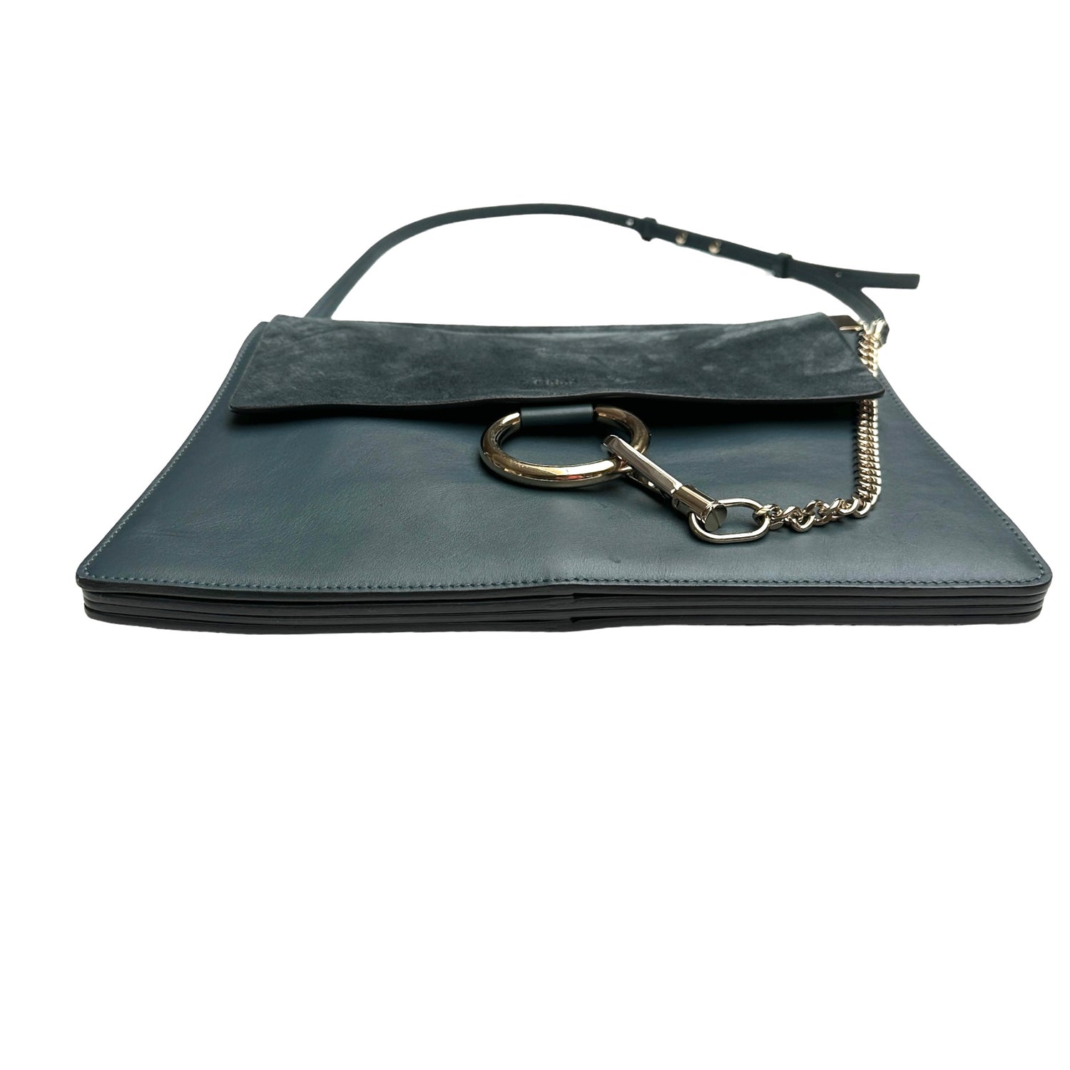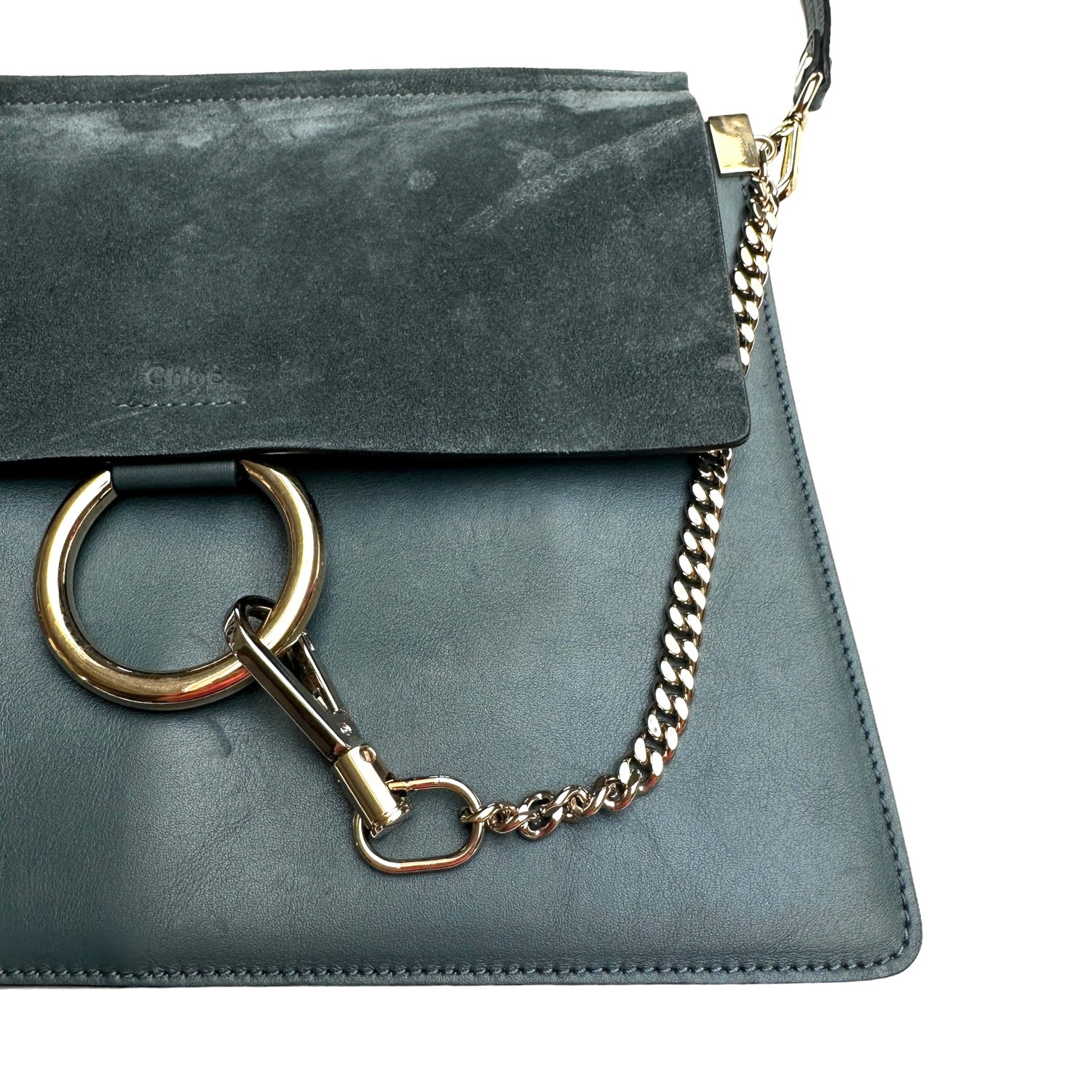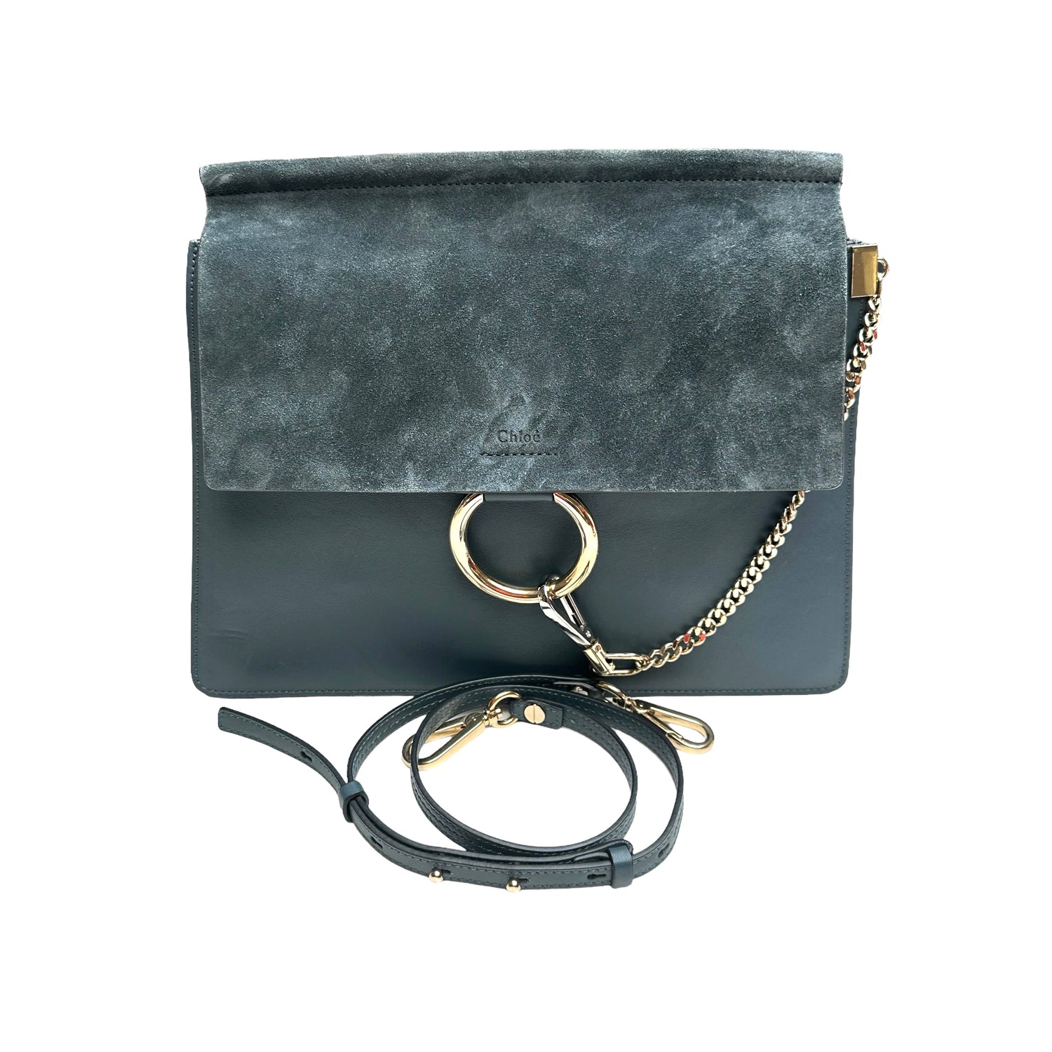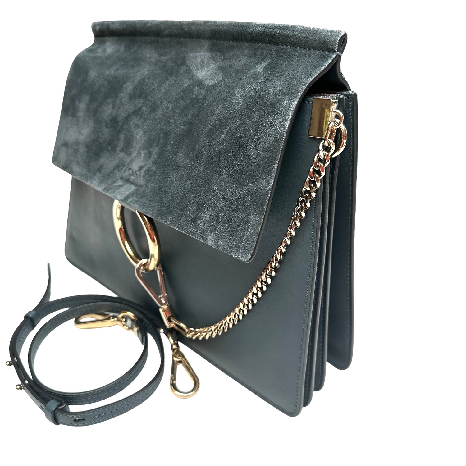 Chloe medium Faye bag with gold-tone hardware. Dark blue grey leather and suede. Magnetic flap closure at top. Beige suede lining with three practical compartments at interior and one zipper pocket. Folds flat for easy storing. Adjustable leather strap. The strap is removable for a large clutch look.