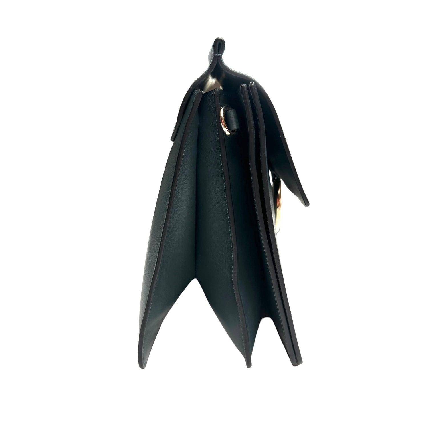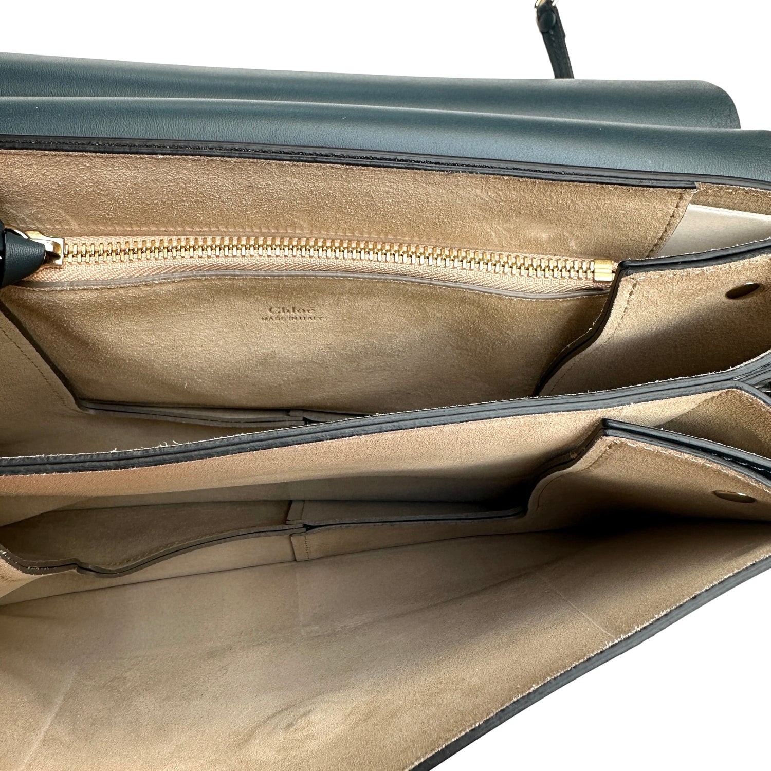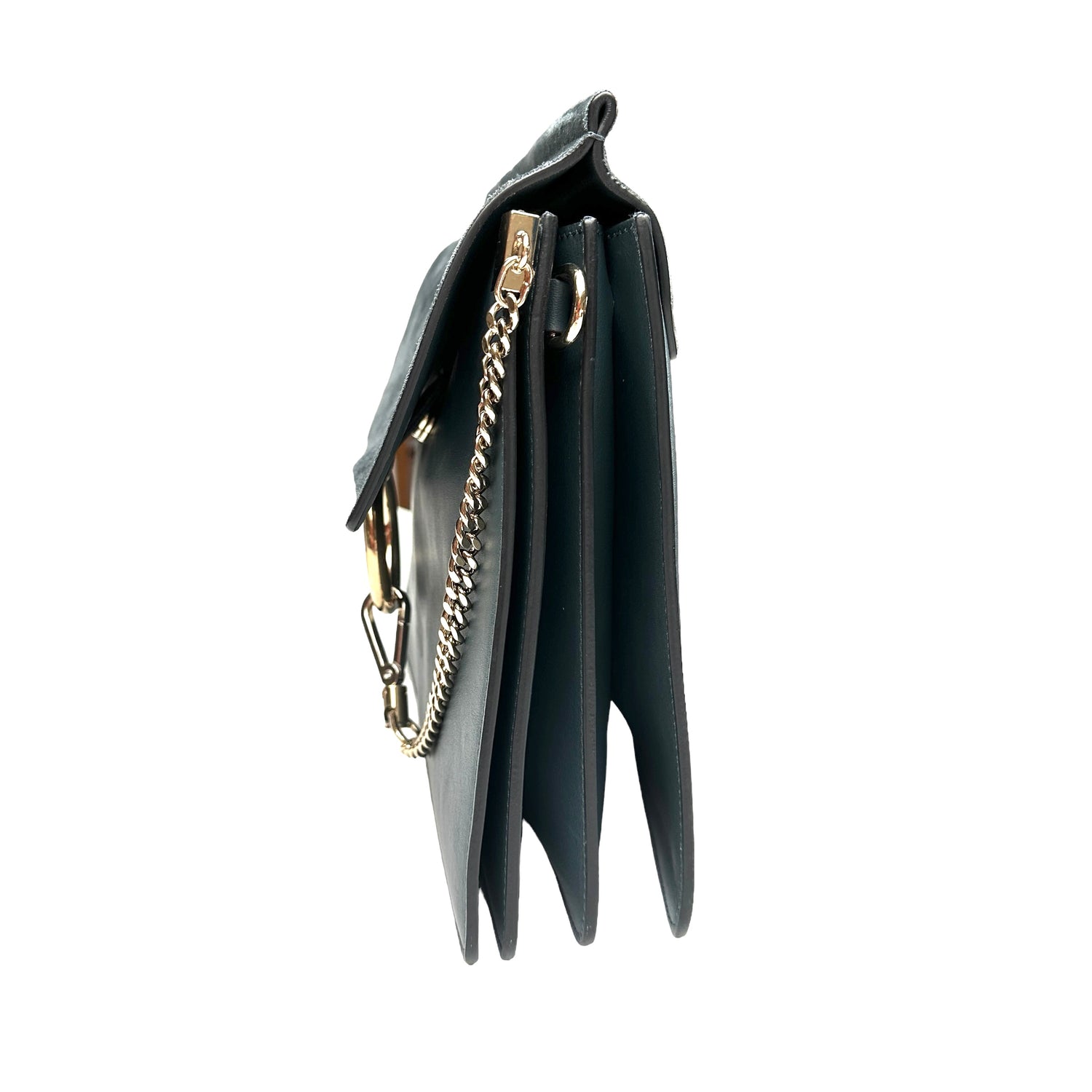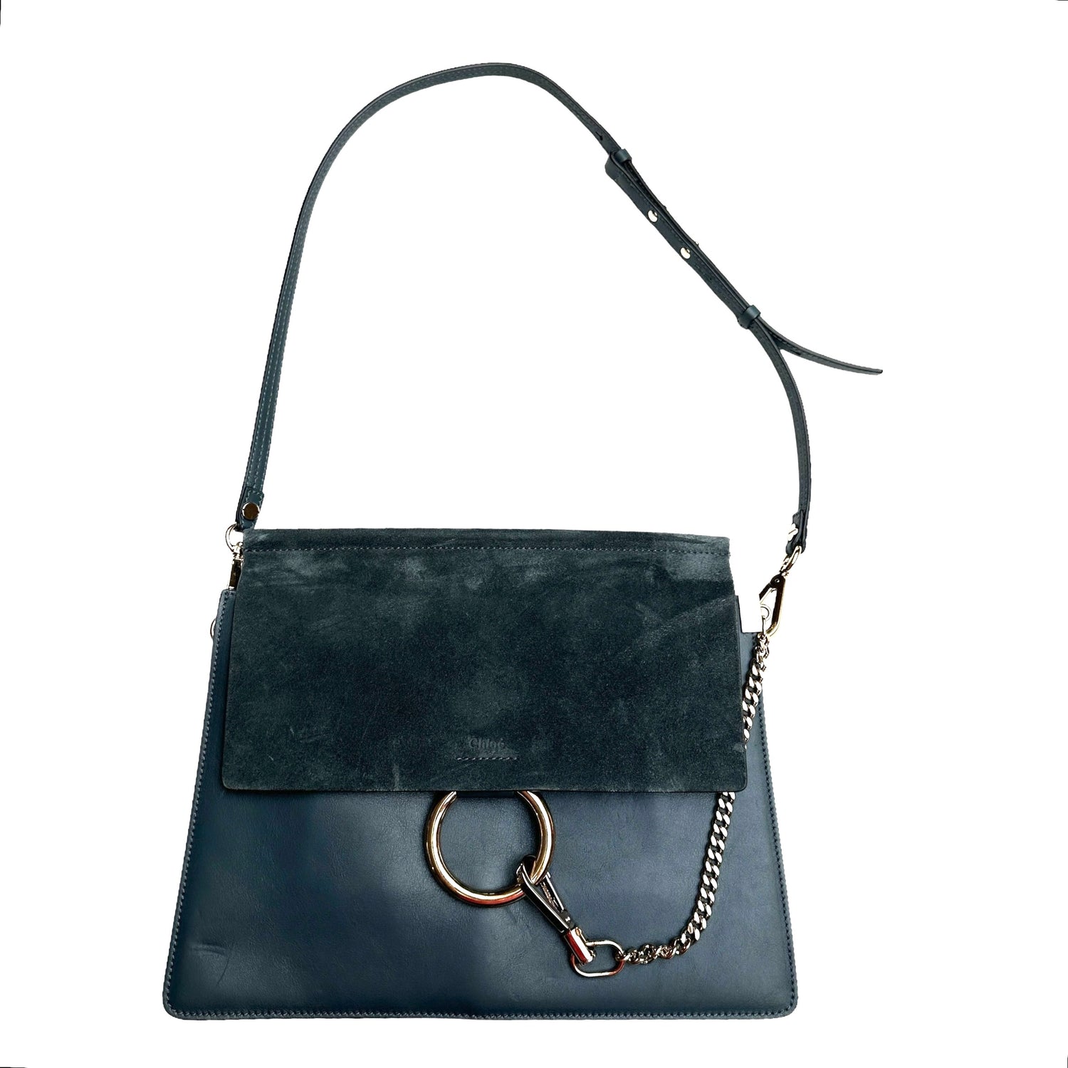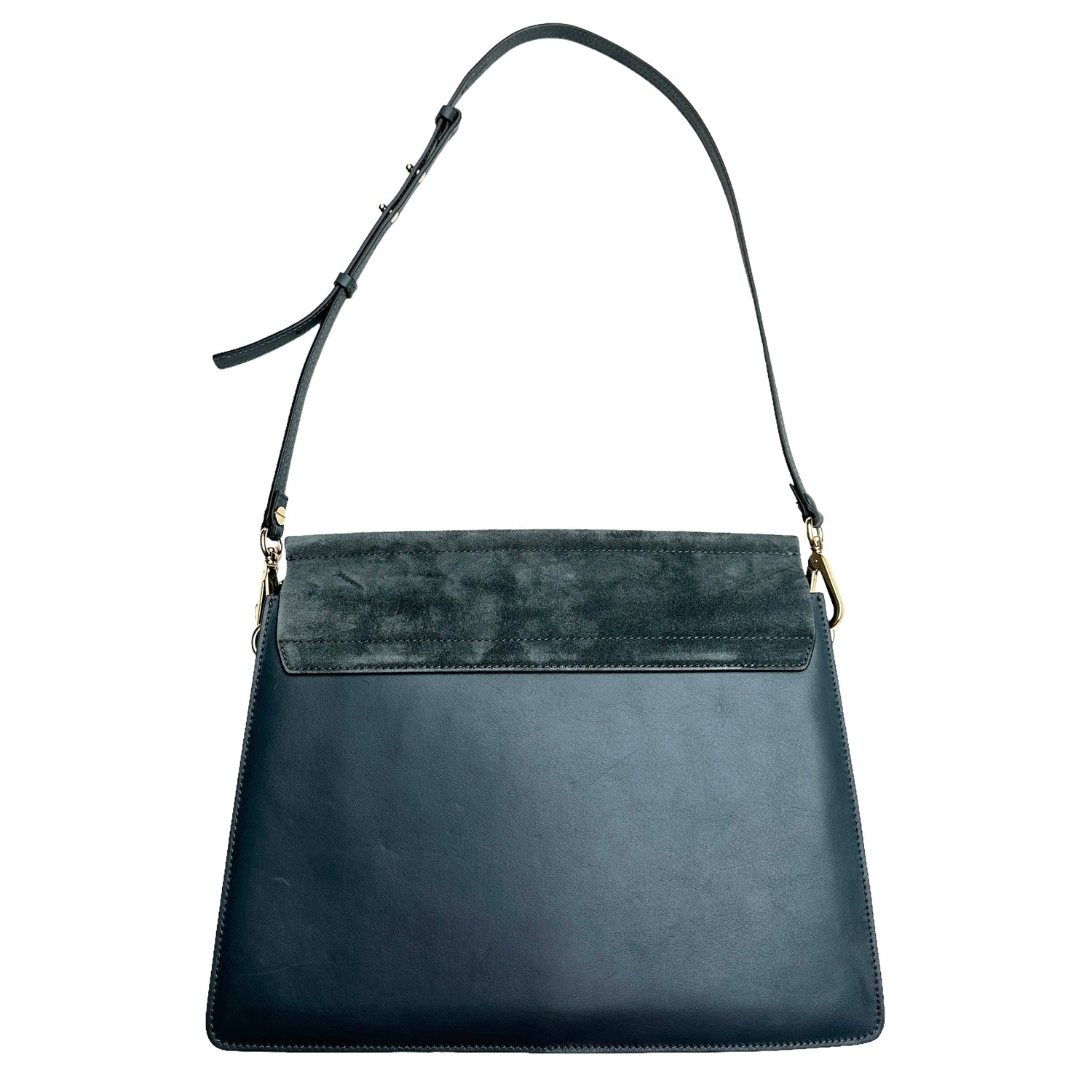 Chloe medium Faye bag with gold-tone hardware. Dark blue grey leather and suede. Magnetic flap closure at top. Beige suede lining with three practical compartments at interior and one zipper pocket. Folds flat for easy storing. Adjustable leather strap. The strap is removable for a large clutch look.