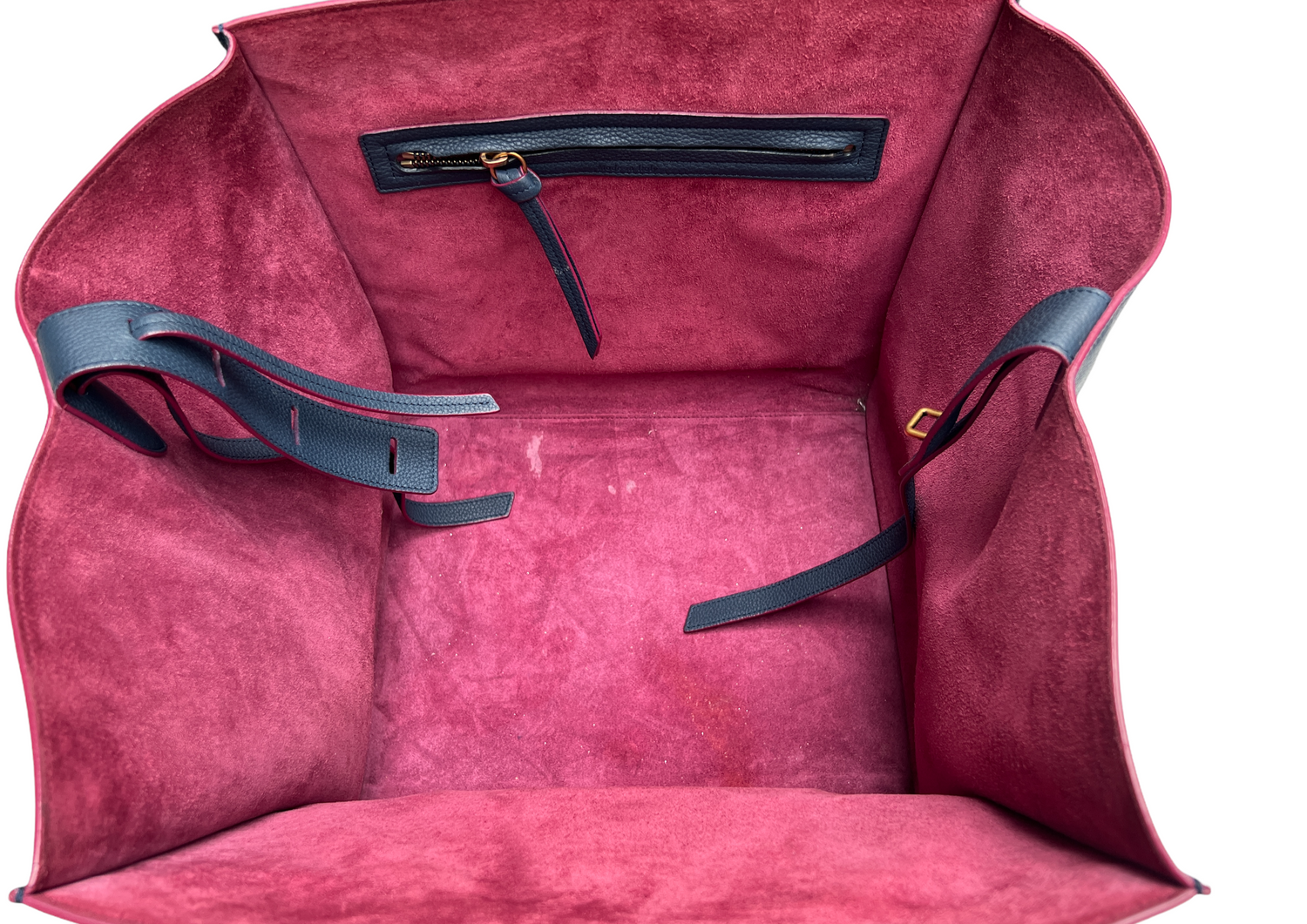 Beautiful navy leather. Burgundy suede lining. Single zipper exterior pocket. Single zipper interior pocket. Protective feet at base. This is an iconic bag! Fantastic for work and for traveling!