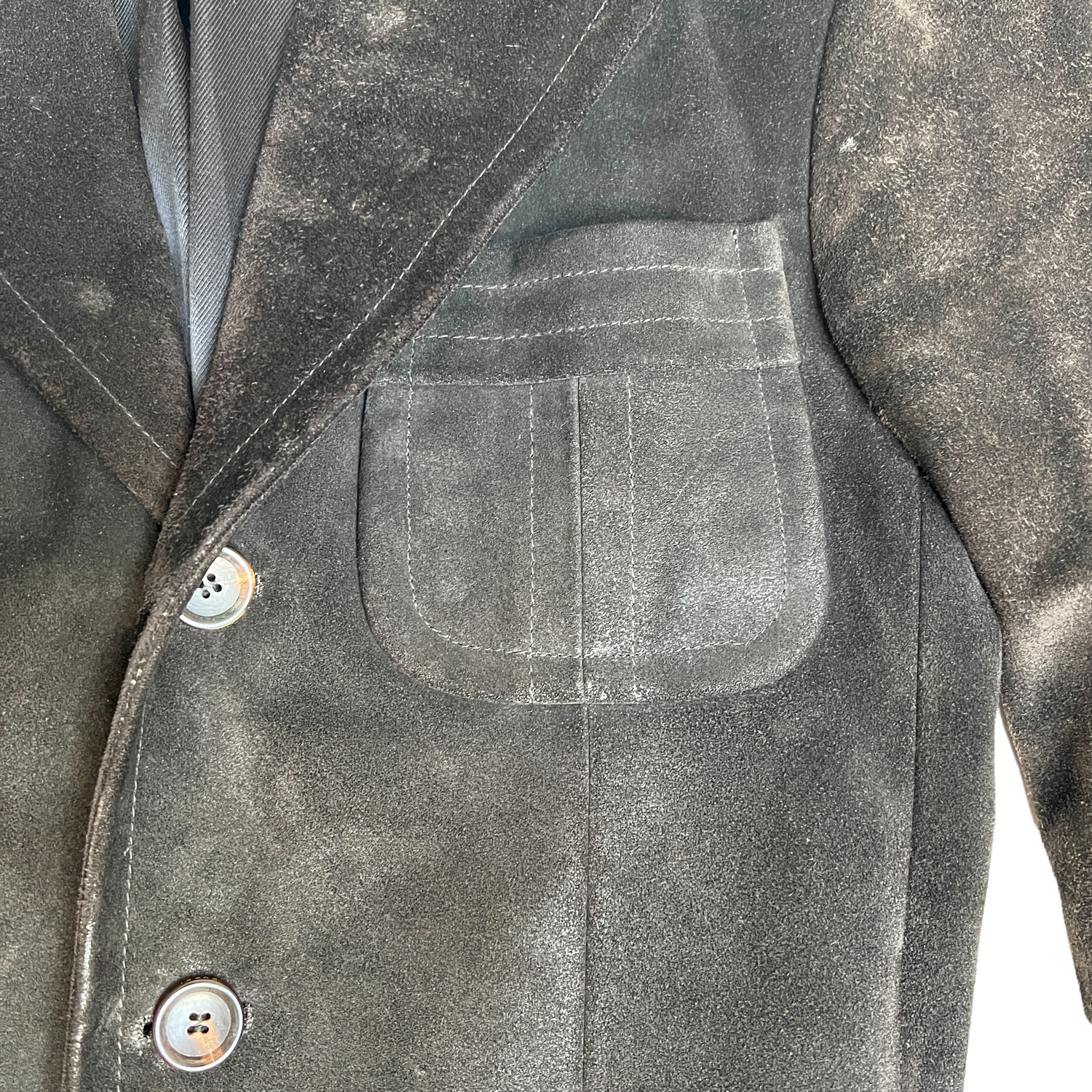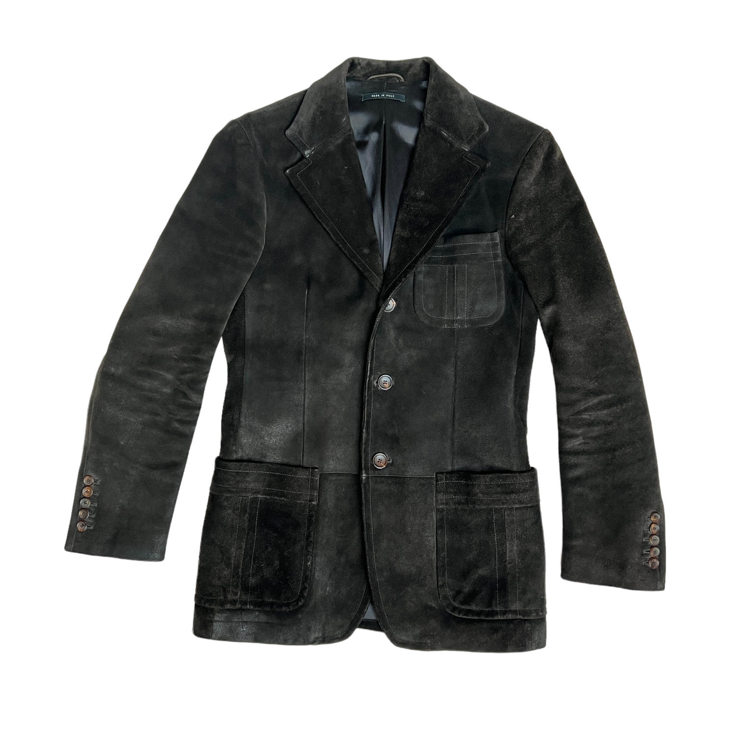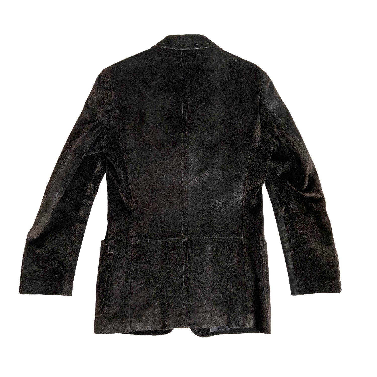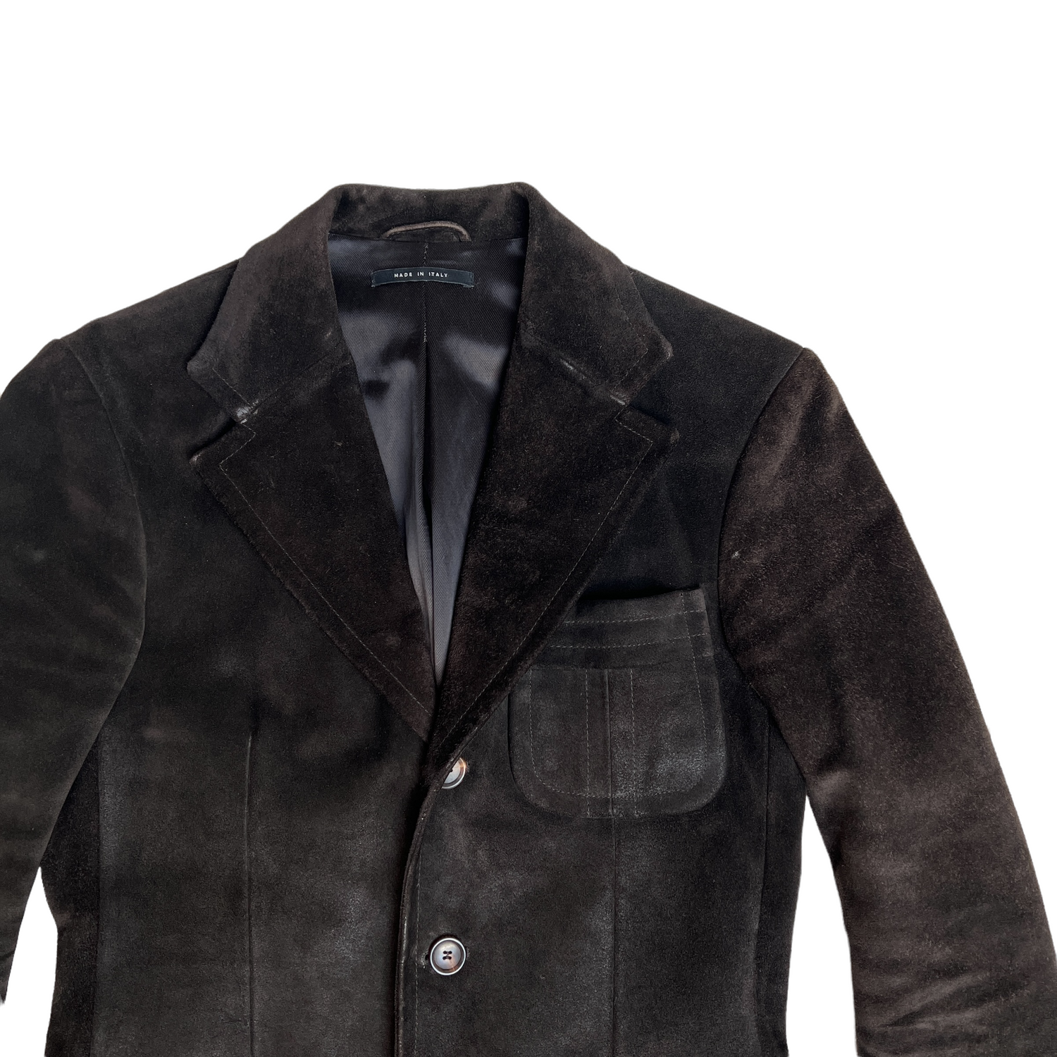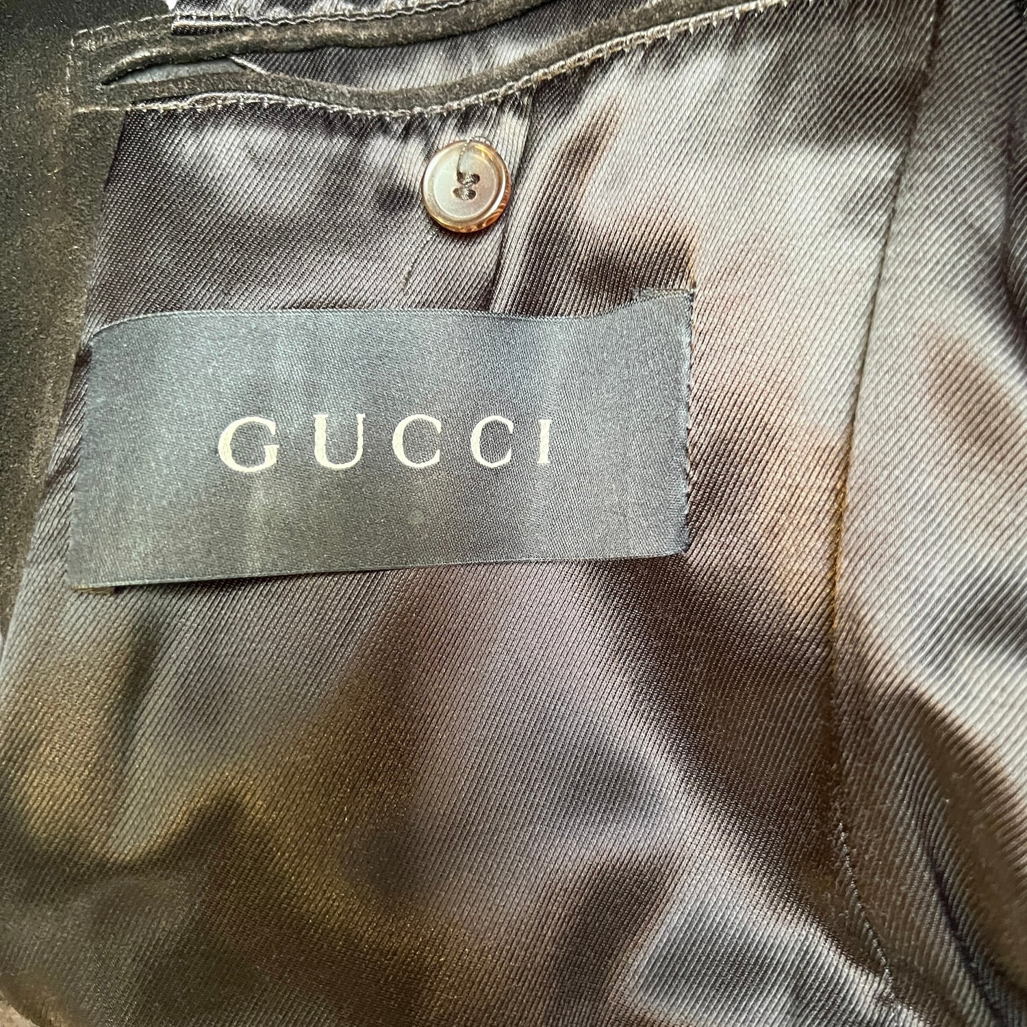 Brown suede jacket from Gucci. Three exterior pockets. Pockets at inside lining. Three buttons closure at front.