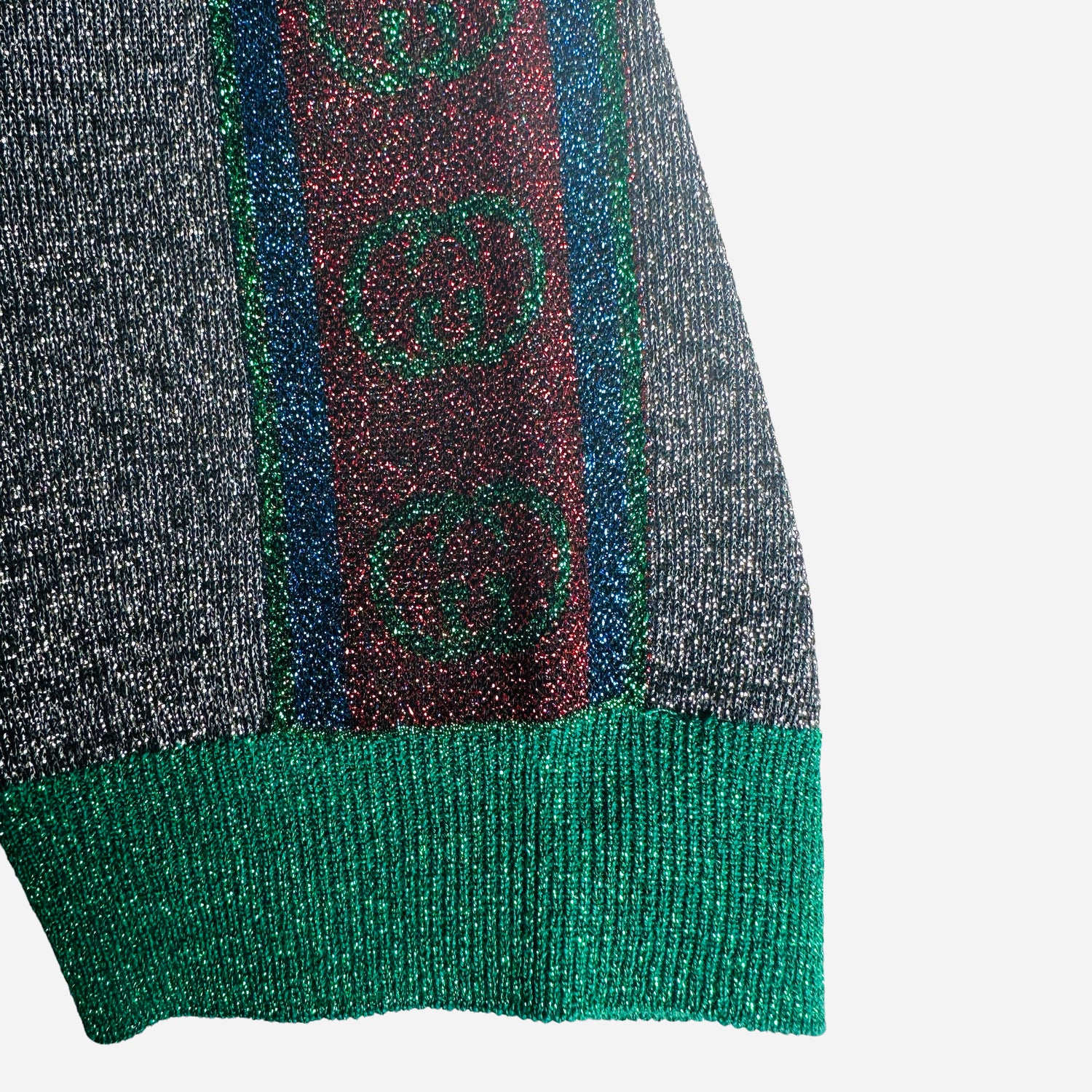 Gucci Fall/Winter 2019 collection by Alessandro Michele. Green metallic fabric. Round neck. Short sleeves. Designer size small.