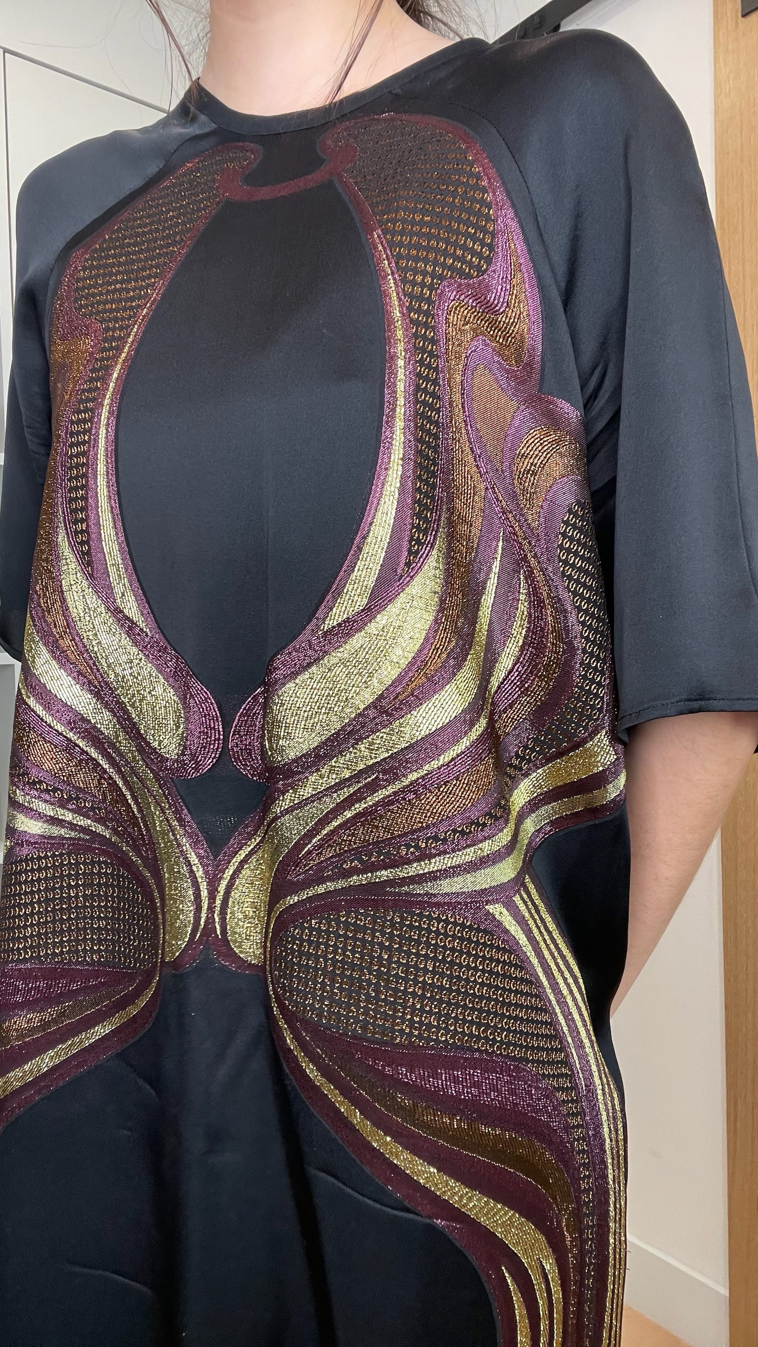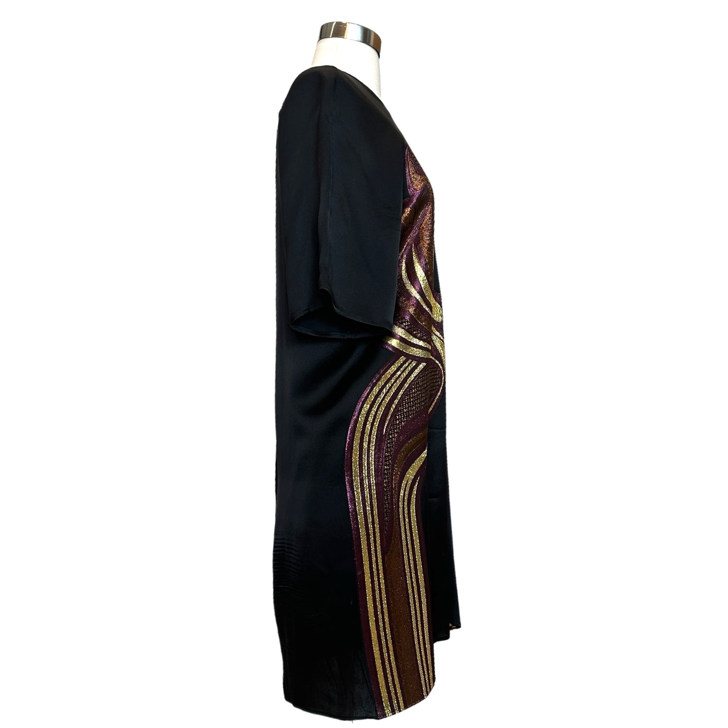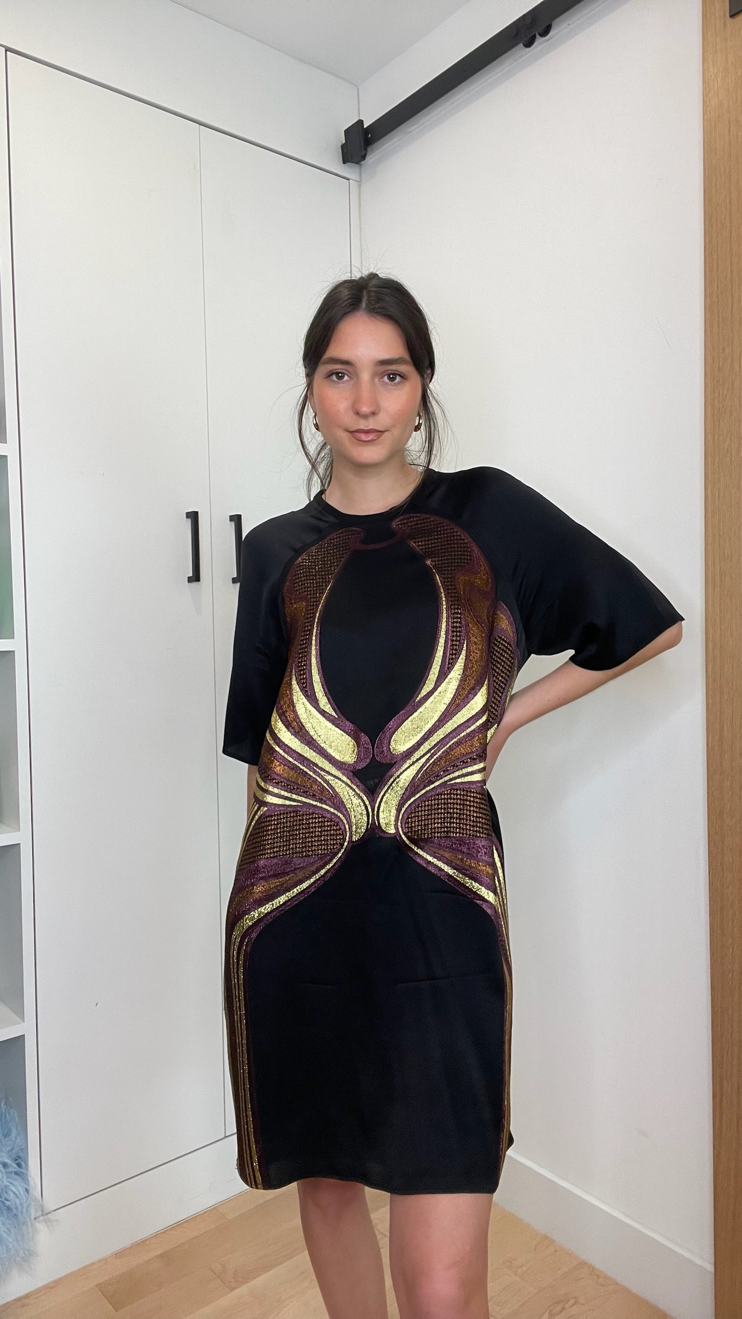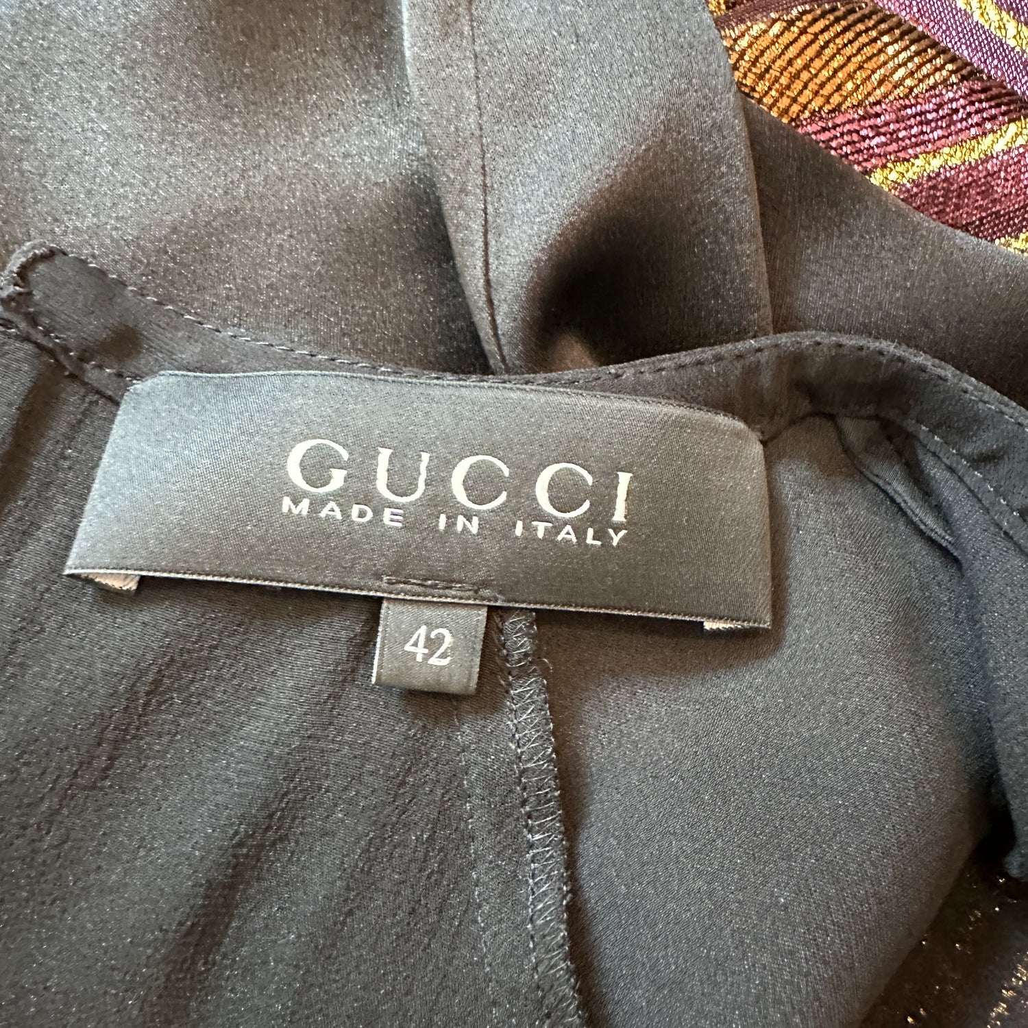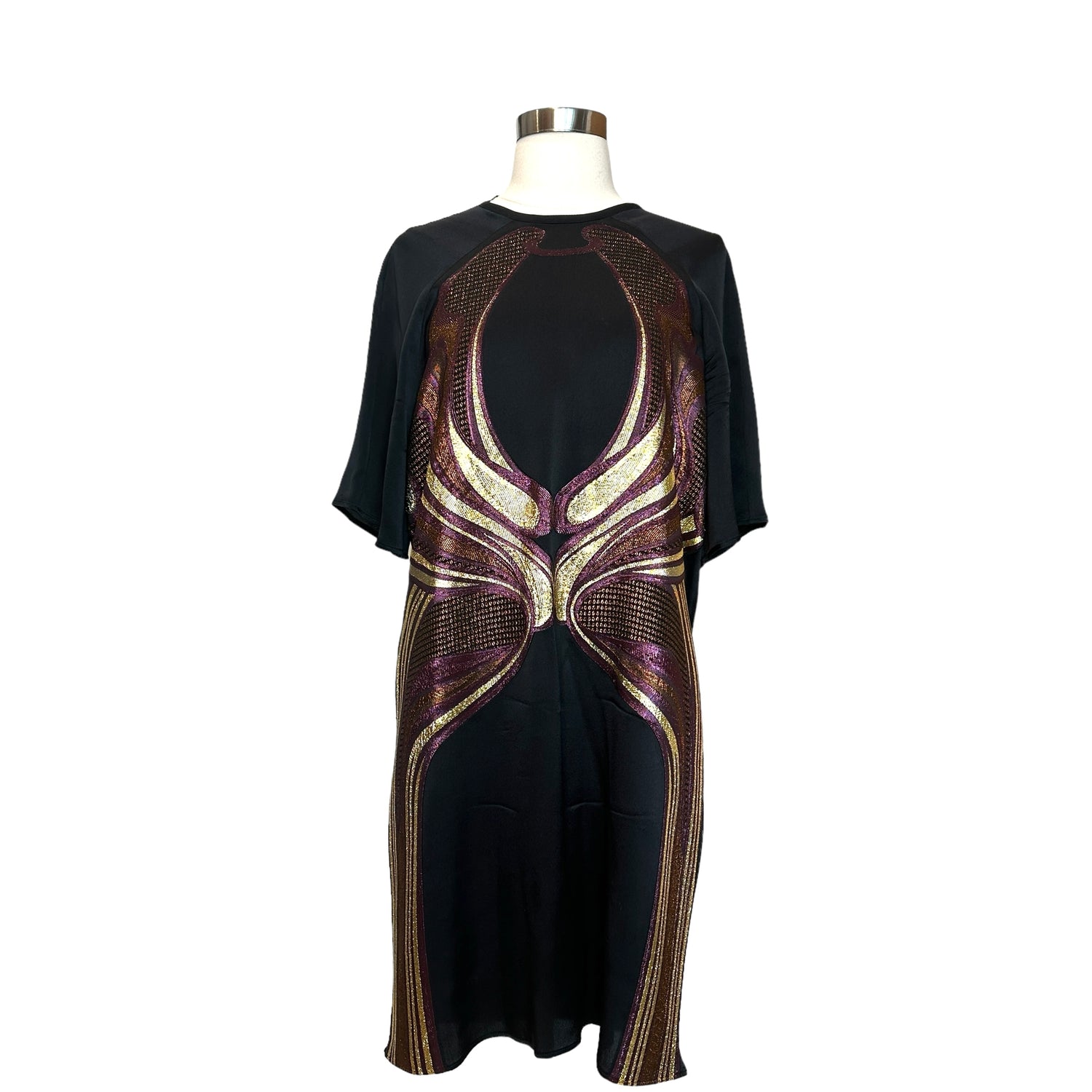 Gucci shift dress. Metallic print at front. Round neck. Concealed zipper at back. Designer size 42.