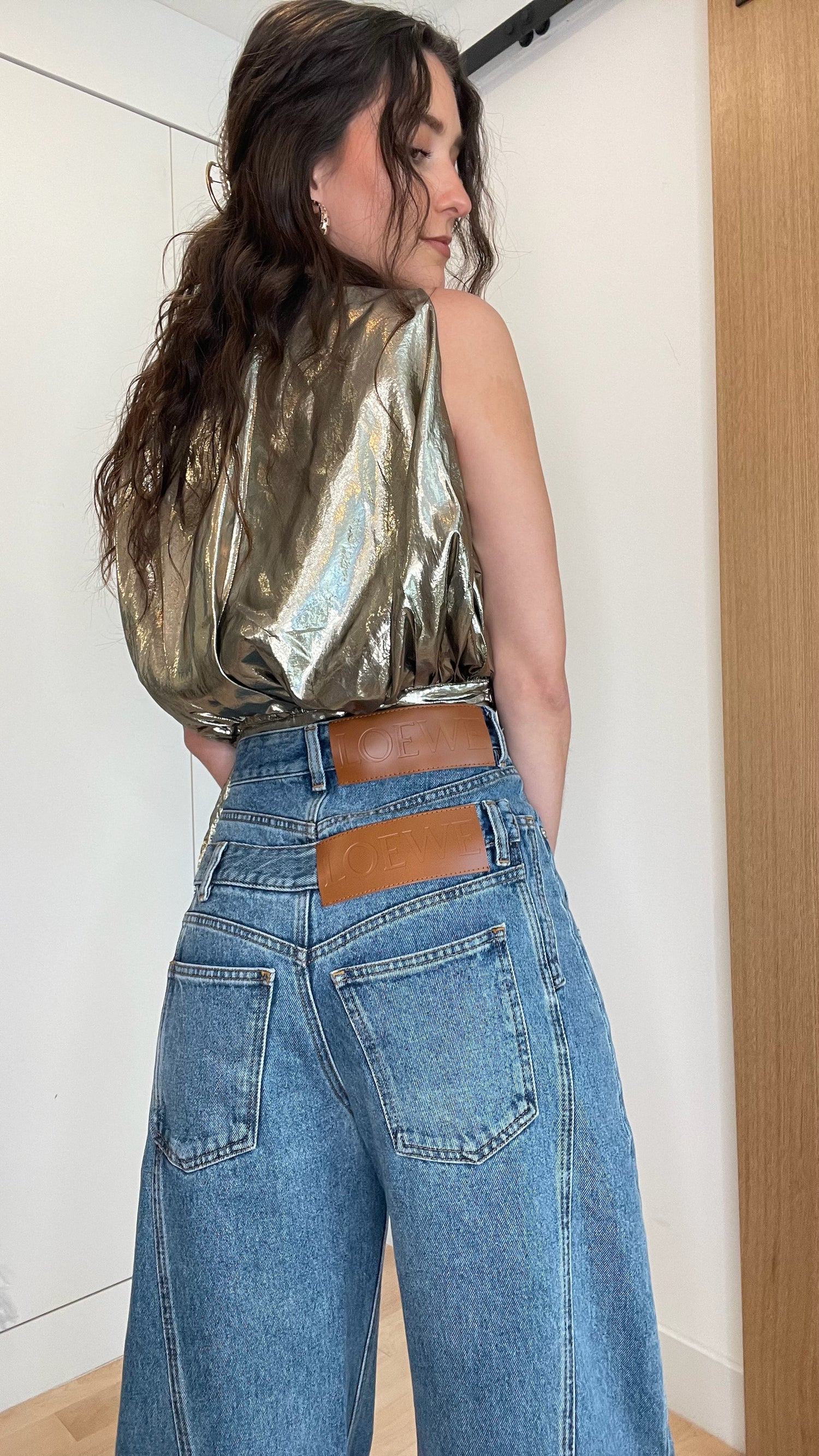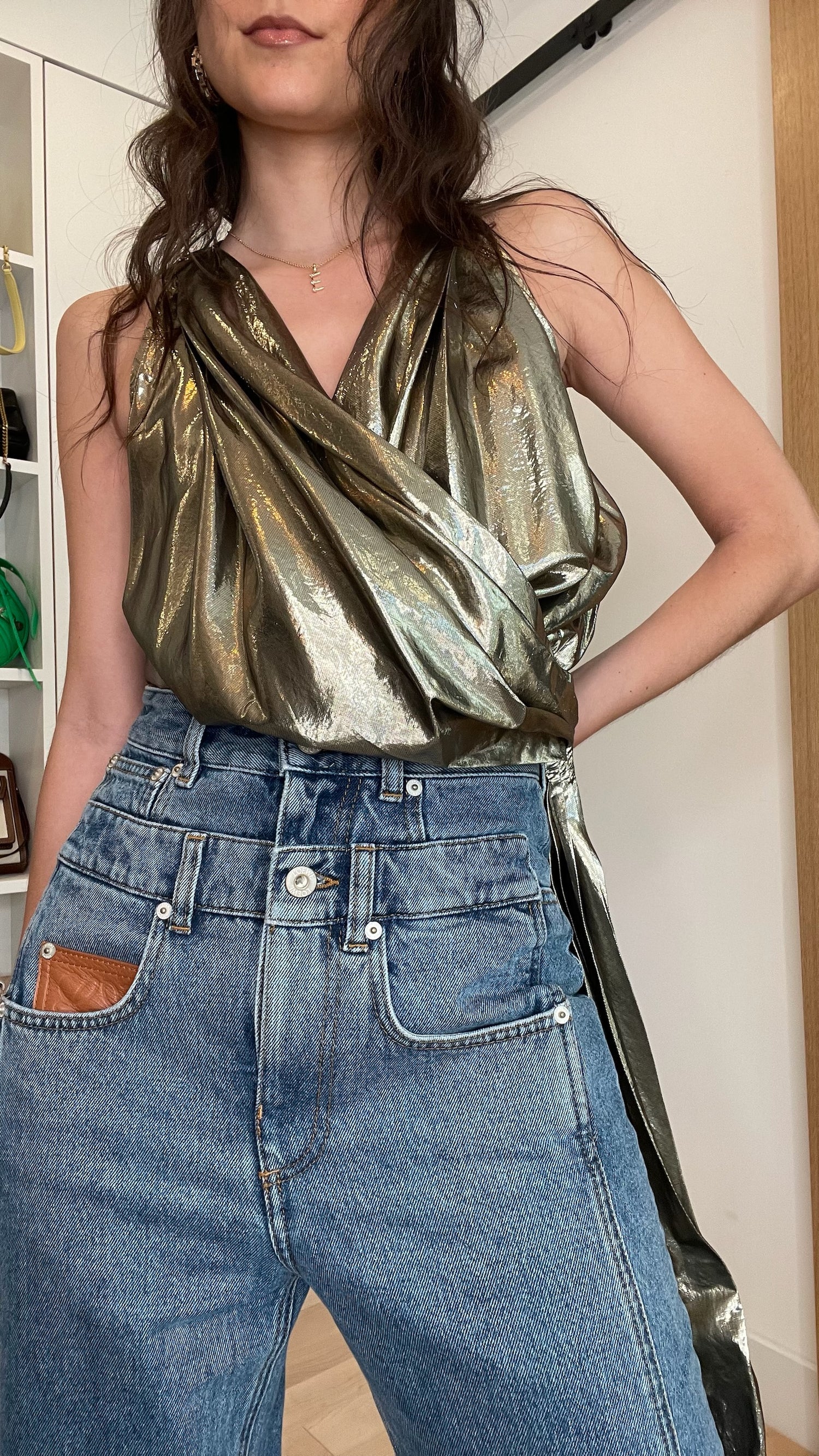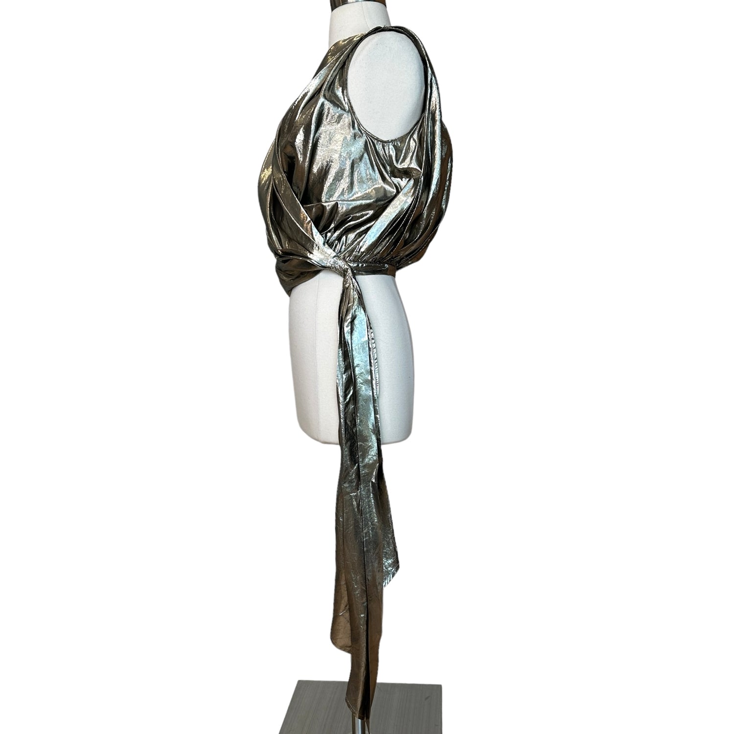 Attico gold top. Wrap in front. Snap concealed button closure at wait. Long swatch of fabric at side. Designer size 0.