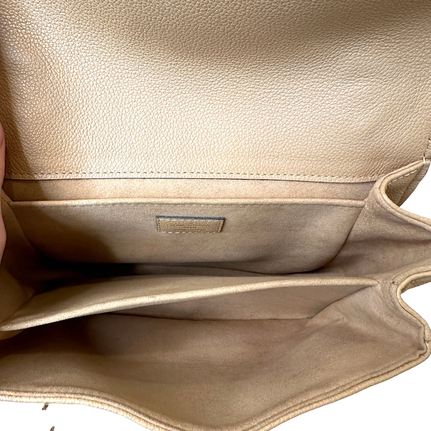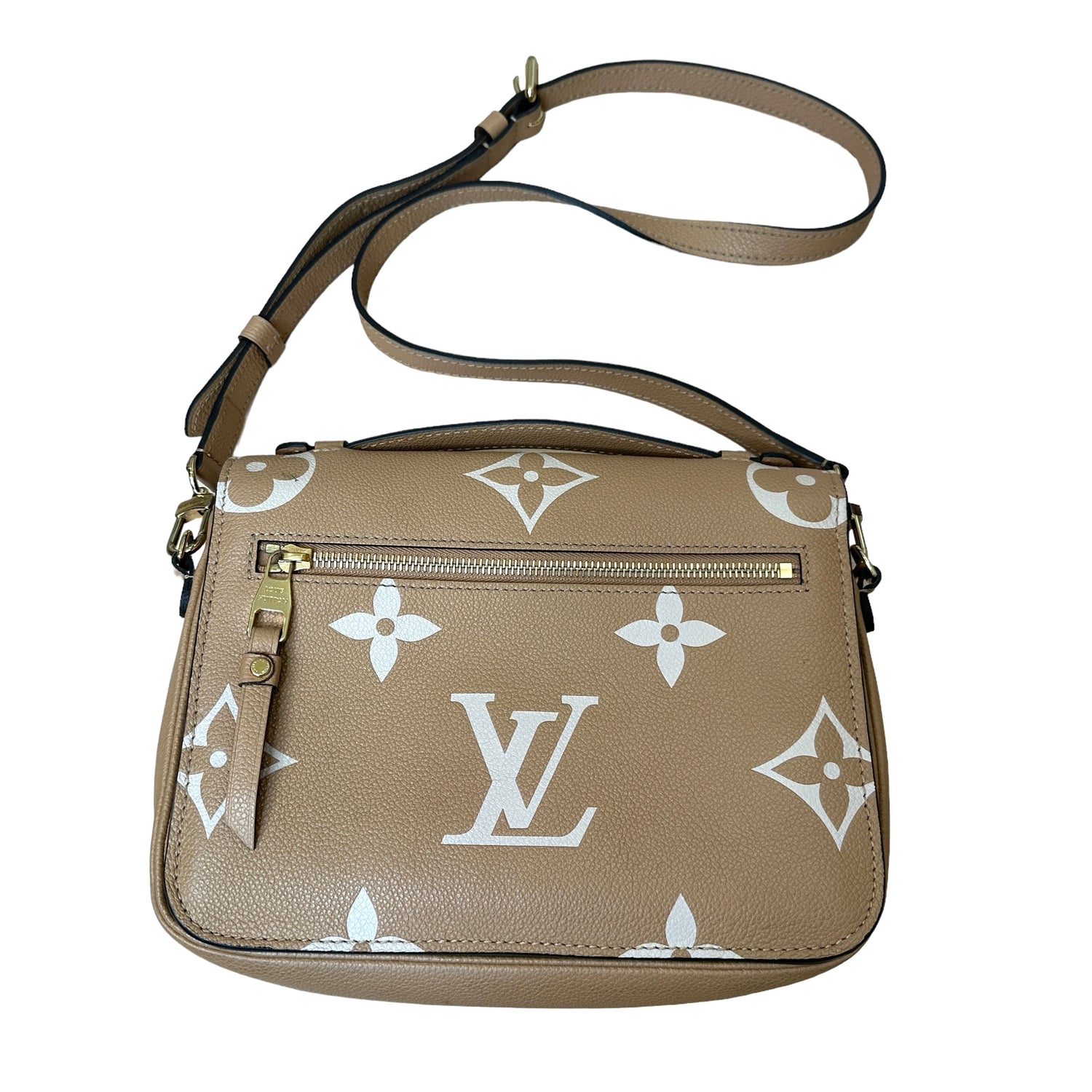 Louis Vuitton Metis bag with giant monogram in cream colors. Flap bag with gold-tone snap closure at front. One hand handle and one crossbody strap. Multiple compartment at interior. One exterior zipper pocket.