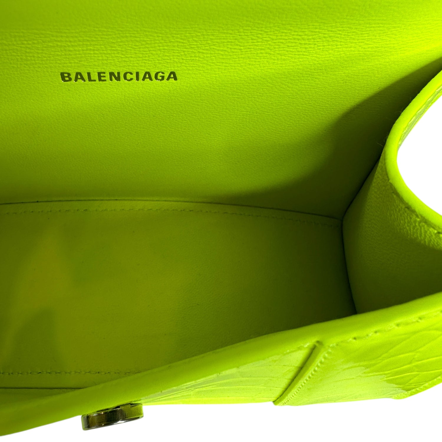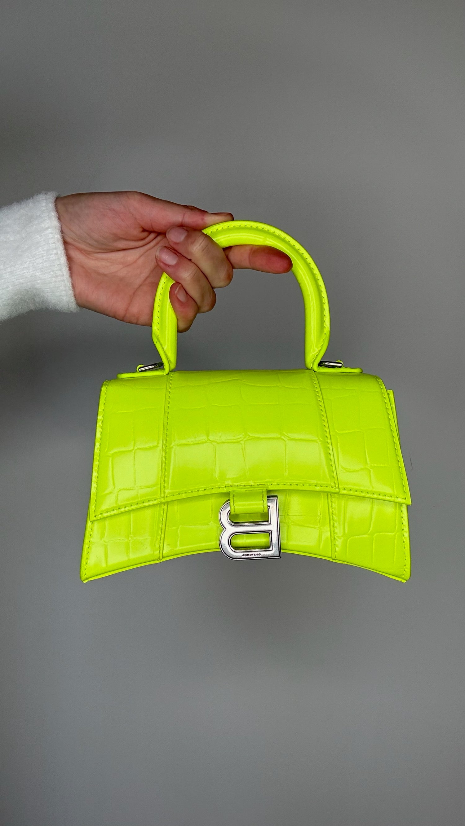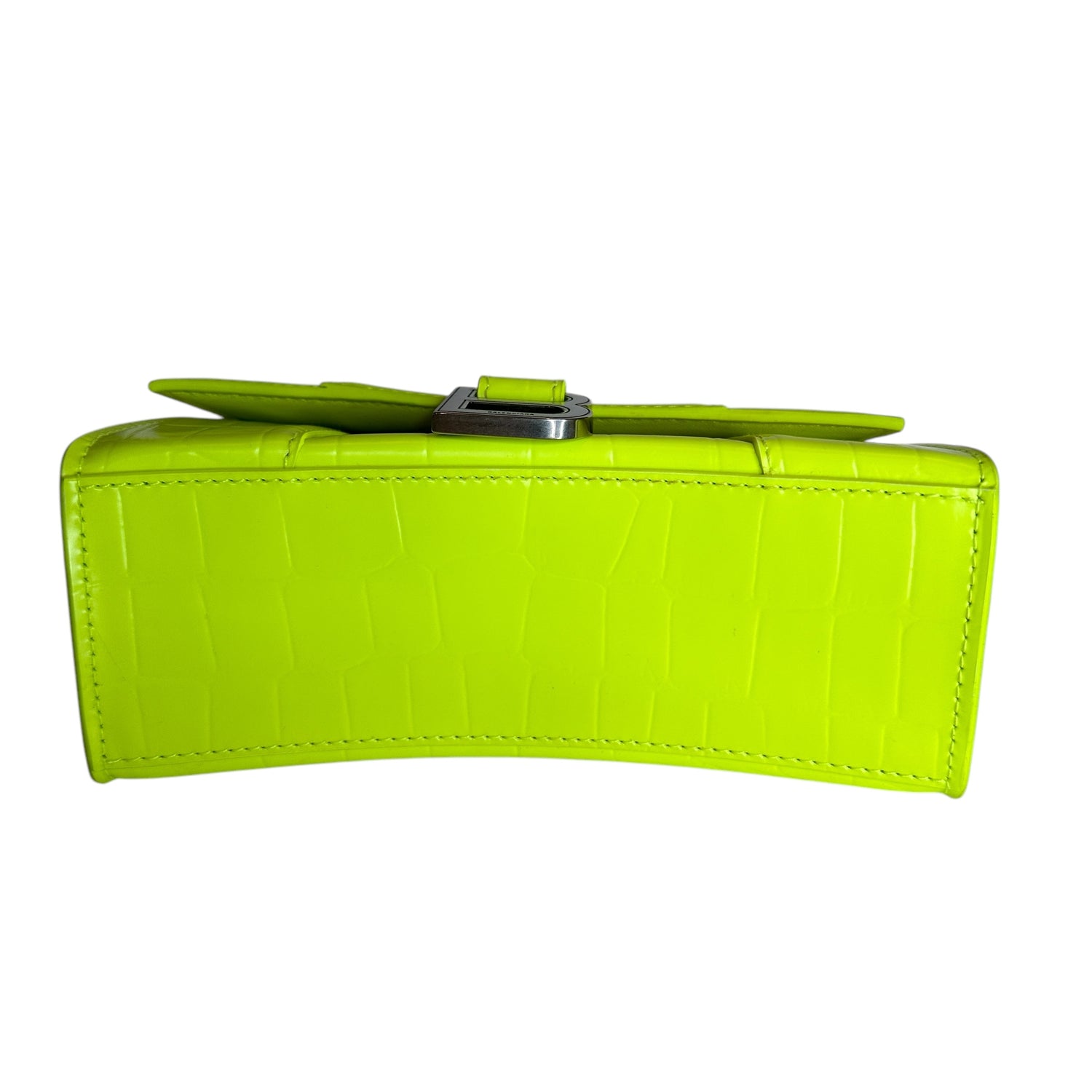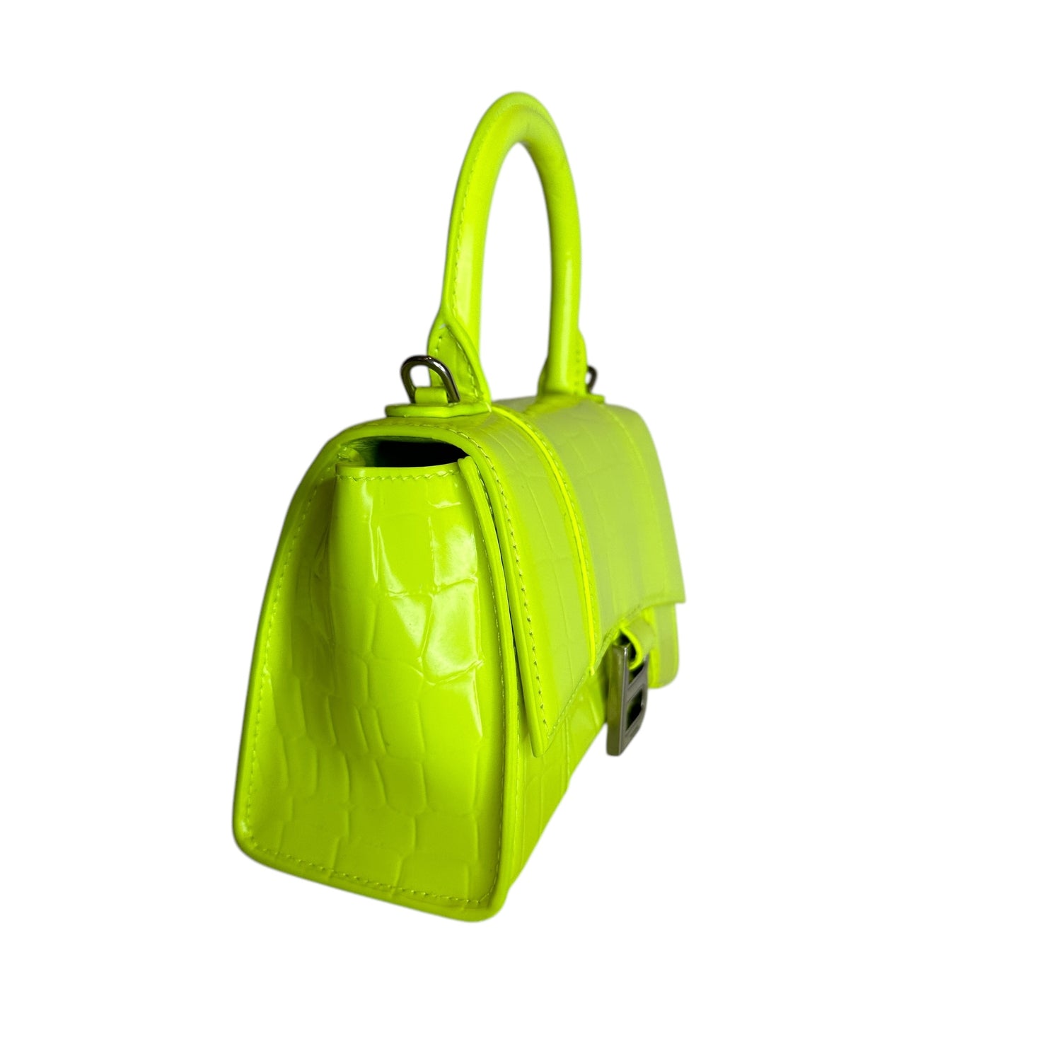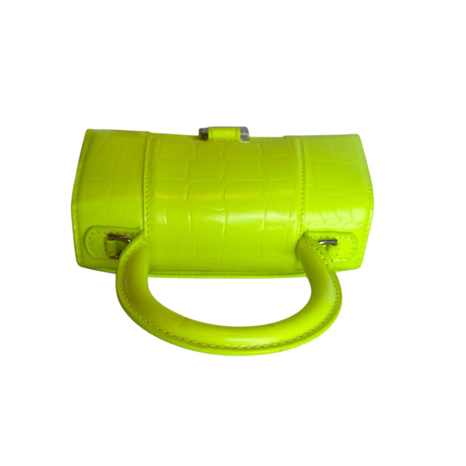 Balenciaga hourglass mini bag. Neon yellow leather. Silver hardware. Removable crossbody strap.