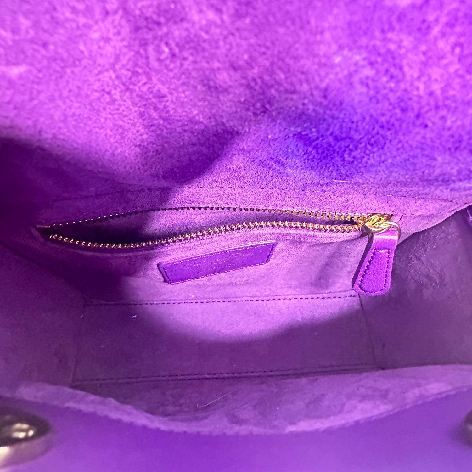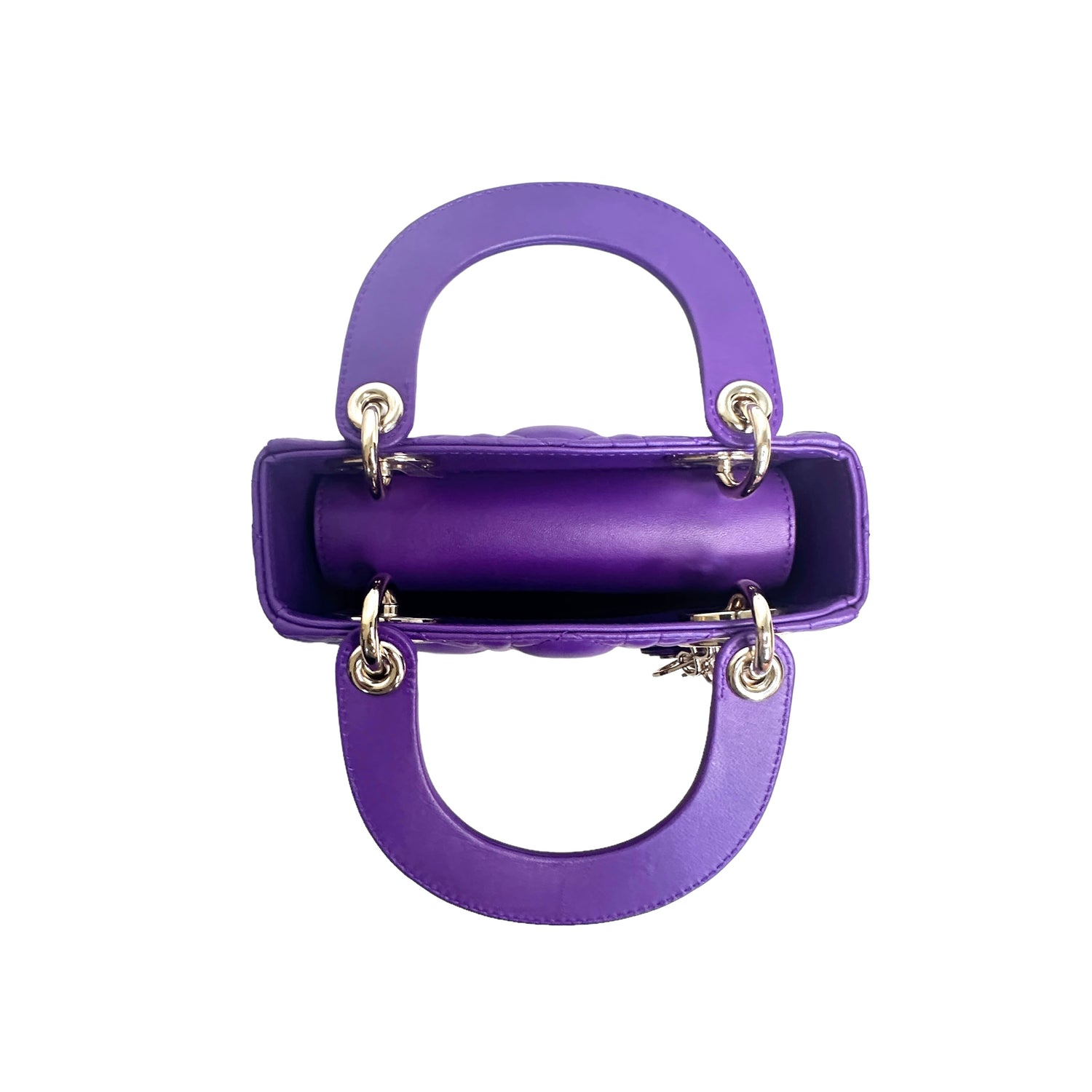 Christian Dior Lady Dior bag. Iconic purple leather cannage. Gold-tone hardware. Double rigid handles. One crossbody chain with leather padding at top. Protective feet at base. Flap closure at top. One interior zipper pocket. Purple suede lining.