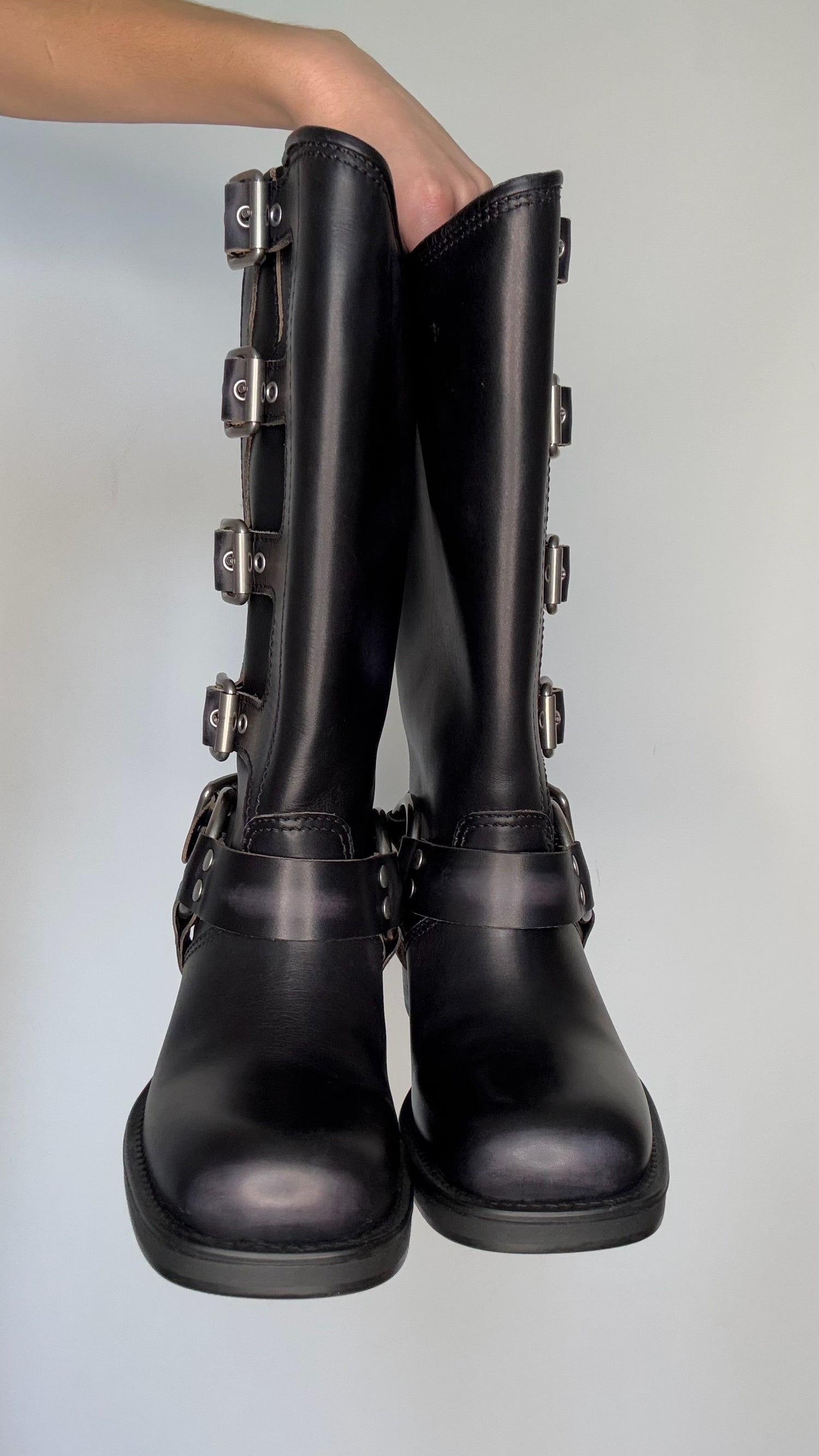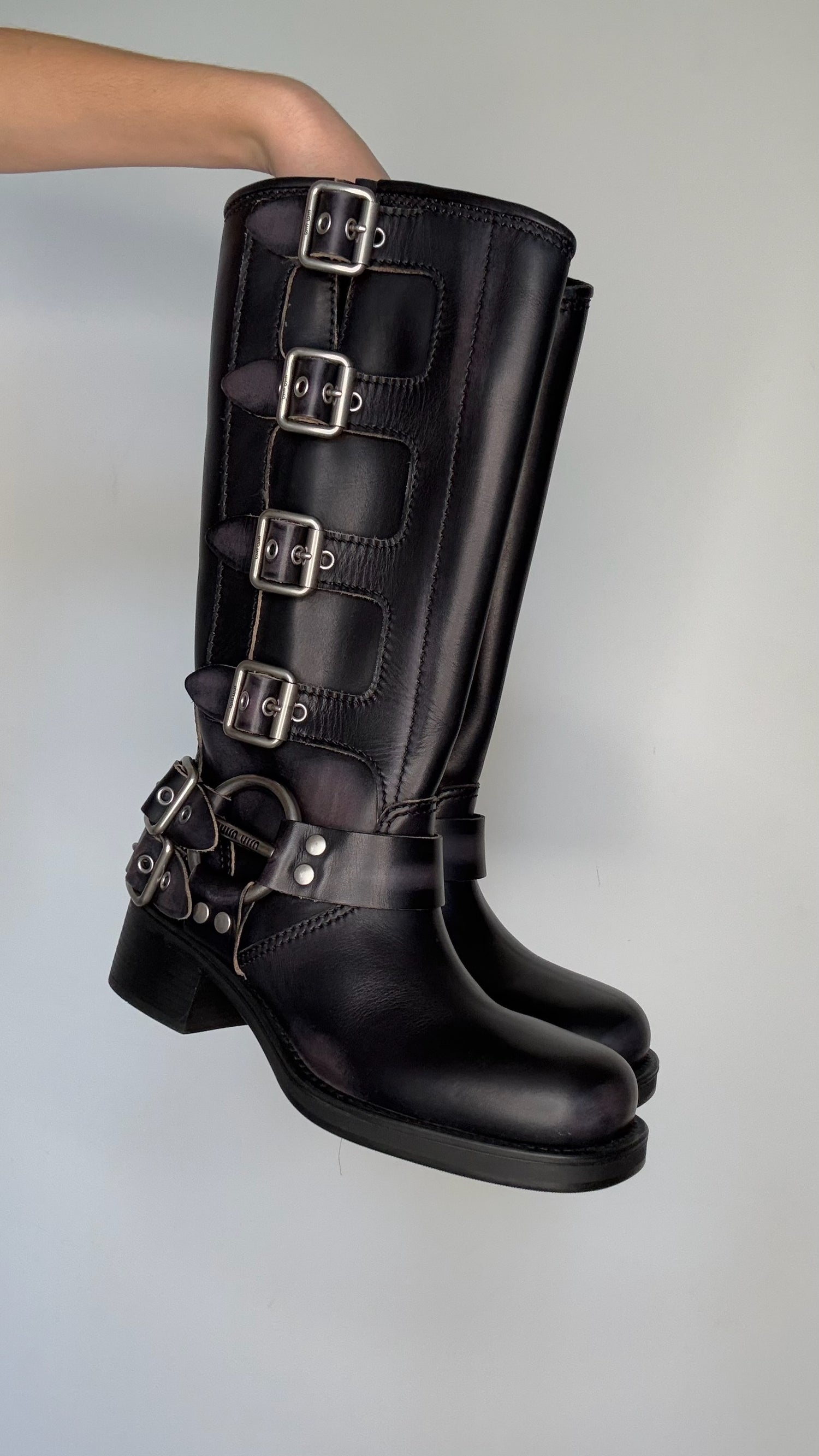Miu Miu black moto boots. Silver buckles. Chunky square toe. Designer size 38.