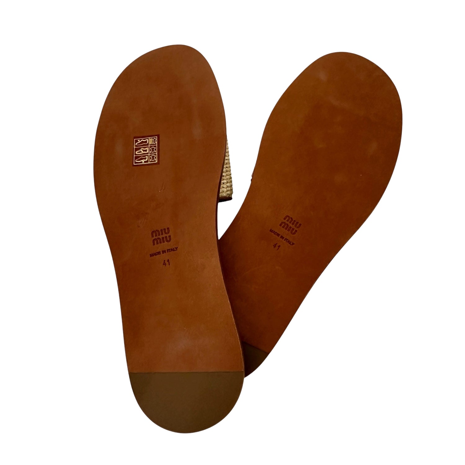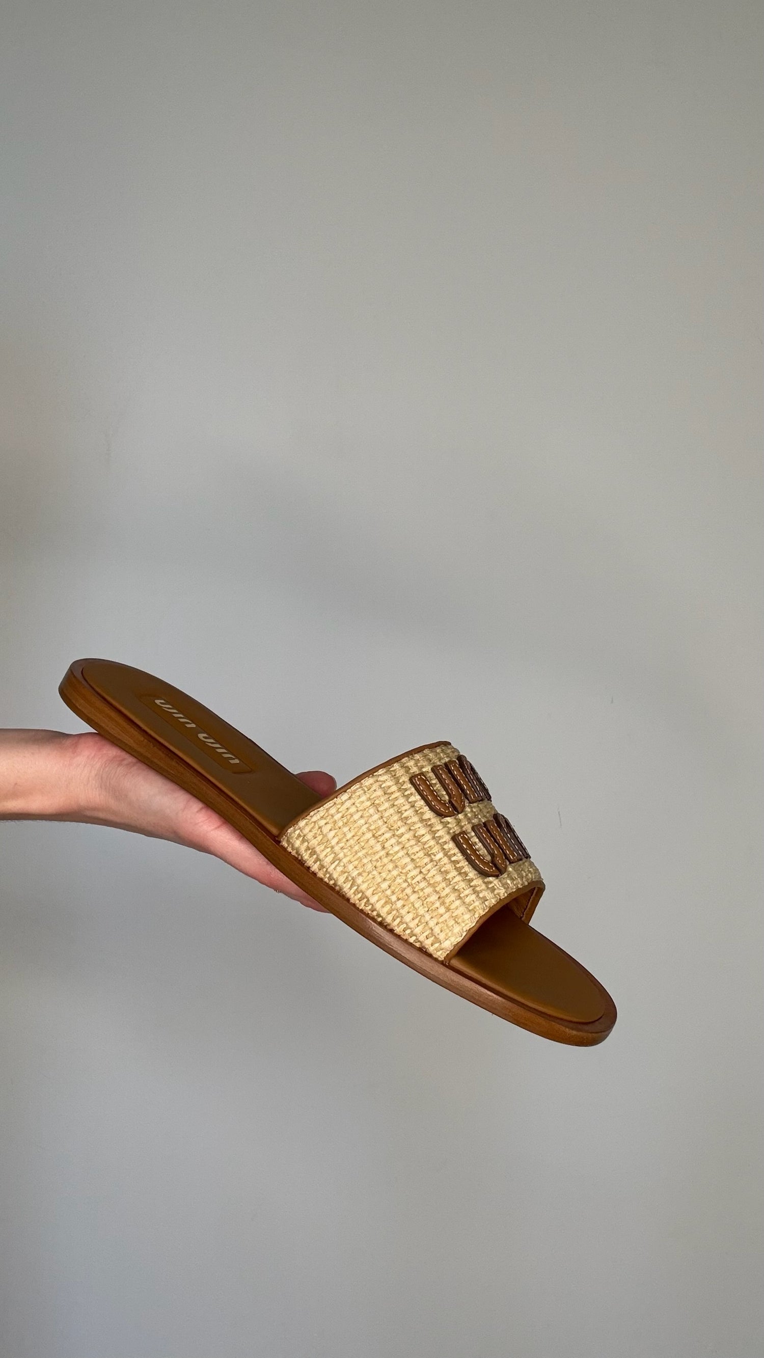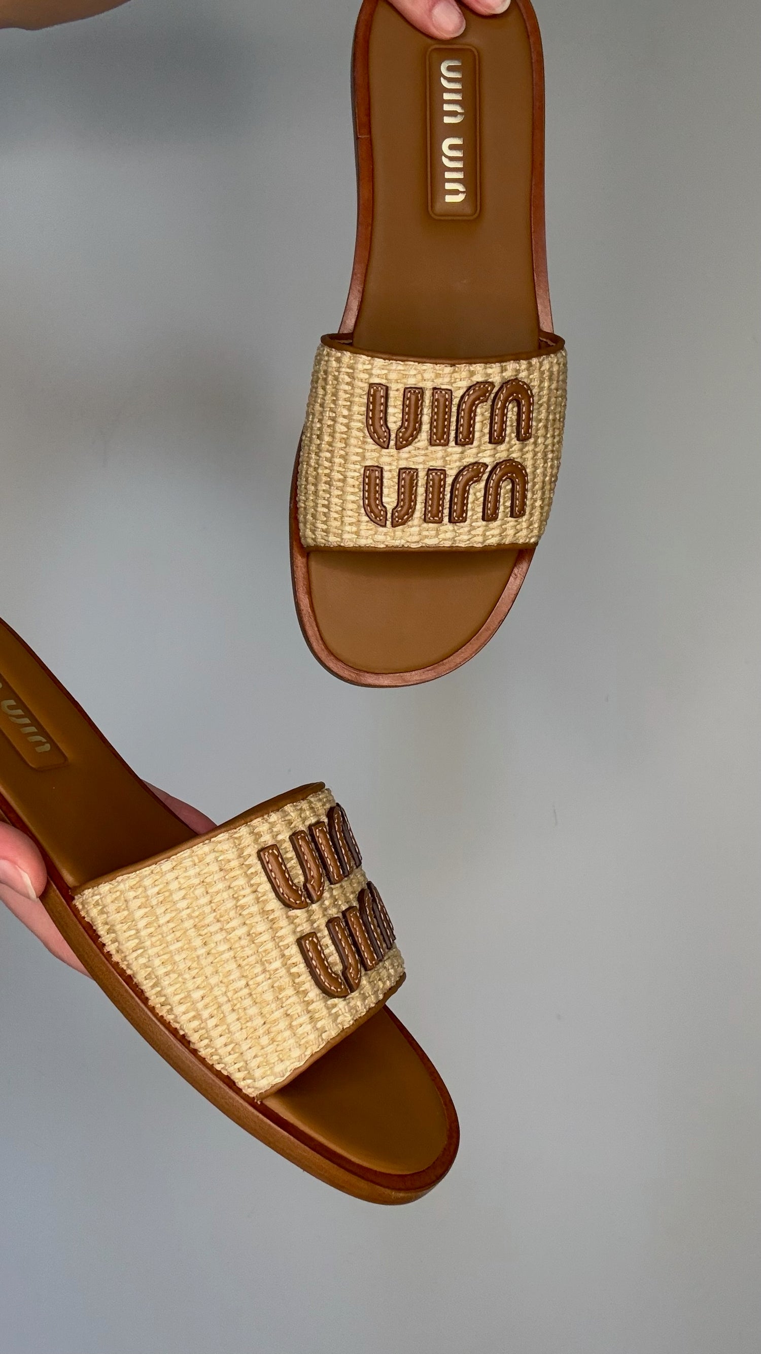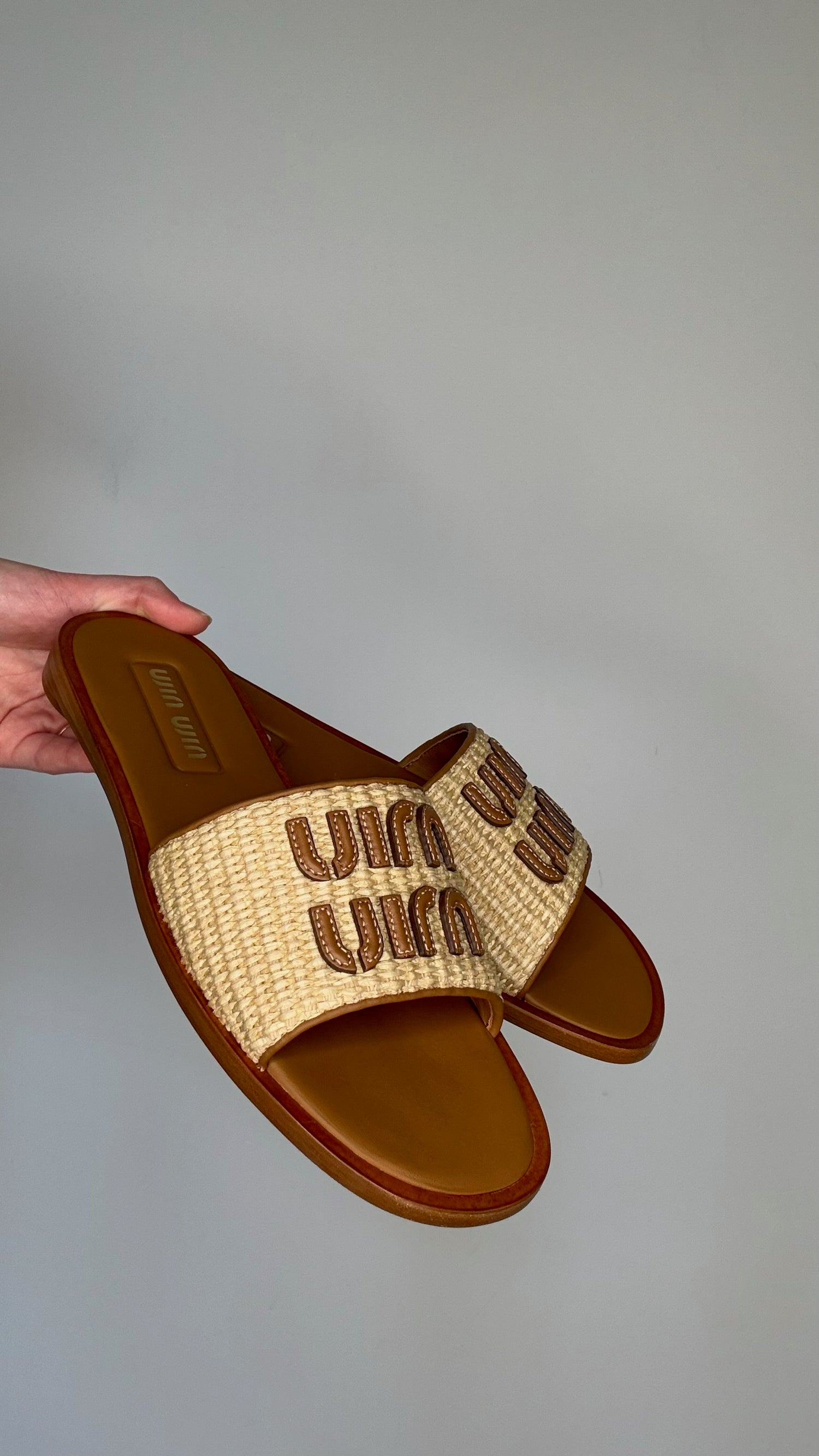 Miu Miu 2024 raffia sandals. Brown logo leather on natural raffia. Designer size 41.