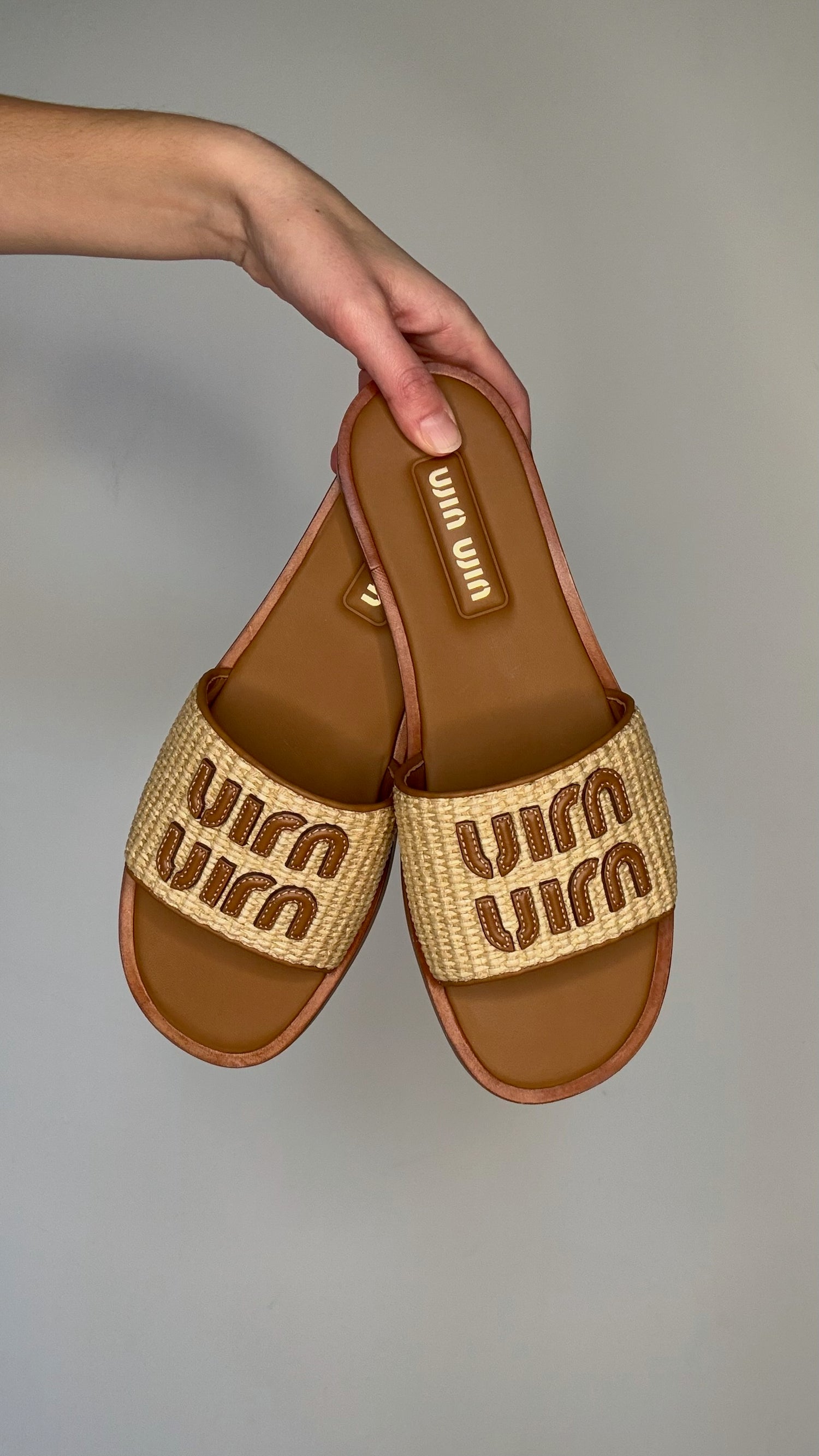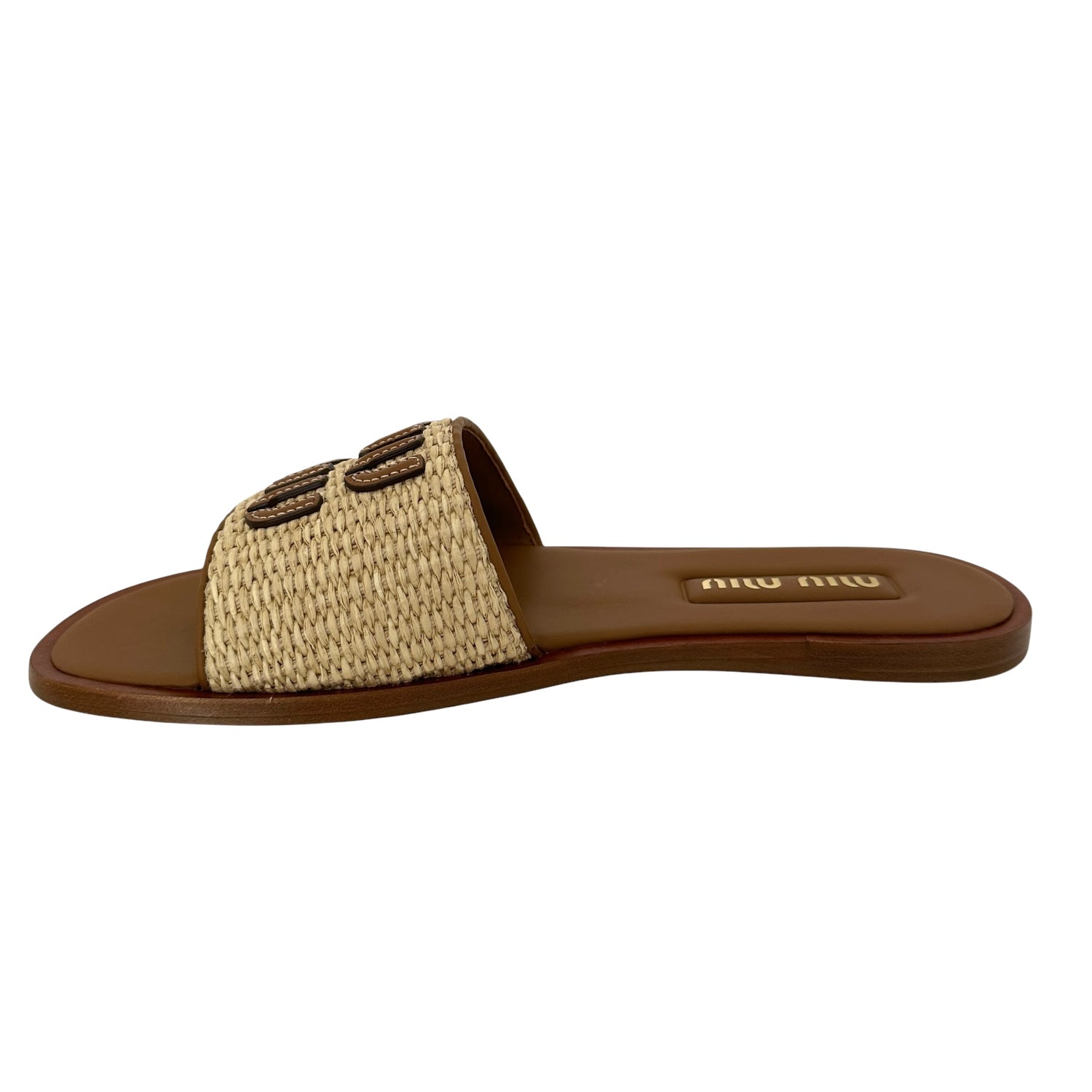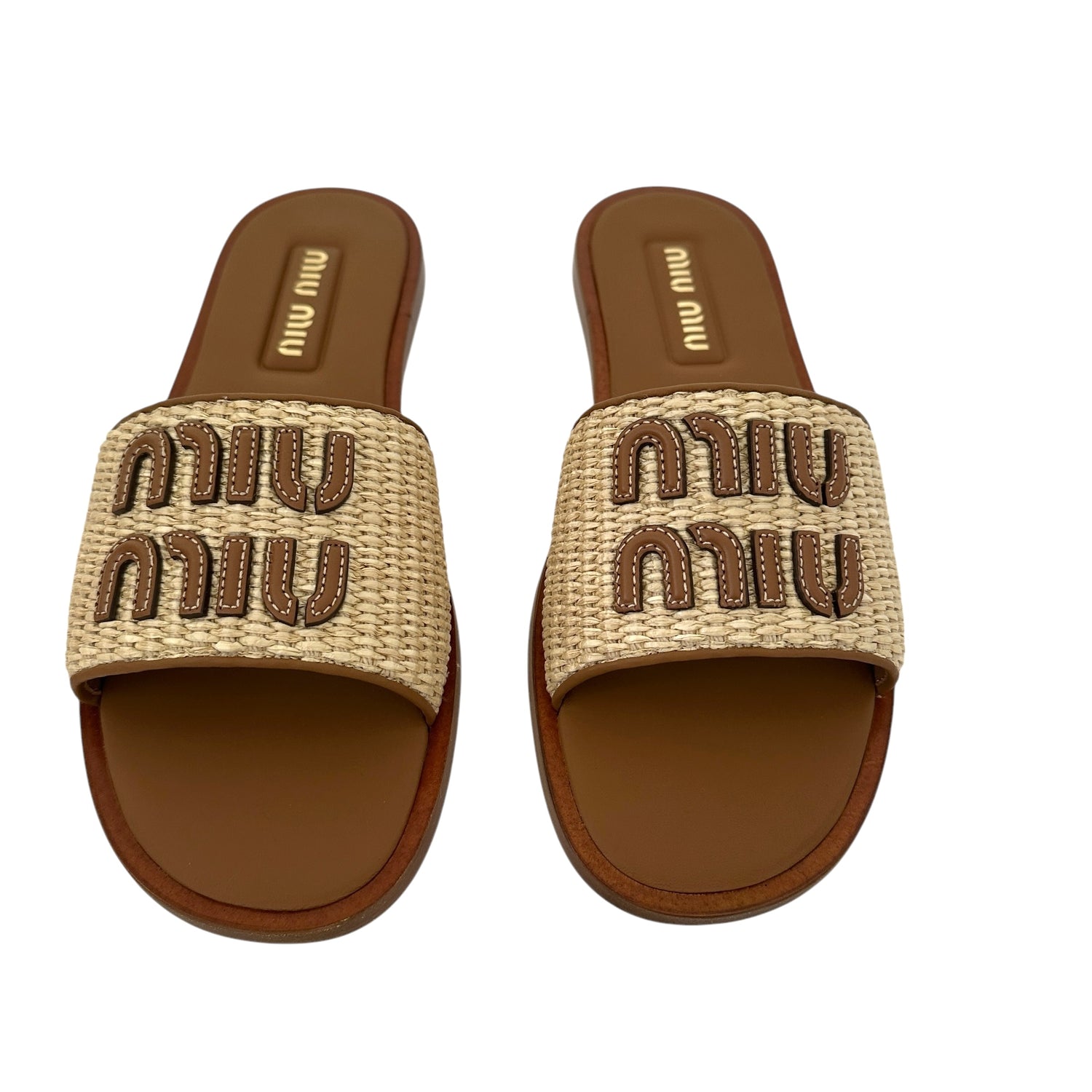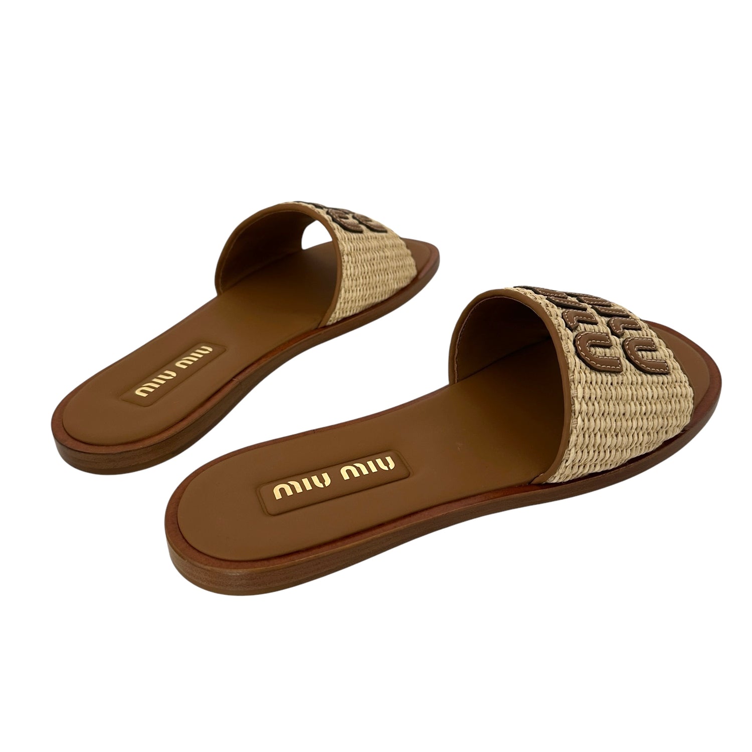 Miu Miu 2024 raffia sandals. Brown logo leather on natural raffia. Designer size 41.