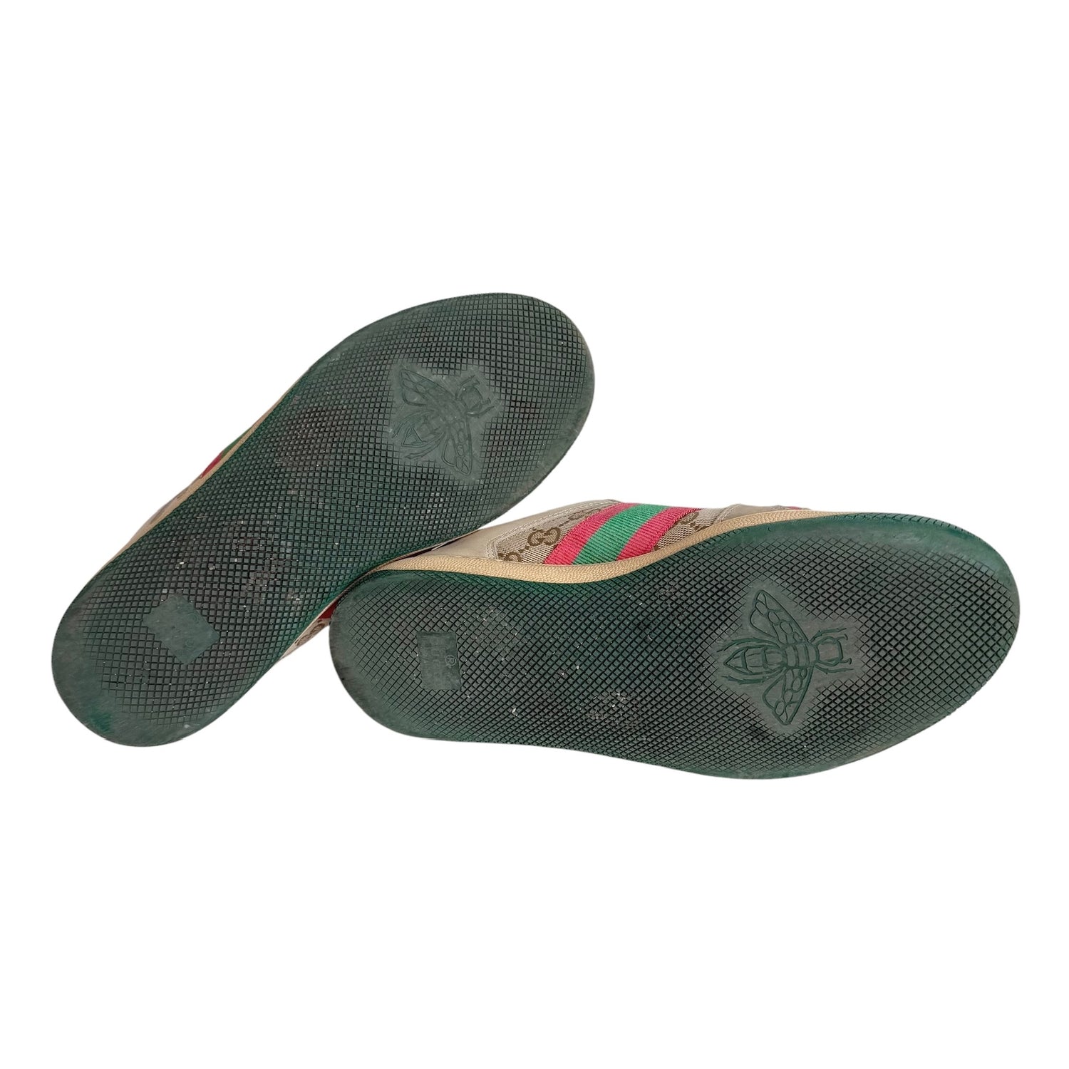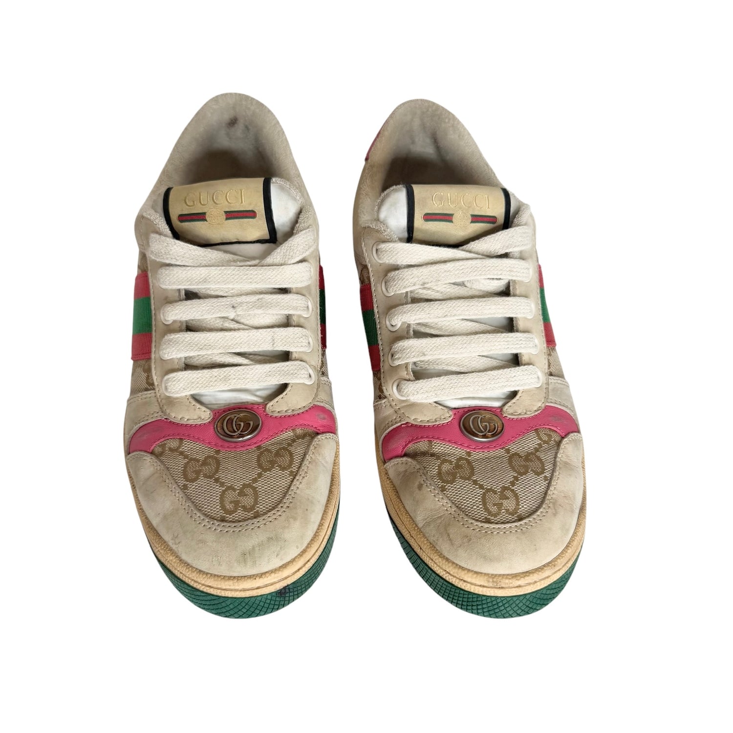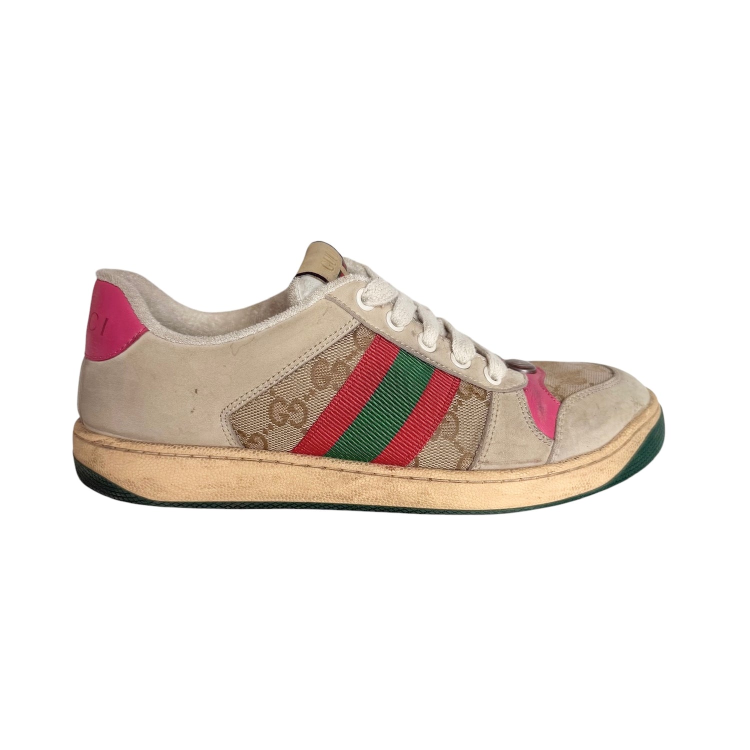 Gucci sneakers. Monogram canvas with beige leather. Pink accents. Extra pair of laces included in fuchsia. Logo at top and back. Designer size 37 (these sizes more like a 37.5).