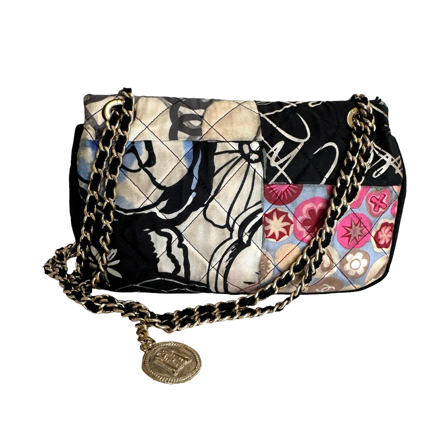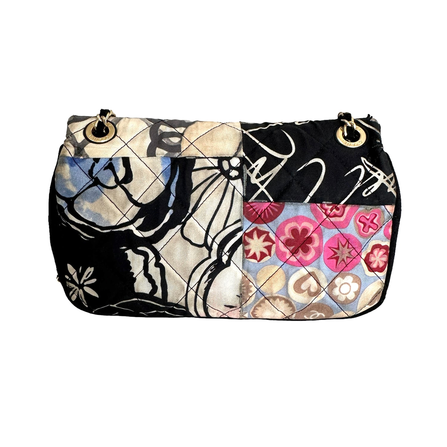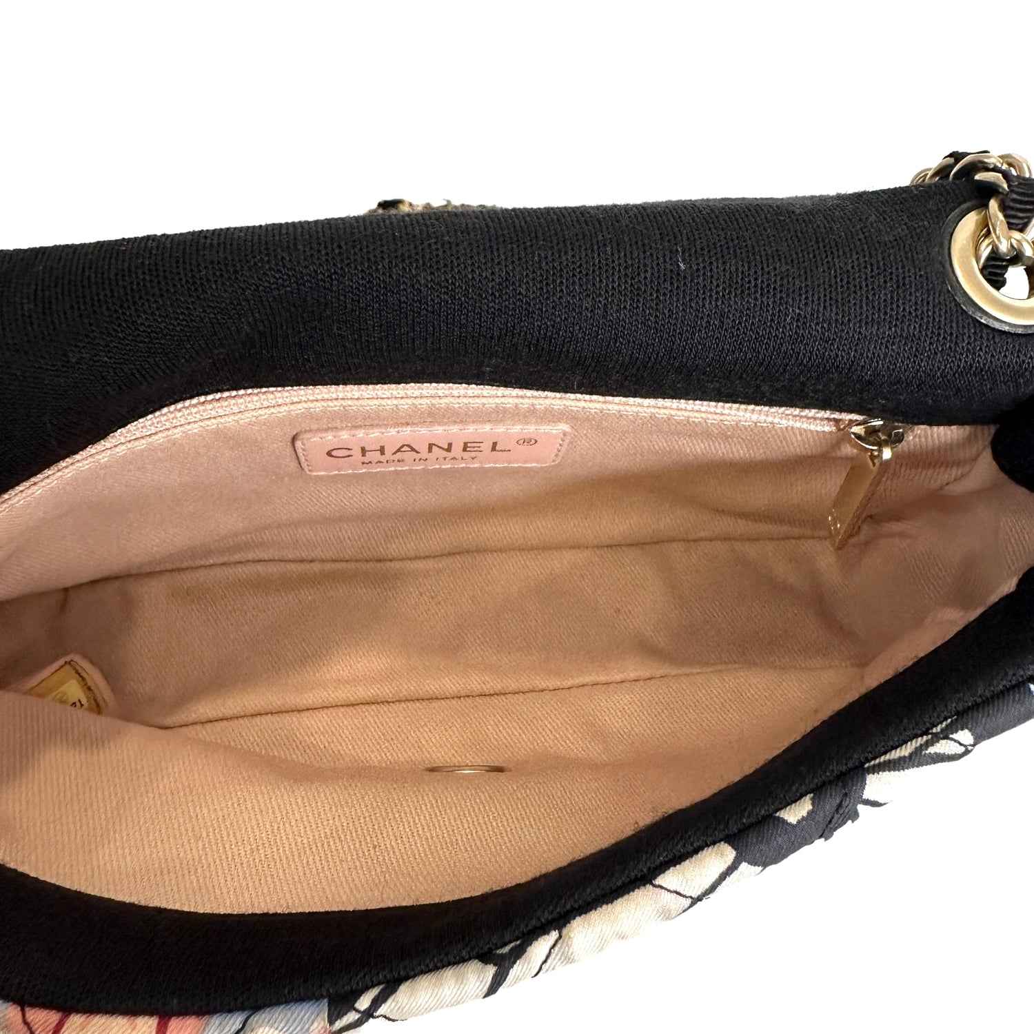 Chanel mini multicolor flap bag. Printed silk and black cotton. Brushed champagne turn-lock and hardware. Gros grain and chain strap. Coco Chanel jacket engraved medallion at chain. Pink canvas lining. One zipper pocket at interior.