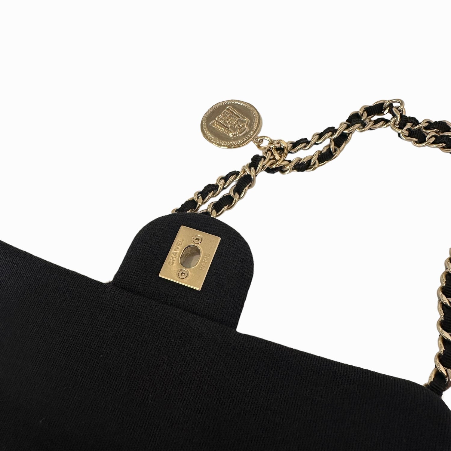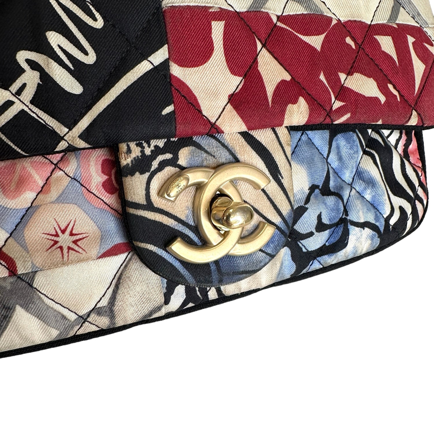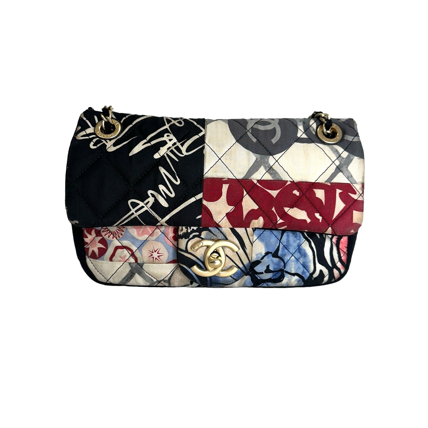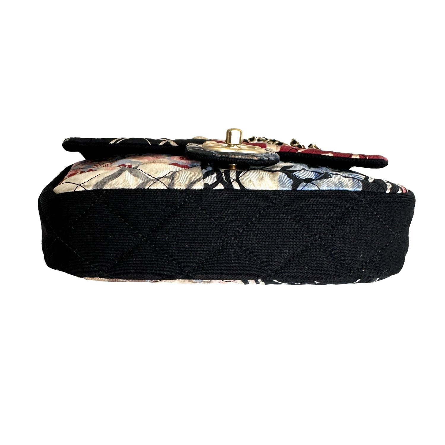 Chanel mini multicolor flap bag. Printed silk and black cotton. Brushed champagne turn-lock and hardware. Gros grain and chain strap. Coco Chanel jacket engraved medallion at chain. Pink canvas lining. One zipper pocket at interior.